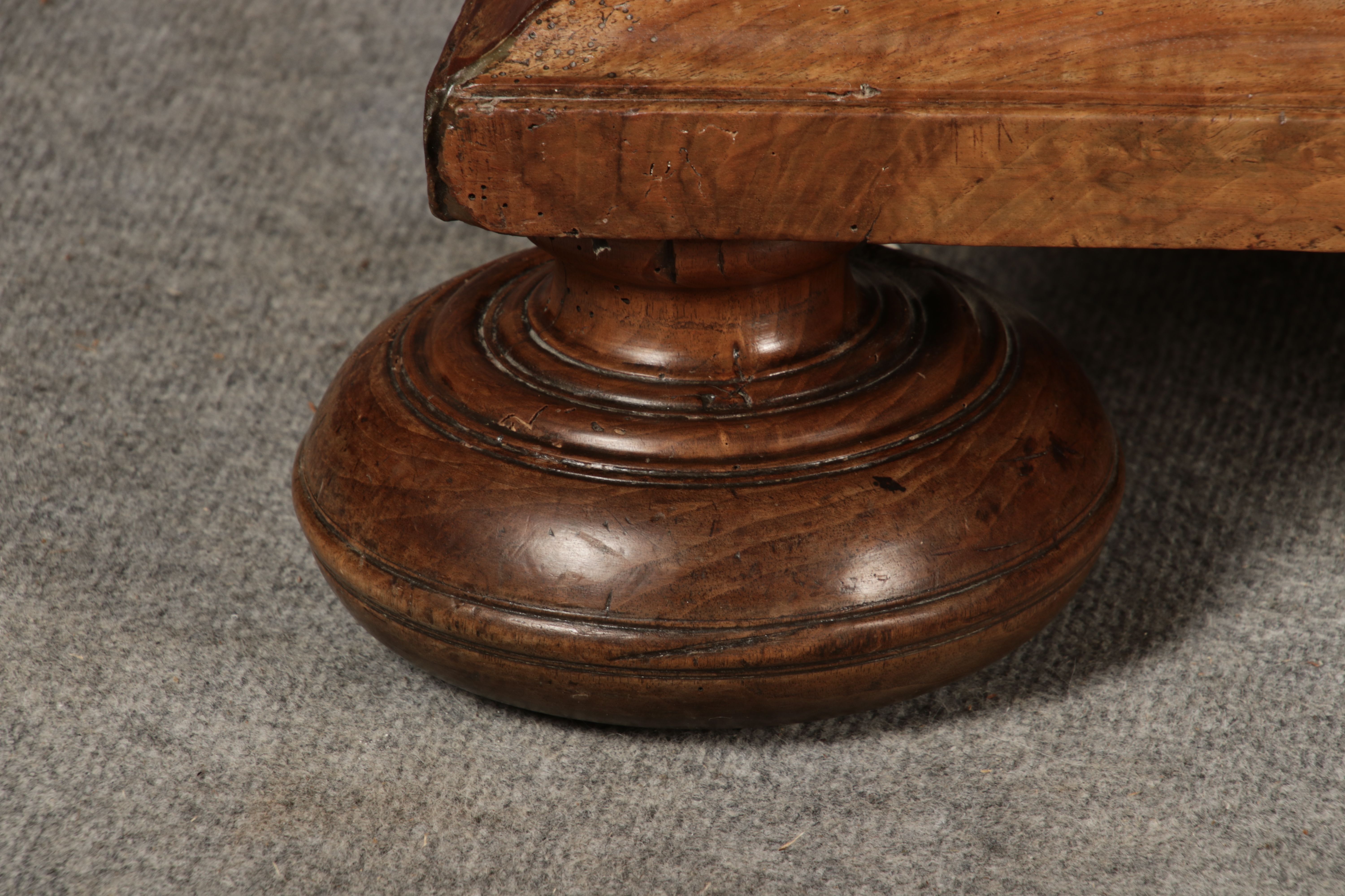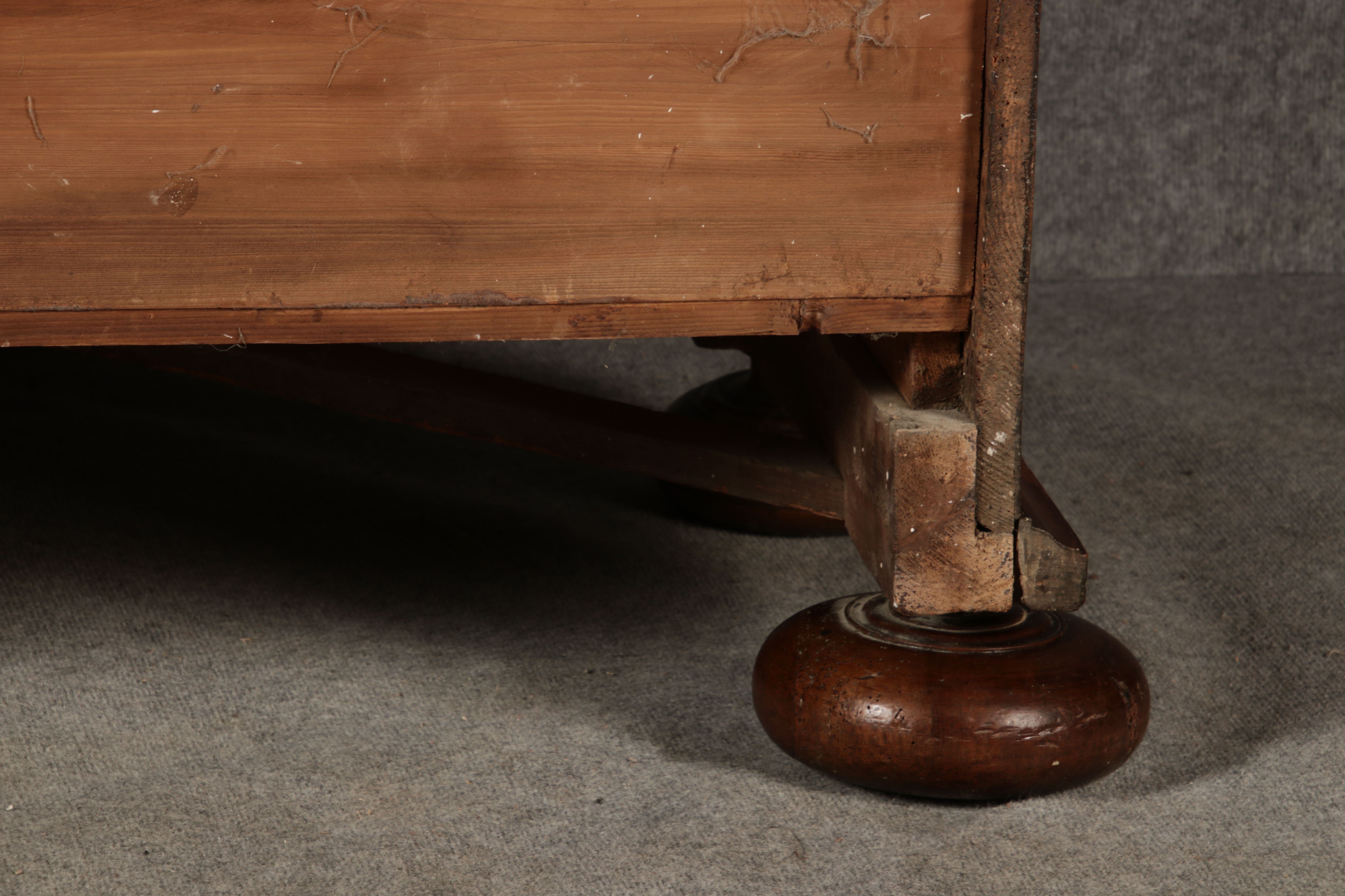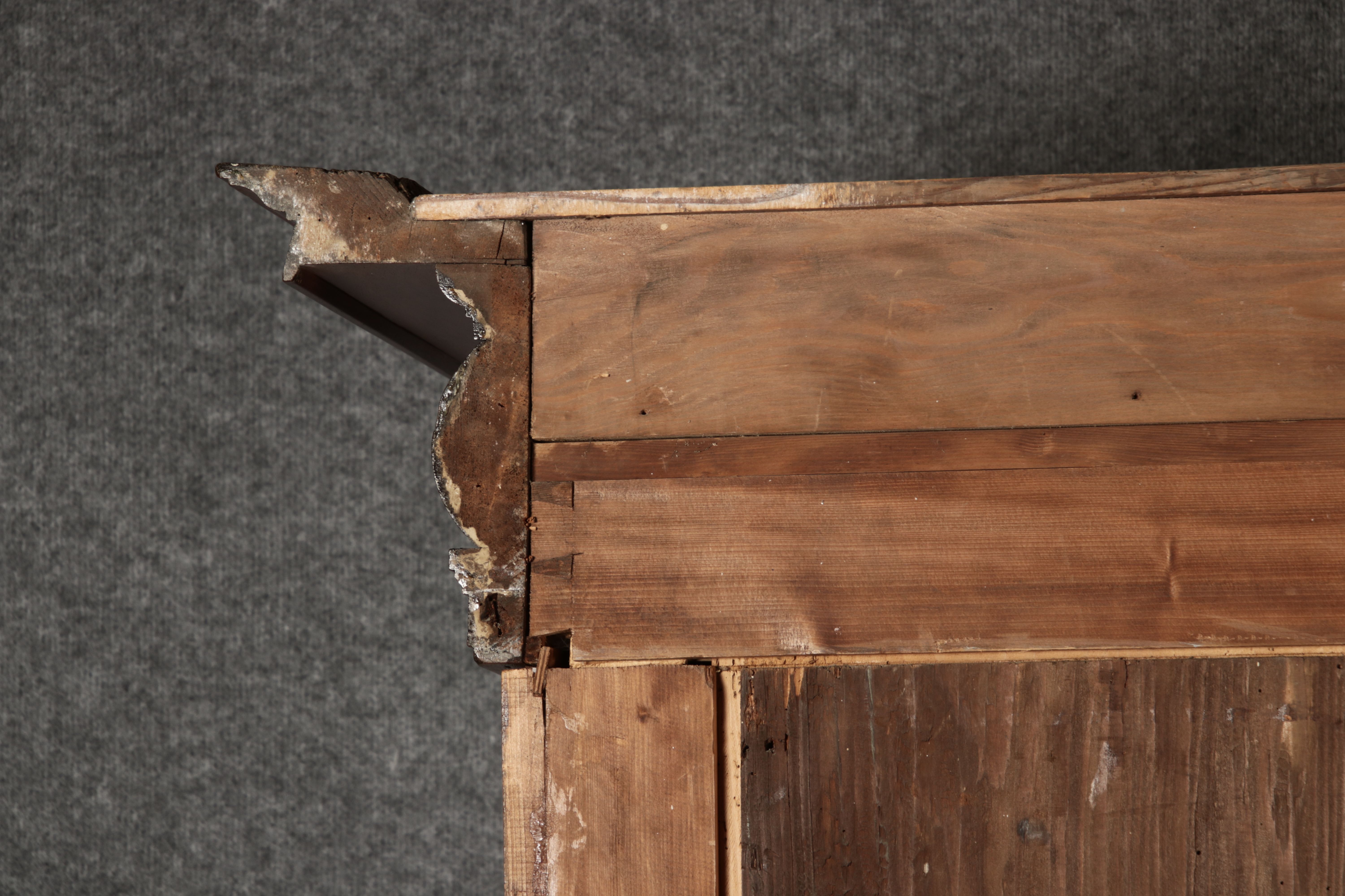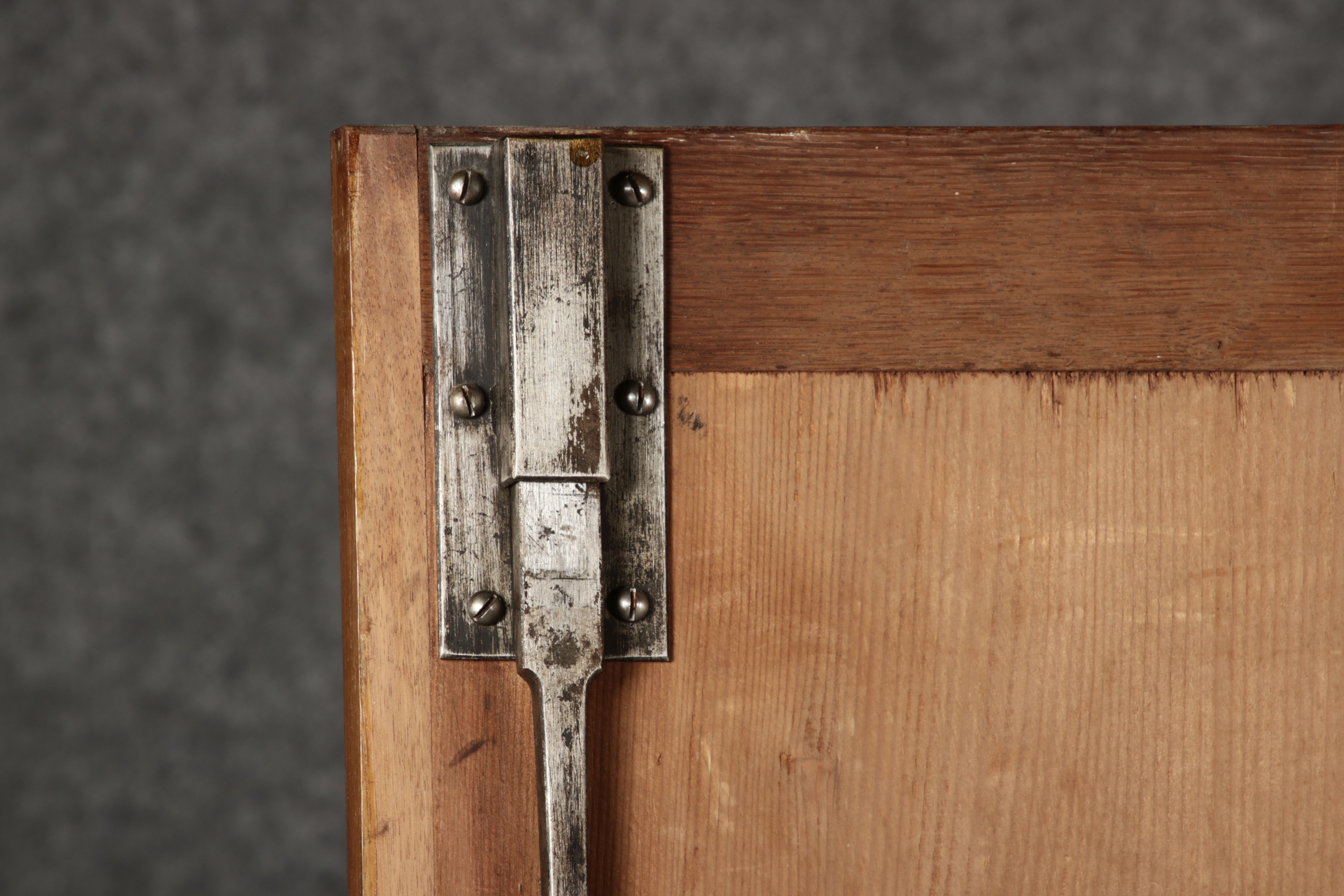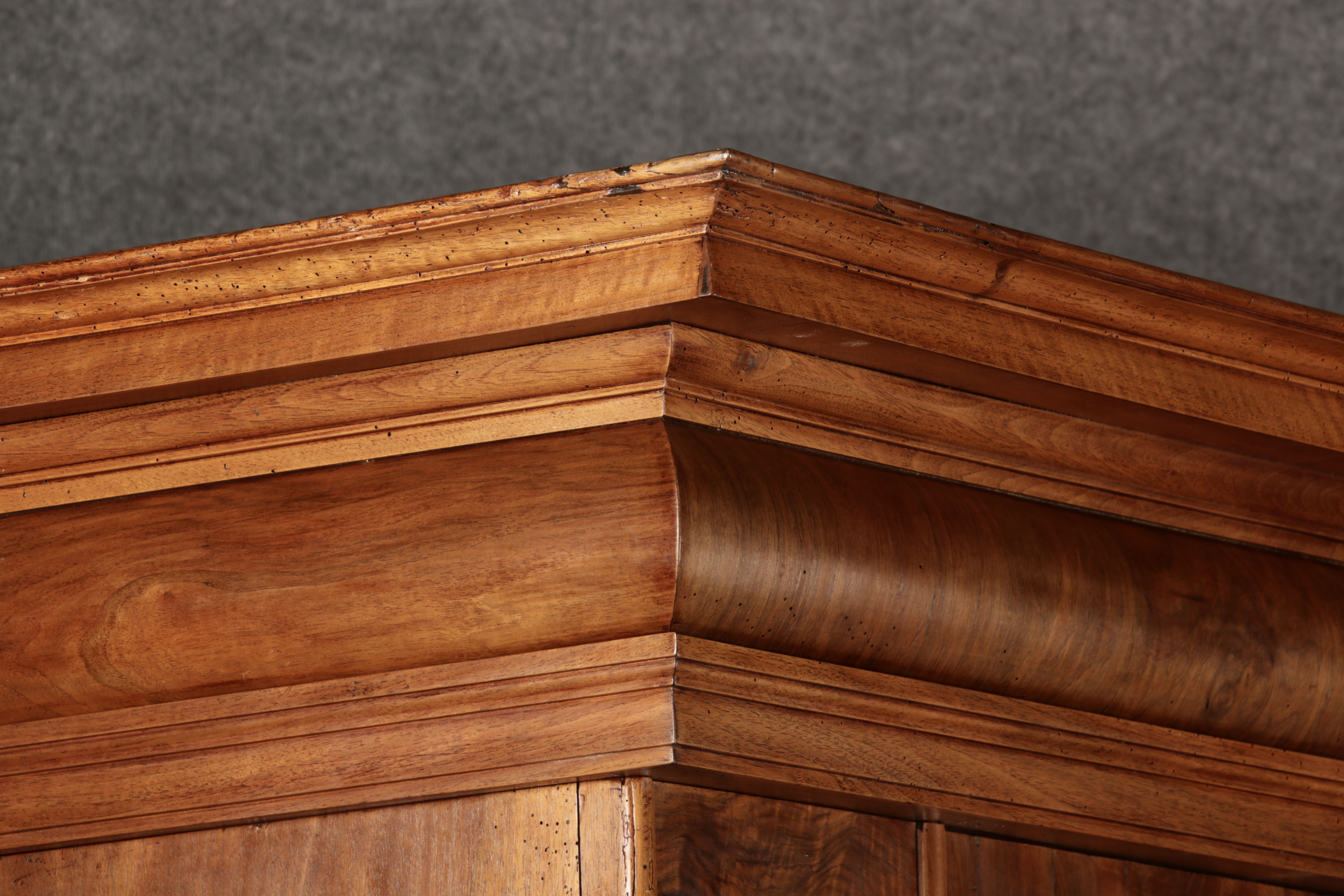 Beschreibung/description: Spätrenaissance-/Frühbarock-Schrank aus Nussbaum, Ende 17. Jahrhundert Dieser beeindruckende Schrank stammt aus der Übergangszeit zwischen der Spätrenaissance und dem Frühbarock und zeichnet sich durch seine opulente Gestaltung und kunstvolle Verarbeitung aus. Hergestellt aus hochwertigem Nussbaumholz, besticht der Schrank durch seine markanten, geometrischen Kassettenfronten, die dem Möbelstück eine faszinierende Tiefe und Struktur verleihen. Die warme, natürliche Maserung des Nussbaumholzes unterstreicht die edle Anmutung und verleiht dem Schrank eine erhabene Ausstrahlung. Die massiven Türen sind mit originalen Metallbeschlägen ausgestattet und lassen sich öffnen, um einen großzügigen Innenraum mit mehreren Regalböden freizugeben, der ideal zur Aufbewahrung von Textilien oder anderen Haushaltsgegenständen geeignet ist. Der Schrank steht auf kräftigen Kugelfüßen, die seine Stabilität und den repräsentativen Charakter unterstreichen. Das Kranzgesims ist typisch für die Epoche und rundet die massive Bauweise stilvoll ab. Ein originalgetreues Stück dieser Qualität ist ein seltenes Sammlerstück und ein Highlight für Liebhaber antiker Möbel. ArtikelNummer /number: sch230