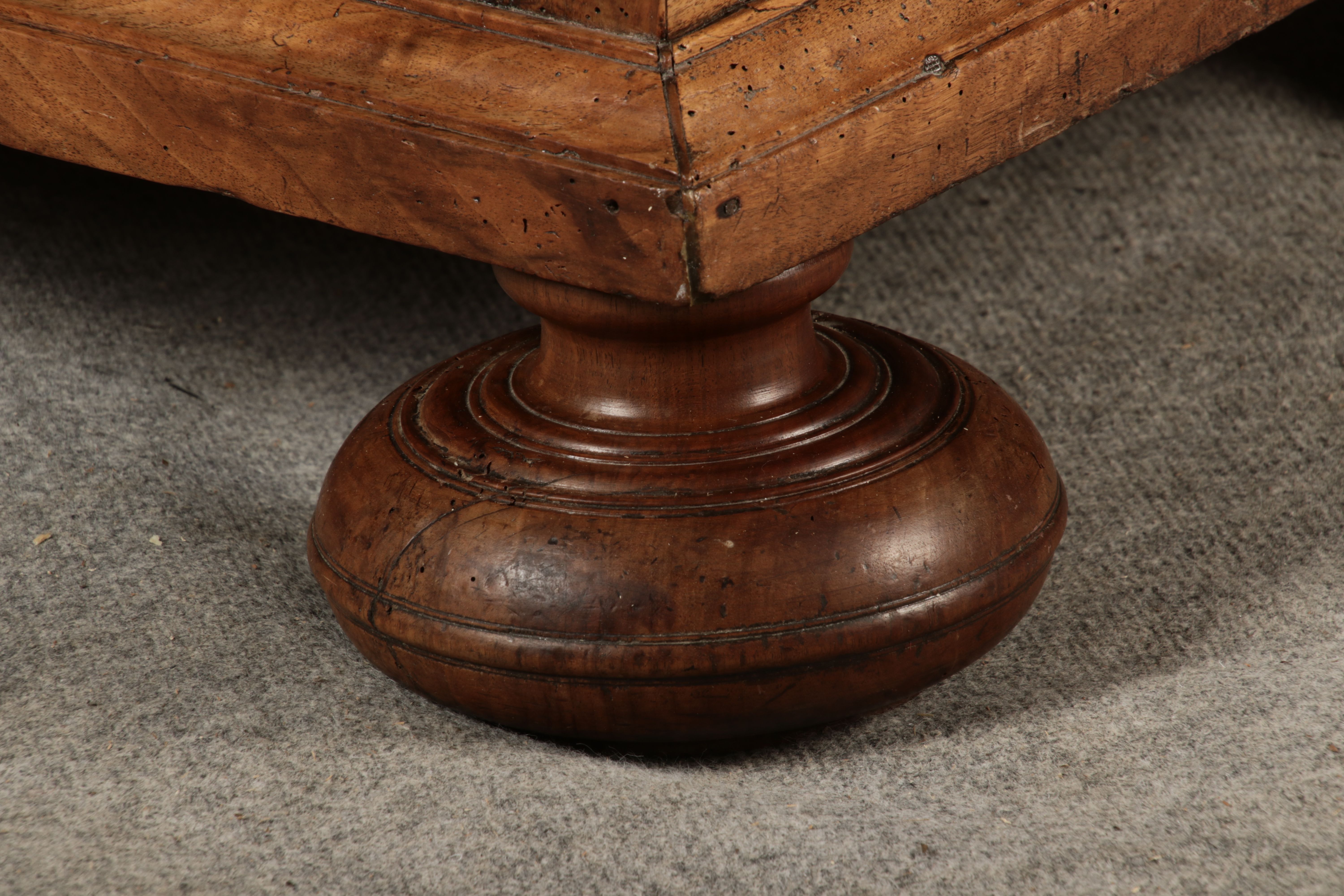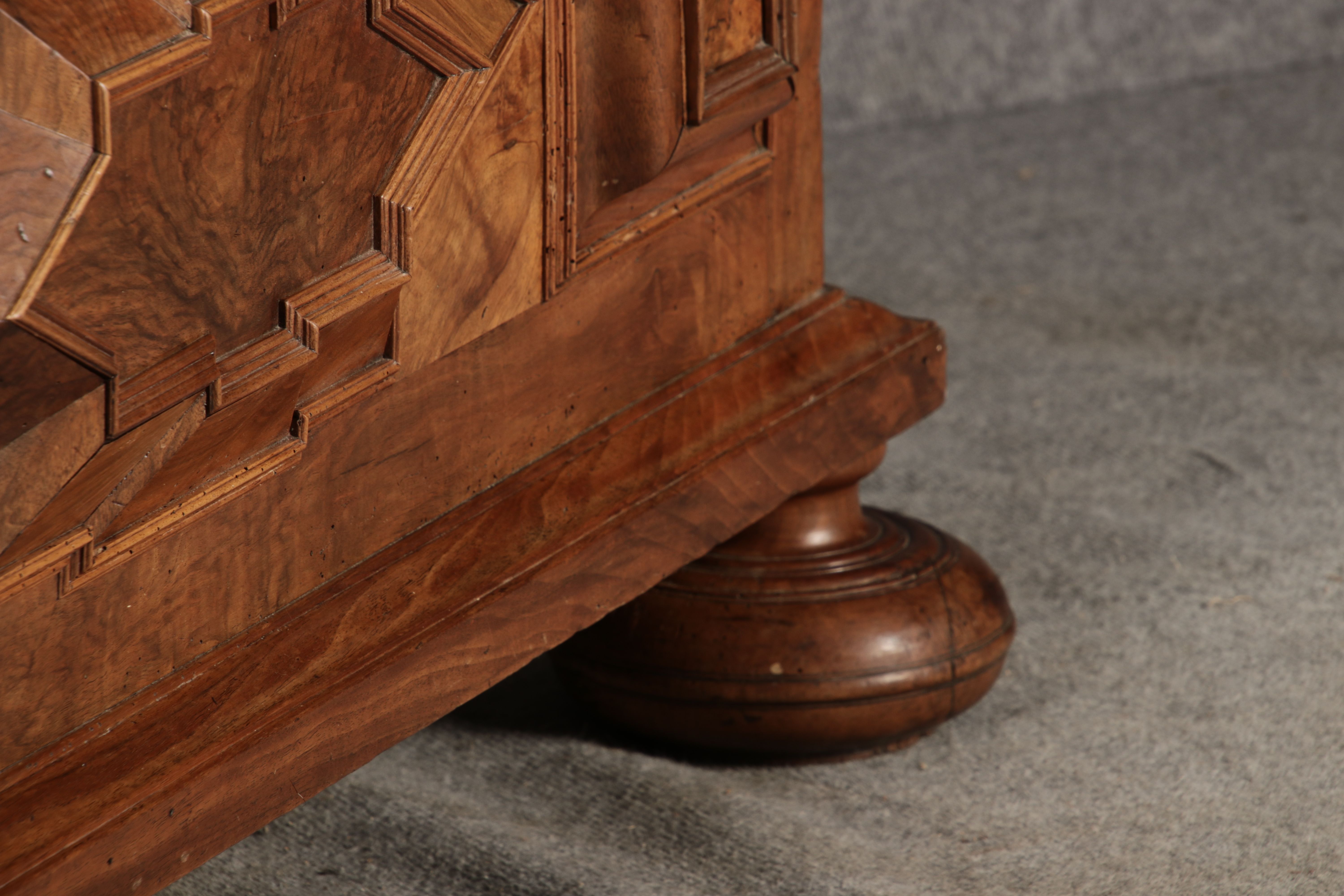 Spätrenaissance-/Frühbarock-Schrank aus Nussbaum, Ende 17. Jahrhundert Dieser beeindruckende Schrank stammt aus der Übergangszeit zwischen der Spätrenaissance und dem Frühbarock und zeichnet sich durch seine opulente Gestaltung und kunstvolle Verarbeitung aus. Hergestellt aus hochwertigem Nussbaumholz, besticht der Schrank durch seine markanten, geometrischen Kassettenfronten, die dem Möbelstück eine faszinierende Tiefe und Struktur verleihen. Die warme, natürliche Maserung des Nussbaumholzes unterstreicht die edle Anmutung und verleiht dem Schrank eine erhabene Ausstrahlung. Die massiven Türen sind mit originalen Metallbeschlägen ausgestattet und lassen sich öffnen, um einen großzügigen Innenraum mit mehreren Regalböden freizugeben, der ideal zur Aufbewahrung von Textilien oder anderen Haushaltsgegenständen geeignet ist. Der Schrank steht auf kräftigen Kugelfüßen, die seine Stabilität und den repräsentativen Charakter unterstreichen. Das Kranzgesims ist typisch für die Epoche und rundet die massive Bauweise stilvoll ab. Ein originalgetreues Stück dieser Qualität ist ein seltenes Sammlerstück und ein Highlight für Liebhaber antiker Möbel.