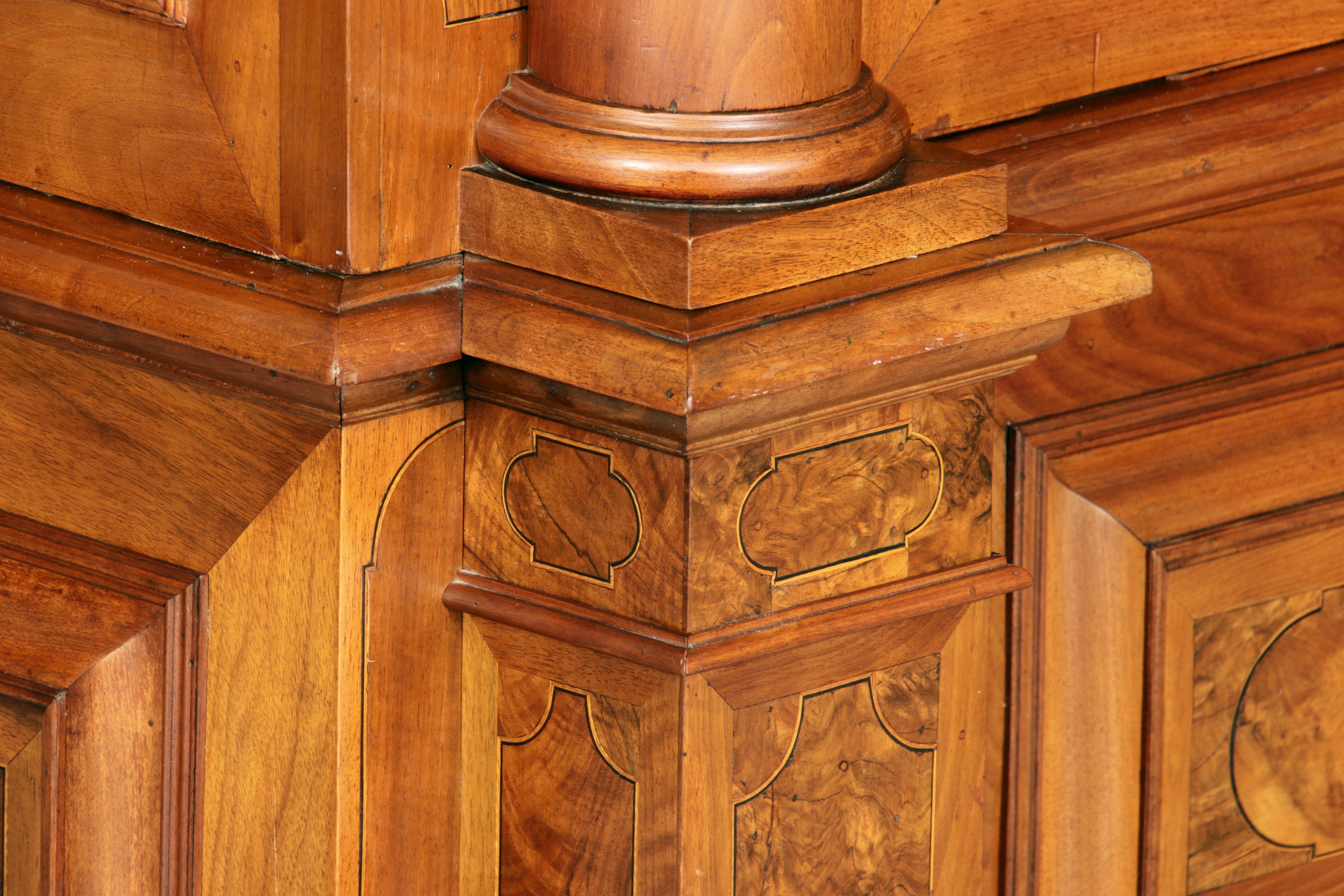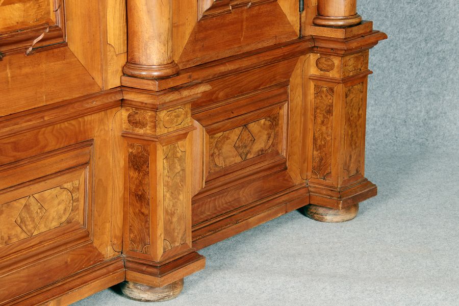 mit drei massiven großen Säulen Kassetenfüllungen und Einlegearbeiten.