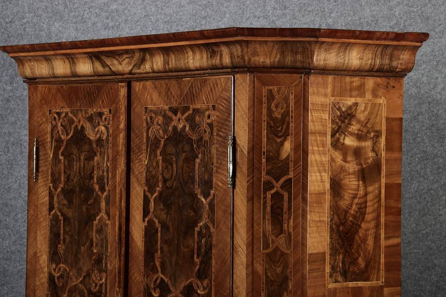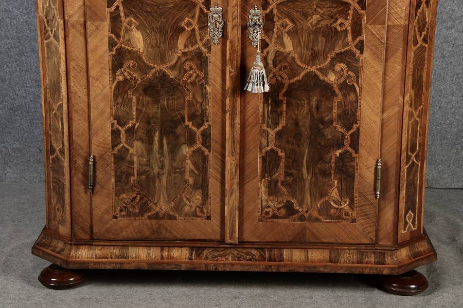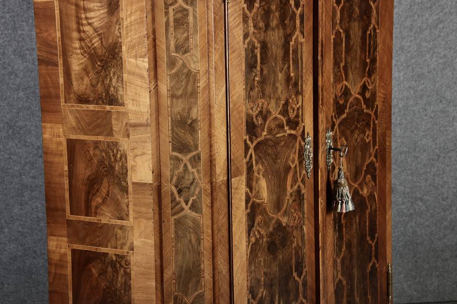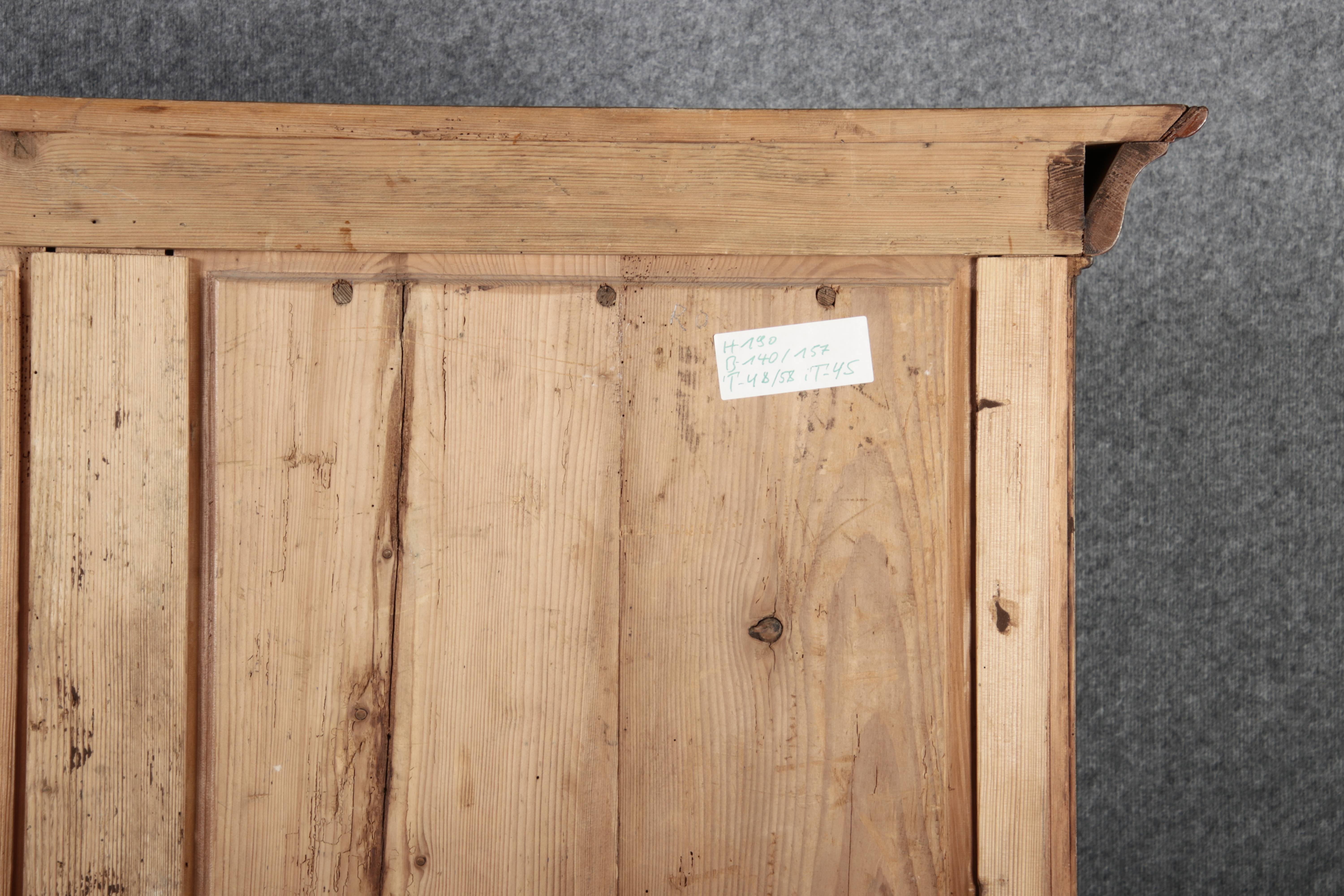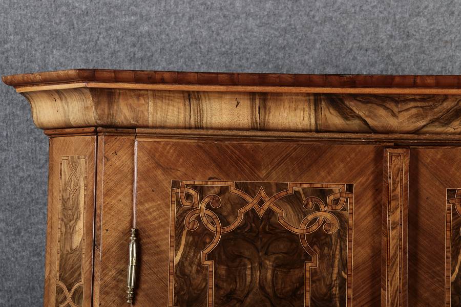 Masse/dimensions: Höhe/Height ca. 190 cm, Breite Korpus/Broad Boda ca. 140 cm, Breite Gesims/Broad cornice ca. 157 cm, Tiefe Korpus/Deep body ca. 48 cm, Tiefe Gesims/Deep cornice ca. 58 cm,