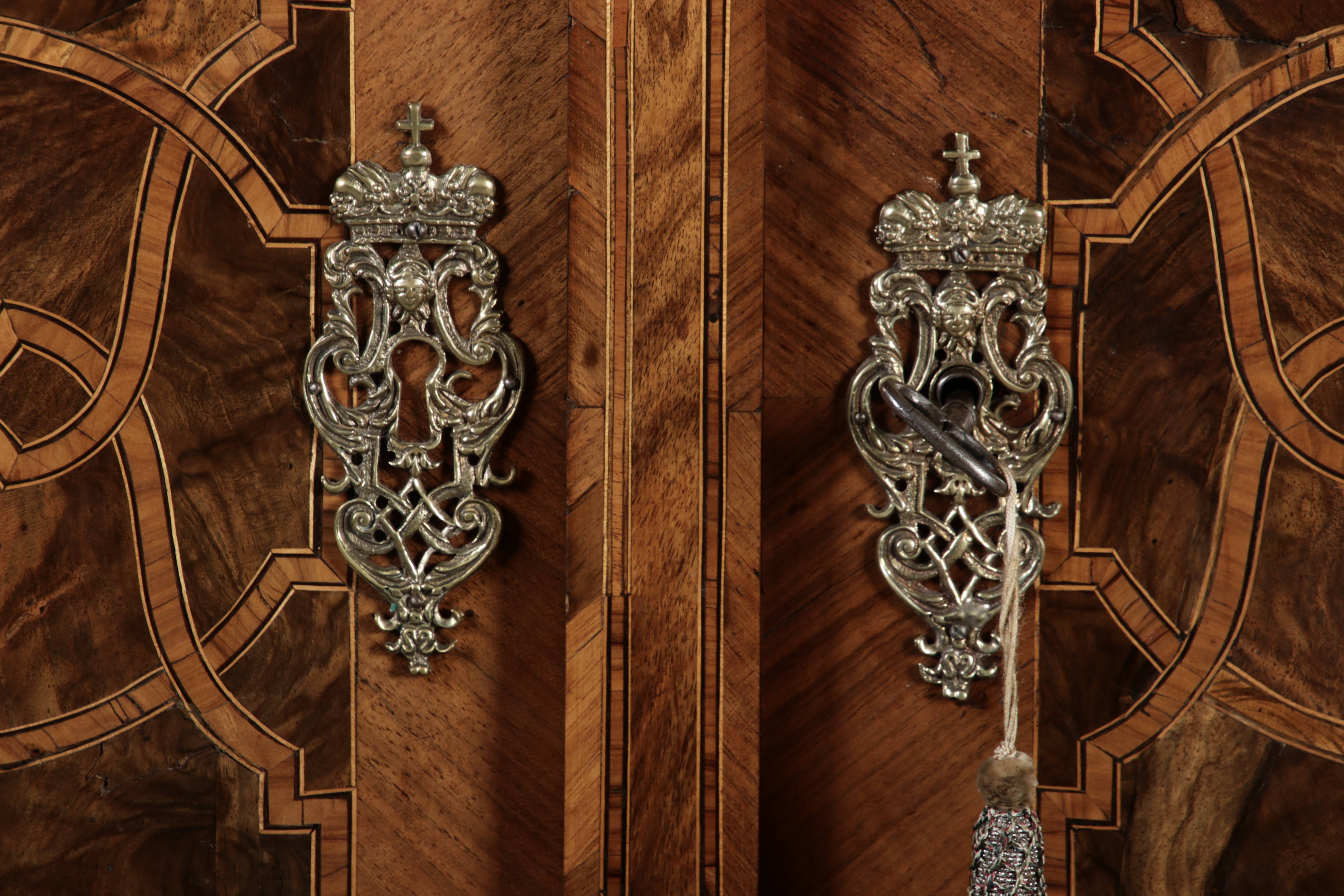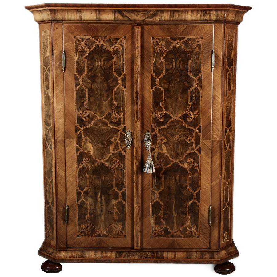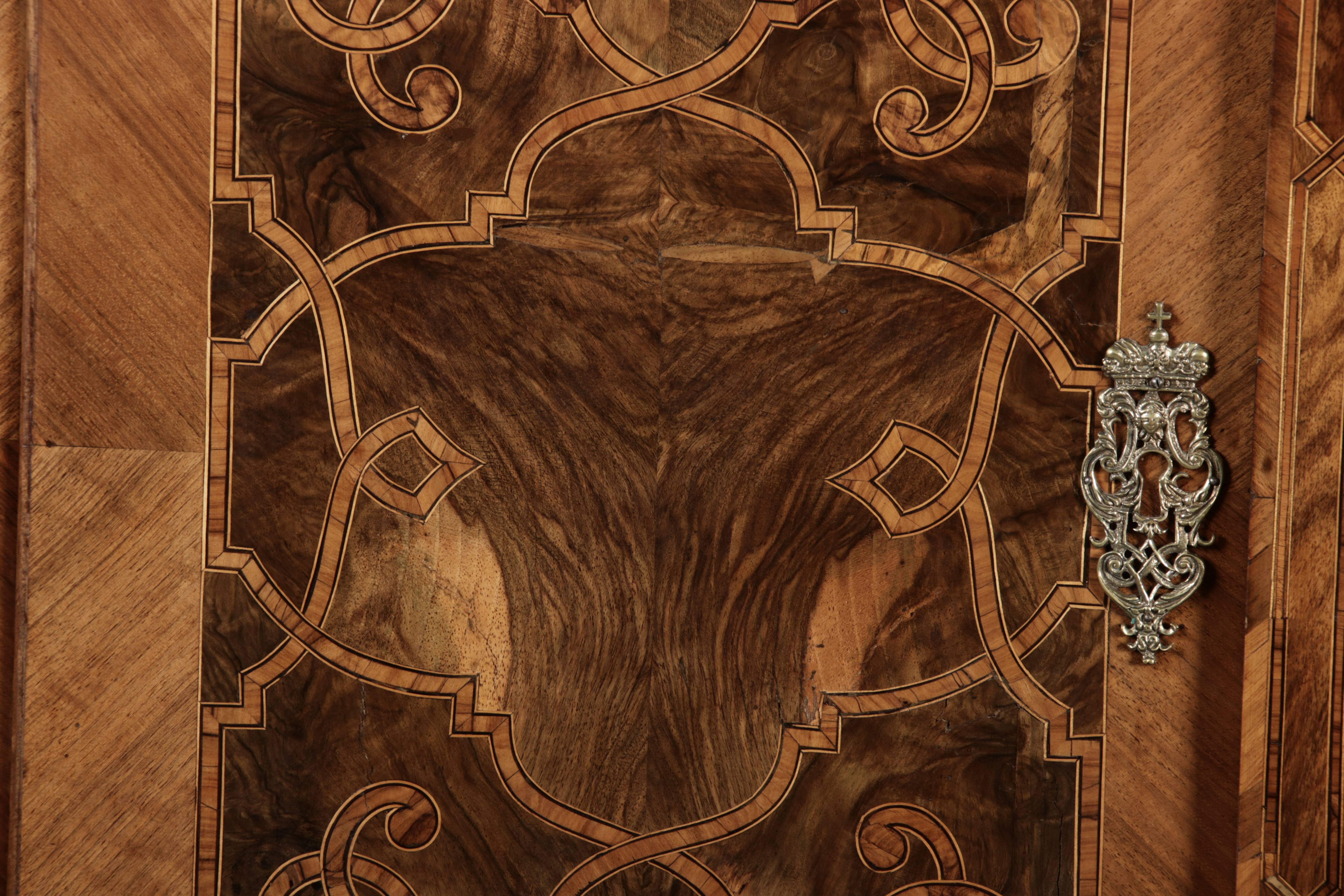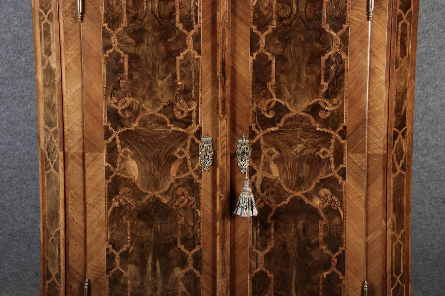 Masse/dimensions: Höhe/Height ca. 190 cm, Breite Korpus/Broad Boda ca. 140 cm, Breite Gesims/Broad cornice ca. 157 cm, Tiefe Korpus/Deep body ca. 48 cm, Tiefe Gesims/Deep cornice ca. 58 cm,