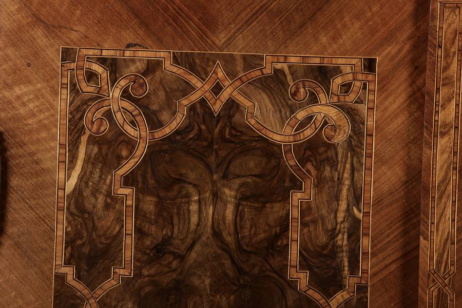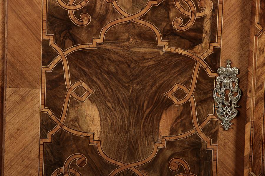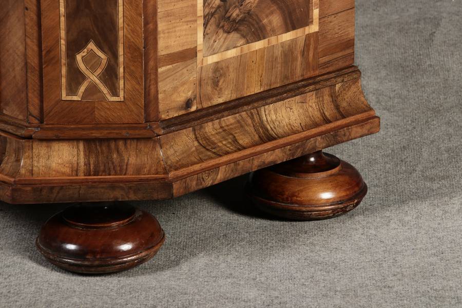 key: Die Holzart ist Nussbaum, Nussbaumwurzel und andere Hölzer ,er hat 1 Schlüssel