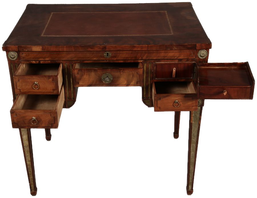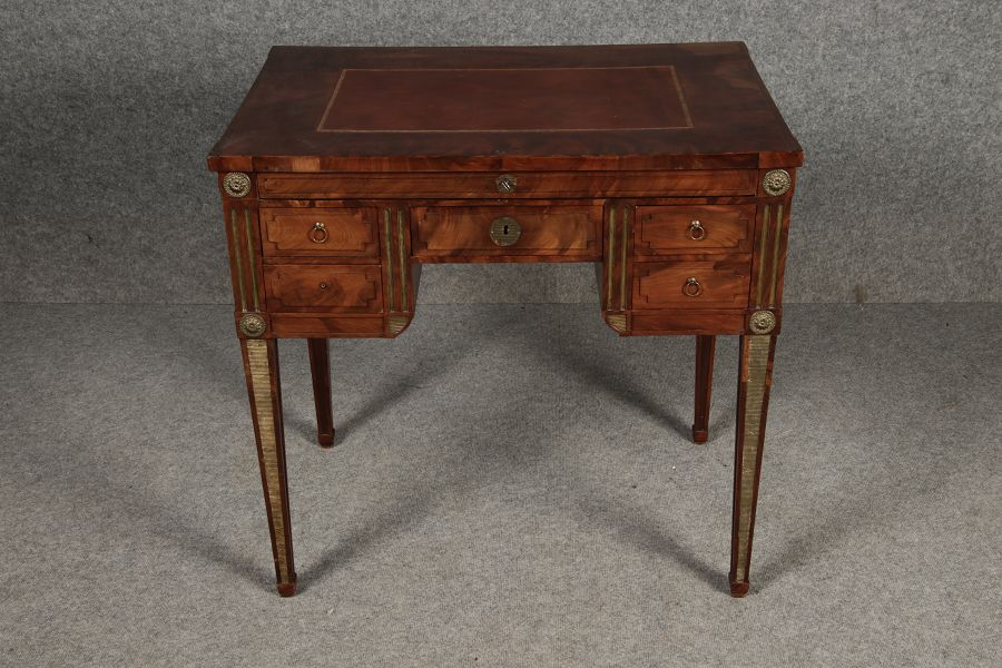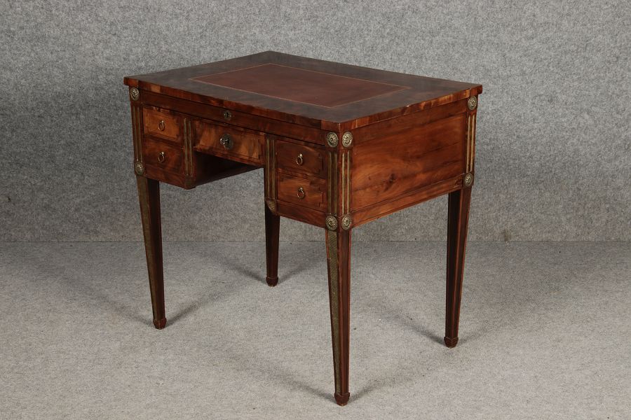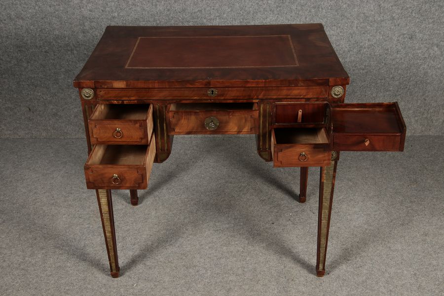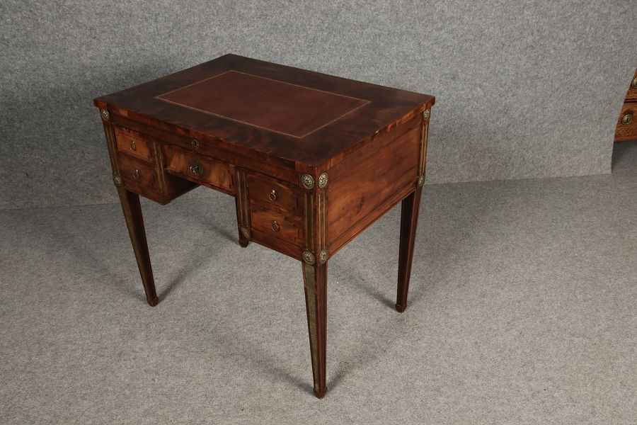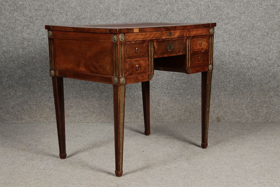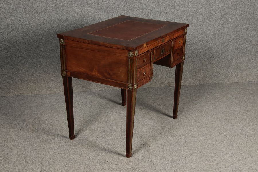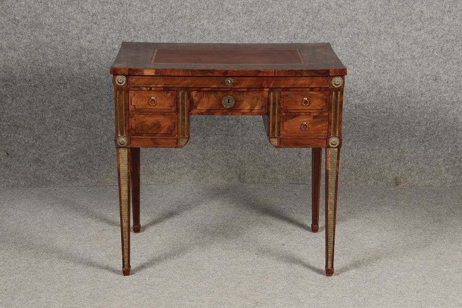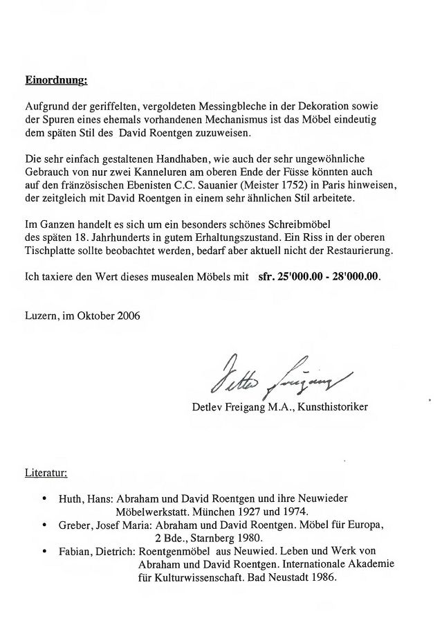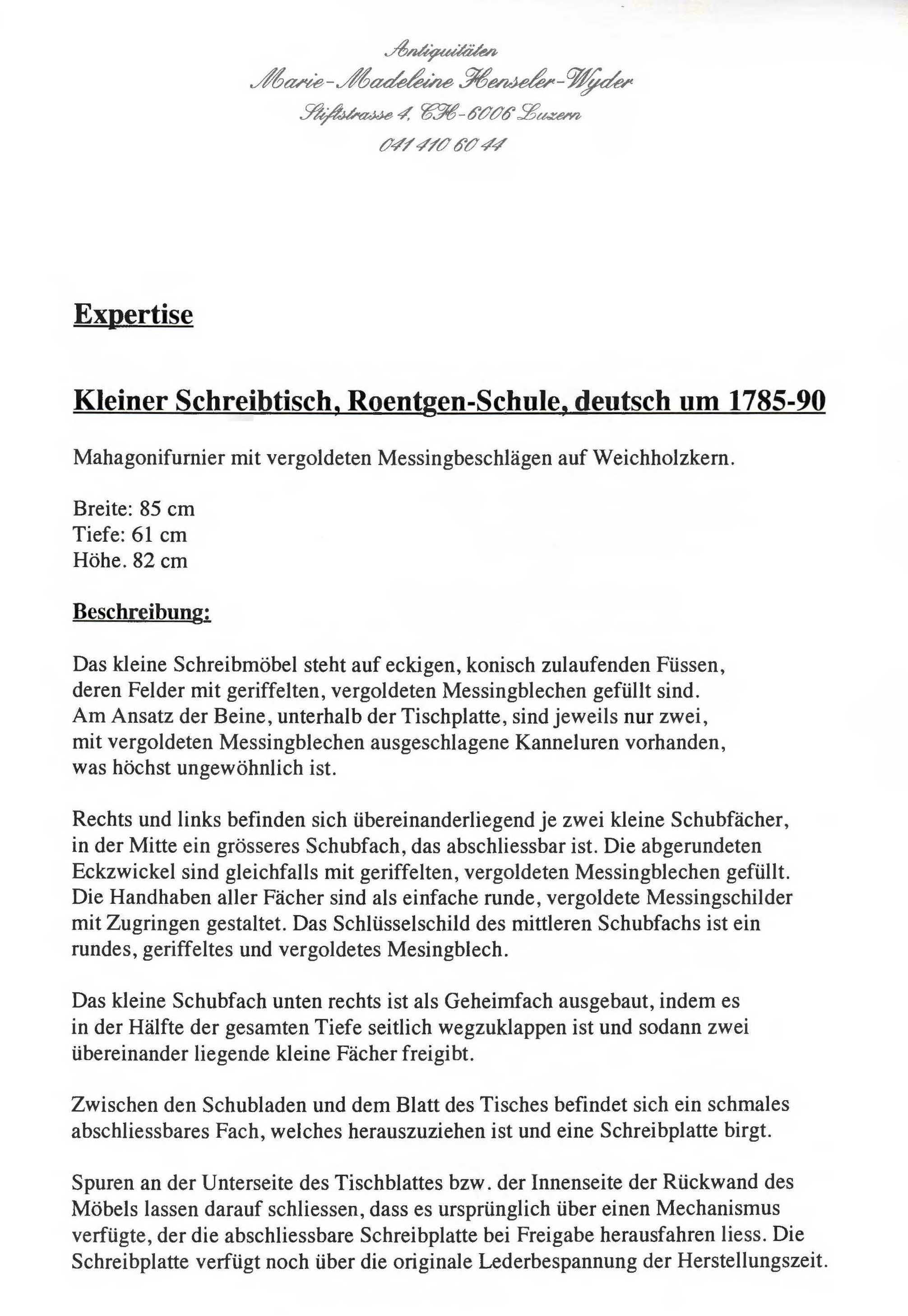 Kleiner Schreibtisch, Roentgen-Schule, deutsch um 1785-90 Mahagonifurnier mit vergoldeten Messingbeschlägen auf Weichholzkern.Breite: 85 cm Tiefe: 61 cm Höhe. 82 cm Beschreibung,;. Das kleine Schreibmöbel steht auf eckigen, konisch zulaufenden Füssen, deren Felder mit geriffelten, vergoldeten Messingblechen gefüllt sind. Am Ansatz der Beine , unterhalb der Tischplatte, sind jeweils nur zwei , mit vergoldeten Messingblechen ausgeschlagene Kanneluren vorhanden , was höchst ungewöhnlich ist. Rechts und links befinden sich übereinanderliegend je zwei kleine Schubfächer, in der Mitte ein grösseres Schubfach, das abschliessbar ist. Die abgerundeten Eckzwickel sind gleichfalls mit geriffelten, vergoldeten Messingblechen gefüllt. Die Handhaben aller Fächer sind als einfache runde, vergoldete Messingschilder mit Zugringen gestaltet. Das Schlüsselschild des mittleren Schubfachs ist ein rundes, geriffeltes und vergoldetes Mesingblech. Das kleine Schubfach unten rechts ist als Geheimfach ausgebaut, indem es in der Hälfte der gesamten Tiefe seitlich wegzuklappen ist und sodann zwei übereinander liegende kleine Fächer freigibt. Zwischen den Schubladen und dem Blatt des Tisches befindet sich ein schmales abschliessbares Fach, welches herauszuziehen ist und eine Schreibplatte birgt. Spuren an der Unterseite des Tischblattes bzw . der Innenseite der Rückwand des Möbels lassen darauf schliessen, dass es ursprünglich über einen Mechanismus verfügte, der die abschliessbare Schreibplatte bei Freigabe herausfahren liess. DieSchreibplatte verfügt noch über die originale Lederbespannung der Herstellungszeit.Einordnung;_ Aufgrund der geriffelten , vergoldeten Messingbleche in der Dekoration sowie der Spuren eines ehemals vorhandenen Mechanismus ist das Möbel eindeutig dem späten Stil des David Roentgen zuzuweisen . Die sehr einfach gestalteneo Handhaben, wie auch der sehr ungewöhnliche Gebrauch von nur zwei Kanneluren am oberen Ende der Füsse könnten auch auf den fränzösischen Ehenisten C.C. Sauanier (Meister 1752) in Paris hinweisen , der zeitgleich mit David Roentgen in einem sehr ähnlichen Stil arbeitete. Im Ganzen handelt es sich um ein besonders schönes Schreibmöbel des späten 18. Jahrhunderts in gutem Erhaltungszustand. Ein Riss in der oberen Tischplatte sollte beobachtet werden , bedarf aber aktuell nicht der Restaurierung.Ich taxiere den Wert dieses musealen Möbels mit sfr. 25'000.00- 28'000.00. Luzern, im Oktober 2006 Detlev Freigang M.A., Kunsthistoriker Literatur: • Huth , Hans: Abraham und David Roentgen und ihre NeuwiederMöbelwerkstatt München 1927 und 1974 .• Greber, Josef Maria: Abraham und David Roentgen. Möbel für Europa,2 Bde., Starnberg 1980.• Fabian, Dietrich: Roentgenmöbel aus Neuwied . Leben und Werk vonAbraham und David Roentgen . Internationale Akademie für Kulturwissenschaft Bad Neustadt 1986.