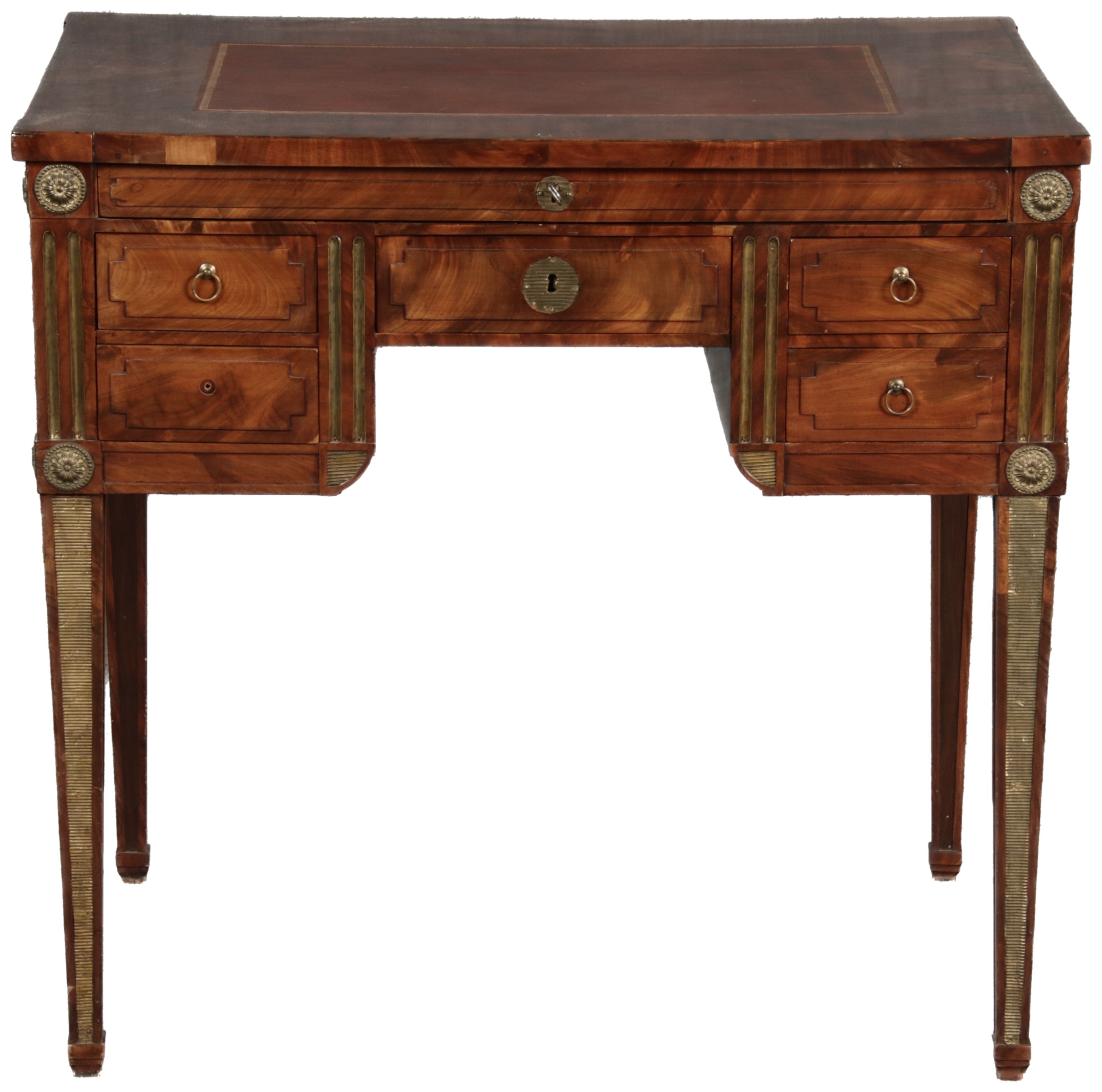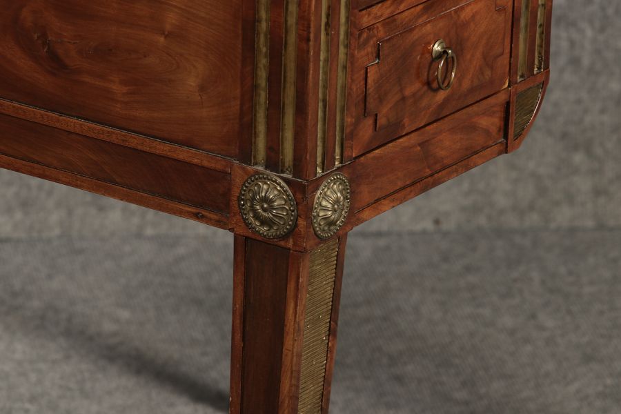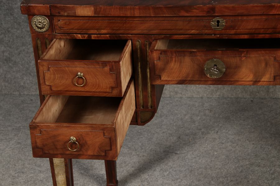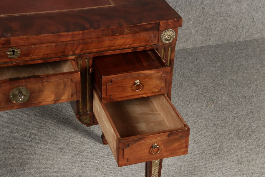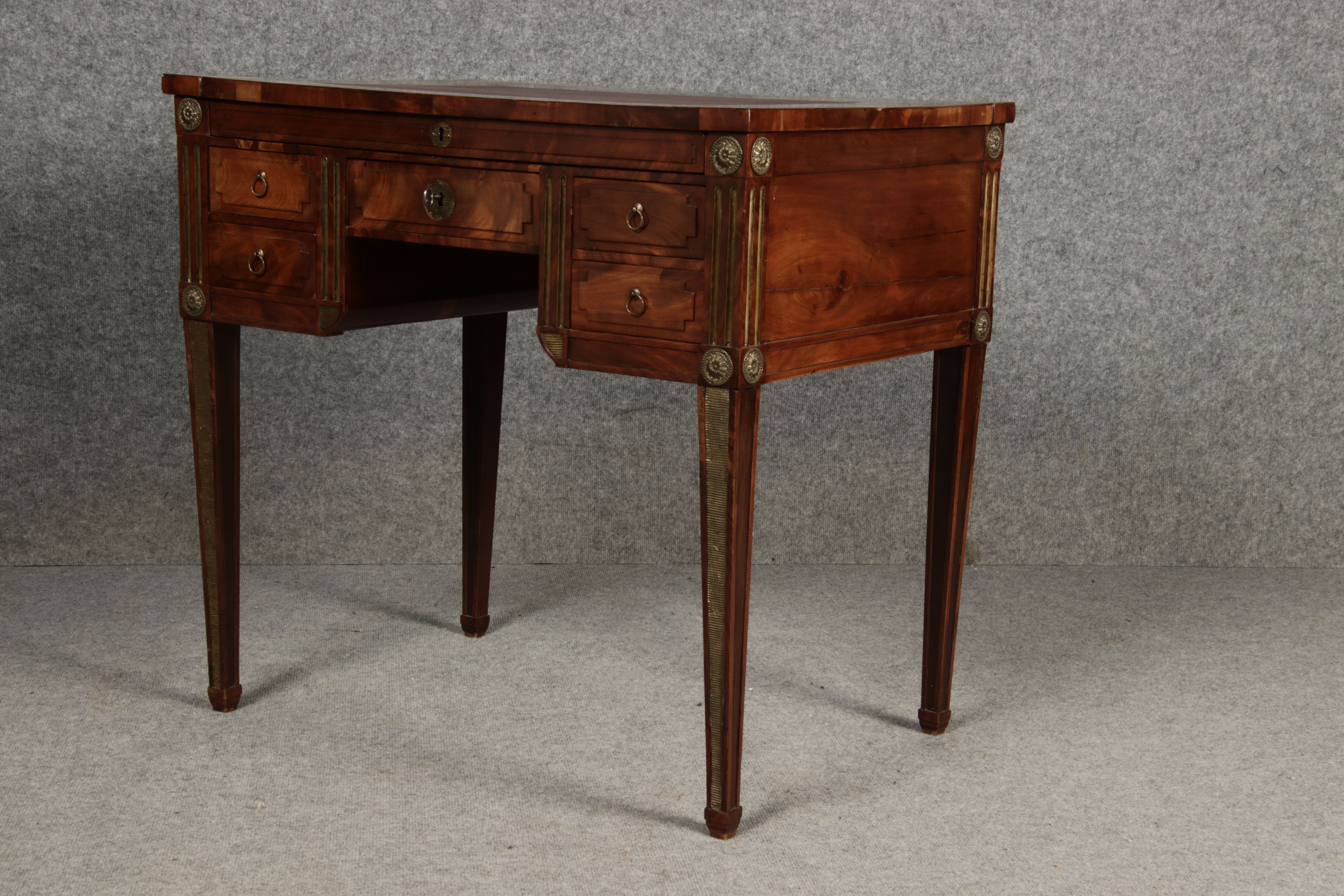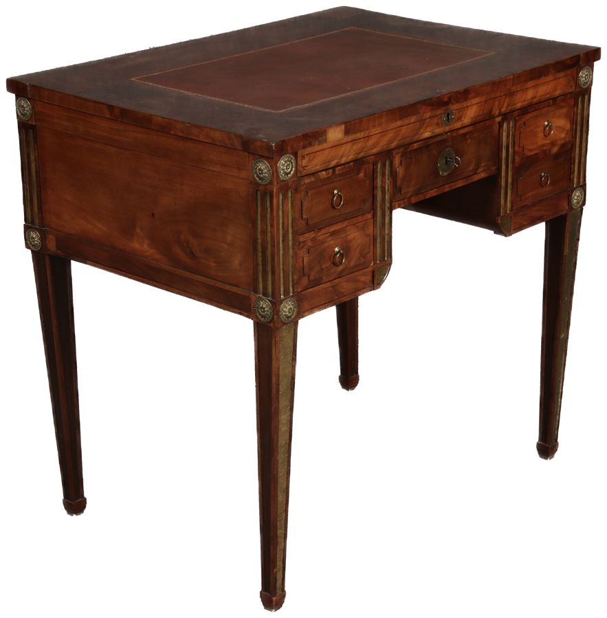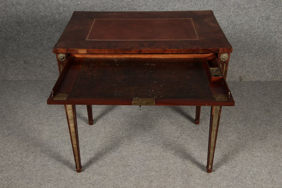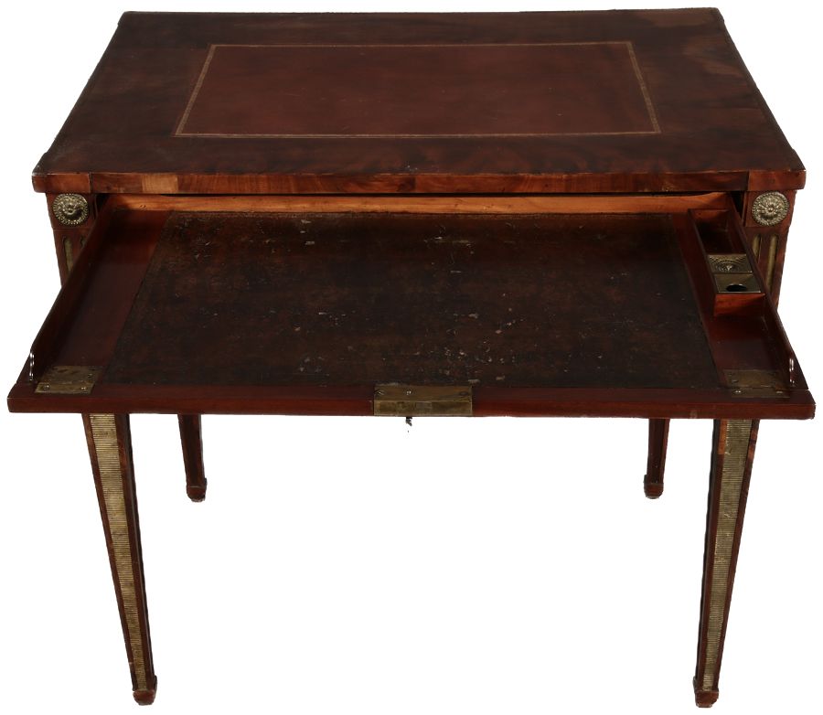 Kleiner Schreibtisch, Roentgen-Schule, deutsch um 1785-90 Mahagonifurnier mit vergoldeten Messingbeschlägen auf Weichholzkern.Breite: 85 cm Tiefe: 61 cm Höhe. 82 cm Beschreibung,;. Das kleine Schreibmöbel steht auf eckigen, konisch zulaufenden Füssen, deren Felder mit geriffelten, vergoldeten Messingblechen gefüllt sind. Am Ansatz der Beine , unterhalb der Tischplatte, sind jeweils nur zwei , mit vergoldeten Messingblechen ausgeschlagene Kanneluren vorhanden , was höchst ungewöhnlich ist. Rechts und links befinden sich übereinanderliegend je zwei kleine Schubfächer, in der Mitte ein grösseres Schubfach, das abschliessbar ist. Die abgerundeten Eckzwickel sind gleichfalls mit geriffelten, vergoldeten Messingblechen gefüllt. Die Handhaben aller Fächer sind als einfache runde, vergoldete Messingschilder mit Zugringen gestaltet. Das Schlüsselschild des mittleren Schubfachs ist ein rundes, geriffeltes und vergoldetes Mesingblech. Das kleine Schubfach unten rechts ist als Geheimfach ausgebaut, indem es in der Hälfte der gesamten Tiefe seitlich wegzuklappen ist und sodann zwei übereinander liegende kleine Fächer freigibt. Zwischen den Schubladen und dem Blatt des Tisches befindet sich ein schmales abschliessbares Fach, welches herauszuziehen ist und eine Schreibplatte birgt. Spuren an der Unterseite des Tischblattes bzw . der Innenseite der Rückwand des Möbels lassen darauf schliessen, dass es ursprünglich über einen Mechanismus verfügte, der die abschliessbare Schreibplatte bei Freigabe herausfahren liess. DieSchreibplatte verfügt noch über die originale Lederbespannung der Herstellungszeit.Einordnung;_ Aufgrund der geriffelten , vergoldeten Messingbleche in der Dekoration sowie der Spuren eines ehemals vorhandenen Mechanismus ist das Möbel eindeutig dem späten Stil des David Roentgen zuzuweisen . Die sehr einfach gestalteneo Handhaben, wie auch der sehr ungewöhnliche Gebrauch von nur zwei Kanneluren am oberen Ende der Füsse könnten auch auf den fränzösischen Ehenisten C.C. Sauanier (Meister 1752) in Paris hinweisen , der zeitgleich mit David Roentgen in einem sehr ähnlichen Stil arbeitete. Im Ganzen handelt es sich um ein besonders schönes Schreibmöbel des späten 18. Jahrhunderts in gutem Erhaltungszustand. Ein Riss in der oberen Tischplatte sollte beobachtet werden , bedarf aber aktuell nicht der Restaurierung.Ich taxiere den Wert dieses musealen Möbels mit sfr. 25'000.00- 28'000.00. Luzern, im Oktober 2006 Detlev Freigang M.A., Kunsthistoriker Literatur: • Huth , Hans: Abraham und David Roentgen und ihre NeuwiederMöbelwerkstatt München 1927 und 1974 .• Greber, Josef Maria: Abraham und David Roentgen. Möbel für Europa,2 Bde., Starnberg 1980.• Fabian, Dietrich: Roentgenmöbel aus Neuwied . Leben und Werk vonAbraham und David Roentgen . Internationale Akademie für Kulturwissenschaft Bad Neustadt 1986.