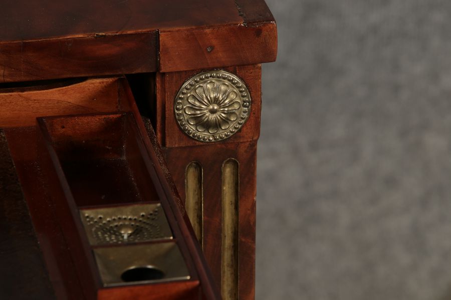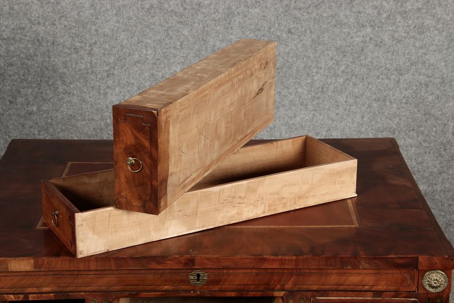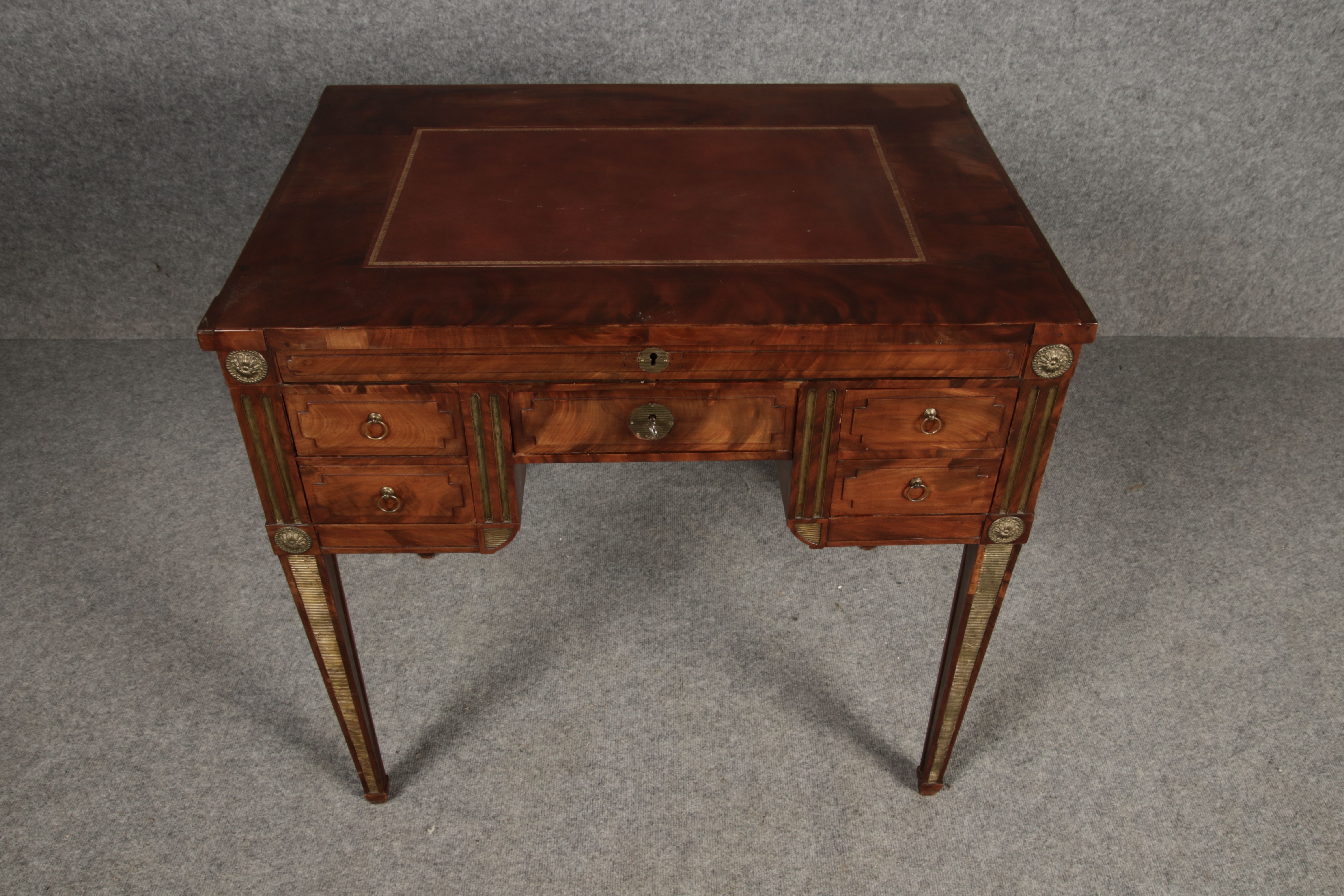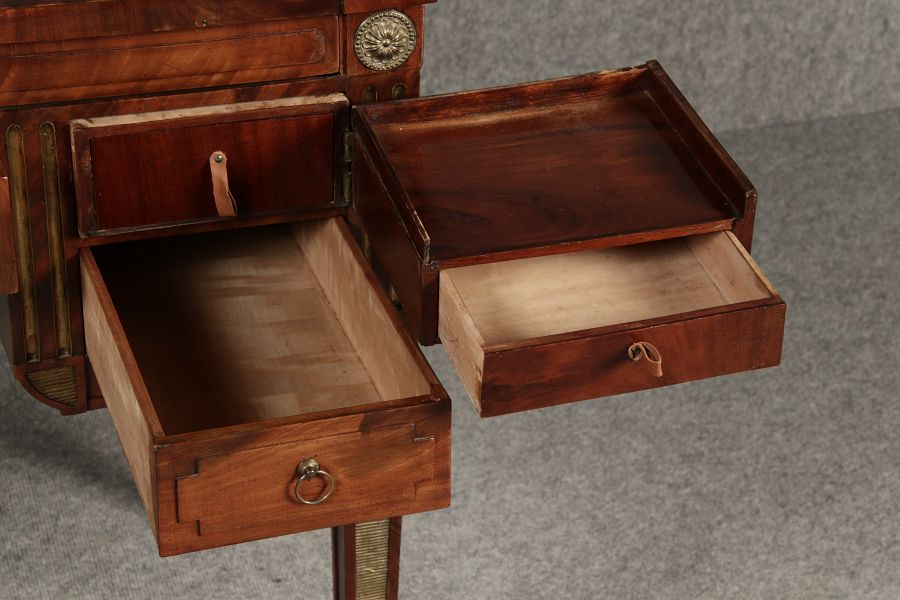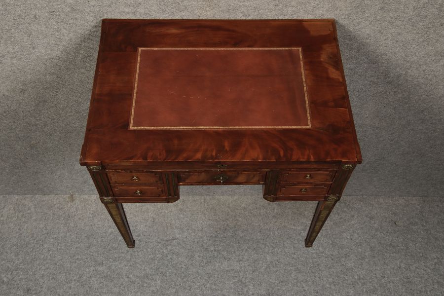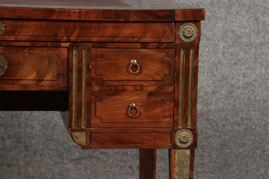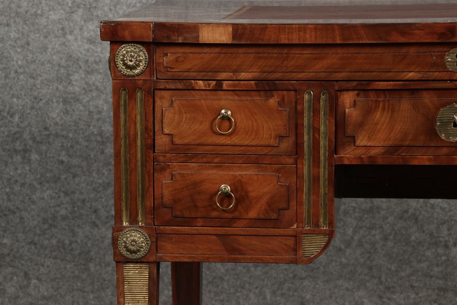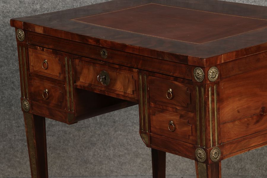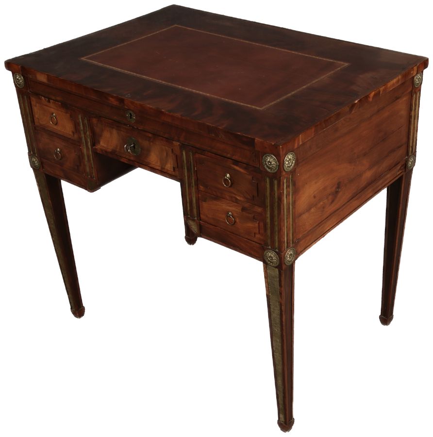 Kleiner Schreibtisch, Roentgen-Schule, deutsch um 1785-90 Mahagonifurnier mit vergoldeten Messingbeschlägen auf Weichholzkern.Breite: 85 cm Tiefe: 61 cm Höhe. 82 cm Beschreibung,;. Das kleine Schreibmöbel steht auf eckigen, konisch zulaufenden Füssen, deren Felder mit geriffelten, vergoldeten Messingblechen gefüllt sind. Am Ansatz der Beine , unterhalb der Tischplatte, sind jeweils nur zwei , mit vergoldeten Messingblechen ausgeschlagene Kanneluren vorhanden , was höchst ungewöhnlich ist. Rechts und links befinden sich übereinanderliegend je zwei kleine Schubfächer, in der Mitte ein grösseres Schubfach, das abschliessbar ist. Die abgerundeten Eckzwickel sind gleichfalls mit geriffelten, vergoldeten Messingblechen gefüllt. Die Handhaben aller Fächer sind als einfache runde, vergoldete Messingschilder mit Zugringen gestaltet. Das Schlüsselschild des mittleren Schubfachs ist ein rundes, geriffeltes und vergoldetes Mesingblech. Das kleine Schubfach unten rechts ist als Geheimfach ausgebaut, indem es in der Hälfte der gesamten Tiefe seitlich wegzuklappen ist und sodann zwei übereinander liegende kleine Fächer freigibt. Zwischen den Schubladen und dem Blatt des Tisches befindet sich ein schmales abschliessbares Fach, welches herauszuziehen ist und eine Schreibplatte birgt. Spuren an der Unterseite des Tischblattes bzw . der Innenseite der Rückwand des Möbels lassen darauf schliessen, dass es ursprünglich über einen Mechanismus verfügte, der die abschliessbare Schreibplatte bei Freigabe herausfahren liess. DieSchreibplatte verfügt noch über die originale Lederbespannung der Herstellungszeit.Einordnung;_ Aufgrund der geriffelten , vergoldeten Messingbleche in der Dekoration sowie der Spuren eines ehemals vorhandenen Mechanismus ist das Möbel eindeutig dem späten Stil des David Roentgen zuzuweisen . Die sehr einfach gestalteneo Handhaben, wie auch der sehr ungewöhnliche Gebrauch von nur zwei Kanneluren am oberen Ende der Füsse könnten auch auf den fränzösischen Ehenisten C.C. Sauanier (Meister 1752) in Paris hinweisen , der zeitgleich mit David Roentgen in einem sehr ähnlichen Stil arbeitete. Im Ganzen handelt es sich um ein besonders schönes Schreibmöbel des späten 18. Jahrhunderts in gutem Erhaltungszustand. Ein Riss in der oberen Tischplatte sollte beobachtet werden , bedarf aber aktuell nicht der Restaurierung.Ich taxiere den Wert dieses musealen Möbels mit sfr. 25'000.00- 28'000.00. Luzern, im Oktober 2006 Detlev Freigang M.A., Kunsthistoriker Literatur: • Huth , Hans: Abraham und David Roentgen und ihre NeuwiederMöbelwerkstatt München 1927 und 1974 .• Greber, Josef Maria: Abraham und David Roentgen. Möbel für Europa,2 Bde., Starnberg 1980.• Fabian, Dietrich: Roentgenmöbel aus Neuwied . Leben und Werk vonAbraham und David Roentgen . Internationale Akademie für Kulturwissenschaft Bad Neustadt 1986.