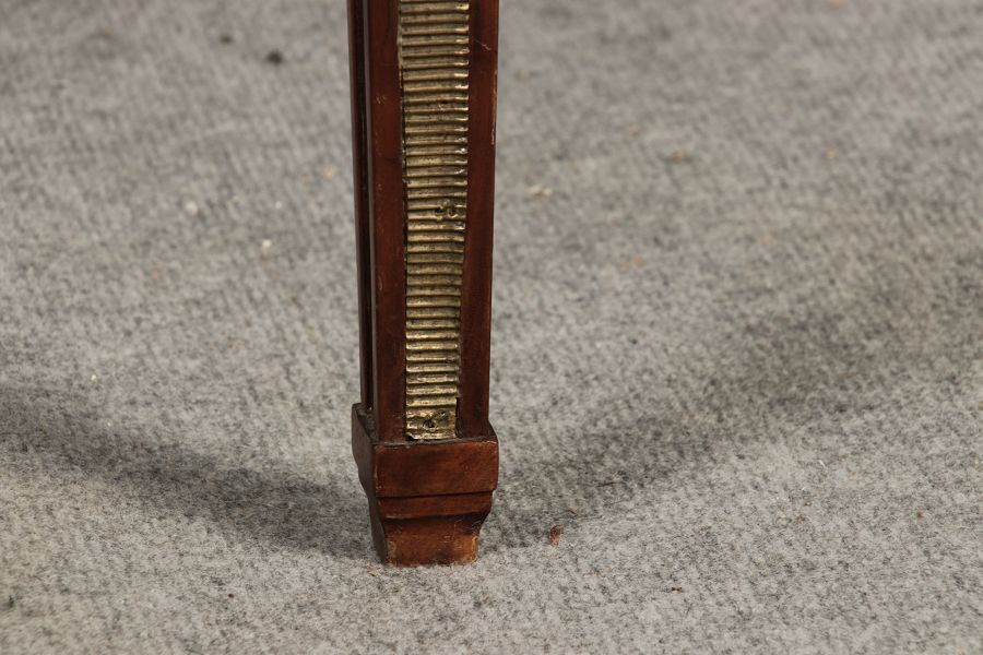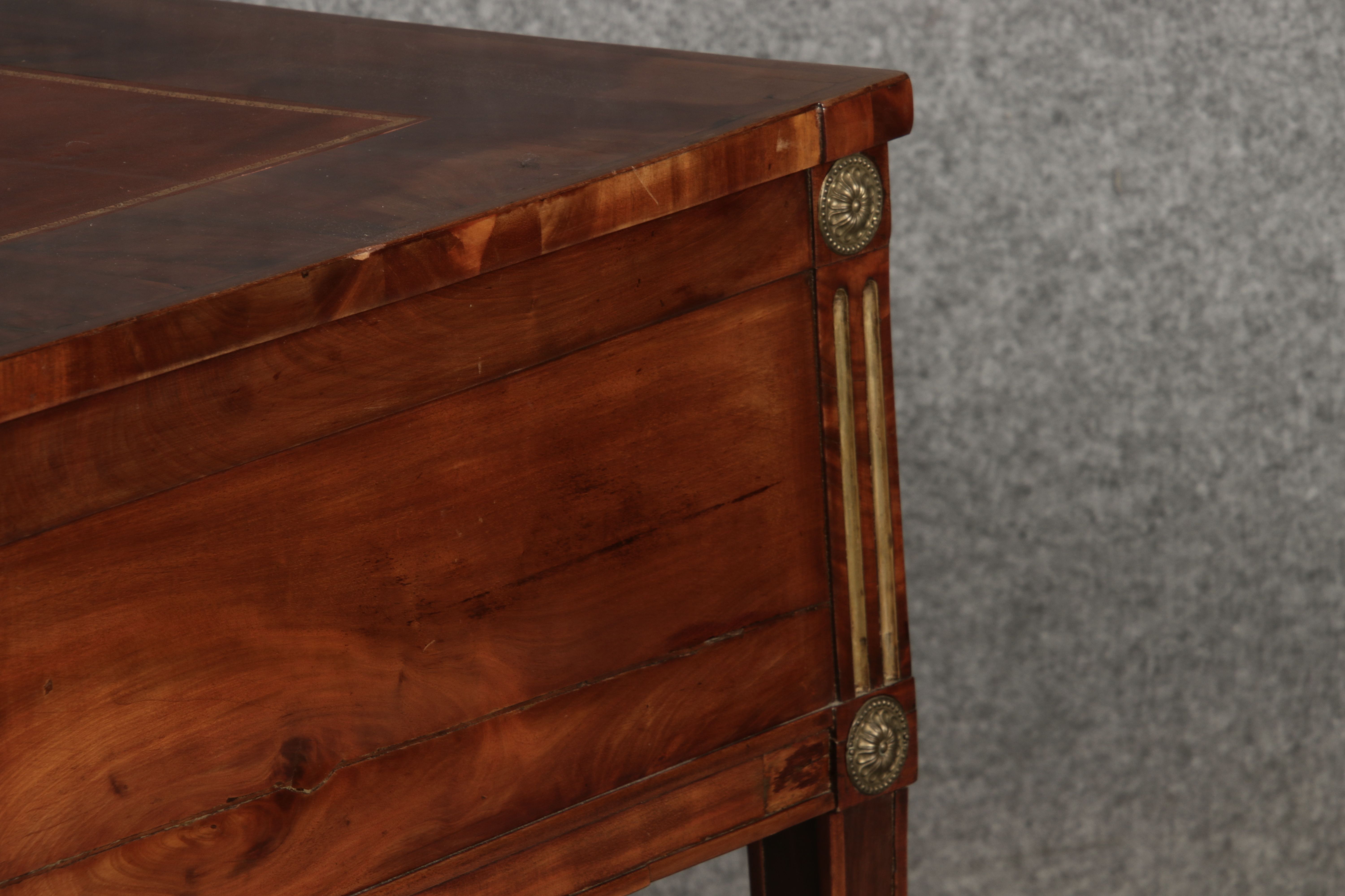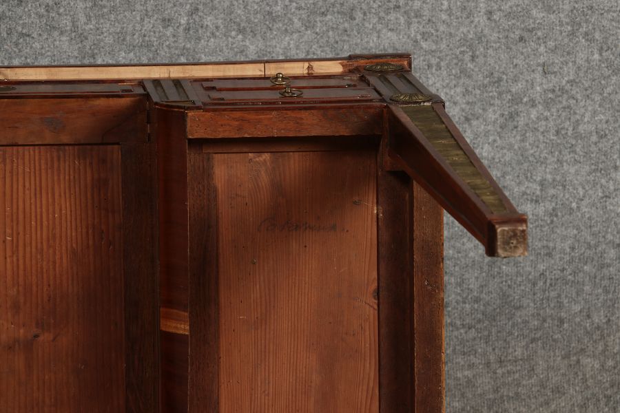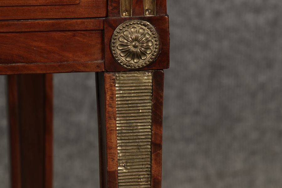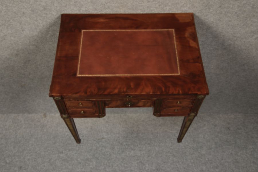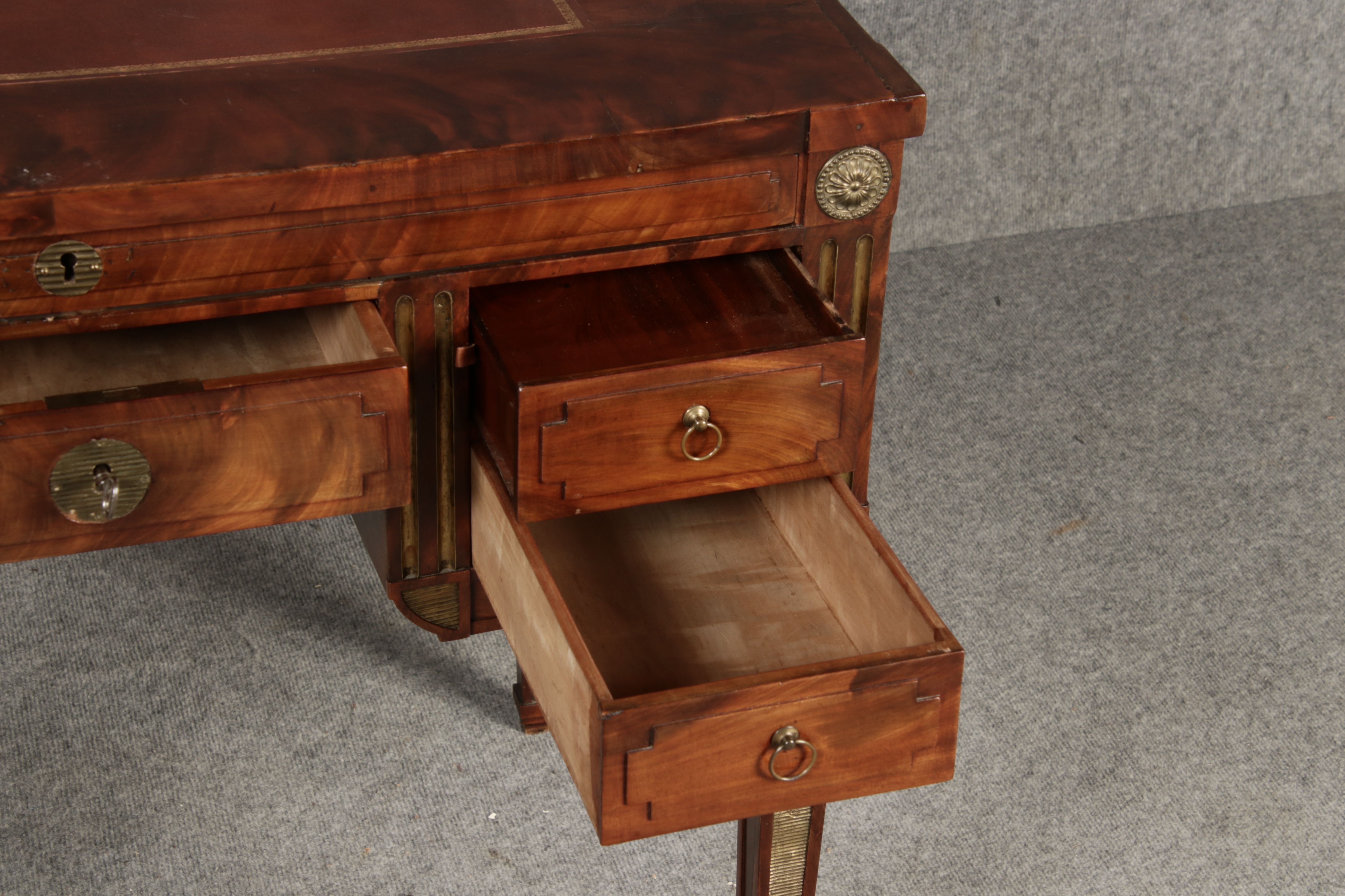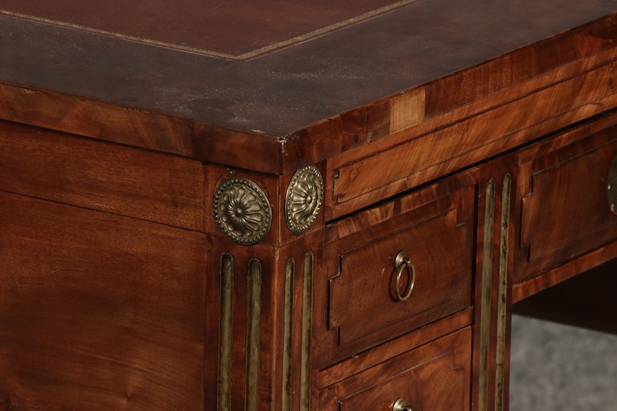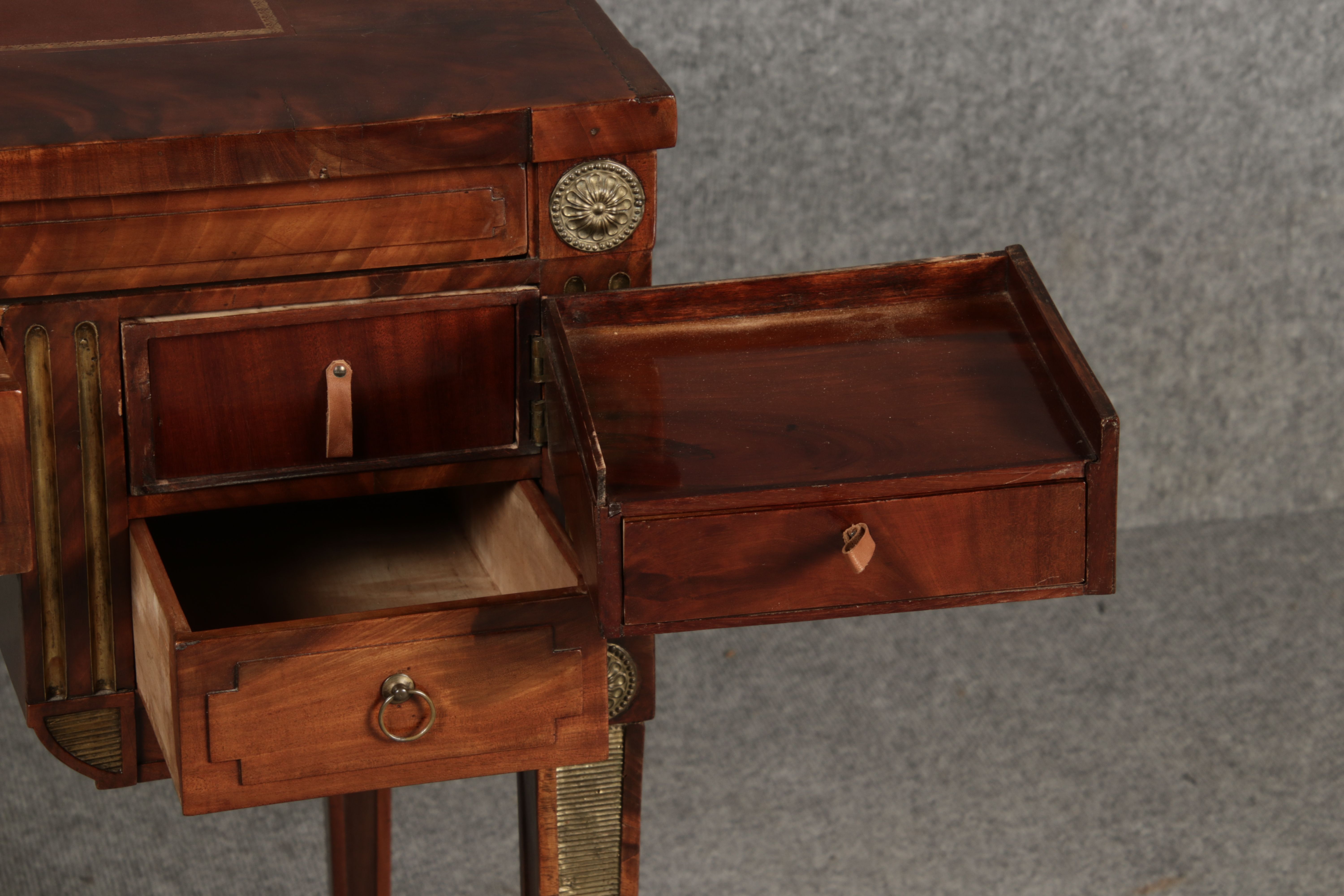 Kleiner Schreibtisch, Roentgen-Schule, deutsch um 1785-90 Mahagonifurnier mit vergoldeten Messingbeschlägen auf Weichholzkern.Breite: 85 cm Tiefe: 61 cm Höhe. 82 cm Beschreibung,;. Das kleine Schreibmöbel steht auf eckigen, konisch zulaufenden Füssen, deren Felder mit geriffelten, vergoldeten Messingblechen gefüllt sind. Am Ansatz der Beine , unterhalb der Tischplatte, sind jeweils nur zwei , mit vergoldeten Messingblechen ausgeschlagene Kanneluren vorhanden , was höchst ungewöhnlich ist. Rechts und links befinden sich übereinanderliegend je zwei kleine Schubfächer, in der Mitte ein grösseres Schubfach, das abschliessbar ist. Die abgerundeten Eckzwickel sind gleichfalls mit geriffelten, vergoldeten Messingblechen gefüllt. Die Handhaben aller Fächer sind als einfache runde, vergoldete Messingschilder mit Zugringen gestaltet. Das Schlüsselschild des mittleren Schubfachs ist ein rundes, geriffeltes und vergoldetes Mesingblech. Das kleine Schubfach unten rechts ist als Geheimfach ausgebaut, indem es in der Hälfte der gesamten Tiefe seitlich wegzuklappen ist und sodann zwei übereinander liegende kleine Fächer freigibt. Zwischen den Schubladen und dem Blatt des Tisches befindet sich ein schmales abschliessbares Fach, welches herauszuziehen ist und eine Schreibplatte birgt. Spuren an der Unterseite des Tischblattes bzw . der Innenseite der Rückwand des Möbels lassen darauf schliessen, dass es ursprünglich über einen Mechanismus verfügte, der die abschliessbare Schreibplatte bei Freigabe herausfahren liess. DieSchreibplatte verfügt noch über die originale Lederbespannung der Herstellungszeit.Einordnung;_ Aufgrund der geriffelten , vergoldeten Messingbleche in der Dekoration sowie der Spuren eines ehemals vorhandenen Mechanismus ist das Möbel eindeutig dem späten Stil des David Roentgen zuzuweisen . Die sehr einfach gestalteneo Handhaben, wie auch der sehr ungewöhnliche Gebrauch von nur zwei Kanneluren am oberen Ende der Füsse könnten auch auf den fränzösischen Ehenisten C.C. Sauanier (Meister 1752) in Paris hinweisen , der zeitgleich mit David Roentgen in einem sehr ähnlichen Stil arbeitete. Im Ganzen handelt es sich um ein besonders schönes Schreibmöbel des späten 18. Jahrhunderts in gutem Erhaltungszustand. Ein Riss in der oberen Tischplatte sollte beobachtet werden , bedarf aber aktuell nicht der Restaurierung.Ich taxiere den Wert dieses musealen Möbels mit sfr. 25'000.00- 28'000.00. Luzern, im Oktober 2006 Detlev Freigang M.A., Kunsthistoriker Literatur: • Huth , Hans: Abraham und David Roentgen und ihre NeuwiederMöbelwerkstatt München 1927 und 1974 .• Greber, Josef Maria: Abraham und David Roentgen. Möbel für Europa,2 Bde., Starnberg 1980.• Fabian, Dietrich: Roentgenmöbel aus Neuwied . Leben und Werk vonAbraham und David Roentgen . Internationale Akademie für Kulturwissenschaft Bad Neustadt 1986.