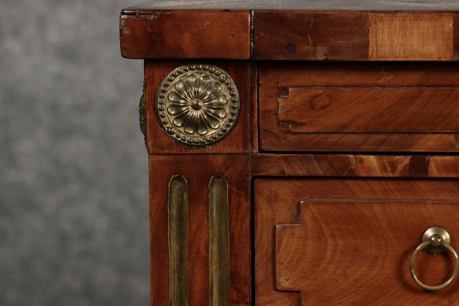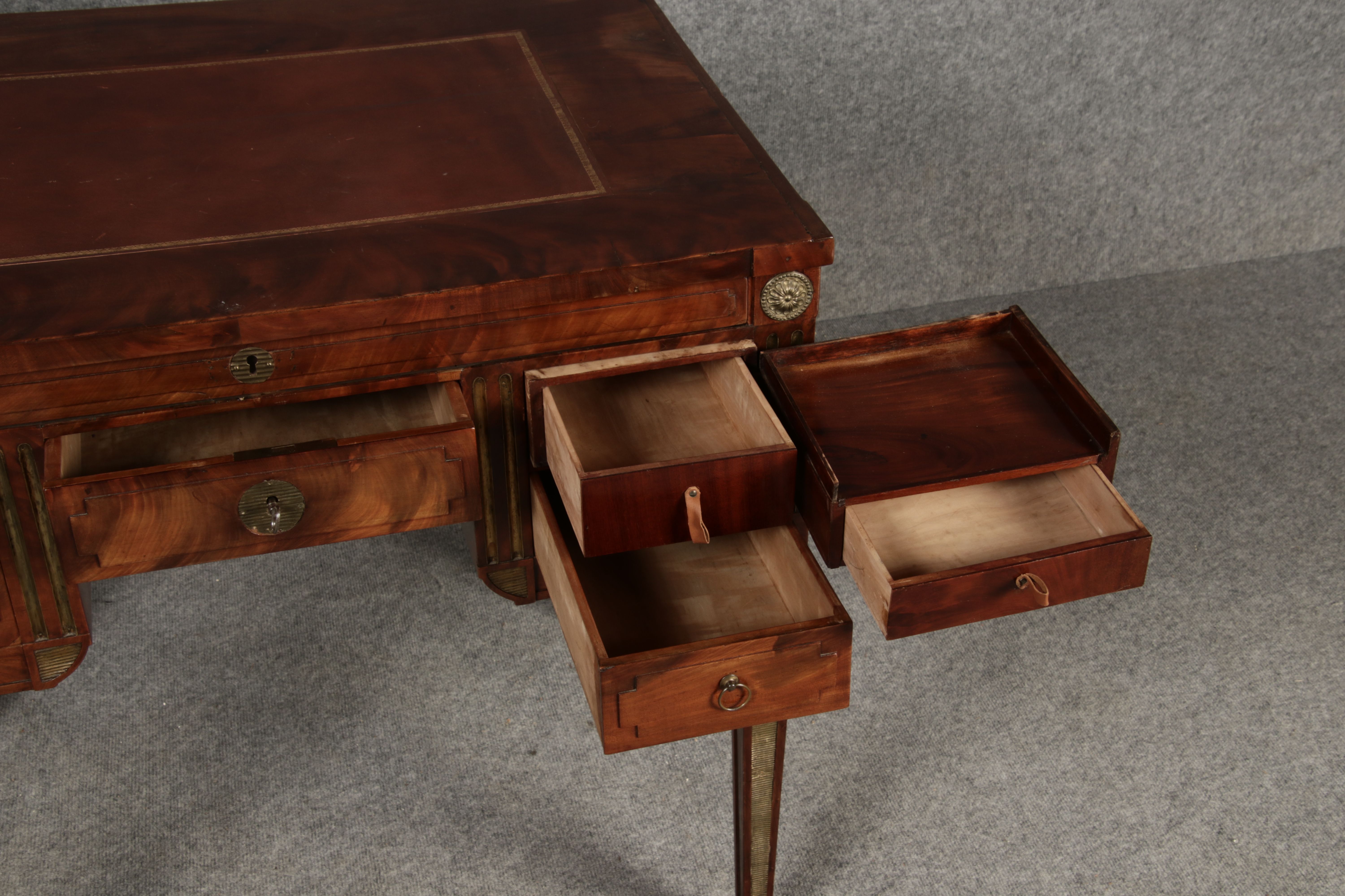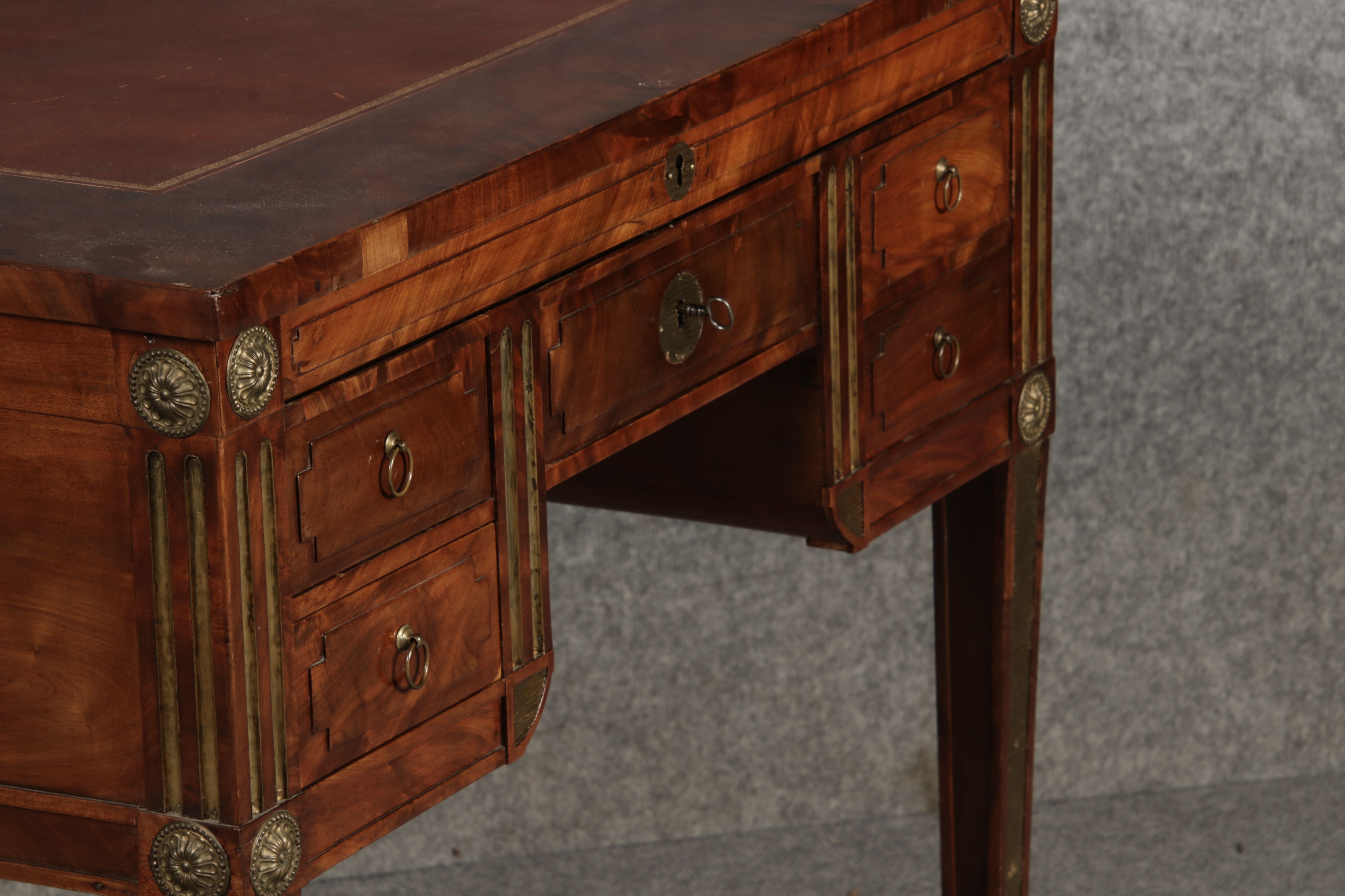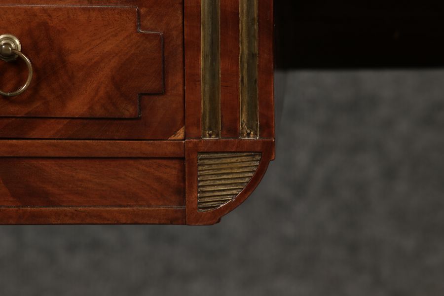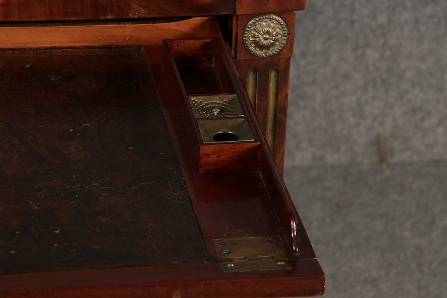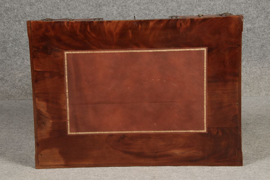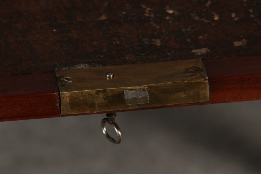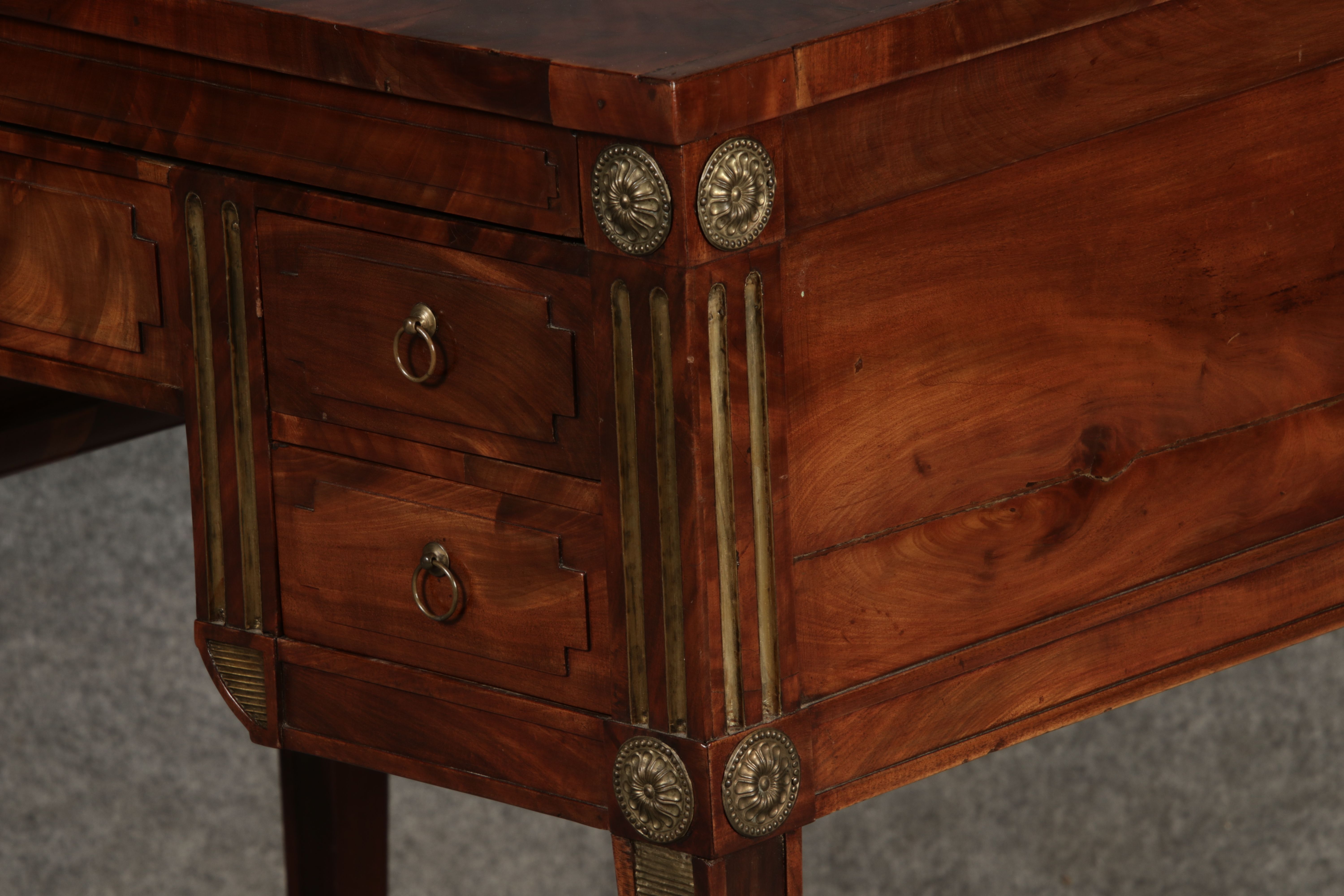 Kleiner Schreibtisch, Roentgen-Schule, deutsch um 1785-90 Mahagonifurnier mit vergoldeten Messingbeschlägen auf Weichholzkern.Breite: 85 cm Tiefe: 61 cm Höhe. 82 cm Beschreibung,;. Das kleine Schreibmöbel steht auf eckigen, konisch zulaufenden Füssen, deren Felder mit geriffelten, vergoldeten Messingblechen gefüllt sind. Am Ansatz der Beine , unterhalb der Tischplatte, sind jeweils nur zwei , mit vergoldeten Messingblechen ausgeschlagene Kanneluren vorhanden , was höchst ungewöhnlich ist. Rechts und links befinden sich übereinanderliegend je zwei kleine Schubfächer, in der Mitte ein grösseres Schubfach, das abschliessbar ist. Die abgerundeten Eckzwickel sind gleichfalls mit geriffelten, vergoldeten Messingblechen gefüllt. Die Handhaben aller Fächer sind als einfache runde, vergoldete Messingschilder mit Zugringen gestaltet. Das Schlüsselschild des mittleren Schubfachs ist ein rundes, geriffeltes und vergoldetes Mesingblech. Das kleine Schubfach unten rechts ist als Geheimfach ausgebaut, indem es in der Hälfte der gesamten Tiefe seitlich wegzuklappen ist und sodann zwei übereinander liegende kleine Fächer freigibt. Zwischen den Schubladen und dem Blatt des Tisches befindet sich ein schmales abschliessbares Fach, welches herauszuziehen ist und eine Schreibplatte birgt. Spuren an der Unterseite des Tischblattes bzw . der Innenseite der Rückwand des Möbels lassen darauf schliessen, dass es ursprünglich über einen Mechanismus verfügte, der die abschliessbare Schreibplatte bei Freigabe herausfahren liess. DieSchreibplatte verfügt noch über die originale Lederbespannung der Herstellungszeit.Einordnung;_ Aufgrund der geriffelten , vergoldeten Messingbleche in der Dekoration sowie der Spuren eines ehemals vorhandenen Mechanismus ist das Möbel eindeutig dem späten Stil des David Roentgen zuzuweisen . Die sehr einfach gestalteneo Handhaben, wie auch der sehr ungewöhnliche Gebrauch von nur zwei Kanneluren am oberen Ende der Füsse könnten auch auf den fränzösischen Ehenisten C.C. Sauanier (Meister 1752) in Paris hinweisen , der zeitgleich mit David Roentgen in einem sehr ähnlichen Stil arbeitete. Im Ganzen handelt es sich um ein besonders schönes Schreibmöbel des späten 18. Jahrhunderts in gutem Erhaltungszustand. Ein Riss in der oberen Tischplatte sollte beobachtet werden , bedarf aber aktuell nicht der Restaurierung.Ich taxiere den Wert dieses musealen Möbels mit sfr. 25'000.00- 28'000.00. Luzern, im Oktober 2006 Detlev Freigang M.A., Kunsthistoriker Literatur: • Huth , Hans: Abraham und David Roentgen und ihre NeuwiederMöbelwerkstatt München 1927 und 1974 .• Greber, Josef Maria: Abraham und David Roentgen. Möbel für Europa,2 Bde., Starnberg 1980.• Fabian, Dietrich: Roentgenmöbel aus Neuwied . Leben und Werk vonAbraham und David Roentgen . Internationale Akademie für Kulturwissenschaft Bad Neustadt 1986.