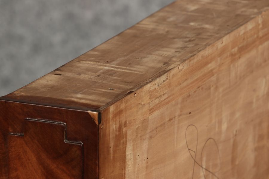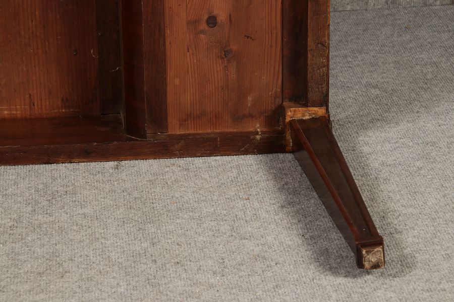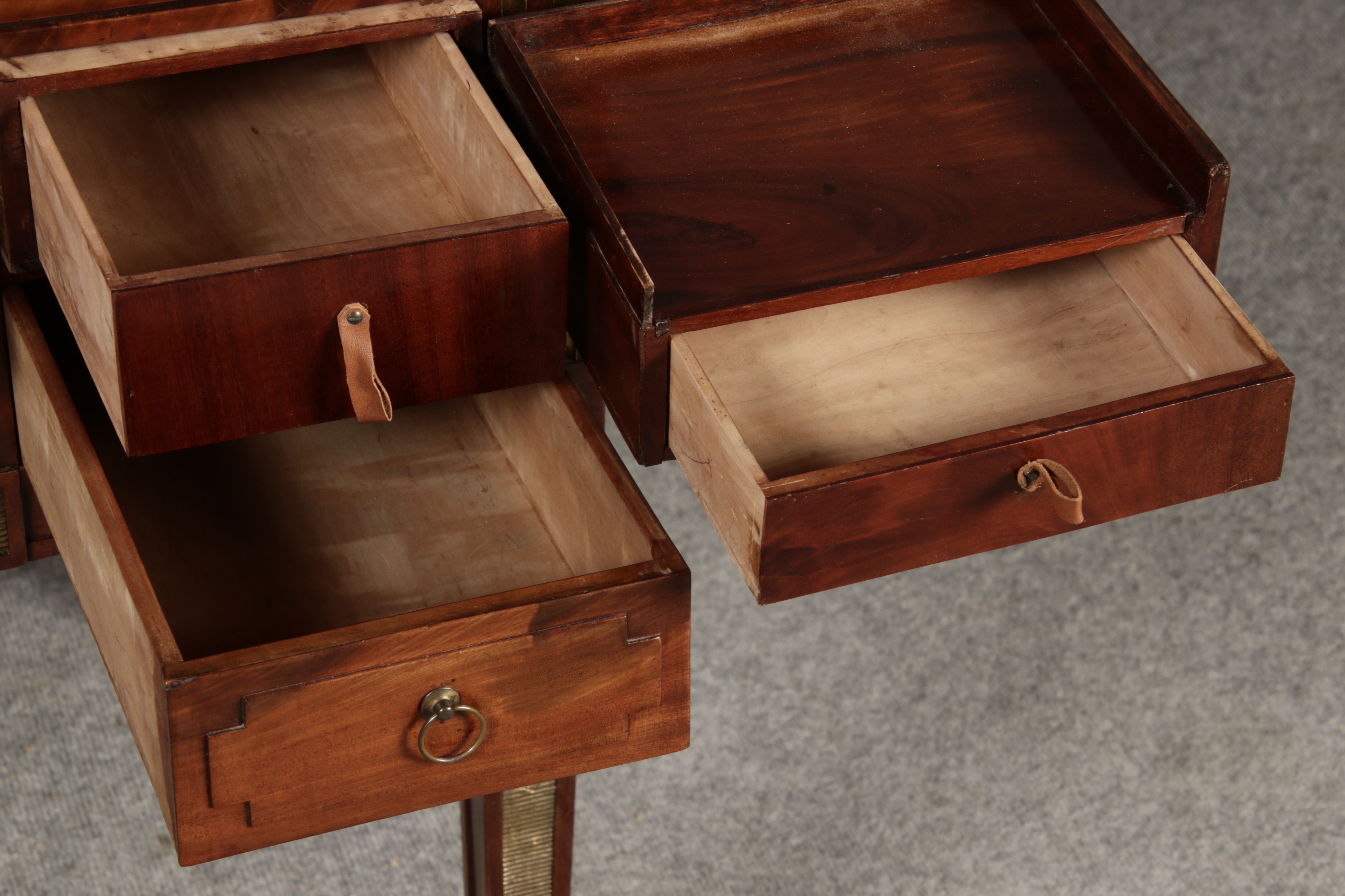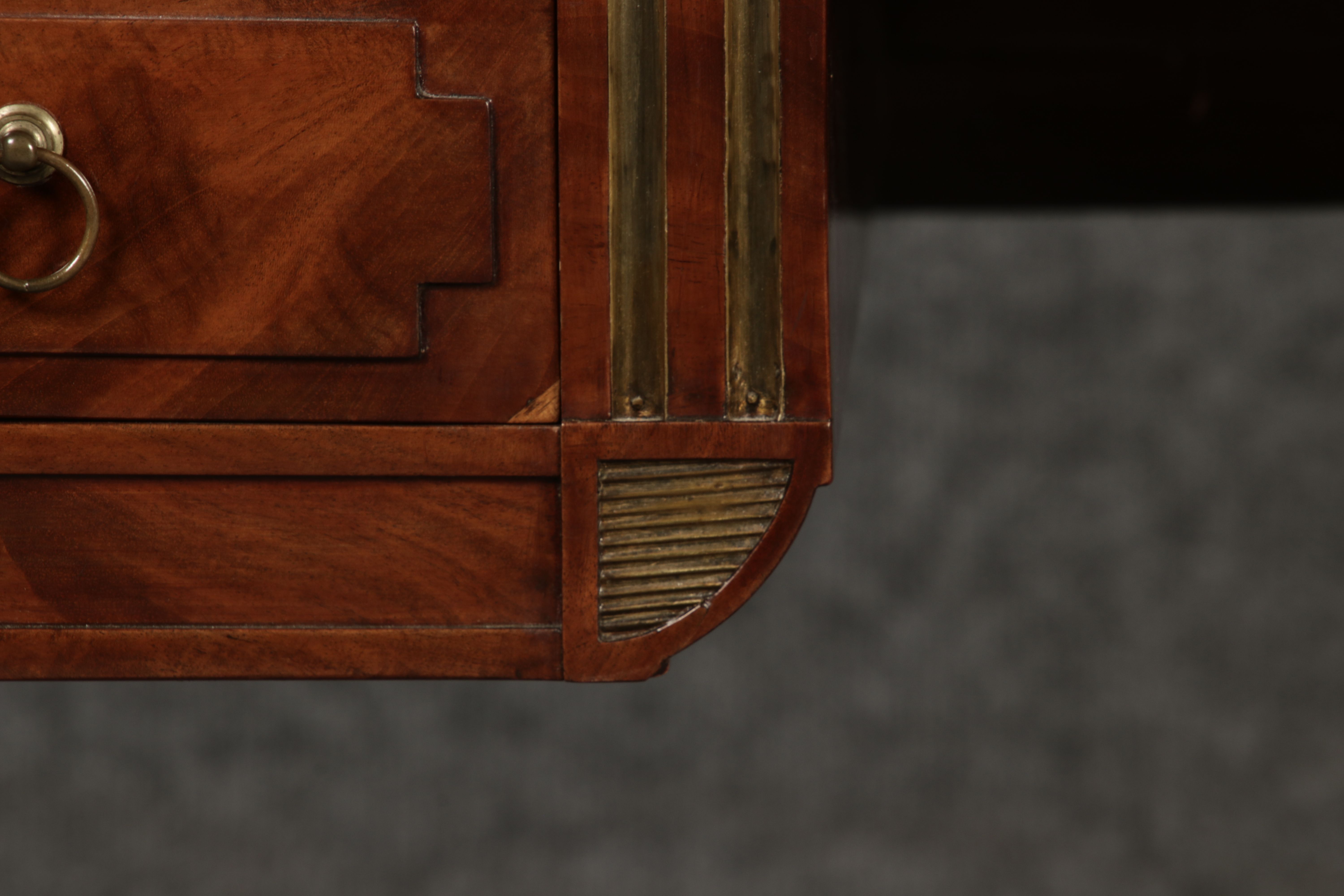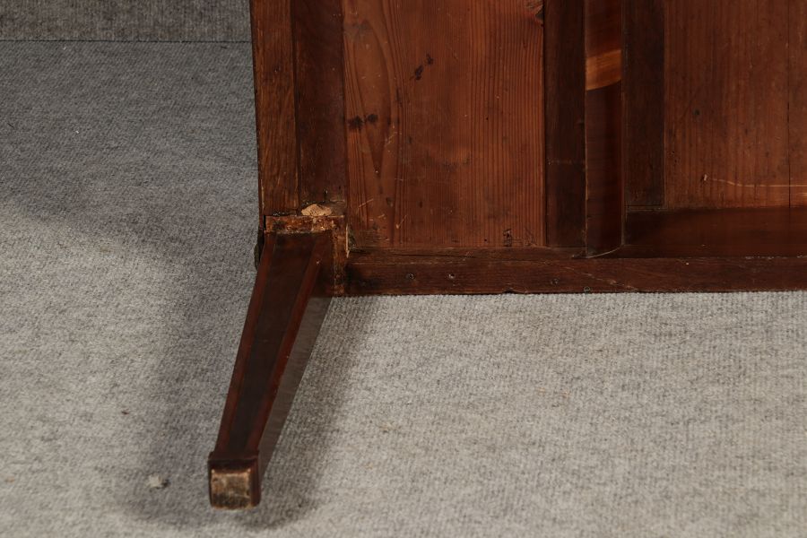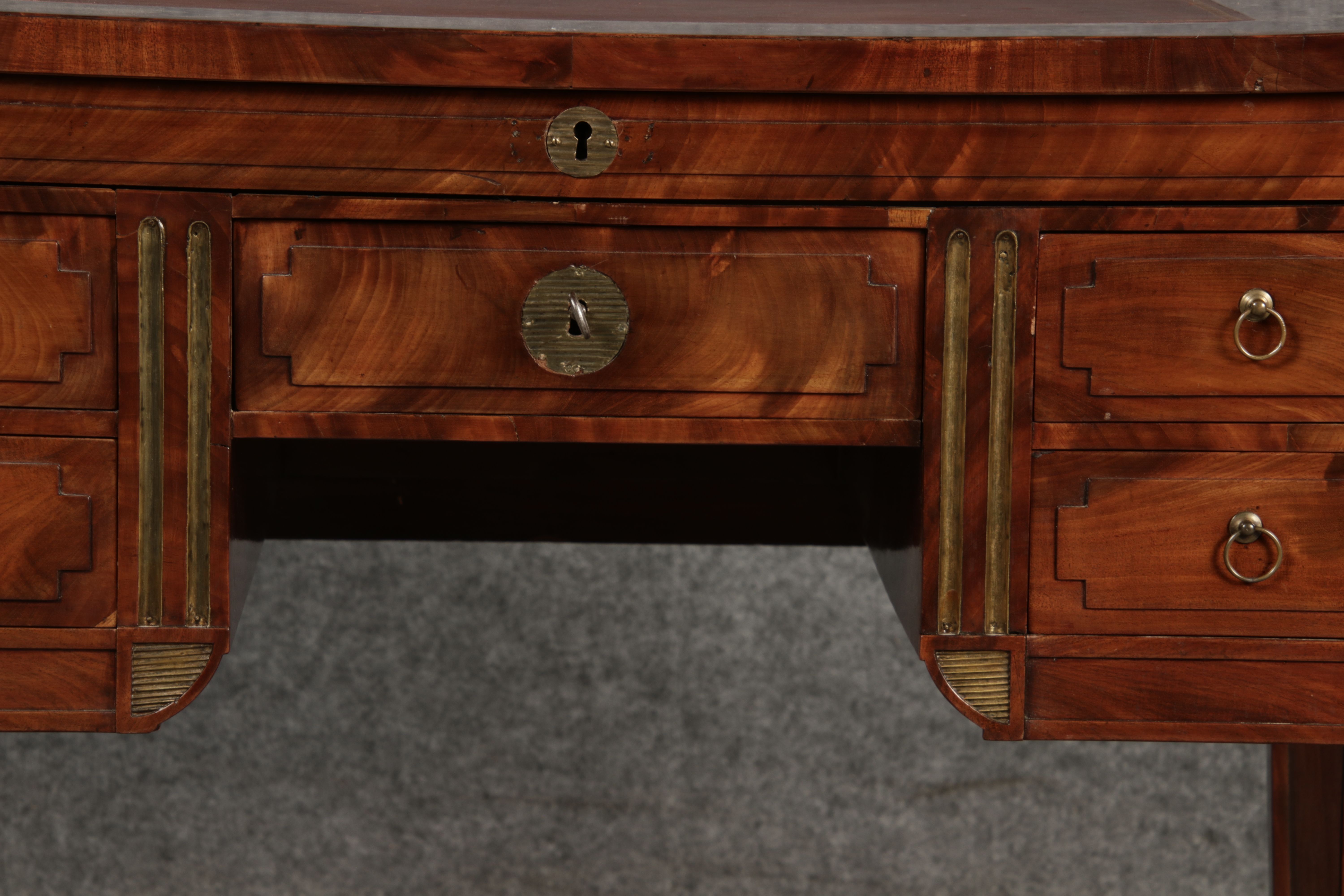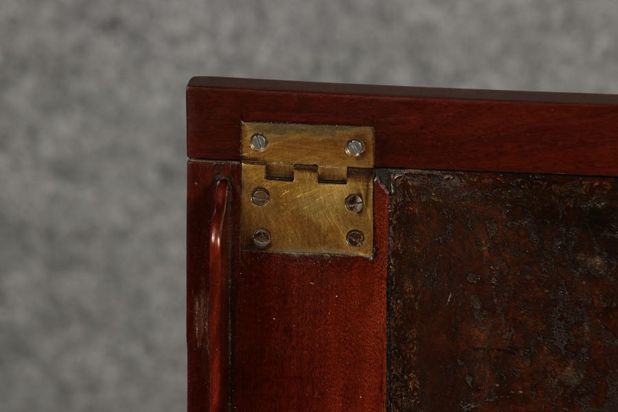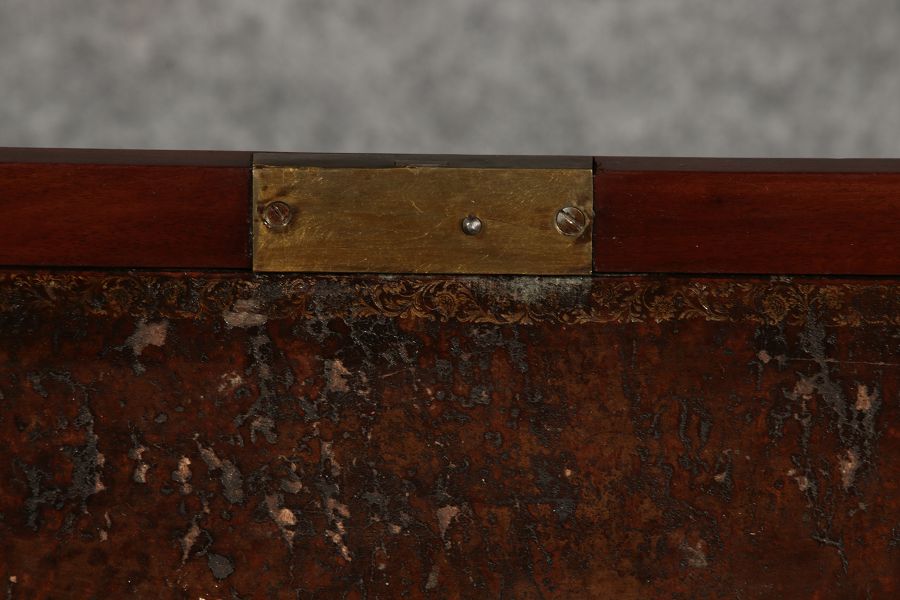 Kleiner Schreibtisch, Roentgen-Schule, deutsch um 1785-90 Mahagonifurnier mit vergoldeten Messingbeschlägen auf Weichholzkern.Breite: 85 cm Tiefe: 61 cm Höhe. 82 cm Beschreibung,;. Das kleine Schreibmöbel steht auf eckigen, konisch zulaufenden Füssen, deren Felder mit geriffelten, vergoldeten Messingblechen gefüllt sind. Am Ansatz der Beine , unterhalb der Tischplatte, sind jeweils nur zwei , mit vergoldeten Messingblechen ausgeschlagene Kanneluren vorhanden , was höchst ungewöhnlich ist. Rechts und links befinden sich übereinanderliegend je zwei kleine Schubfächer, in der Mitte ein grösseres Schubfach, das abschliessbar ist. Die abgerundeten Eckzwickel sind gleichfalls mit geriffelten, vergoldeten Messingblechen gefüllt. Die Handhaben aller Fächer sind als einfache runde, vergoldete Messingschilder mit Zugringen gestaltet. Das Schlüsselschild des mittleren Schubfachs ist ein rundes, geriffeltes und vergoldetes Mesingblech. Das kleine Schubfach unten rechts ist als Geheimfach ausgebaut, indem es in der Hälfte der gesamten Tiefe seitlich wegzuklappen ist und sodann zwei übereinander liegende kleine Fächer freigibt. Zwischen den Schubladen und dem Blatt des Tisches befindet sich ein schmales abschliessbares Fach, welches herauszuziehen ist und eine Schreibplatte birgt. Spuren an der Unterseite des Tischblattes bzw . der Innenseite der Rückwand des Möbels lassen darauf schliessen, dass es ursprünglich über einen Mechanismus verfügte, der die abschliessbare Schreibplatte bei Freigabe herausfahren liess. DieSchreibplatte verfügt noch über die originale Lederbespannung der Herstellungszeit.Einordnung;_ Aufgrund der geriffelten , vergoldeten Messingbleche in der Dekoration sowie der Spuren eines ehemals vorhandenen Mechanismus ist das Möbel eindeutig dem späten Stil des David Roentgen zuzuweisen . Die sehr einfach gestalteneo Handhaben, wie auch der sehr ungewöhnliche Gebrauch von nur zwei Kanneluren am oberen Ende der Füsse könnten auch auf den fränzösischen Ehenisten C.C. Sauanier (Meister 1752) in Paris hinweisen , der zeitgleich mit David Roentgen in einem sehr ähnlichen Stil arbeitete. Im Ganzen handelt es sich um ein besonders schönes Schreibmöbel des späten 18. Jahrhunderts in gutem Erhaltungszustand. Ein Riss in der oberen Tischplatte sollte beobachtet werden , bedarf aber aktuell nicht der Restaurierung.Ich taxiere den Wert dieses musealen Möbels mit sfr. 25'000.00- 28'000.00. Luzern, im Oktober 2006 Detlev Freigang M.A., Kunsthistoriker Literatur: • Huth , Hans: Abraham und David Roentgen und ihre NeuwiederMöbelwerkstatt München 1927 und 1974 .• Greber, Josef Maria: Abraham und David Roentgen. Möbel für Europa,2 Bde., Starnberg 1980.• Fabian, Dietrich: Roentgenmöbel aus Neuwied . Leben und Werk vonAbraham und David Roentgen . Internationale Akademie für Kulturwissenschaft Bad Neustadt 1986.