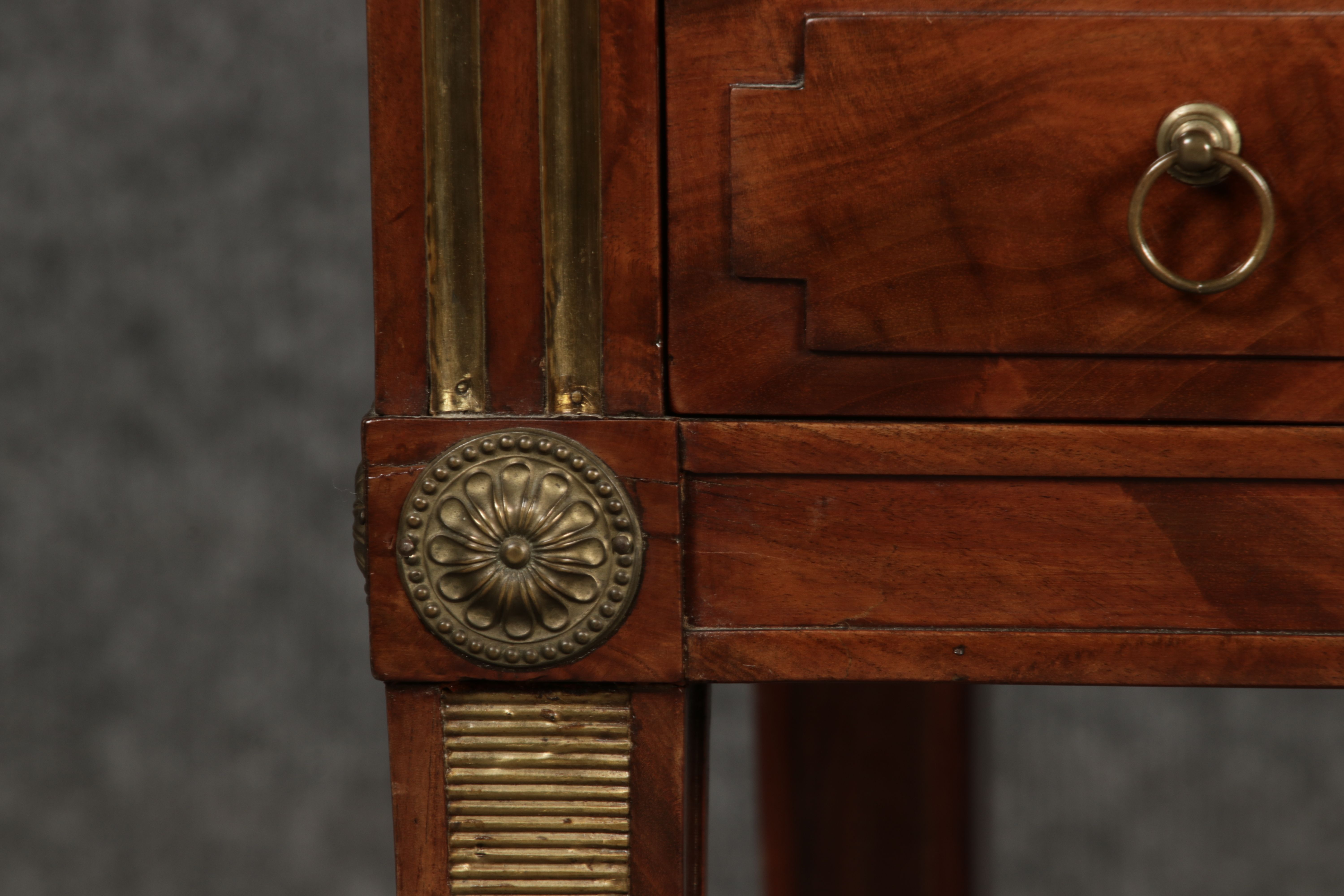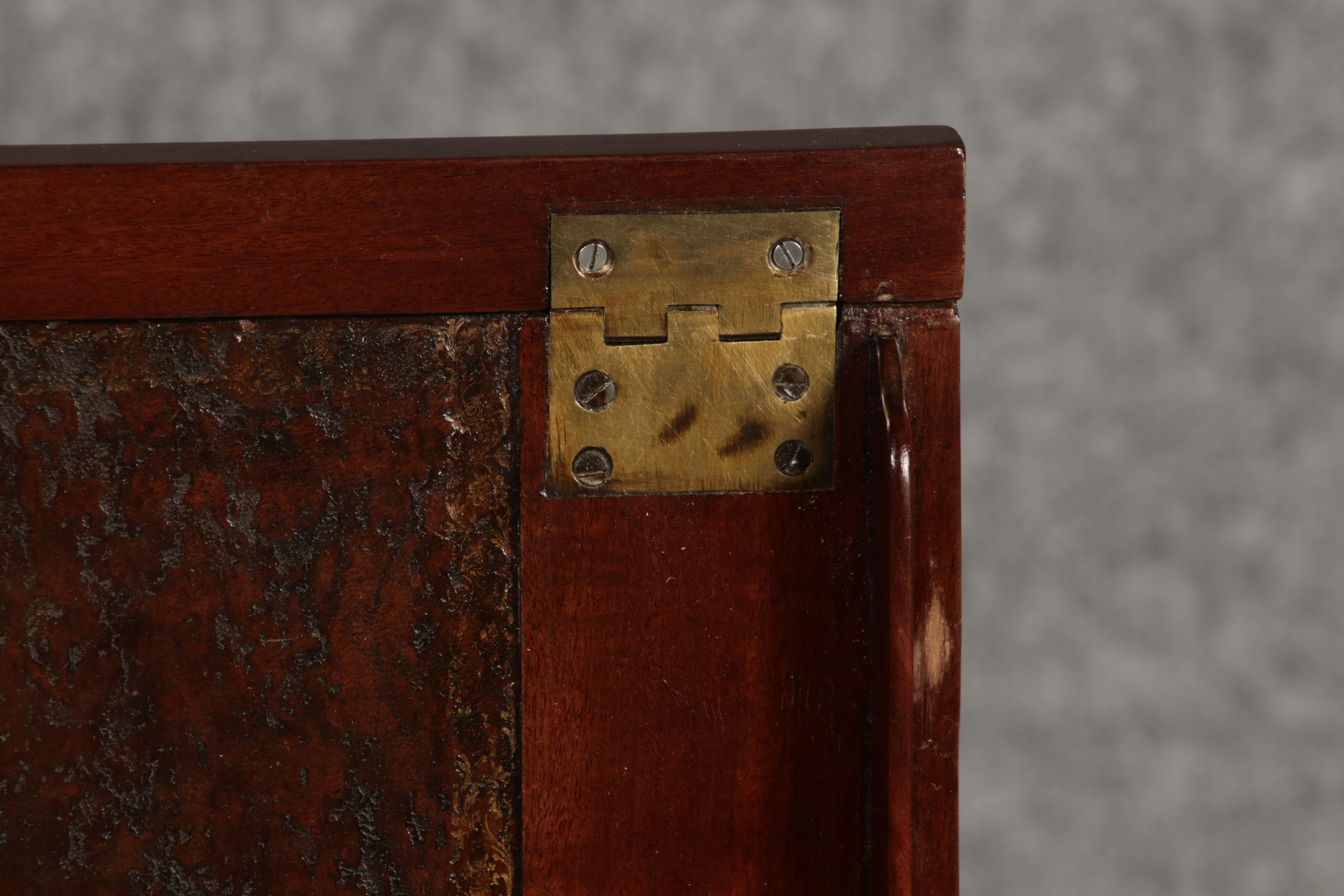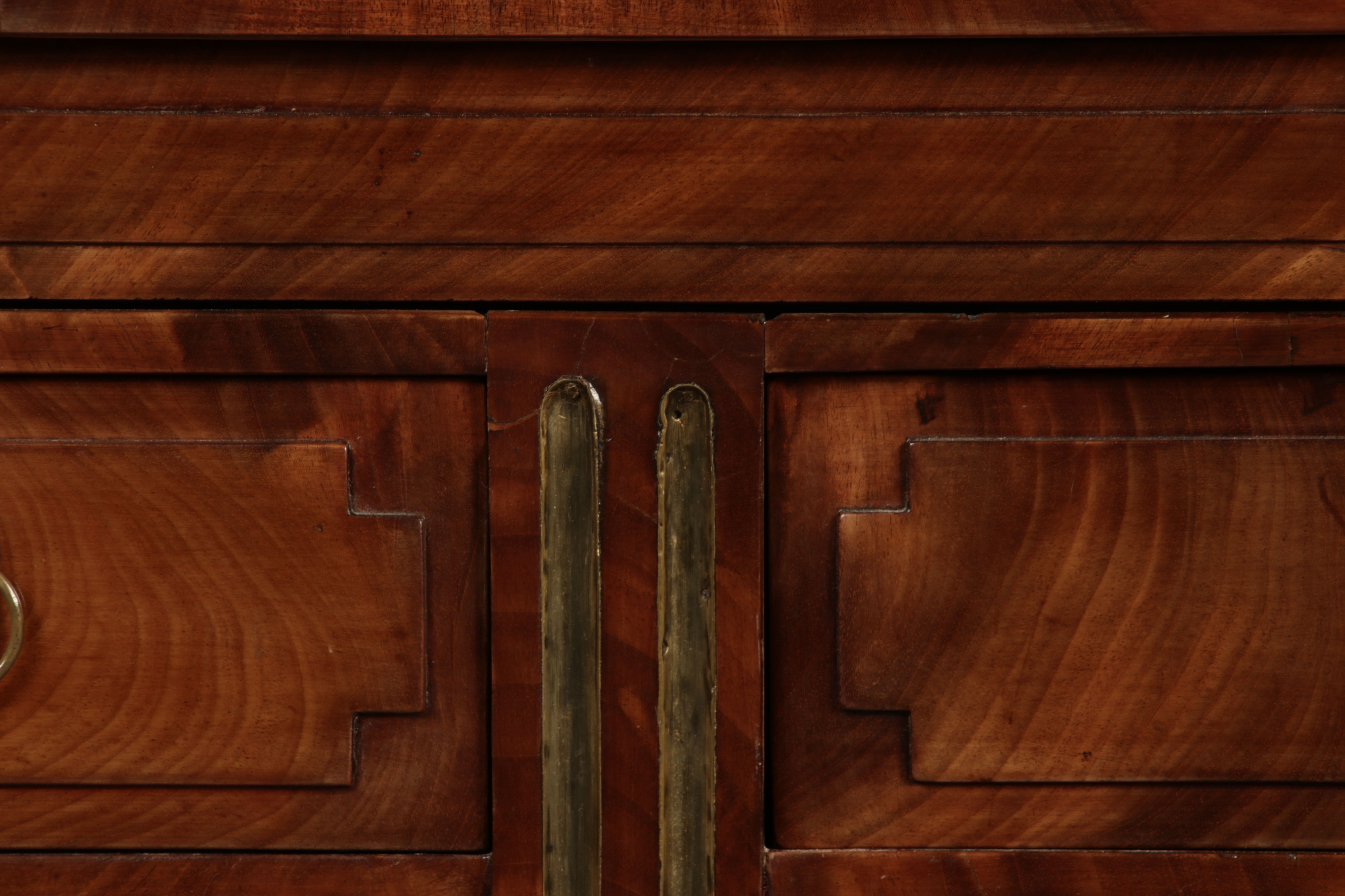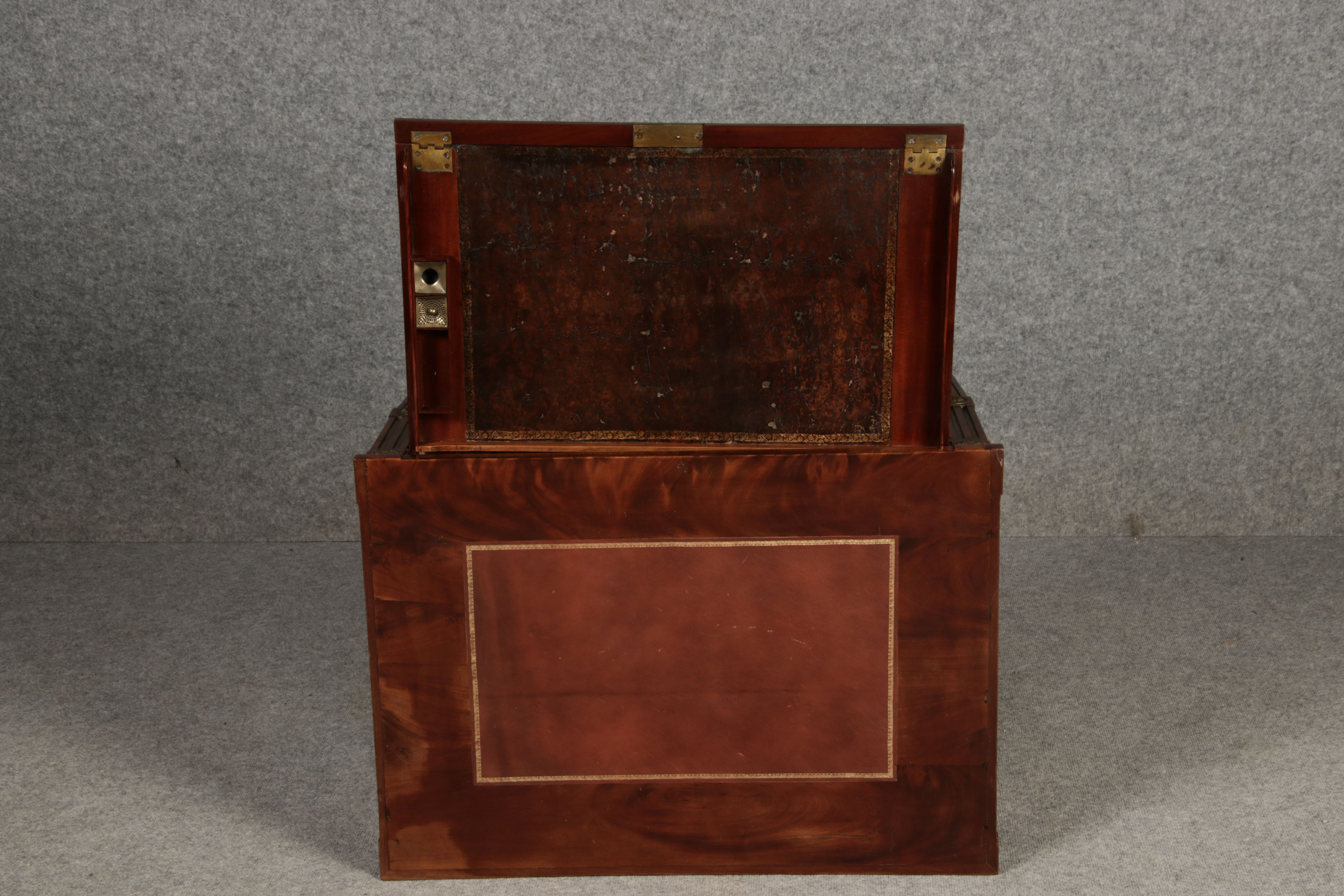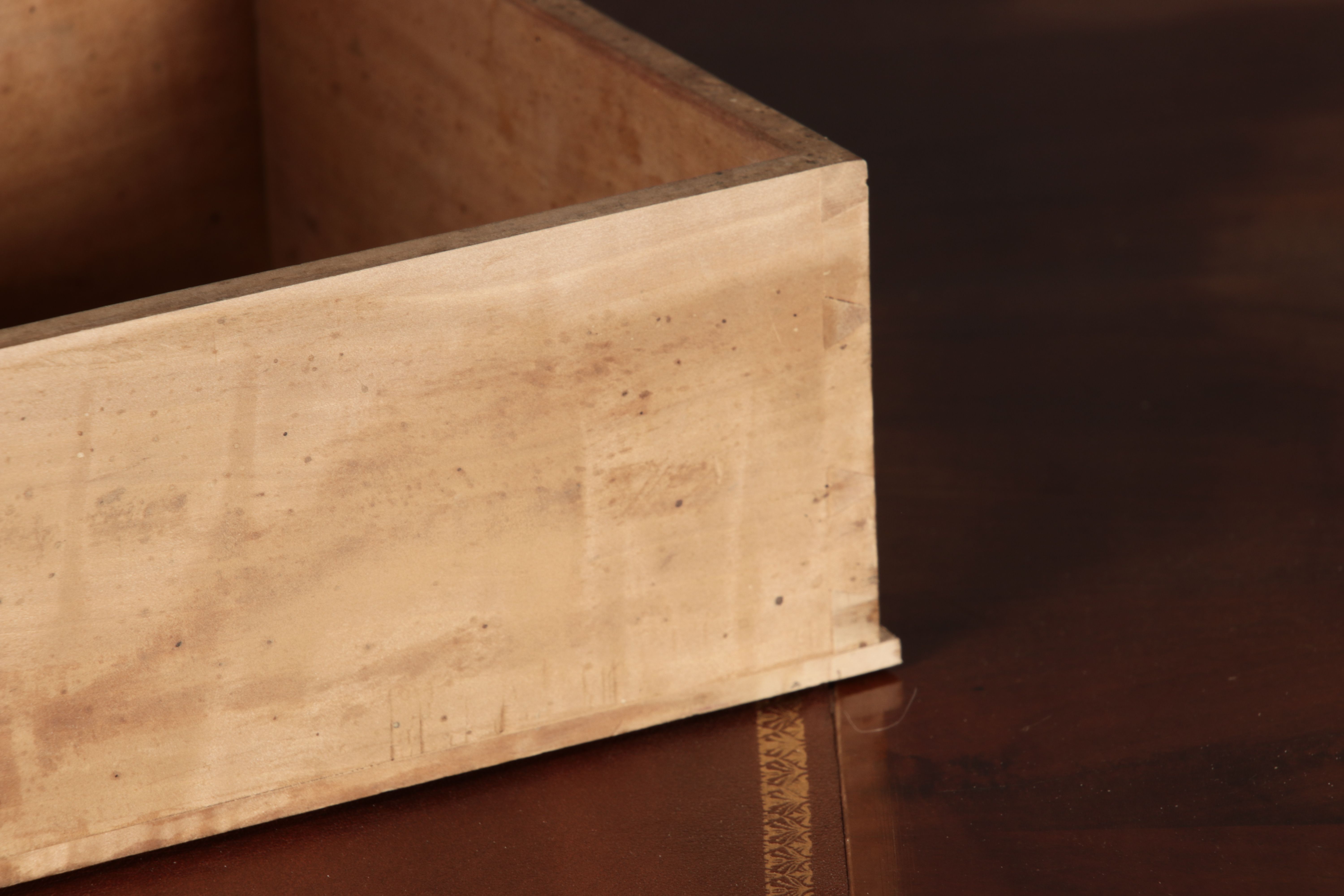 Kleiner Schreibtisch, Roentgen-Schule, deutsch um 1785-90 Mahagonifurnier mit vergoldeten Messingbeschlägen auf Weichholzkern.Breite: 85 cm Tiefe: 61 cm Höhe. 82 cm Beschreibung,;. Das kleine Schreibmöbel steht auf eckigen, konisch zulaufenden Füssen, deren Felder mit geriffelten, vergoldeten Messingblechen gefüllt sind. Am Ansatz der Beine , unterhalb der Tischplatte, sind jeweils nur zwei , mit vergoldeten Messingblechen ausgeschlagene Kanneluren vorhanden , was höchst ungewöhnlich ist. Rechts und links befinden sich übereinanderliegend je zwei kleine Schubfächer, in der Mitte ein grösseres Schubfach, das abschliessbar ist. Die abgerundeten Eckzwickel sind gleichfalls mit geriffelten, vergoldeten Messingblechen gefüllt. Die Handhaben aller Fächer sind als einfache runde, vergoldete Messingschilder mit Zugringen gestaltet. Das Schlüsselschild des mittleren Schubfachs ist ein rundes, geriffeltes und vergoldetes Mesingblech. Das kleine Schubfach unten rechts ist als Geheimfach ausgebaut, indem es in der Hälfte der gesamten Tiefe seitlich wegzuklappen ist und sodann zwei übereinander liegende kleine Fächer freigibt. Zwischen den Schubladen und dem Blatt des Tisches befindet sich ein schmales abschliessbares Fach, welches herauszuziehen ist und eine Schreibplatte birgt. Spuren an der Unterseite des Tischblattes bzw . der Innenseite der Rückwand des Möbels lassen darauf schliessen, dass es ursprünglich über einen Mechanismus verfügte, der die abschliessbare Schreibplatte bei Freigabe herausfahren liess. DieSchreibplatte verfügt noch über die originale Lederbespannung der Herstellungszeit.Einordnung;_ Aufgrund der geriffelten , vergoldeten Messingbleche in der Dekoration sowie der Spuren eines ehemals vorhandenen Mechanismus ist das Möbel eindeutig dem späten Stil des David Roentgen zuzuweisen . Die sehr einfach gestalteneo Handhaben, wie auch der sehr ungewöhnliche Gebrauch von nur zwei Kanneluren am oberen Ende der Füsse könnten auch auf den fränzösischen Ehenisten C.C. Sauanier (Meister 1752) in Paris hinweisen , der zeitgleich mit David Roentgen in einem sehr ähnlichen Stil arbeitete. Im Ganzen handelt es sich um ein besonders schönes Schreibmöbel des späten 18. Jahrhunderts in gutem Erhaltungszustand. Ein Riss in der oberen Tischplatte sollte beobachtet werden , bedarf aber aktuell nicht der Restaurierung.Ich taxiere den Wert dieses musealen Möbels mit sfr. 25'000.00- 28'000.00. Luzern, im Oktober 2006 Detlev Freigang M.A., Kunsthistoriker Literatur: • Huth , Hans: Abraham und David Roentgen und ihre NeuwiederMöbelwerkstatt München 1927 und 1974 .• Greber, Josef Maria: Abraham und David Roentgen. Möbel für Europa,2 Bde., Starnberg 1980.• Fabian, Dietrich: Roentgenmöbel aus Neuwied . Leben und Werk vonAbraham und David Roentgen . Internationale Akademie für Kulturwissenschaft Bad Neustadt 1986.