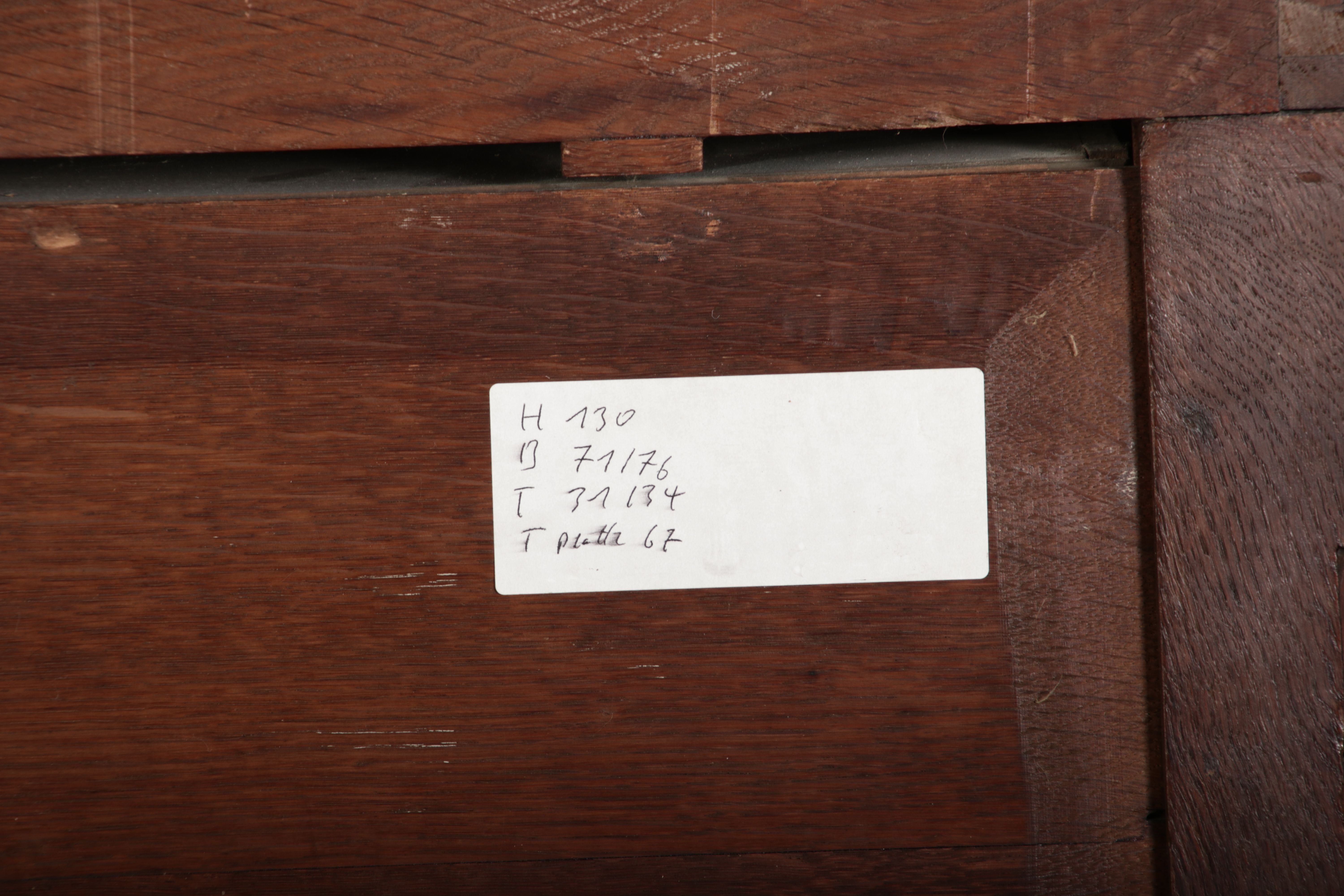 Masse/dimensions: Höhe/Height ca. 130 cm, Breite Korpus/Broad Boda ca. 71 cm, Breite Gesims/Broad cornice ca. 76 cm, Tiefe Korpus/Deep body ca. 31 cm, Tiefe Gesims/Deep cornice ca. 34 cm.