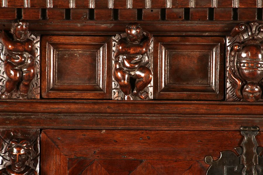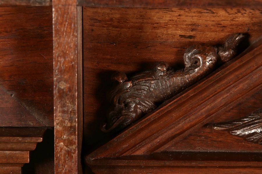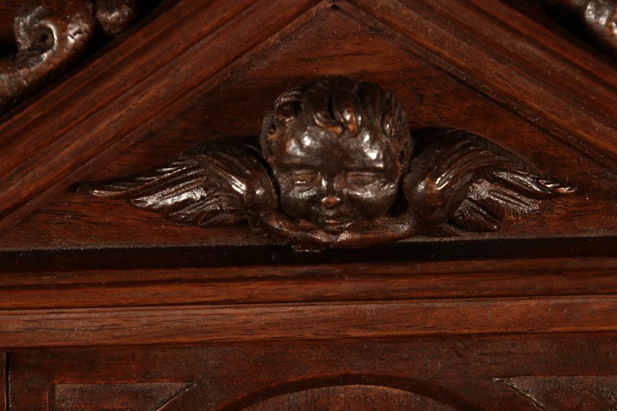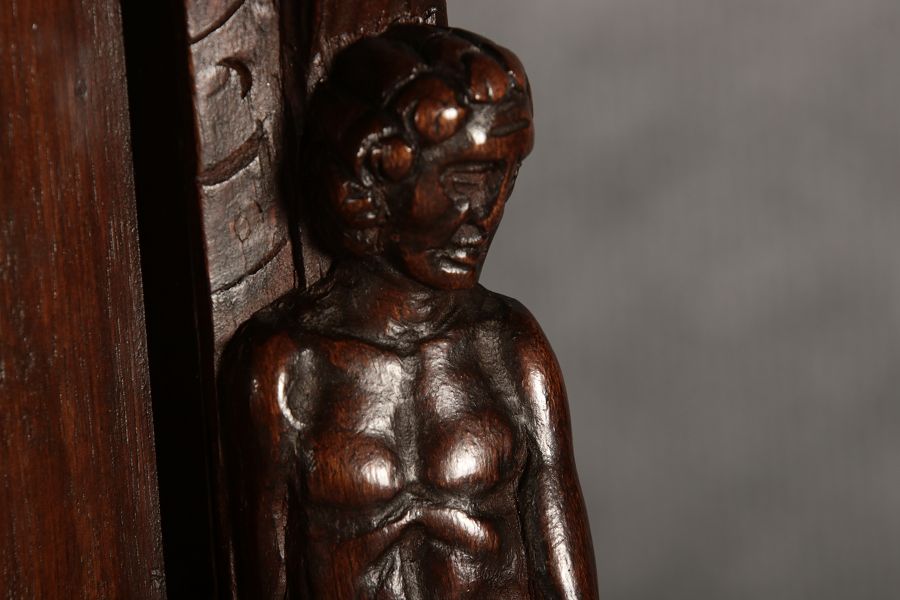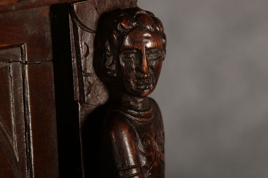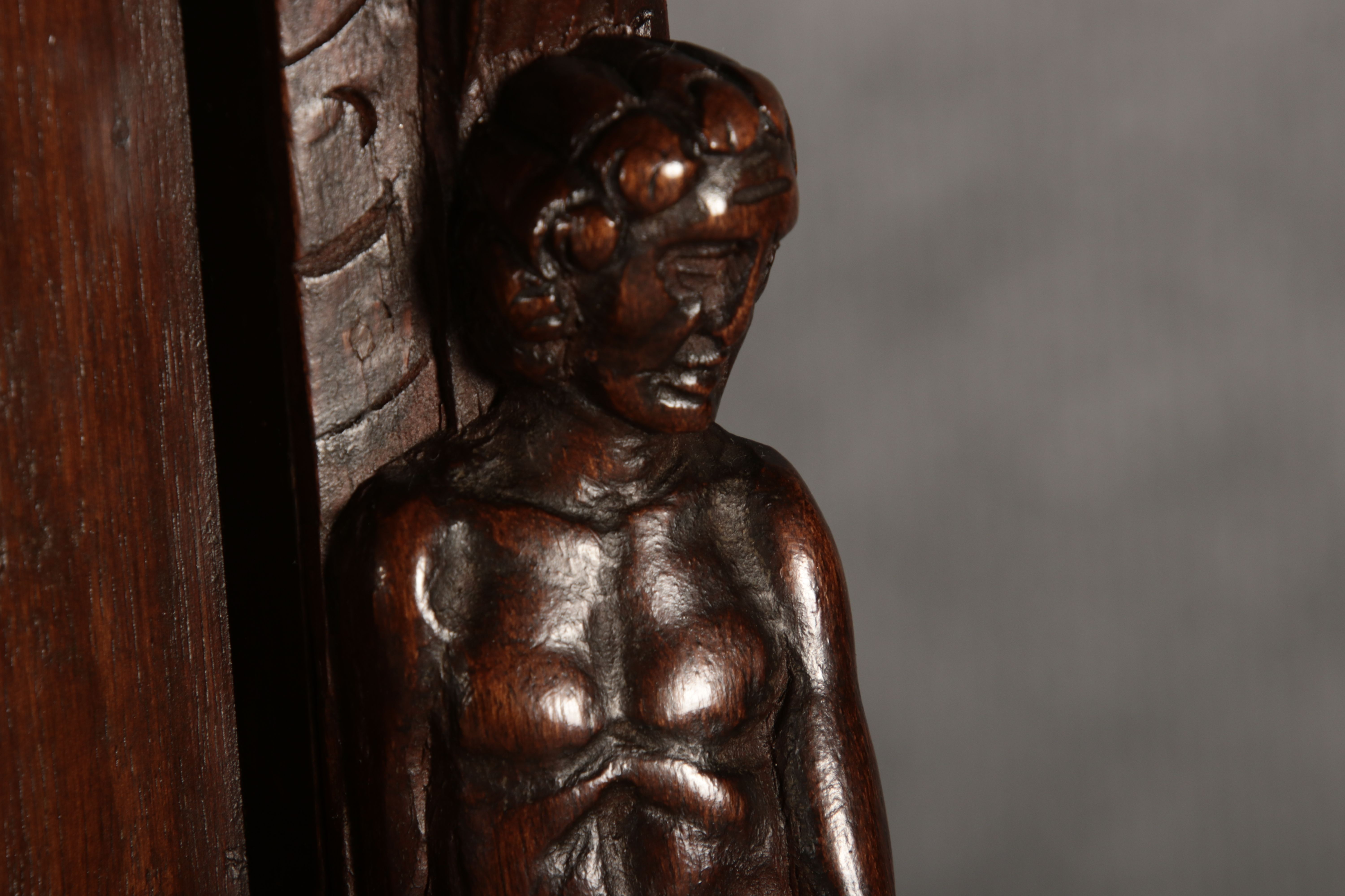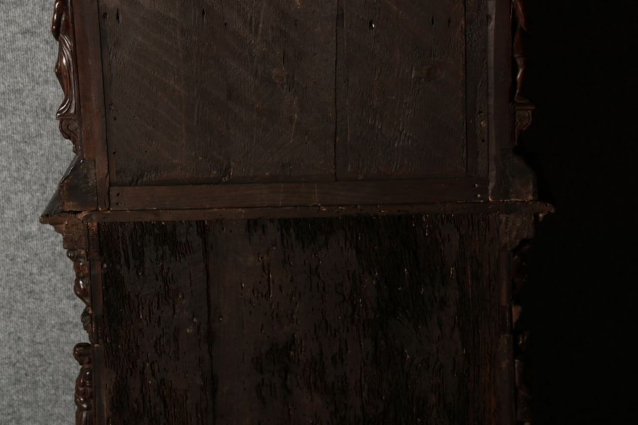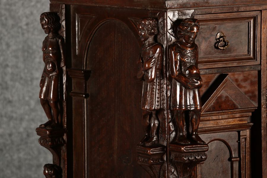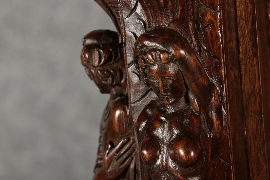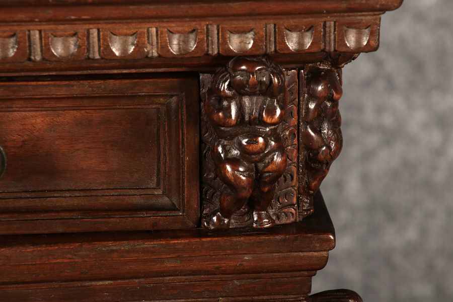 Kleiner Antiker Renaissance-Sekretär, Nussbaum, 17.-19. Jahrhundert Dieser kleine dennoch imposante Renaissance-Sekretär aus Nussbaumholz stammt aus der Zeit zwischen dem 17. und 19. (Teile des Sekretärs lassen darauf schließen, das er im 19 Jh. gefertigt worden ist, eventuell aus alten Teilen.) Jahrhundert und repräsentiert den Stil und die Handwerkskunst der Renaissance-Epoche. Das Möbelstück beeindruckt durch seine aufwendigen Schnitzereien, die kunstvolle Gestaltung und die kraftvolle Präsenz. Dieser Renaissance-Sekretär ist ein beeindruckendes Kunstwerk, das sowohl dekorativ als auch funktional ist. Seine massive Bauweise, gepaart mit der kunstvollen Gestaltung, macht ihn zu einem wahren Prunkstück für jeden Liebhaber historischer Möbel. Der Sekretär bietet nicht nur großzügigen Stauraum, sondern ist auch ein Zeugnis der meisterhaften Handwerkskunst vergangener Jahre. |
