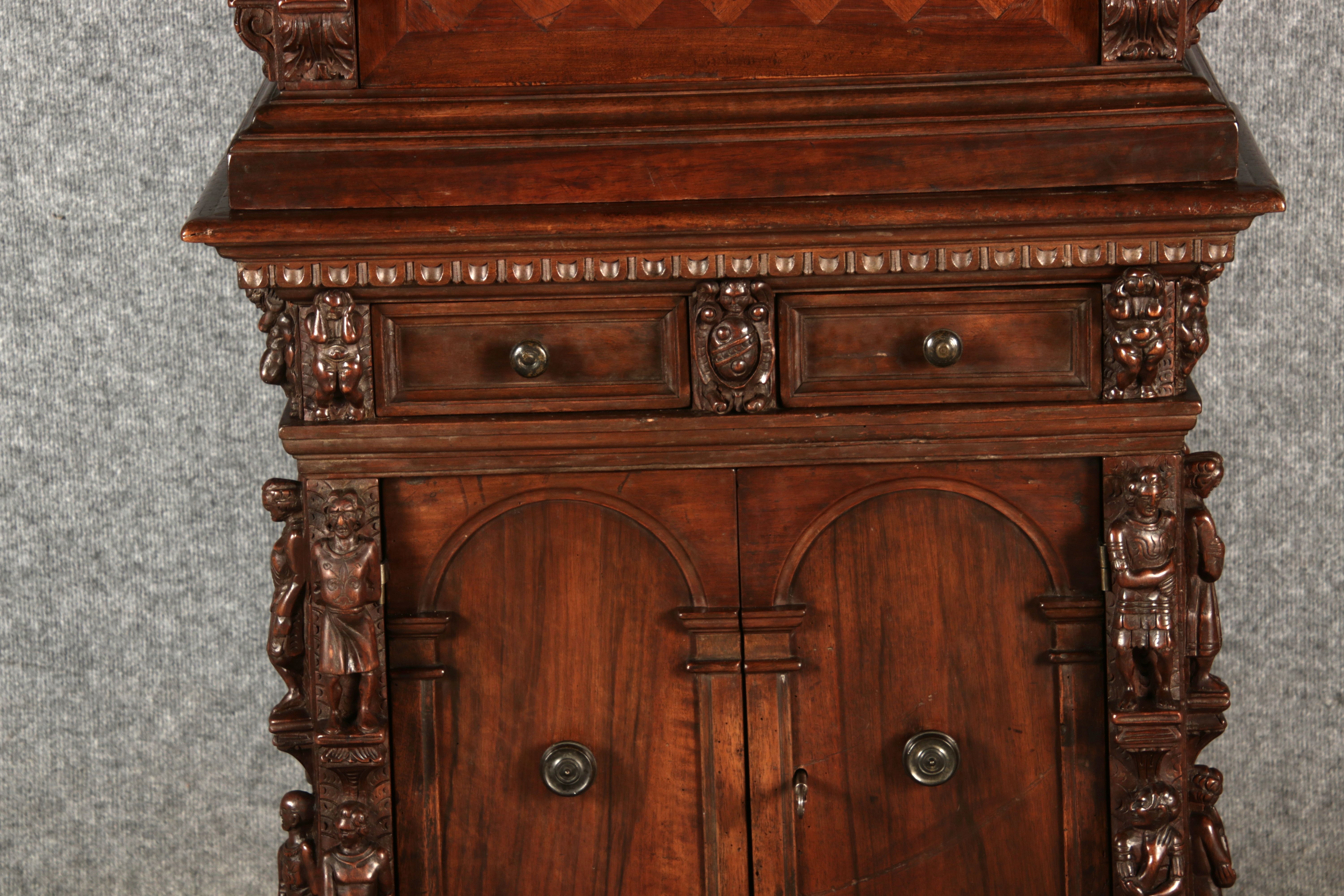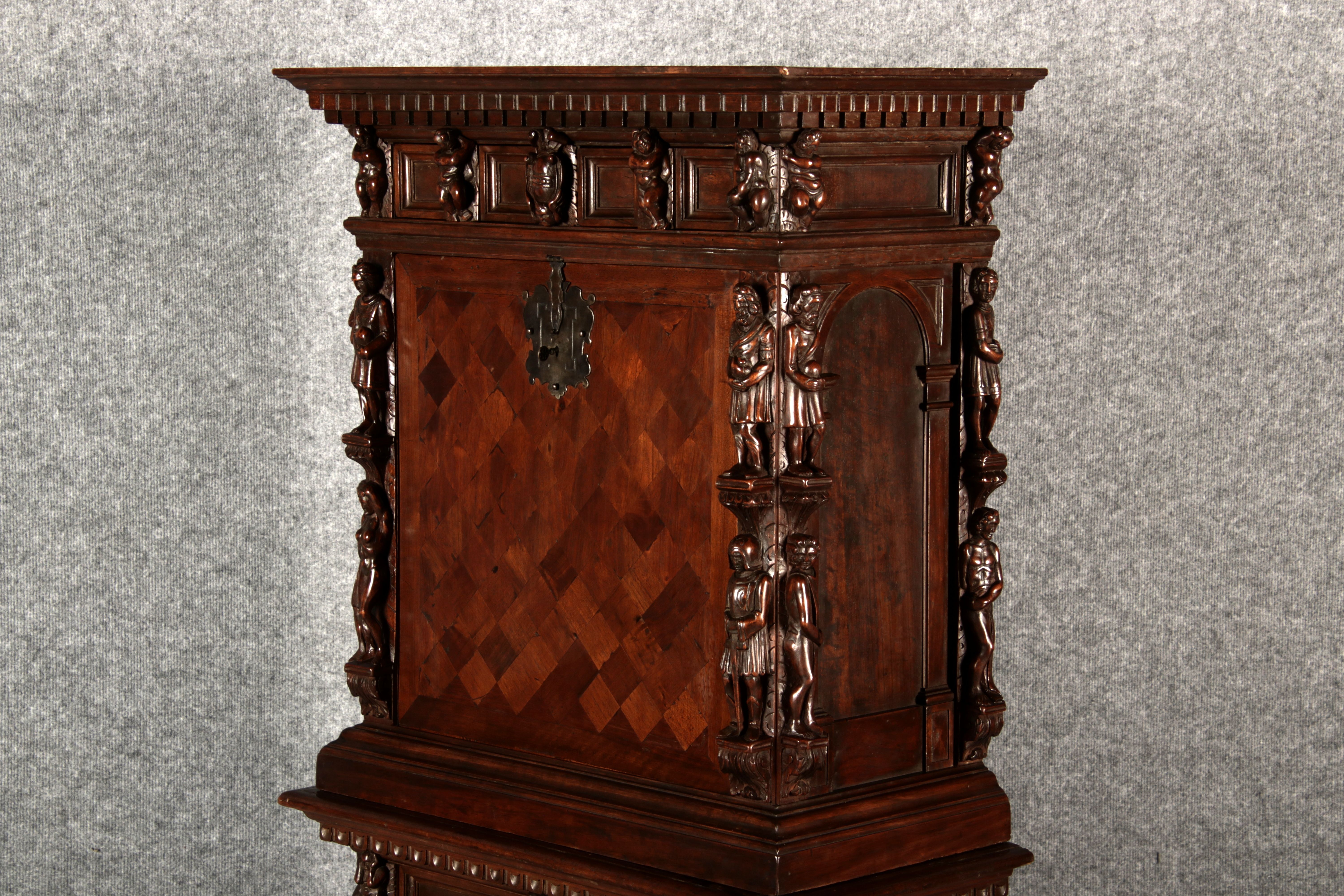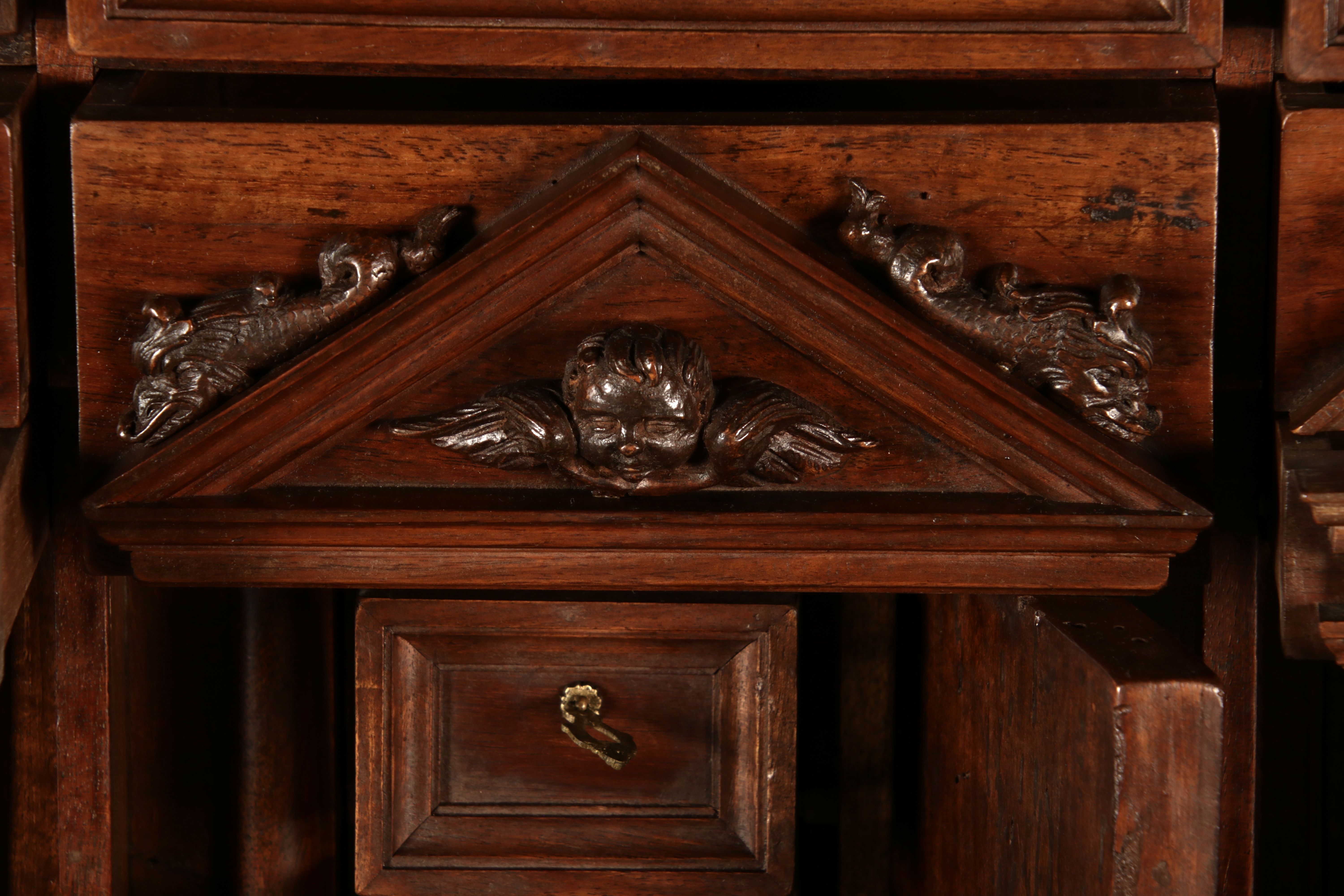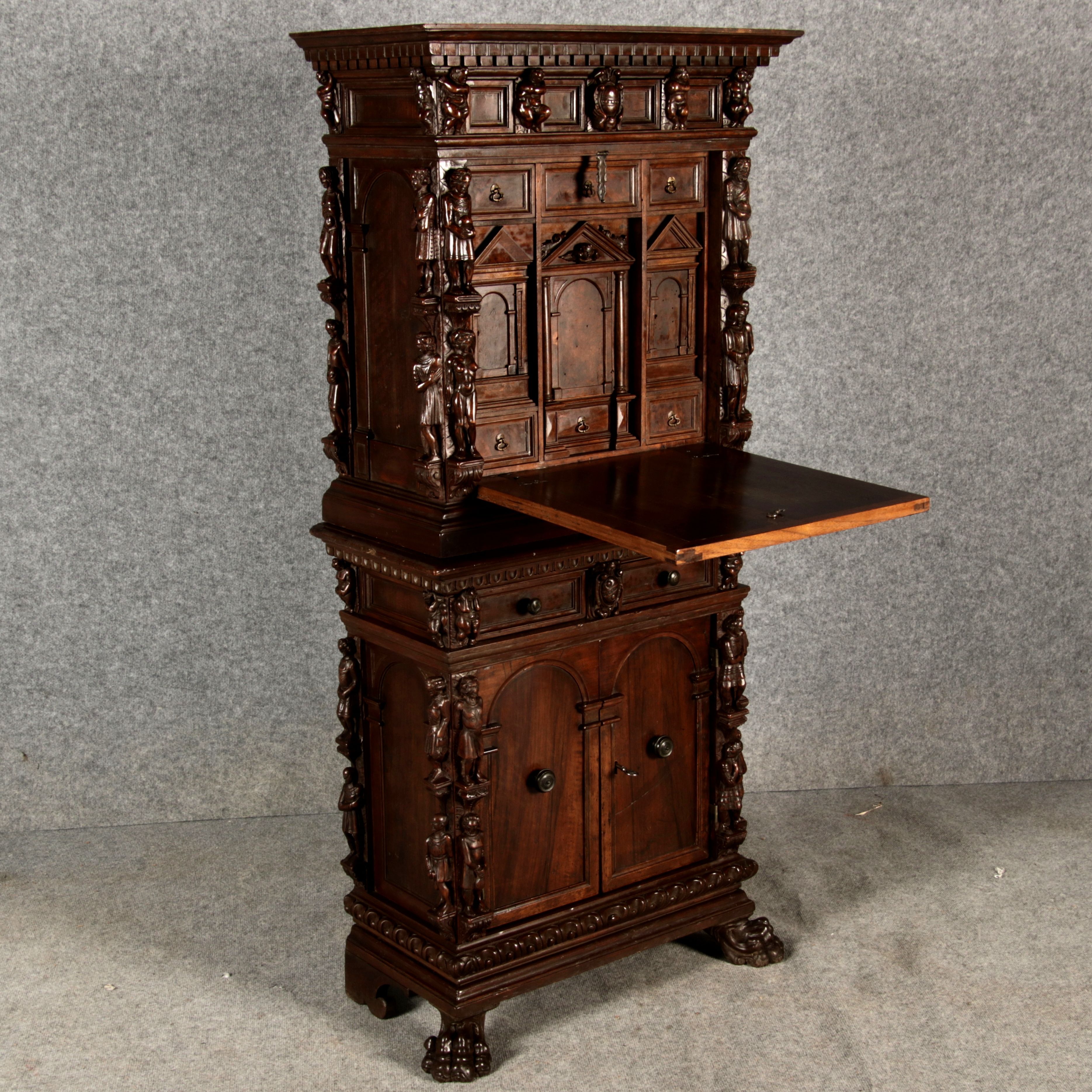 Kleiner Antiker Renaissance-Sekretär, Nussbaum, 17.-19. Jahrhundert Dieser kleine dennoch imposante Renaissance-Sekretär aus Nussbaumholz stammt aus der Zeit zwischen dem 17. und 19. (Teile des Sekretärs lassen darauf schließen, das er im 19 Jh. gefertigt worden ist, eventuell aus alten Teilen.) Jahrhundert und repräsentiert den Stil und die Handwerkskunst der Renaissance-Epoche. Das Möbelstück beeindruckt durch seine aufwendigen Schnitzereien, die kunstvolle Gestaltung und die kraftvolle Präsenz. Dieser Renaissance-Sekretär ist ein beeindruckendes Kunstwerk, das sowohl dekorativ als auch funktional ist. Seine massive Bauweise, gepaart mit der kunstvollen Gestaltung, macht ihn zu einem wahren Prunkstück für jeden Liebhaber historischer Möbel. Der Sekretär bietet nicht nur großzügigen Stauraum, sondern ist auch ein Zeugnis der meisterhaften Handwerkskunst vergangener Jahre. ArtikelNummer /number: sek119