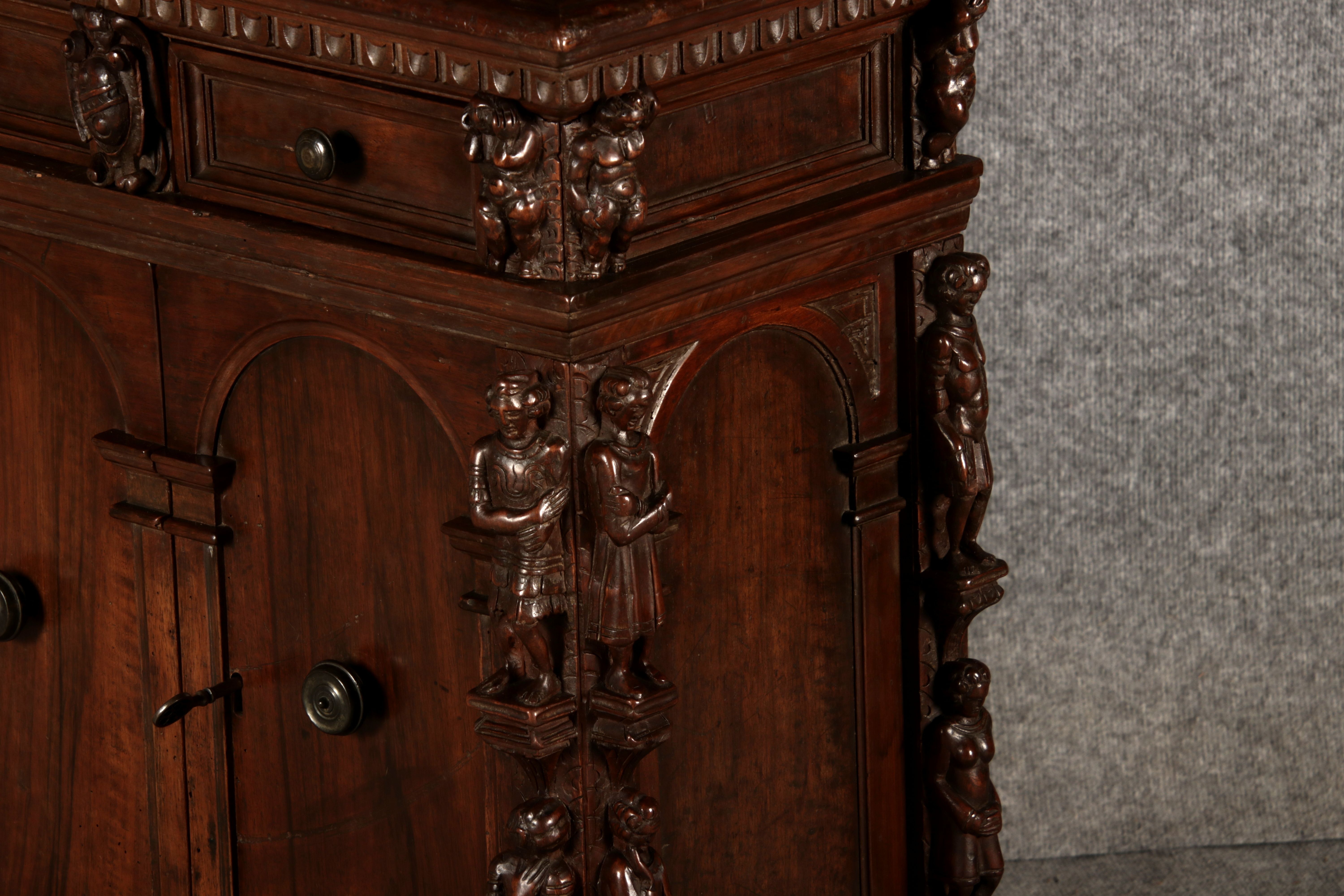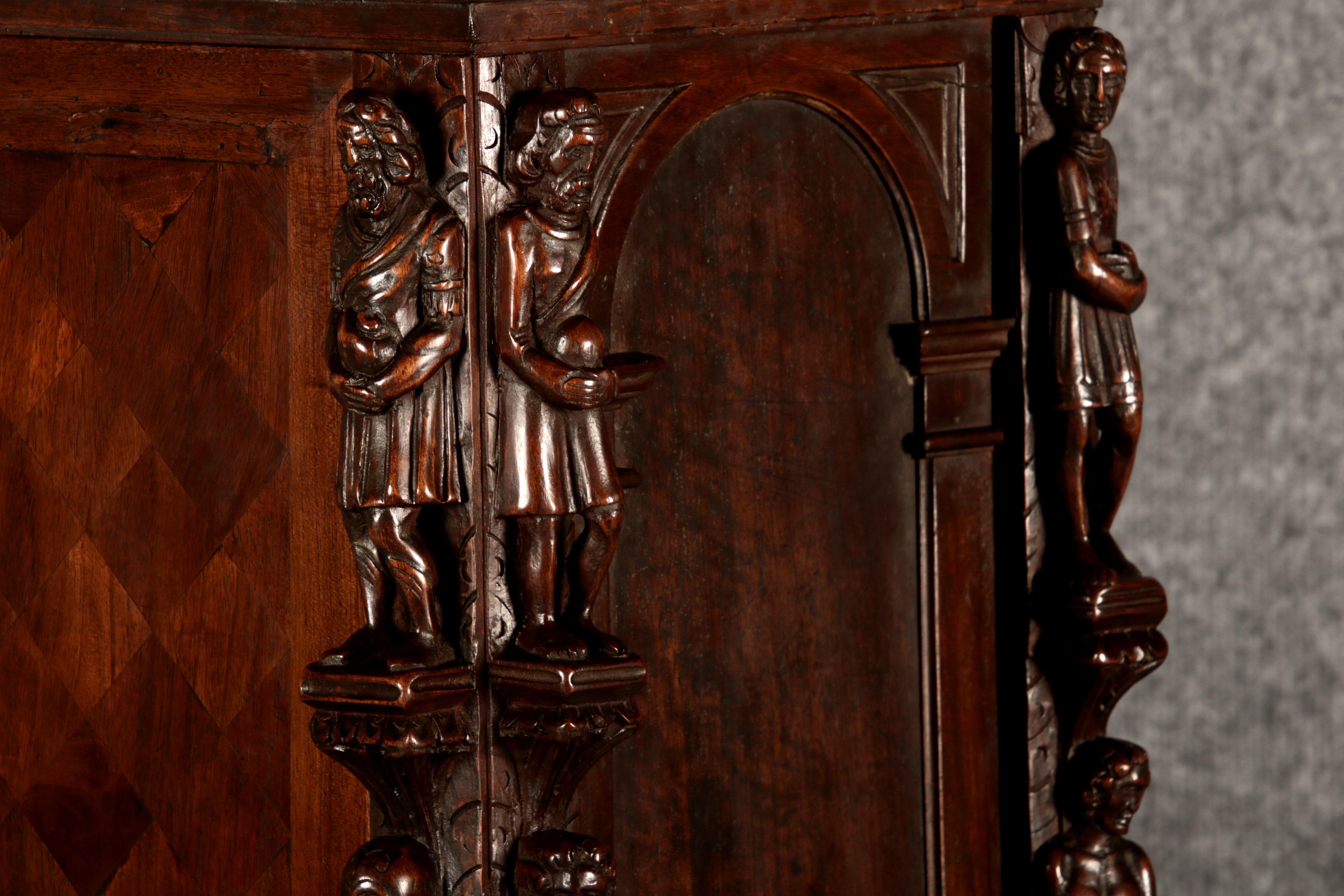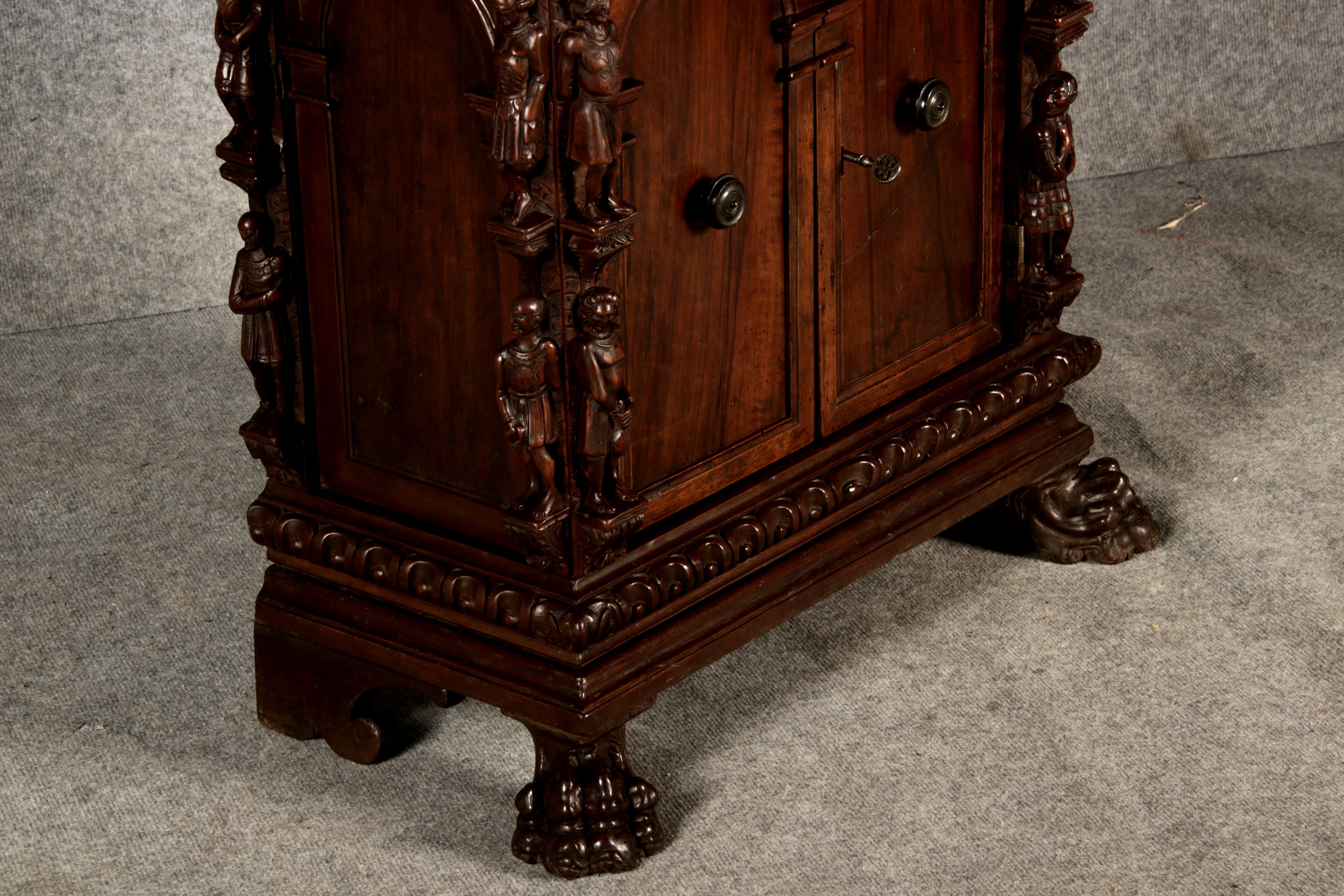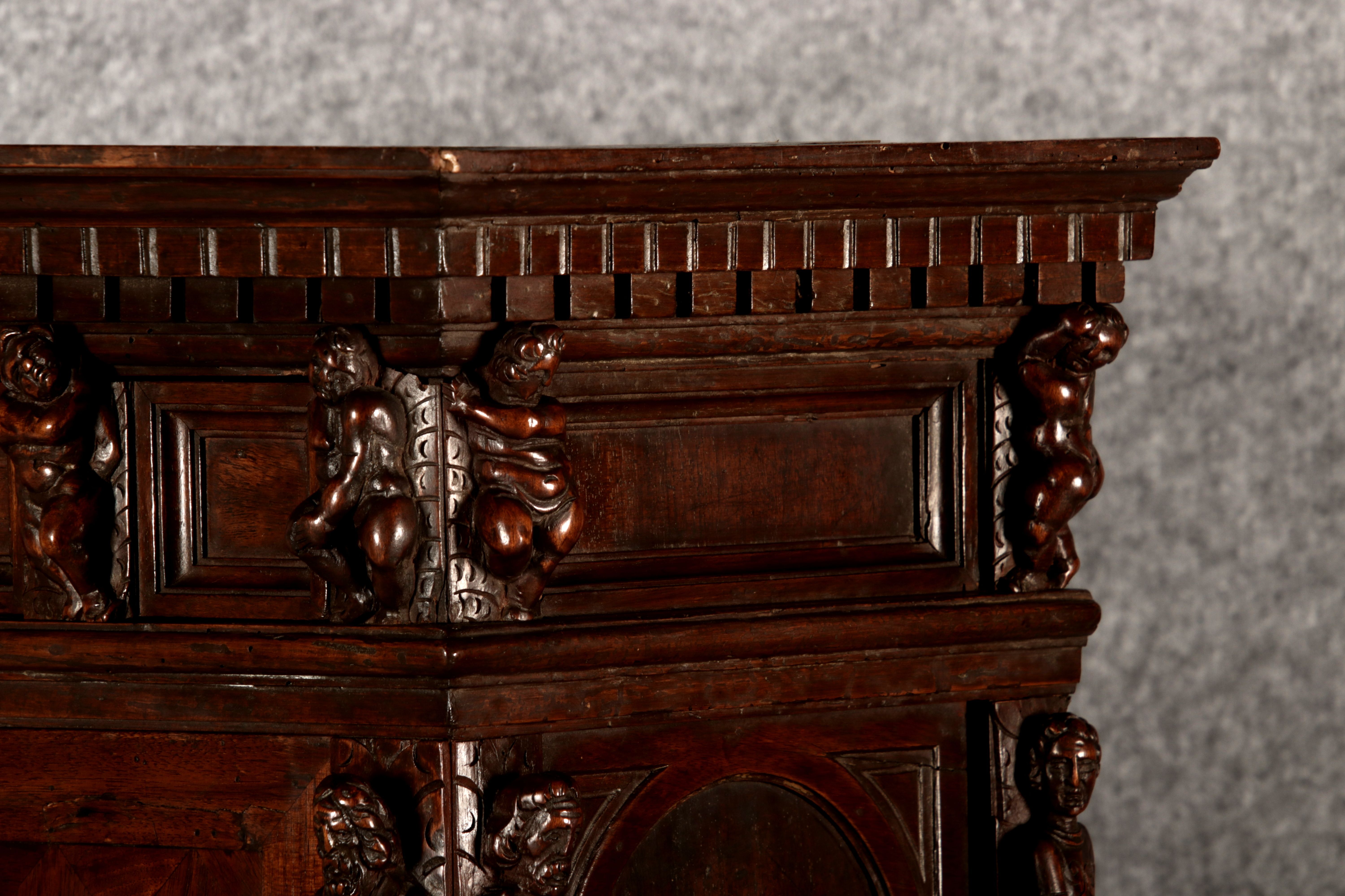 Kleiner Antiker Renaissance-Sekretär, Nussbaum, 17.-19. Jahrhundert Dieser kleine dennoch imposante Renaissance-Sekretär aus Nussbaumholz stammt aus der Zeit zwischen dem 17. und 19. (Teile des Sekretärs lassen darauf schließen, das er im 19 Jh. gefertigt worden ist, eventuell aus alten Teilen.) Jahrhundert und repräsentiert den Stil und die Handwerkskunst der Renaissance-Epoche. Das Möbelstück beeindruckt durch seine aufwendigen Schnitzereien, die kunstvolle Gestaltung und die kraftvolle Präsenz. Dieser Renaissance-Sekretär ist ein beeindruckendes Kunstwerk, das sowohl dekorativ als auch funktional ist. Seine massive Bauweise, gepaart mit der kunstvollen Gestaltung, macht ihn zu einem wahren Prunkstück für jeden Liebhaber historischer Möbel. Der Sekretär bietet nicht nur großzügigen Stauraum, sondern ist auch ein Zeugnis der meisterhaften Handwerkskunst vergangener Jahre. ArtikelNummer /number: sek119