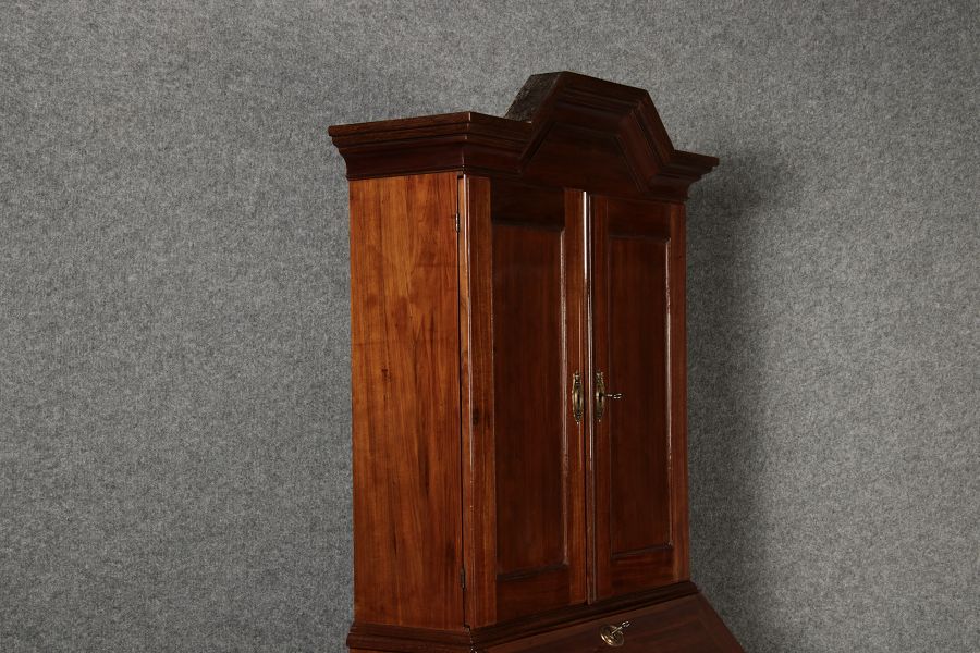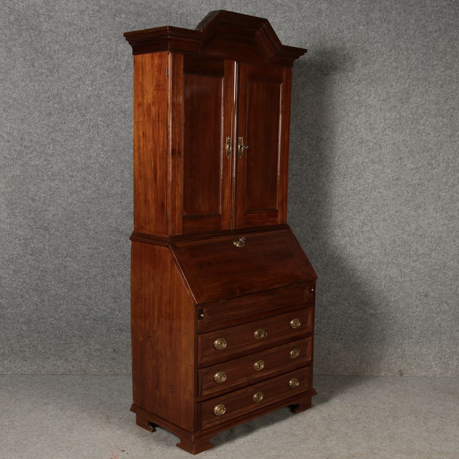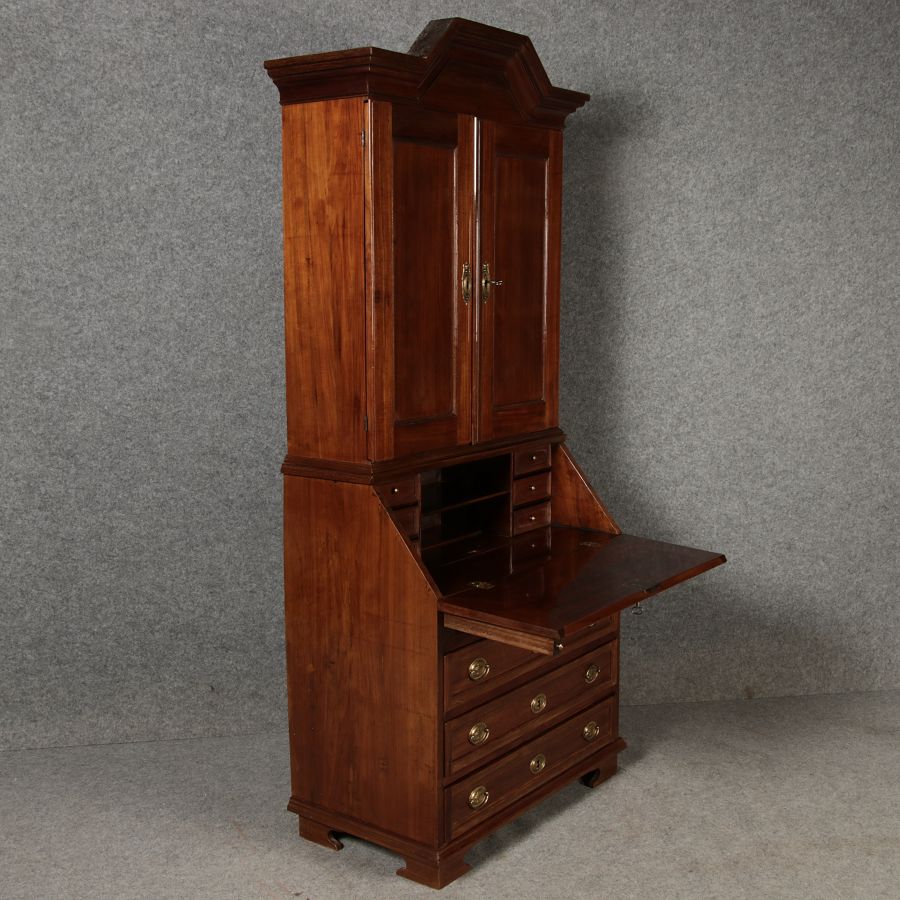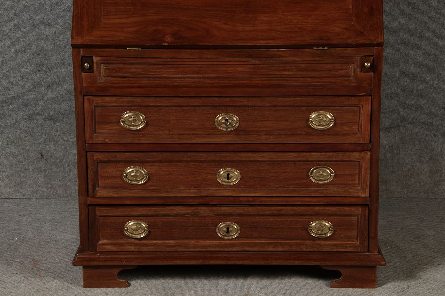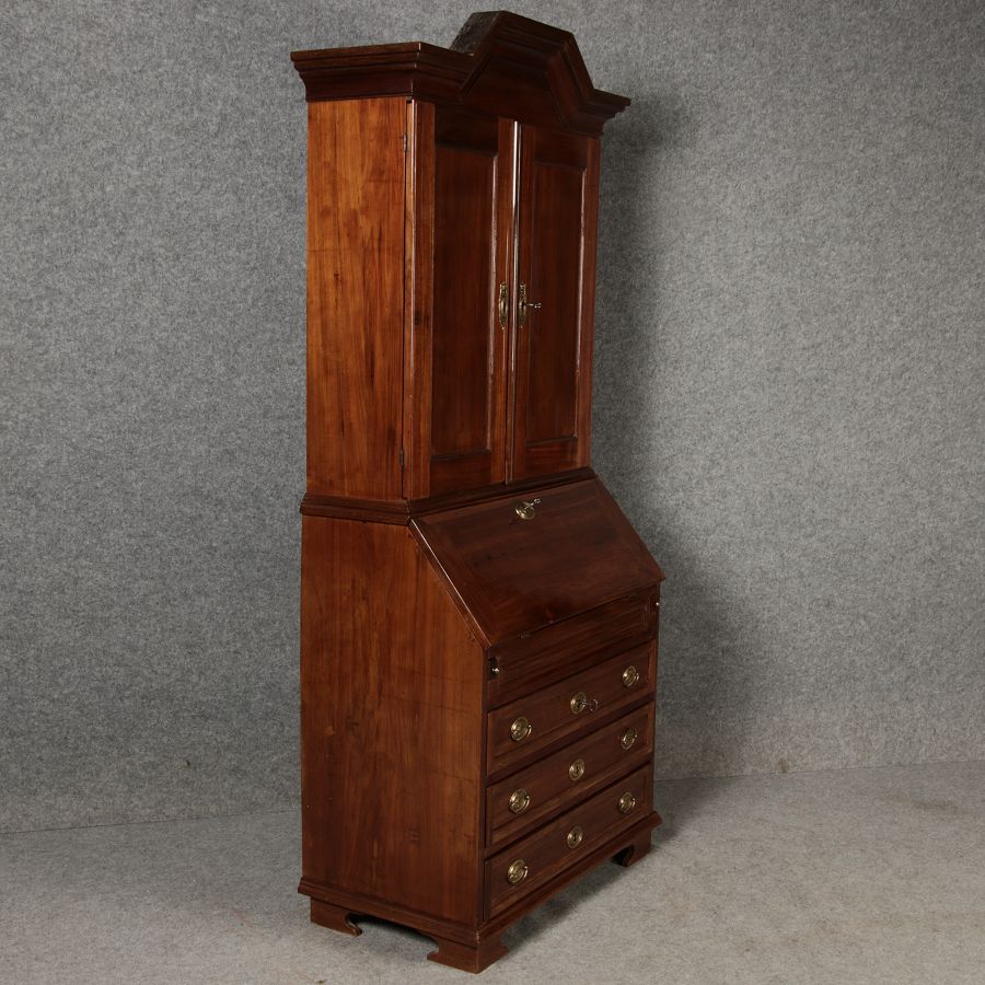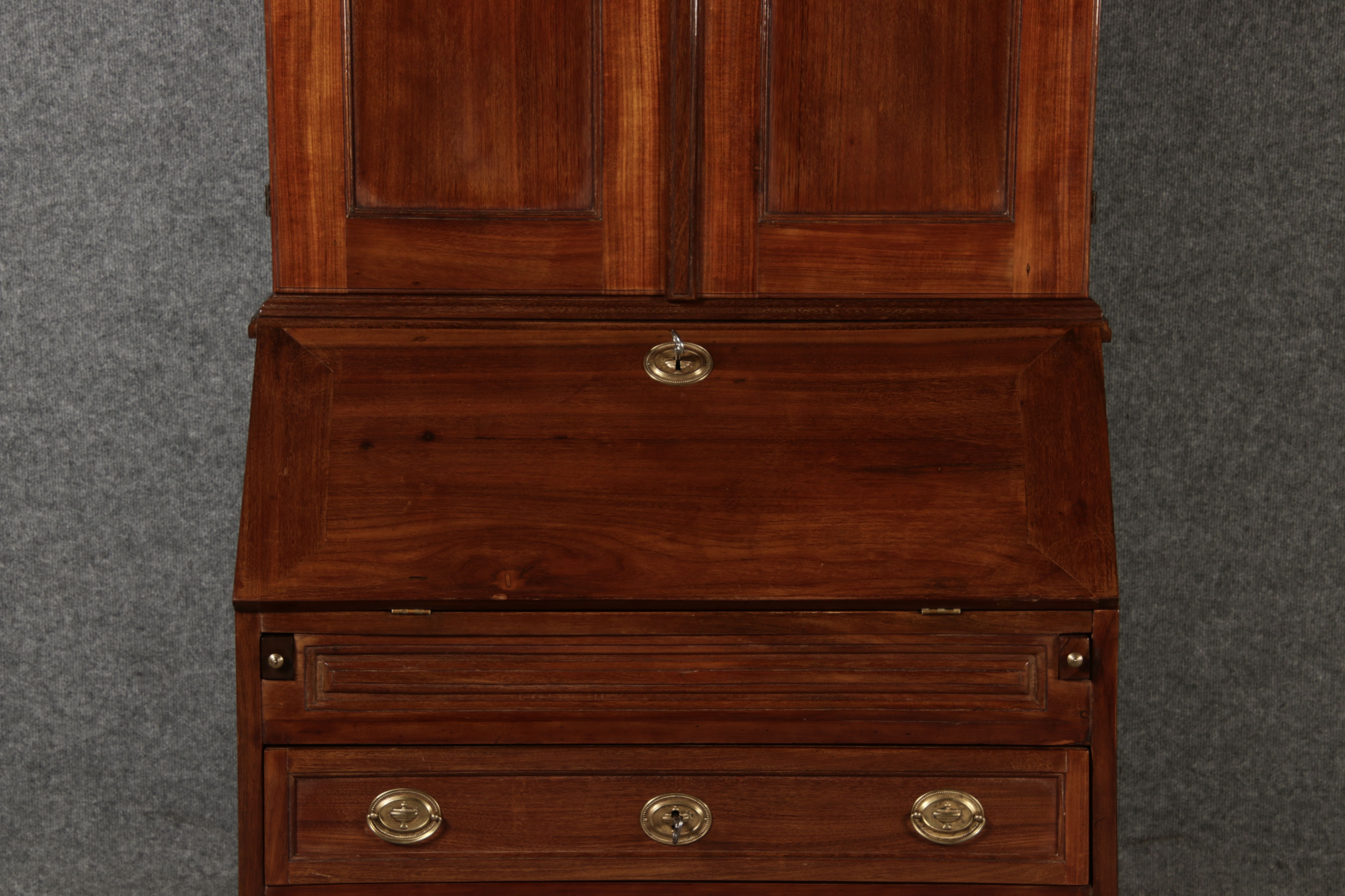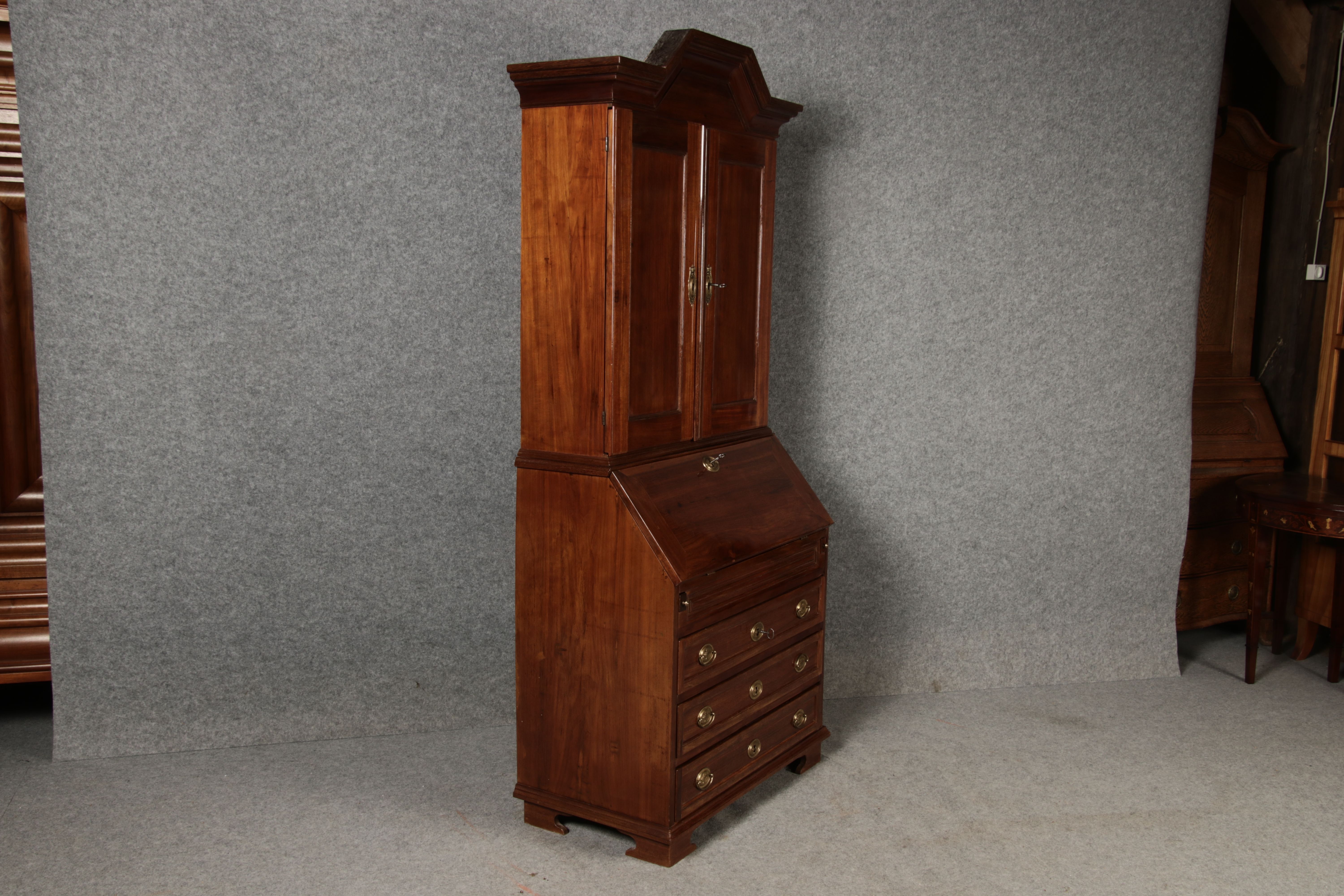 Jahrhundert – Mahagoni nur 99 cm Breit Dieser edle Sekretär aus dem 18. Jahrhundert ist ein exquisites Beispiel für europäische Handwerkskunst dieser Epoche und besticht durch seine hochwertige Verarbeitung aus massivem Mahagoniholz. Mit seiner imposanten Präsenz und der gelungenen Kombination von Funktionalität und Eleganz ist dieser Sekretär ein echtes Schmuckstück für Sammler und Liebhaber antiker Möbel. Der Sekretär besteht aus massivem Mahagoni, einem Holz, das im 18. Jahrhundert aufgrund seiner feinen Maserung und tiefen, warmen Farbgebung besonders beliebt war. Der warme, satte Farbton des Mahagoni wird durch die sanfte Patina, die sich über die Jahre entwickelt hat, noch betont. Die Oberflächen des Möbels weisen eine leicht glänzende Politur auf, die seine edle Erscheinung unterstreicht. Der Sekretär zeichnet sich durch seine klassische Zweiteilung aus: im Oberer Teil: Zwei aufwendig gearbeitete Flügeltüren mit eingesetzten Feldern öffnen sich und gewähren Zugang zu einem geräumigen Innenbereich. Dieser ist mit mehreren Regalböden ausgestattet, die ideal für die Aufbewahrung von Dokumenten, Büchern oder dekorativen Objekten geeignet sind. Die Türen sind mit Messingbeschlägen versehen, die dem Stück einen Hauch antiker Raffinesse verleihen. |