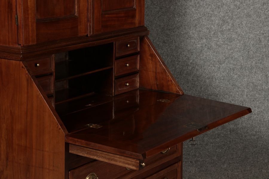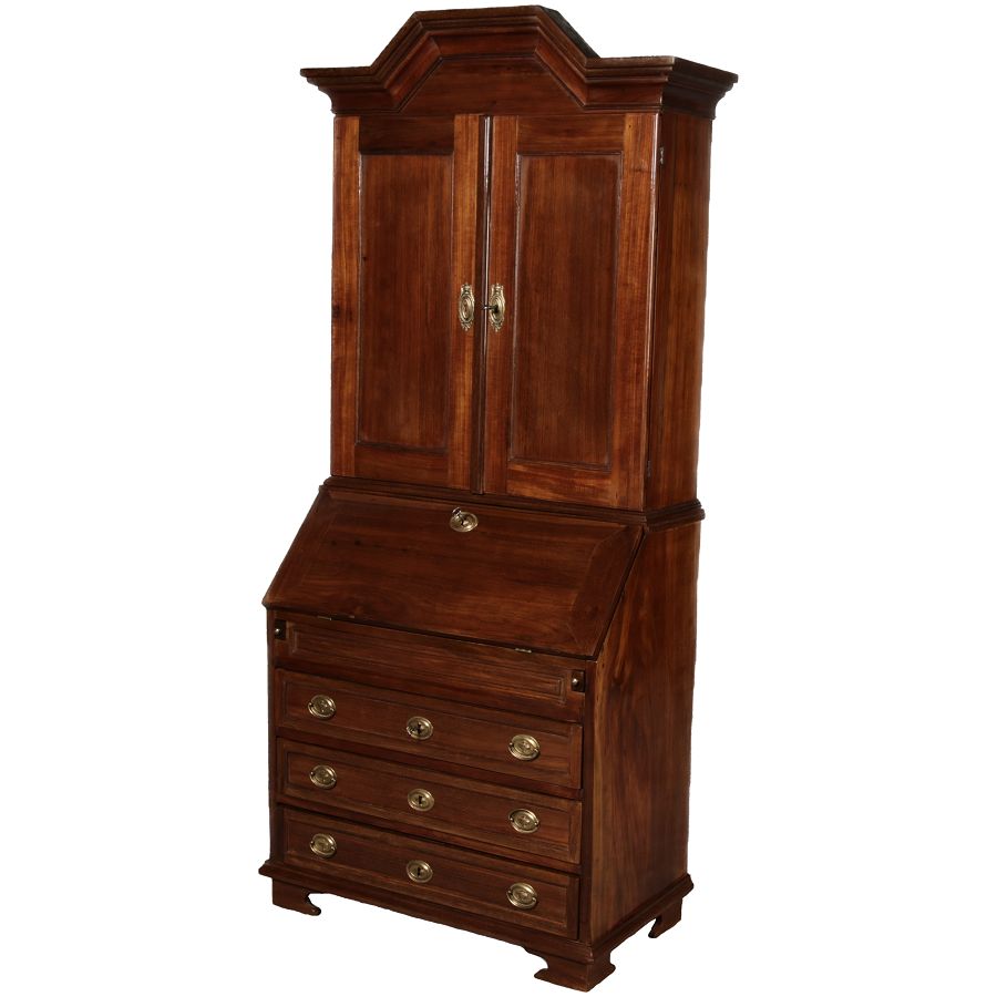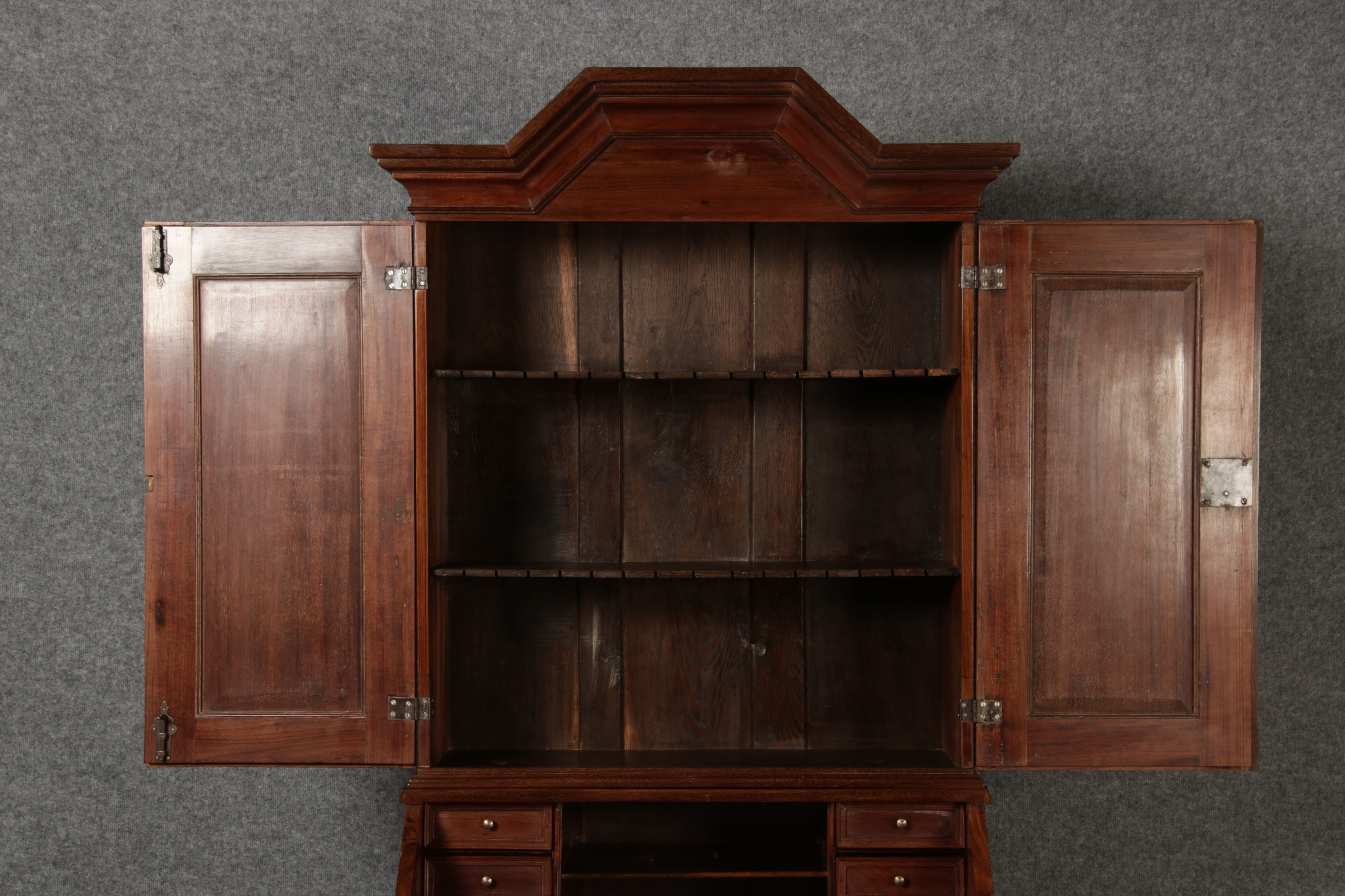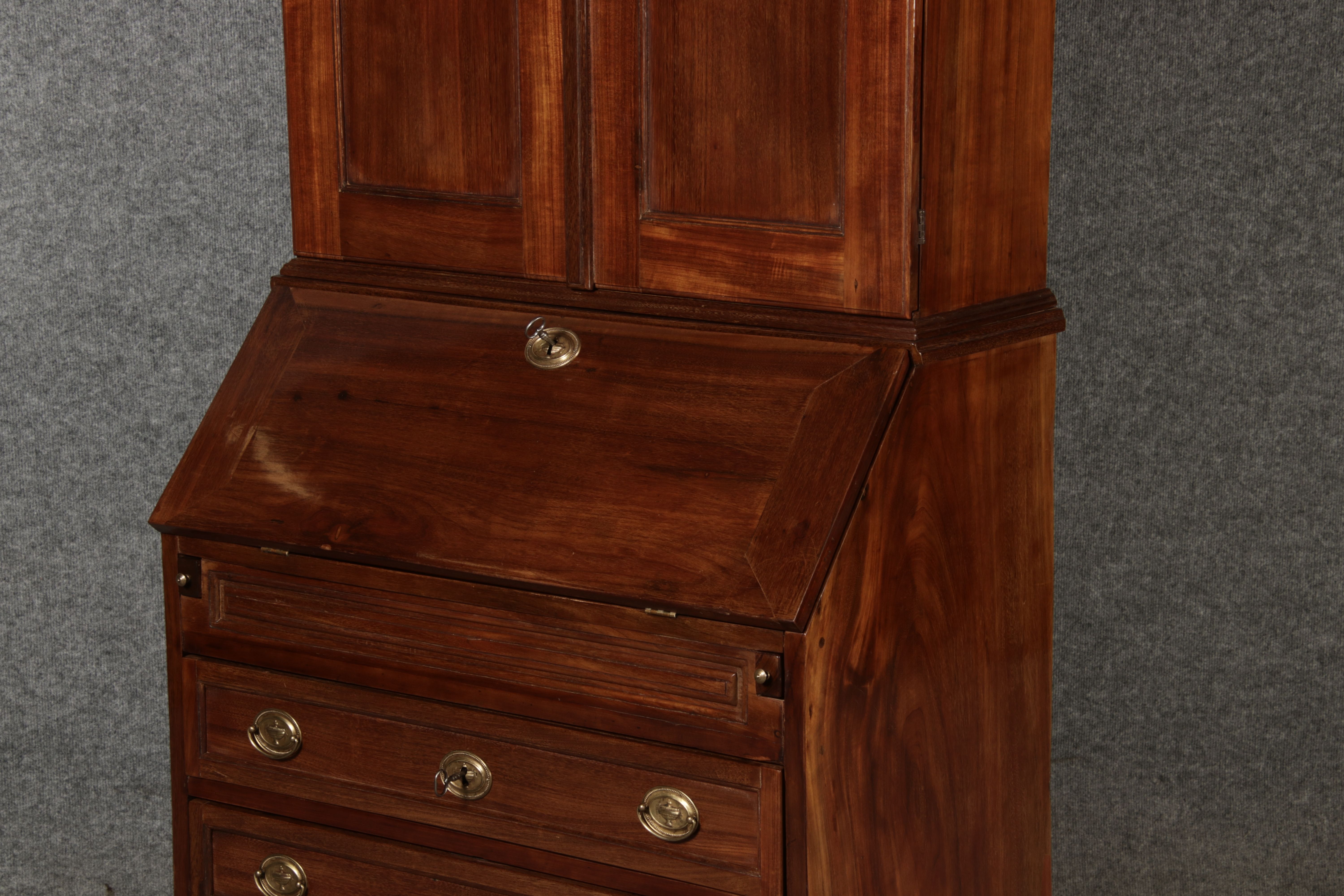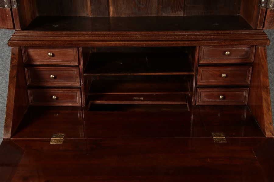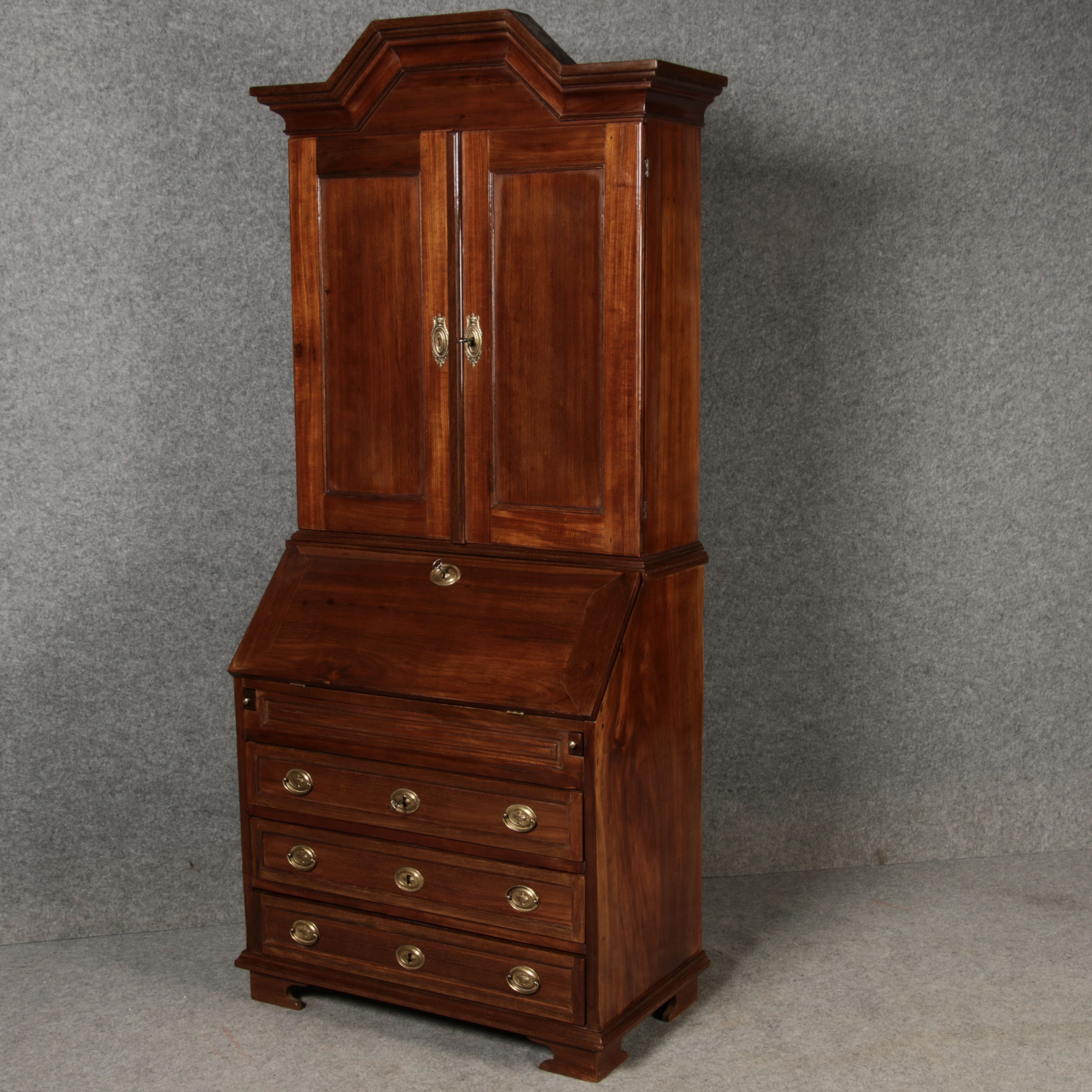 Jahrhundert – Mahagoni nur 99 cm Breit Dieser edle Sekretär aus dem 18. Jahrhundert ist ein exquisites Beispiel für europäische Handwerkskunst dieser Epoche und besticht durch seine hochwertige Verarbeitung aus massivem Mahagoniholz. Mit seiner imposanten Präsenz und der gelungenen Kombination von Funktionalität und Eleganz ist dieser Sekretär ein echtes Schmuckstück für Sammler und Liebhaber antiker Möbel. Der Sekretär besteht aus massivem Mahagoni, einem Holz, das im 18. Jahrhundert aufgrund seiner feinen Maserung und tiefen, warmen Farbgebung besonders beliebt war. Der warme, satte Farbton des Mahagoni wird durch die sanfte Patina, die sich über die Jahre entwickelt hat, noch betont. Die Oberflächen des Möbels weisen eine leicht glänzende Politur auf, die seine edle Erscheinung unterstreicht. Der Sekretär zeichnet sich durch seine klassische Zweiteilung aus: im Oberer Teil: Zwei aufwendig gearbeitete Flügeltüren mit eingesetzten Feldern öffnen sich und gewähren Zugang zu einem geräumigen Innenbereich. Dieser ist mit mehreren Regalböden ausgestattet, die ideal für die Aufbewahrung von Dokumenten, Büchern oder dekorativen Objekten geeignet sind. Die Türen sind mit Messingbeschlägen versehen, die dem Stück einen Hauch antiker Raffinesse verleihen. |