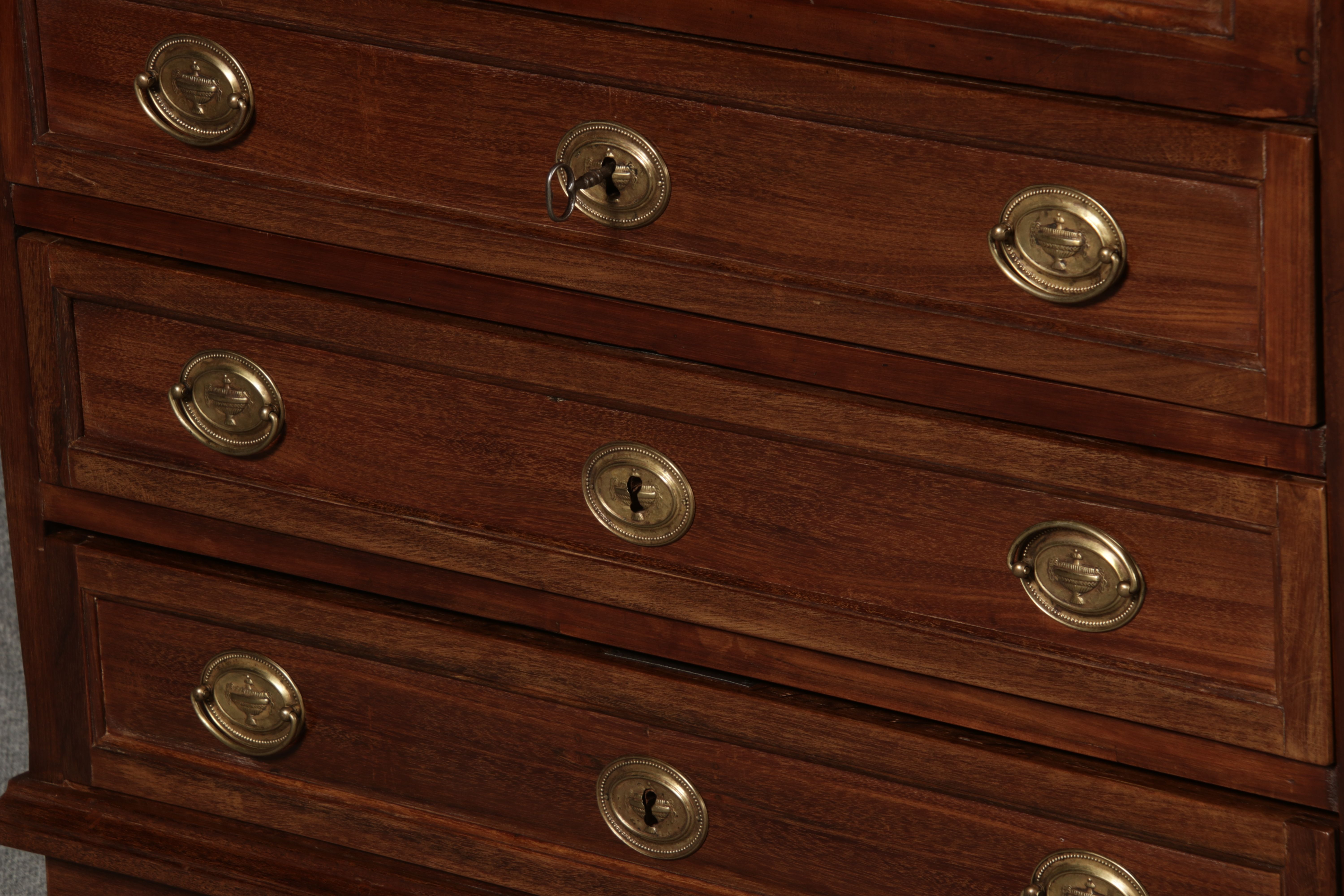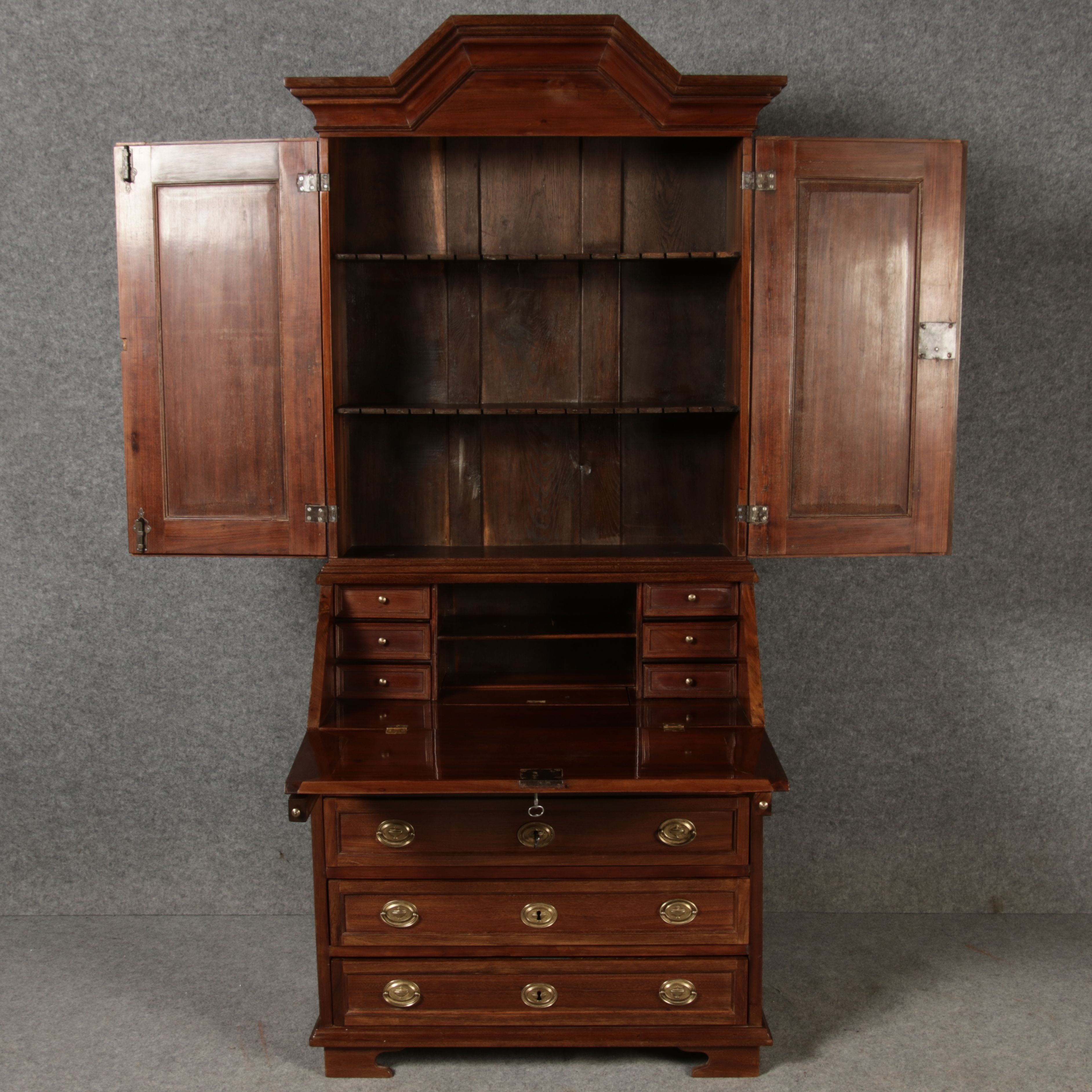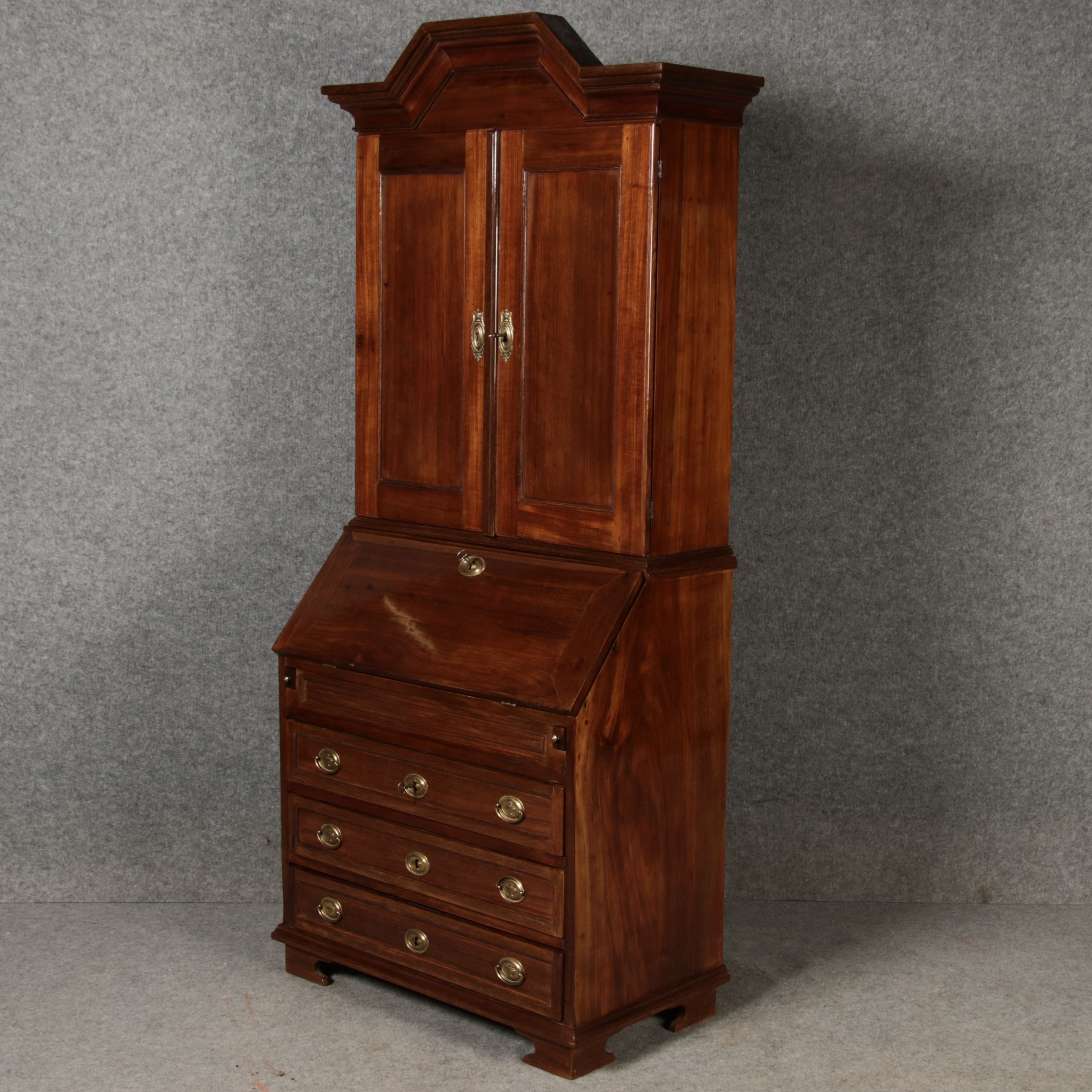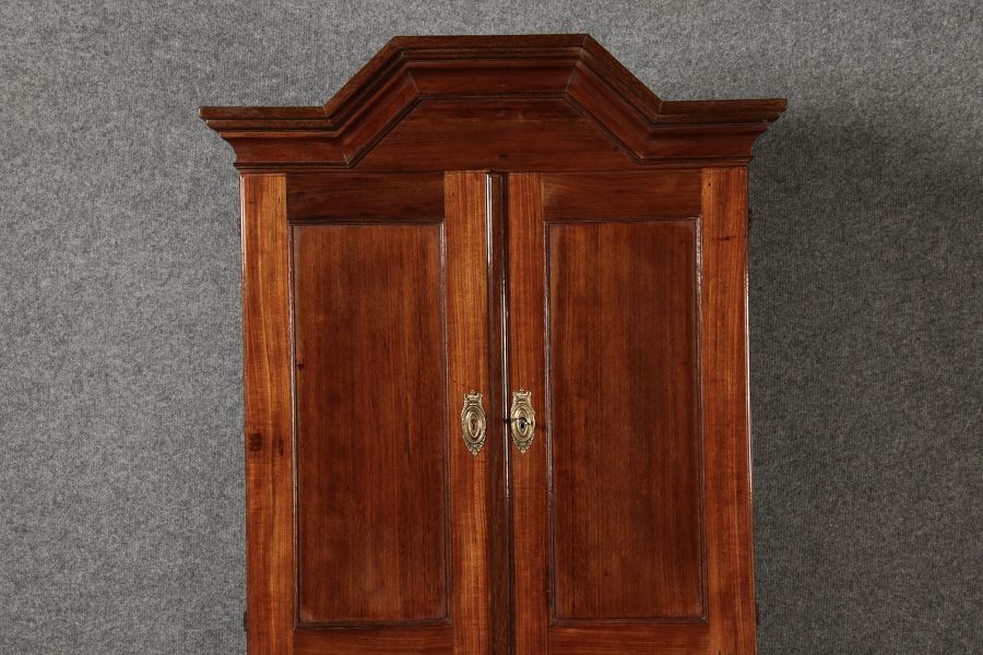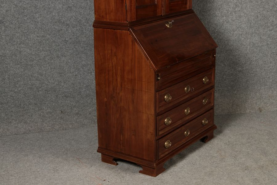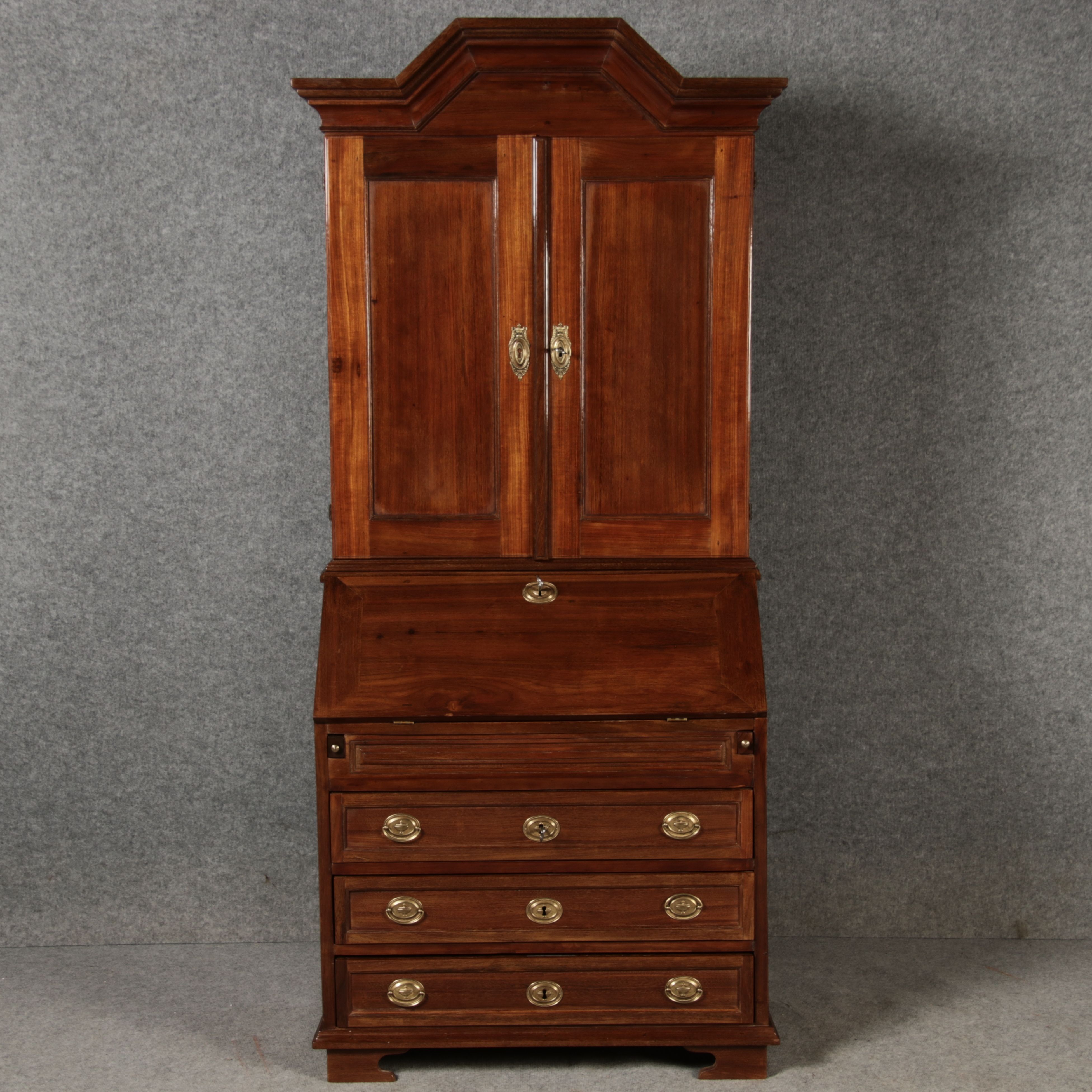 Jahrhundert – Mahagoni nur 99 cm Breit Dieser edle Sekretär aus dem 18. Jahrhundert ist ein exquisites Beispiel für europäische Handwerkskunst dieser Epoche und besticht durch seine hochwertige Verarbeitung aus massivem Mahagoniholz. Mit seiner imposanten Präsenz und der gelungenen Kombination von Funktionalität und Eleganz ist dieser Sekretär ein echtes Schmuckstück für Sammler und Liebhaber antiker Möbel. Der Sekretär besteht aus massivem Mahagoni, einem Holz, das im 18. Jahrhundert aufgrund seiner feinen Maserung und tiefen, warmen Farbgebung besonders beliebt war. Der warme, satte Farbton des Mahagoni wird durch die sanfte Patina, die sich über die Jahre entwickelt hat, noch betont. Die Oberflächen des Möbels weisen eine leicht glänzende Politur auf, die seine edle Erscheinung unterstreicht. Der Sekretär zeichnet sich durch seine klassische Zweiteilung aus: im Oberer Teil: Zwei aufwendig gearbeitete Flügeltüren mit eingesetzten Feldern öffnen sich und gewähren Zugang zu einem geräumigen Innenbereich. Dieser ist mit mehreren Regalböden ausgestattet, die ideal für die Aufbewahrung von Dokumenten, Büchern oder dekorativen Objekten geeignet sind. Die Türen sind mit Messingbeschlägen versehen, die dem Stück einen Hauch antiker Raffinesse verleihen. |