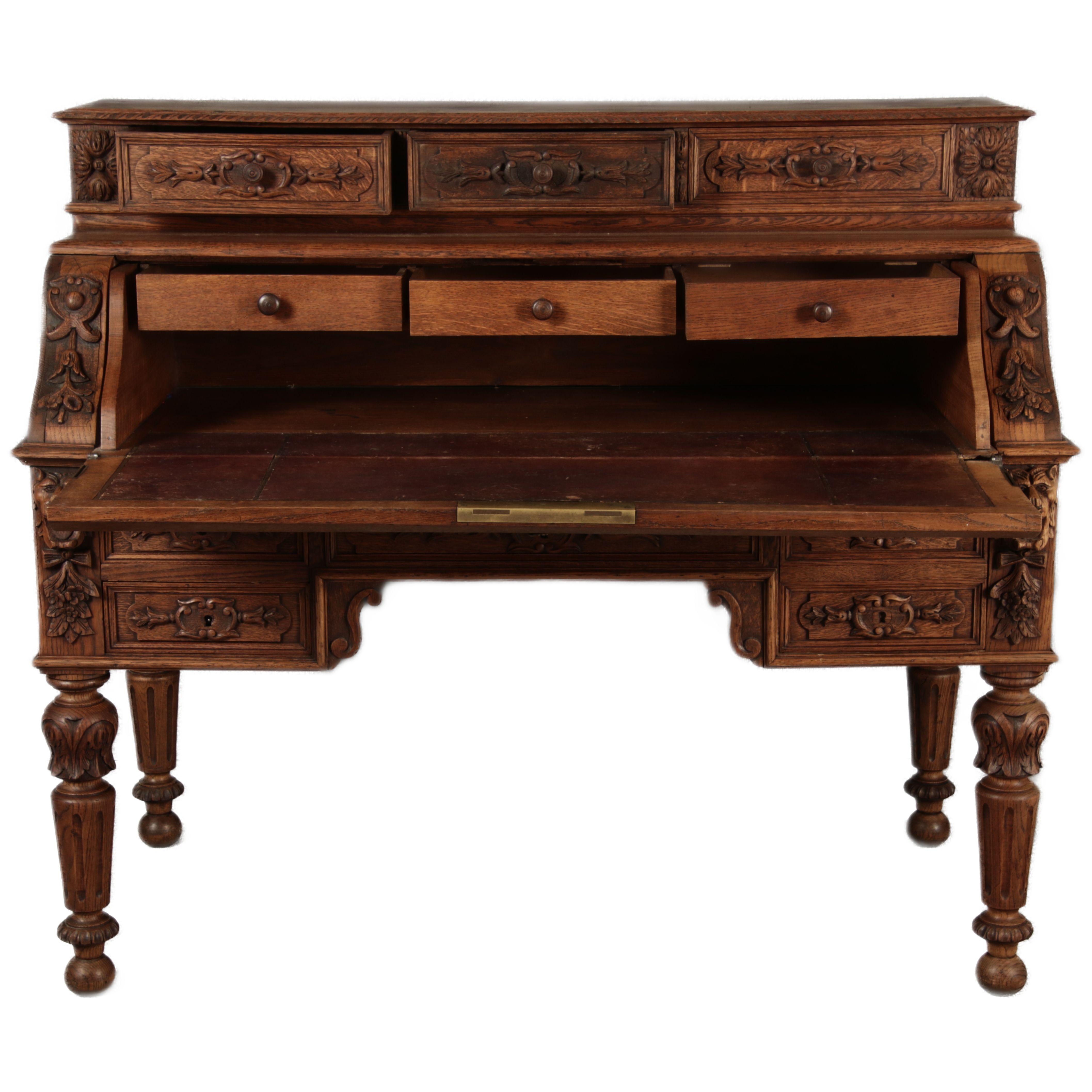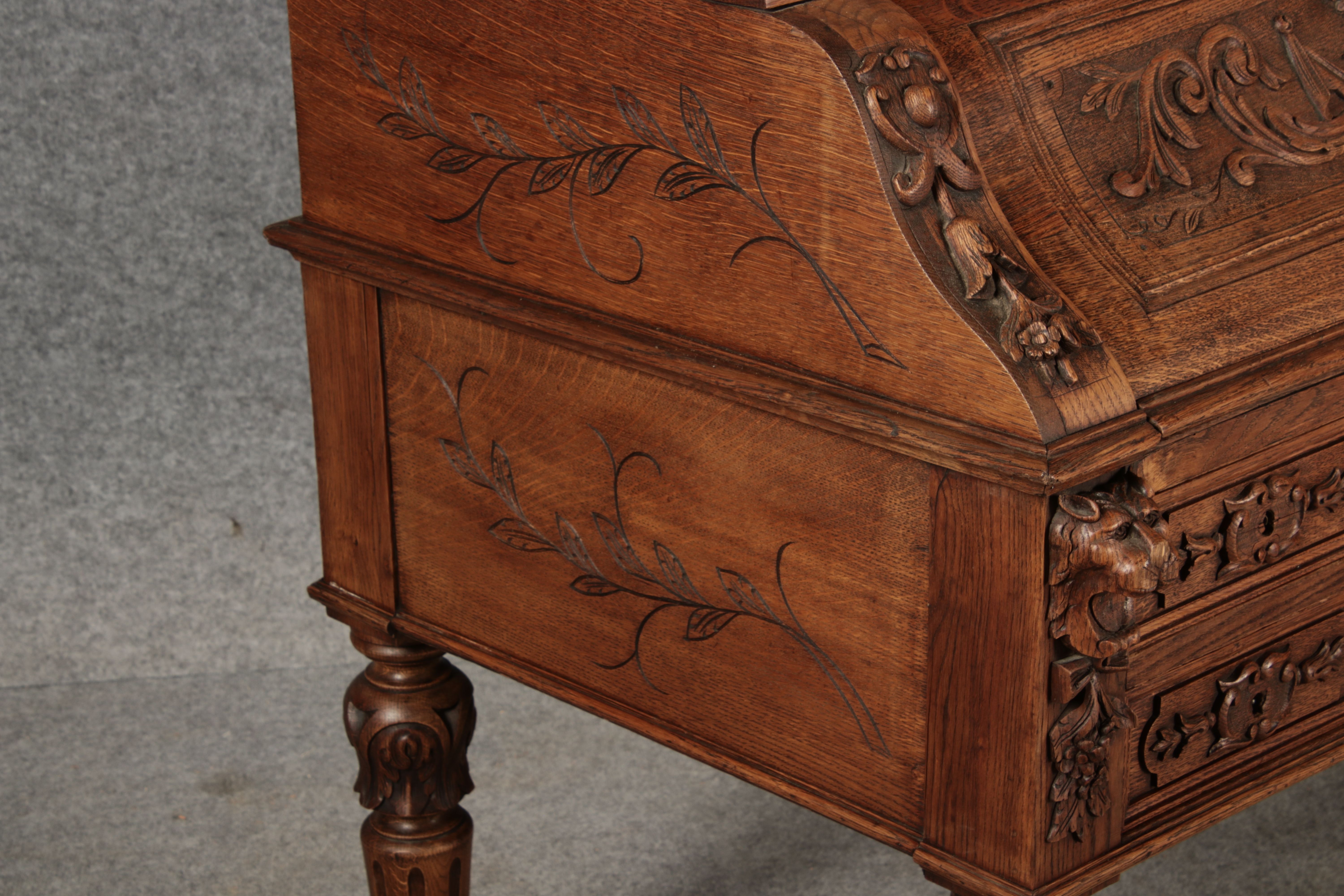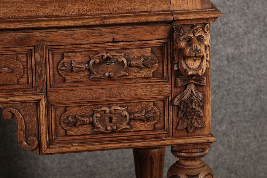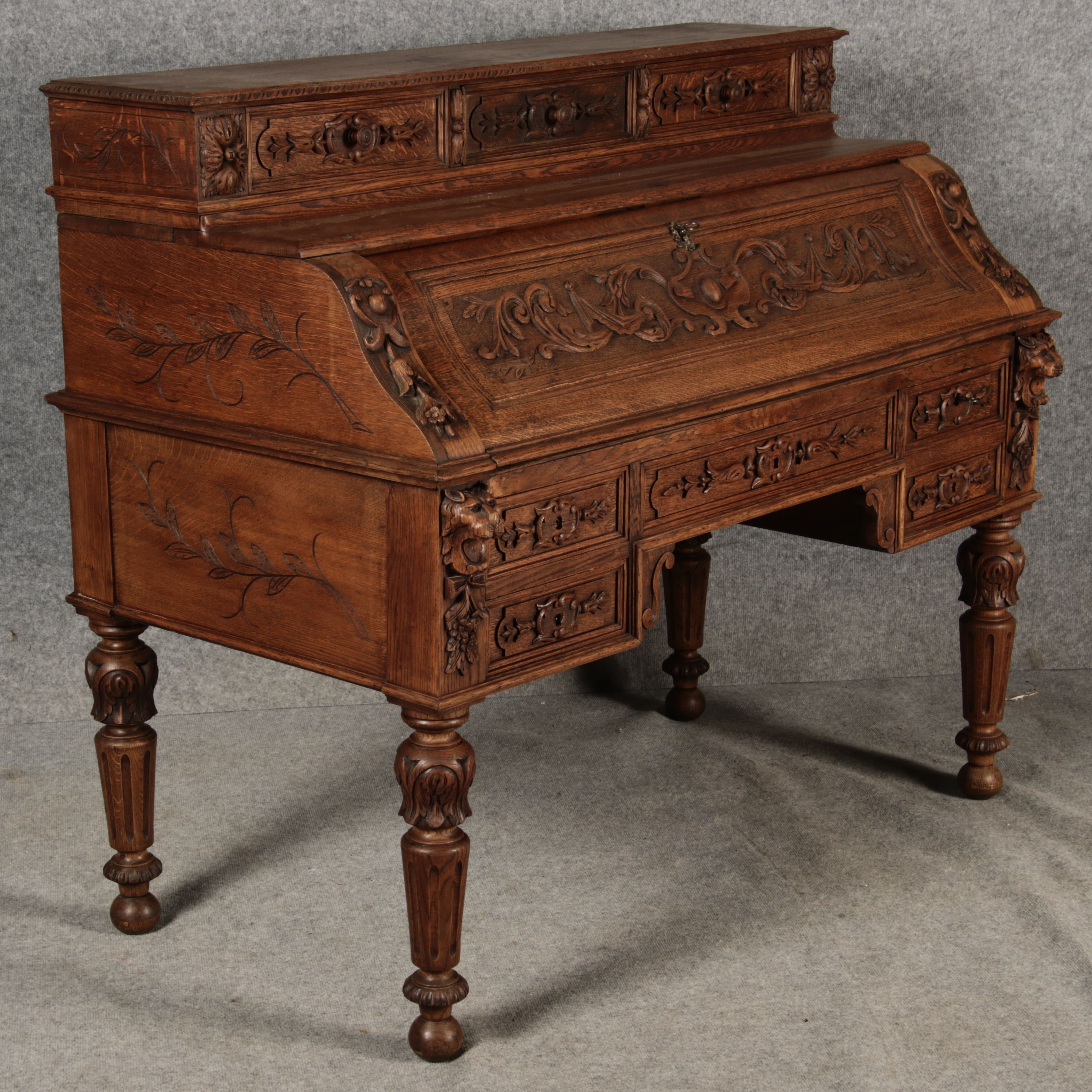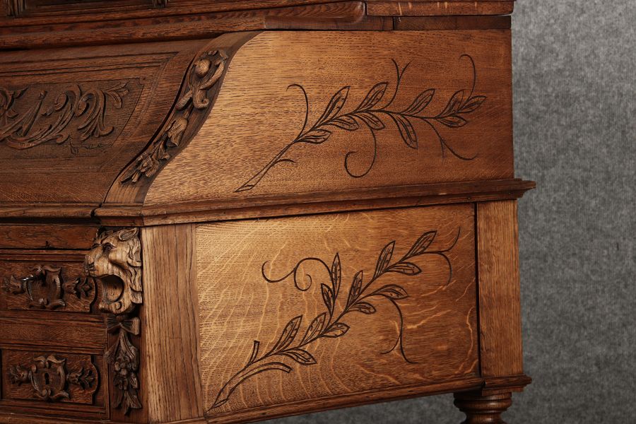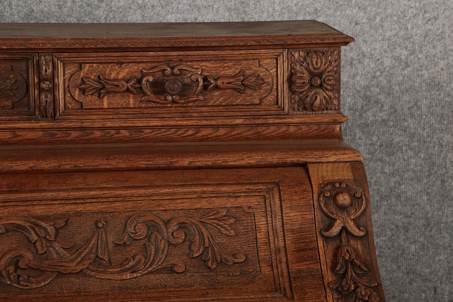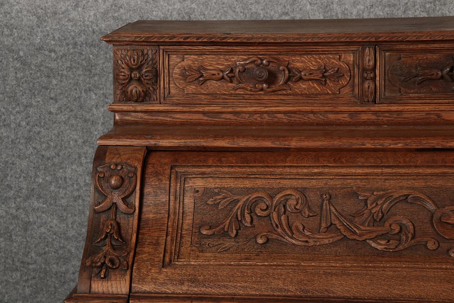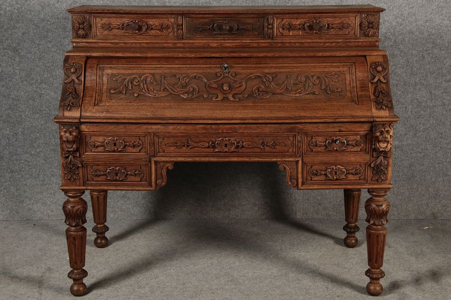 Reich verzierter antiker Sekretär – Historischer Schreibtisch mit Schnitzereien , Eiche, 19 Jh.Dieser reich verzierte antike Sekretär ist ein beeindruckendes Beispiel für meisterhafte Handwerkskunst und eine prachtvolle Darstellung von Möbeln aus der Vergangenheit. Der Schreibtisch detaillierte Holzschnitzereien mit einer funktionalen Arbeitsfläche, was ihn zu einem herausragenden Möbelstück macht, das sowohl in seiner ästhetischen Wirkung als auch in seiner praktischen Nutzung überzeugt. Material und VerarbeitungGefertigt aus hochwertigem, massivem Eichenholz, das für seine Robustheit und Langlebigkeit bekannt ist, besticht dieser Sekretär durch eine dunkle, gleichmäßige Holzfarbe mit einer natürlichen, warmen Patina. Besonders hervorzuheben sind die detaillierten und aufwendigen Schnitzereien, die den gesamten Sekretär zieren und ihm einen kunstvollen und majestätischen Charakter verleihen. Die floralen Motive und klassischen Verzierungen auf der Vorderseite und den Seiten sind Zeugnis einer außergewöhnlichen handwerklichen Fertigkeit. Design und AufbauDer Sekretär weist die typische Form eines Schreibmöbels vergangener Zeiten auf, ist jedoch durch seine detailreiche Verzierung besonders auffällig: