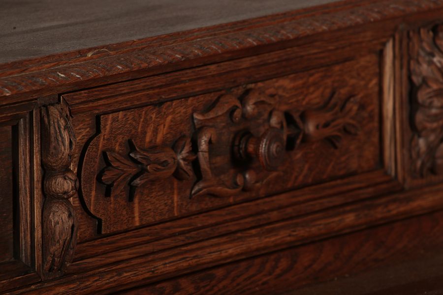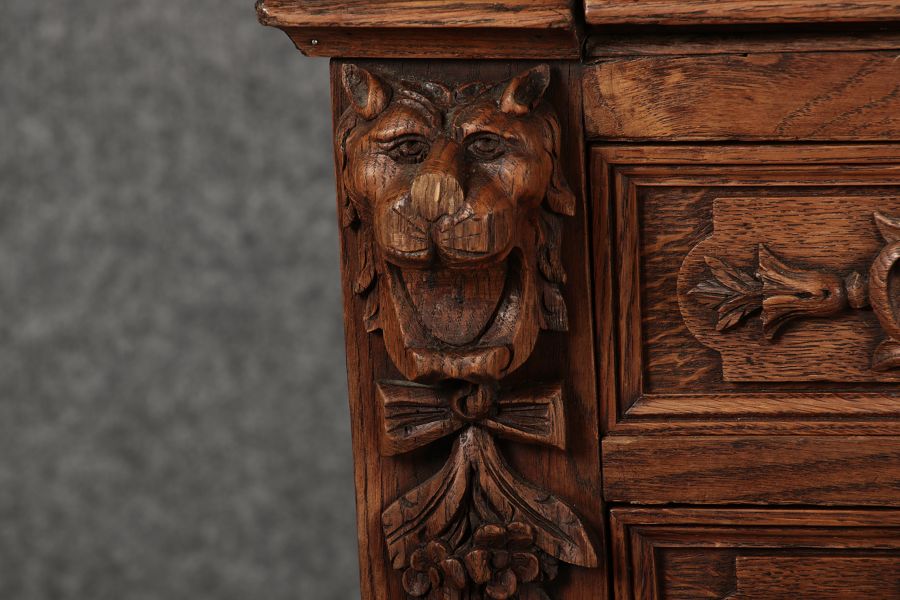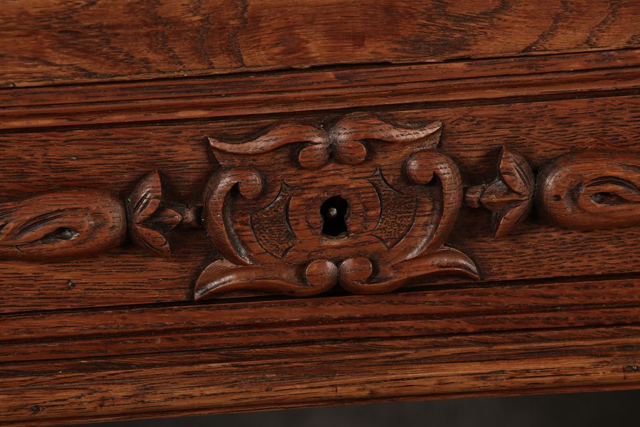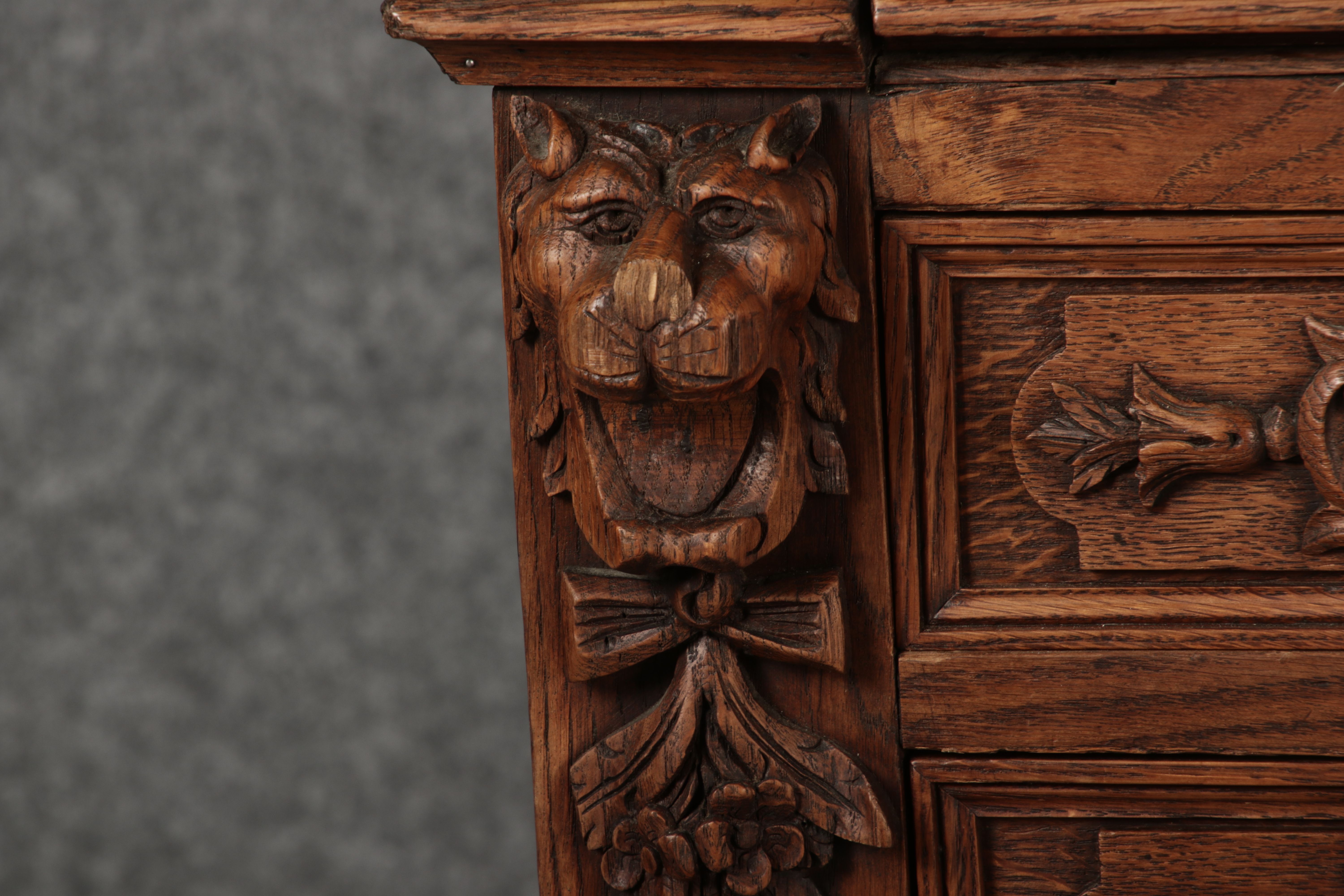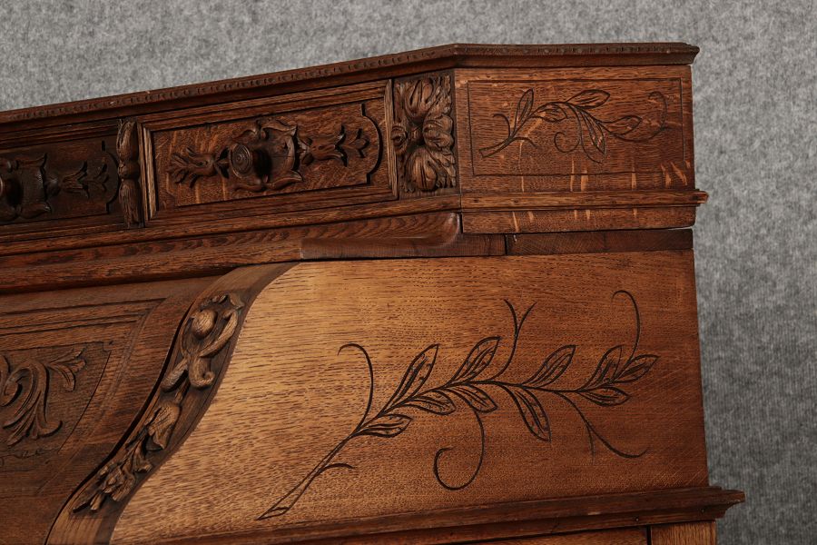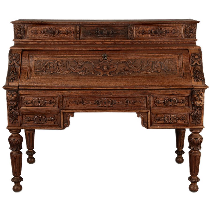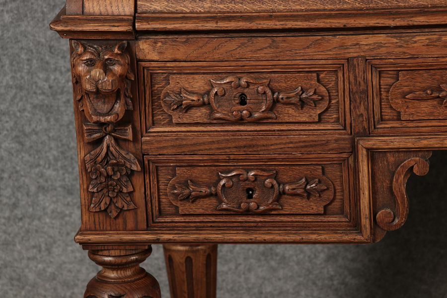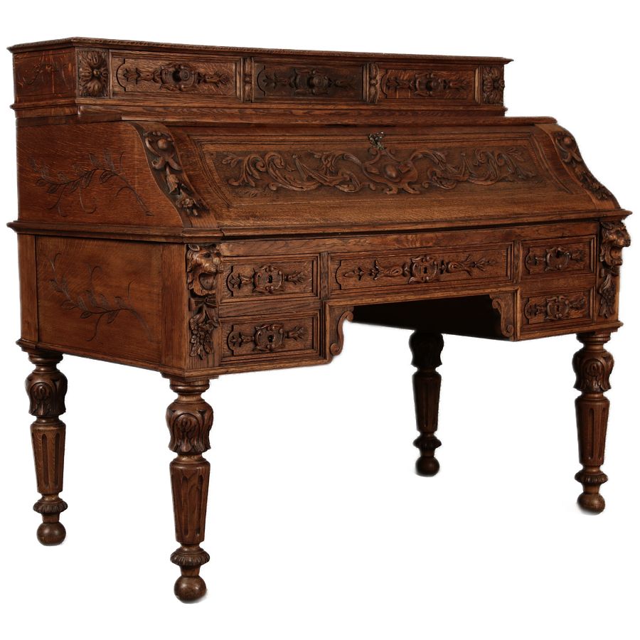 Reich verzierter antiker Sekretär – Historischer Schreibtisch mit Schnitzereien , Eiche, 19 Jh.Dieser reich verzierte antike Sekretär ist ein beeindruckendes Beispiel für meisterhafte Handwerkskunst und eine prachtvolle Darstellung von Möbeln aus der Vergangenheit. Der Schreibtisch detaillierte Holzschnitzereien mit einer funktionalen Arbeitsfläche, was ihn zu einem herausragenden Möbelstück macht, das sowohl in seiner ästhetischen Wirkung als auch in seiner praktischen Nutzung überzeugt. Material und VerarbeitungGefertigt aus hochwertigem, massivem Eichenholz, das für seine Robustheit und Langlebigkeit bekannt ist, besticht dieser Sekretär durch eine dunkle, gleichmäßige Holzfarbe mit einer natürlichen, warmen Patina. Besonders hervorzuheben sind die detaillierten und aufwendigen Schnitzereien, die den gesamten Sekretär zieren und ihm einen kunstvollen und majestätischen Charakter verleihen. Die floralen Motive und klassischen Verzierungen auf der Vorderseite und den Seiten sind Zeugnis einer außergewöhnlichen handwerklichen Fertigkeit. Design und AufbauDer Sekretär weist die typische Form eines Schreibmöbels vergangener Zeiten auf, ist jedoch durch seine detailreiche Verzierung besonders auffällig: