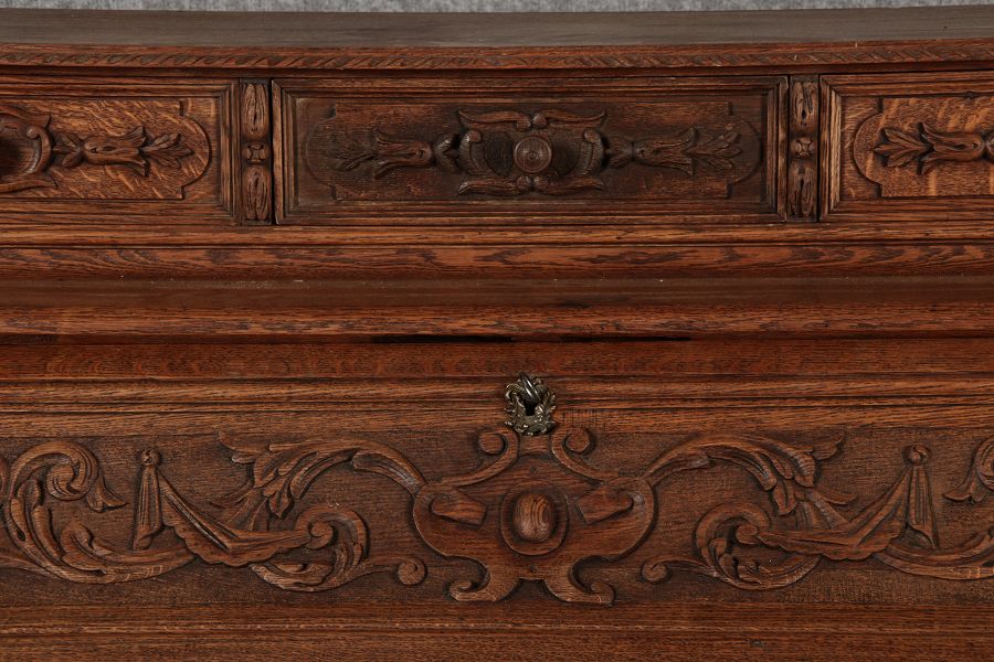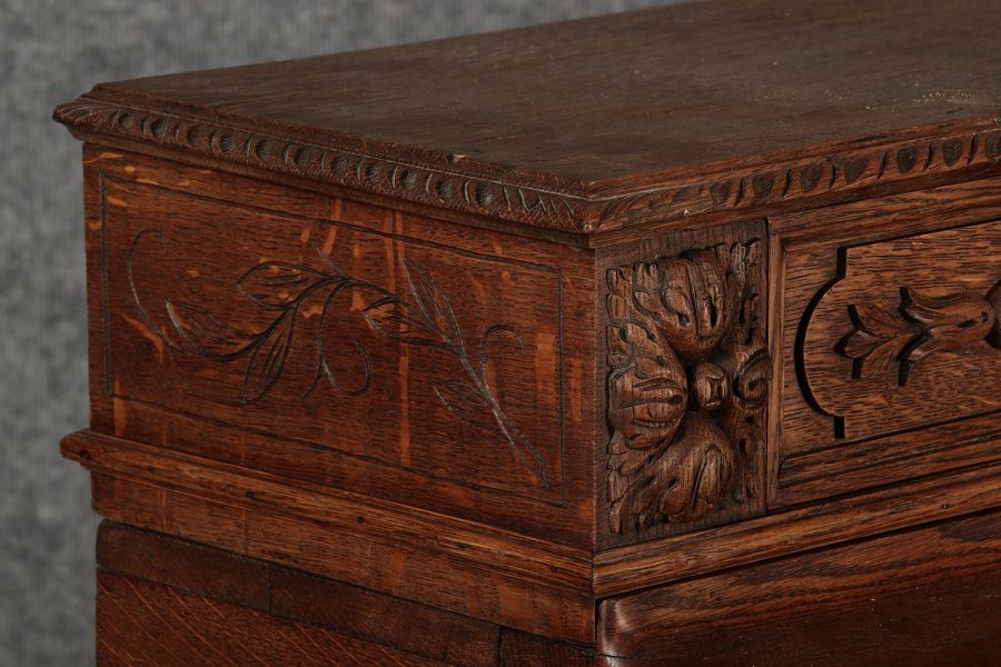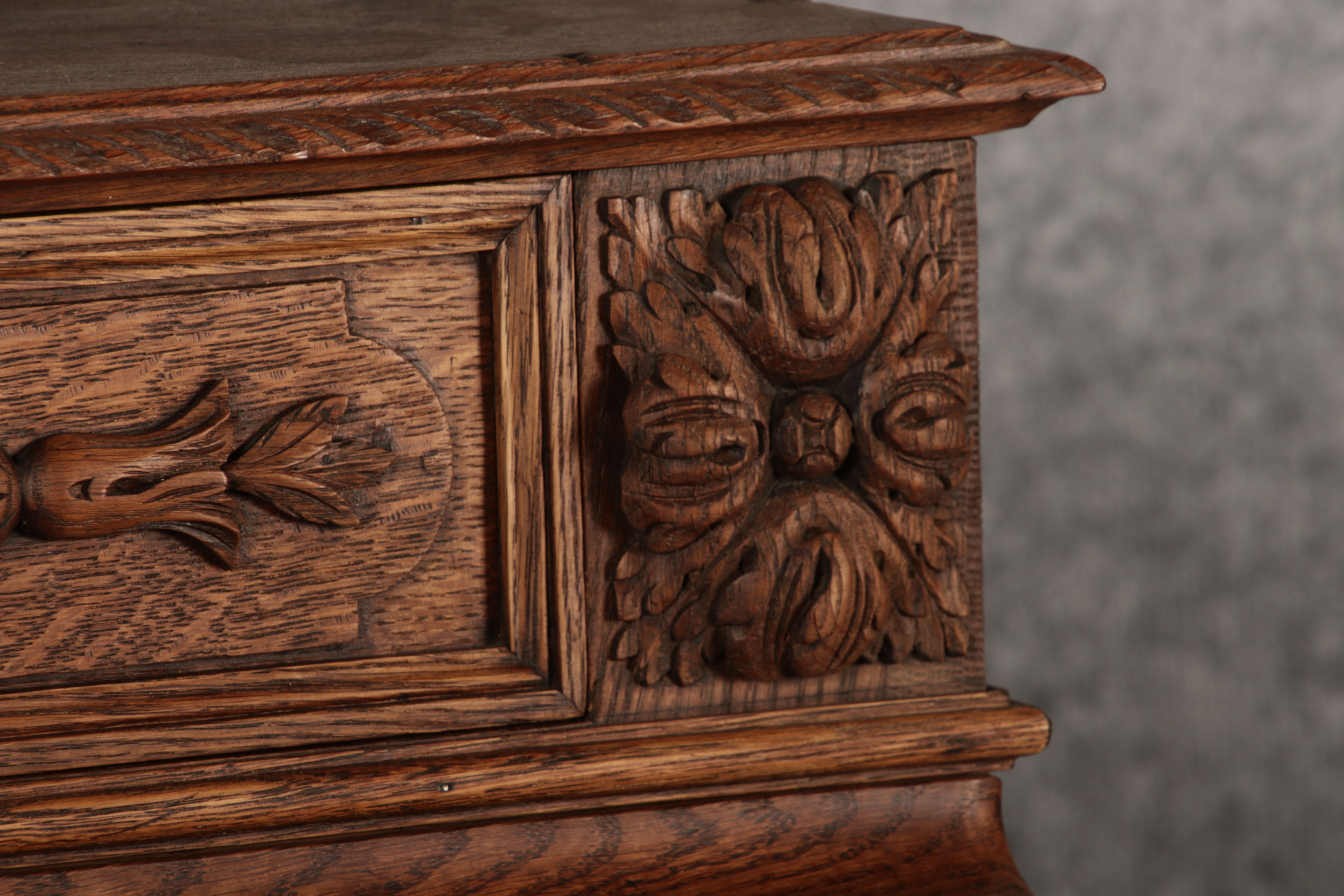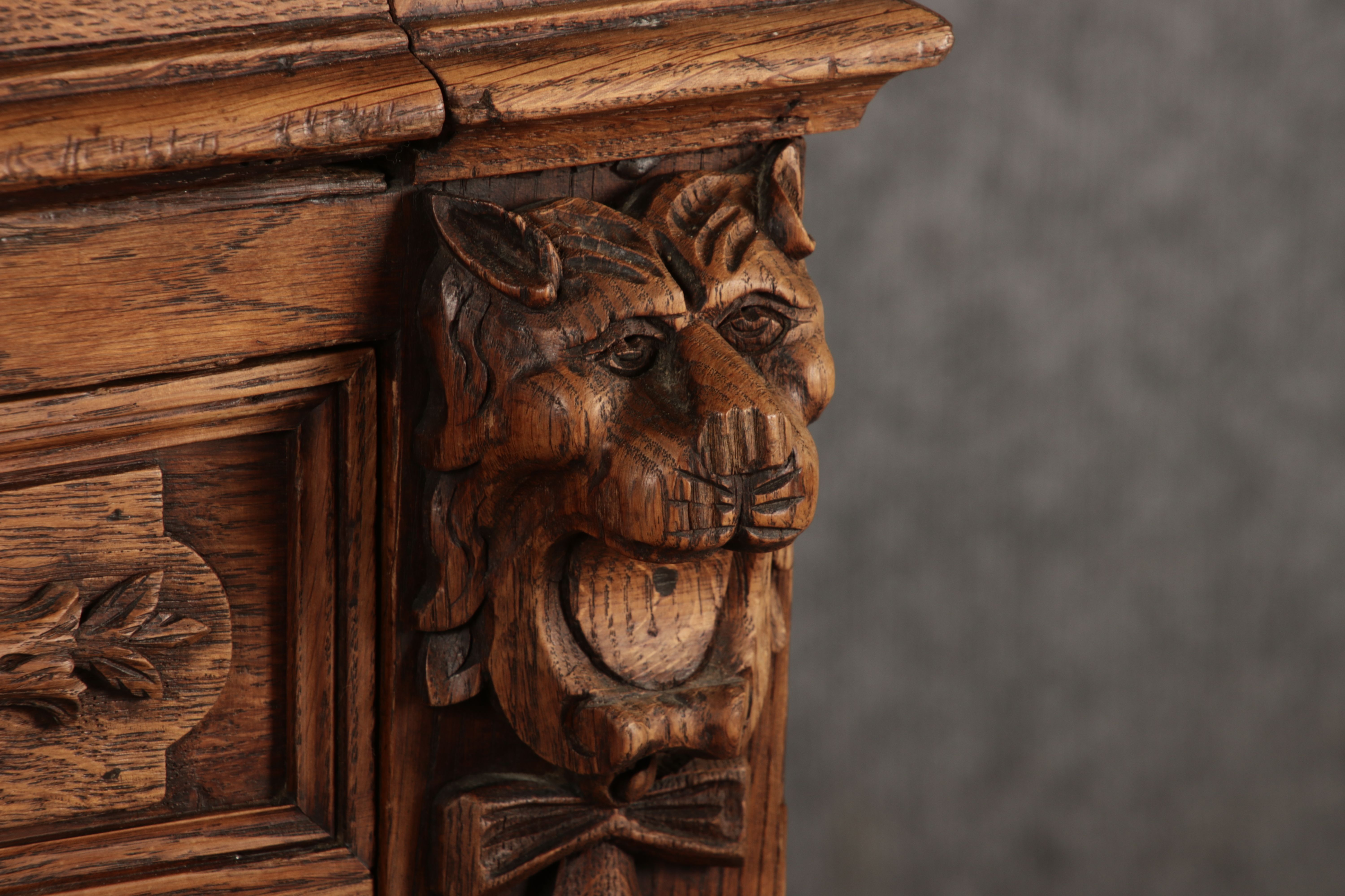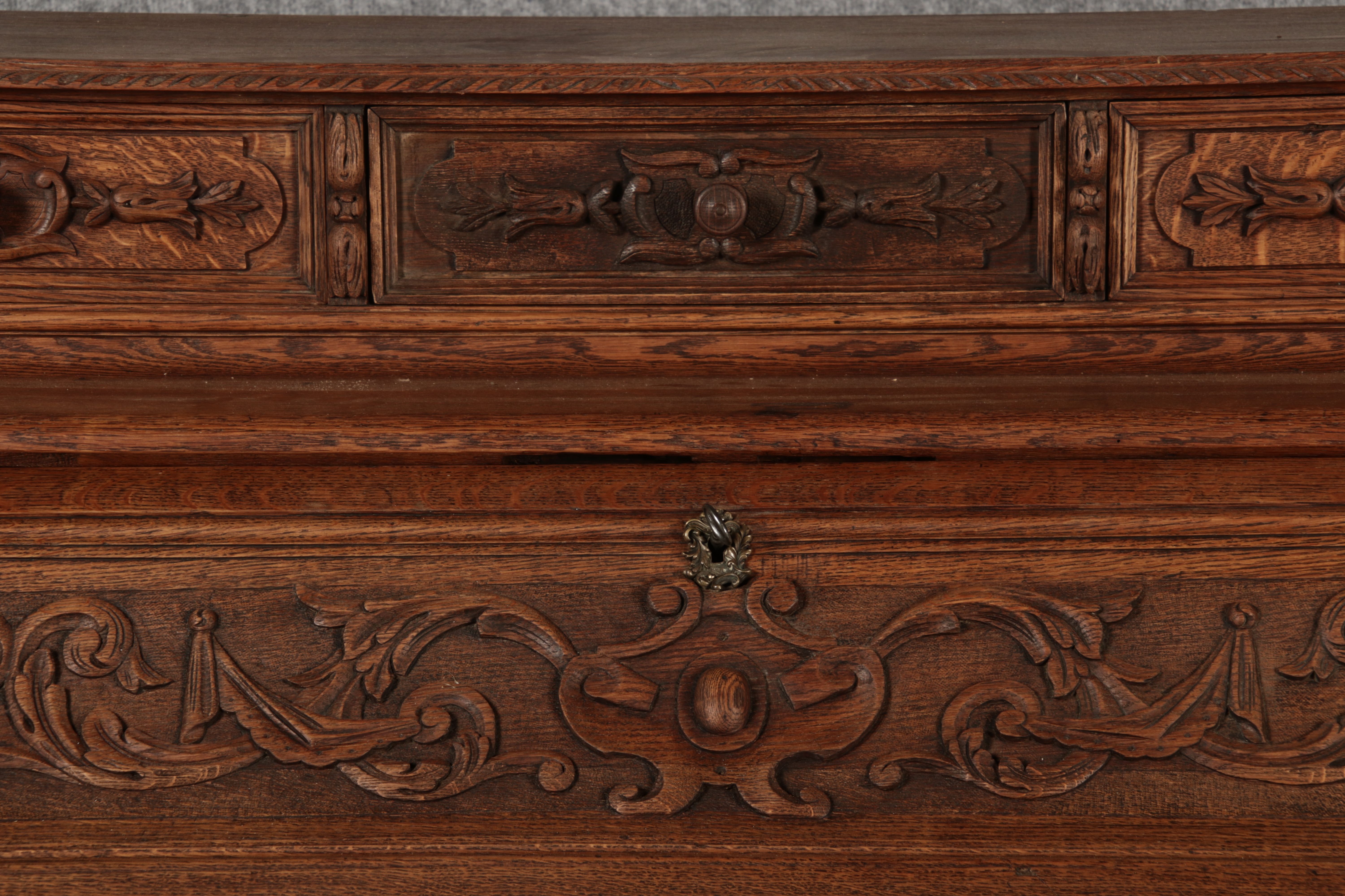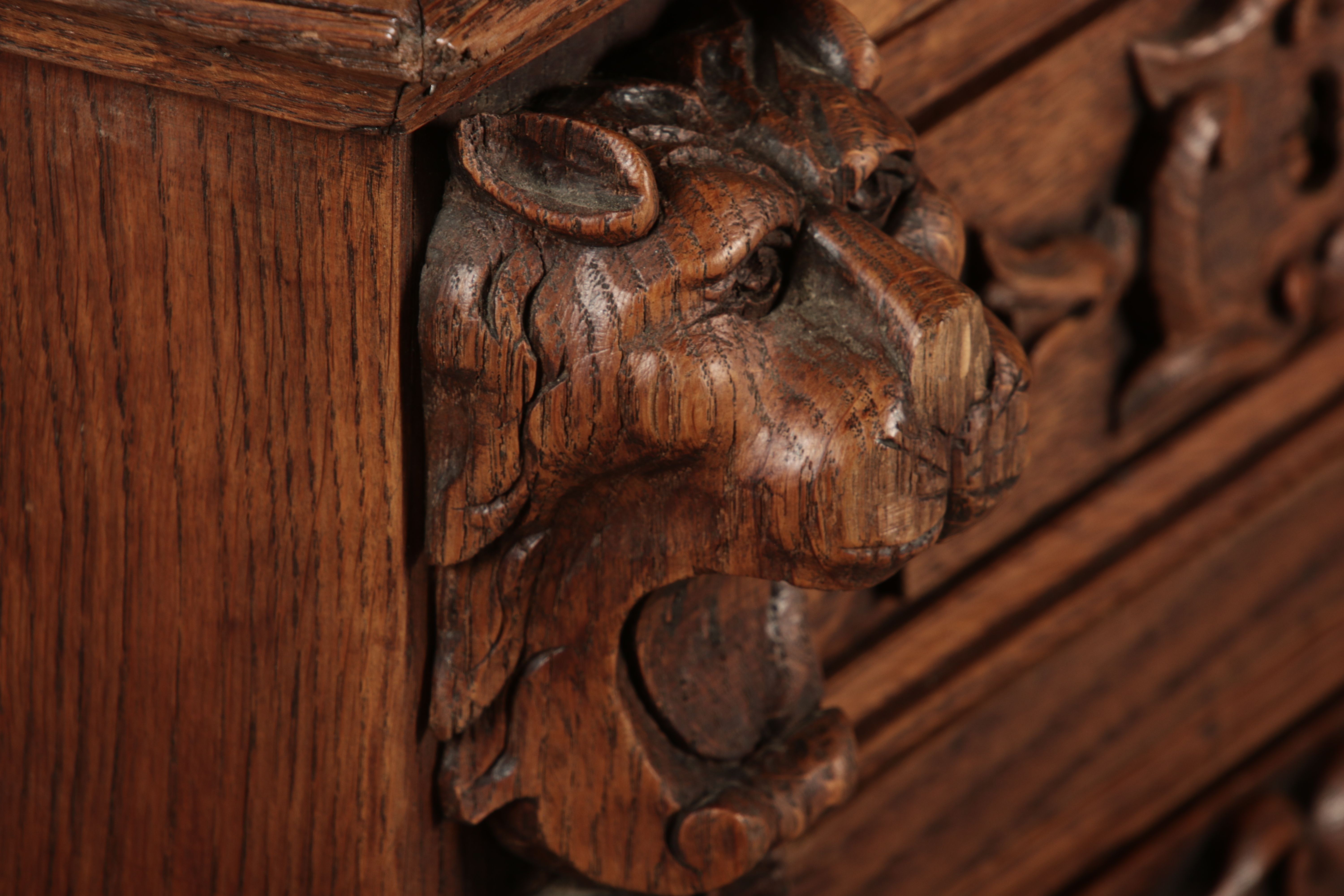 Reich verzierter antiker Sekretär – Historischer Schreibtisch mit Schnitzereien , Eiche, 19 Jh.Dieser reich verzierte antike Sekretär ist ein beeindruckendes Beispiel für meisterhafte Handwerkskunst und eine prachtvolle Darstellung von Möbeln aus der Vergangenheit. Der Schreibtisch detaillierte Holzschnitzereien mit einer funktionalen Arbeitsfläche, was ihn zu einem herausragenden Möbelstück macht, das sowohl in seiner ästhetischen Wirkung als auch in seiner praktischen Nutzung überzeugt. Material und VerarbeitungGefertigt aus hochwertigem, massivem Eichenholz, das für seine Robustheit und Langlebigkeit bekannt ist, besticht dieser Sekretär durch eine dunkle, gleichmäßige Holzfarbe mit einer natürlichen, warmen Patina. Besonders hervorzuheben sind die detaillierten und aufwendigen Schnitzereien, die den gesamten Sekretär zieren und ihm einen kunstvollen und majestätischen Charakter verleihen. Die floralen Motive und klassischen Verzierungen auf der Vorderseite und den Seiten sind Zeugnis einer außergewöhnlichen handwerklichen Fertigkeit. Design und AufbauDer Sekretär weist die typische Form eines Schreibmöbels vergangener Zeiten auf, ist jedoch durch seine detailreiche Verzierung besonders auffällig: