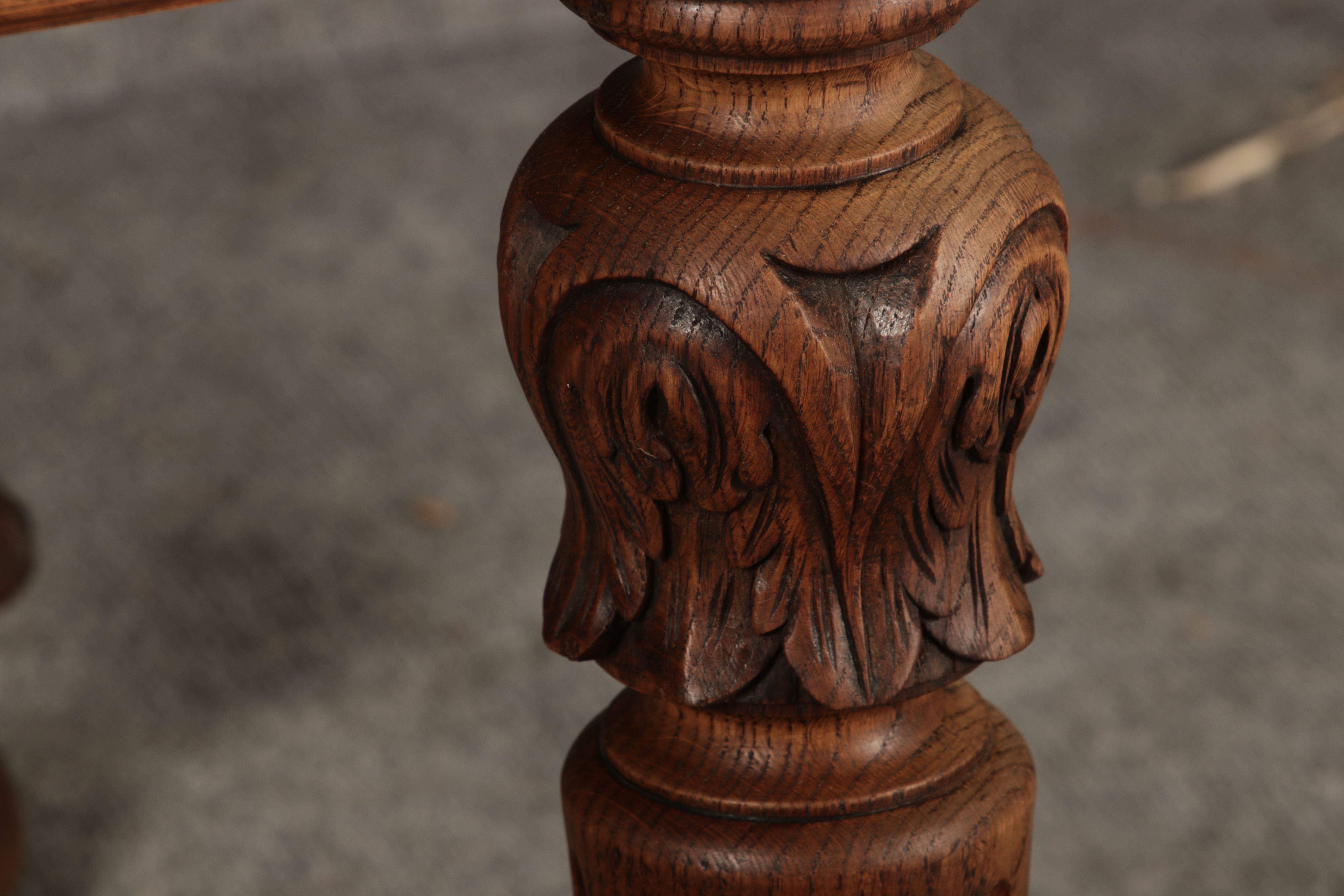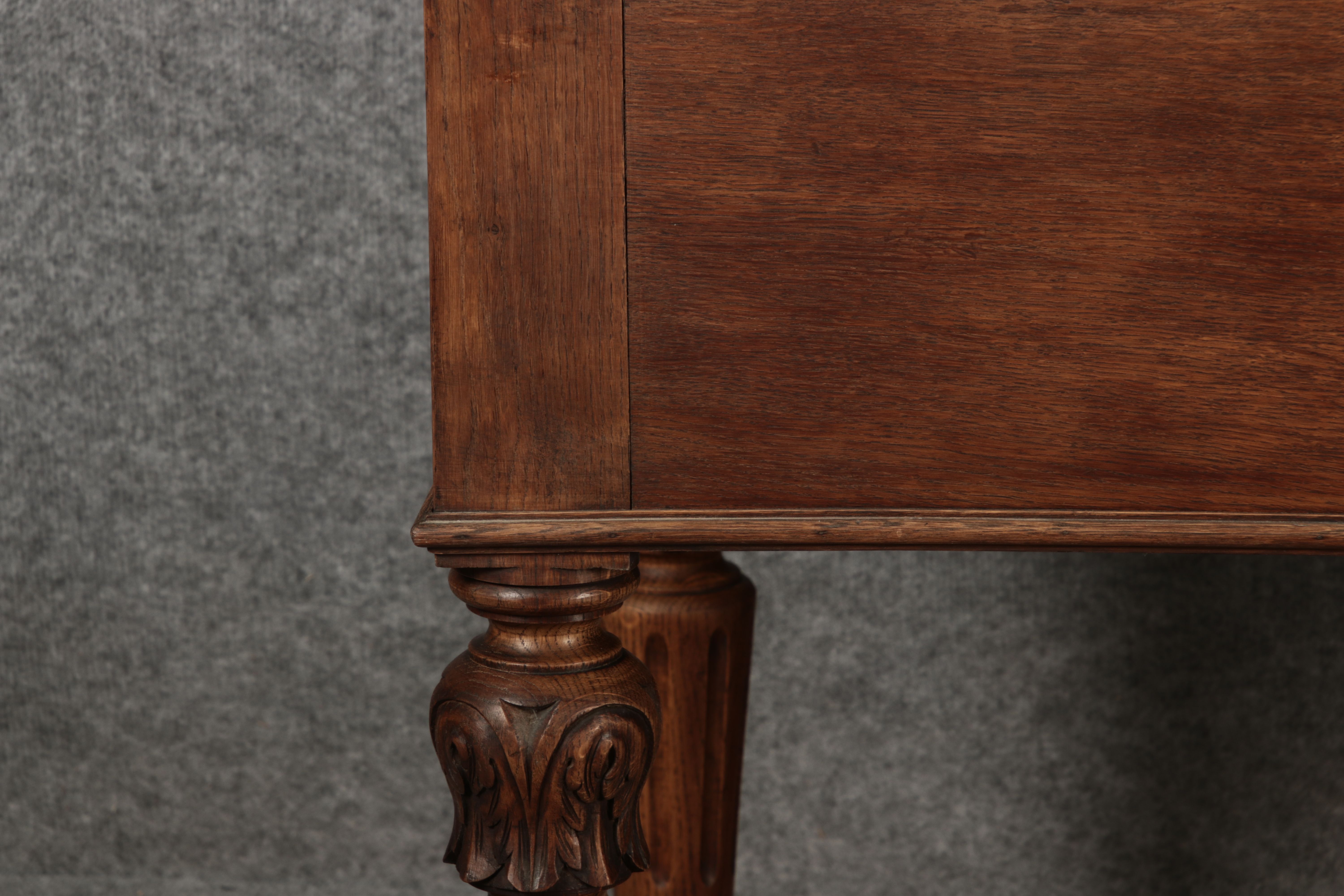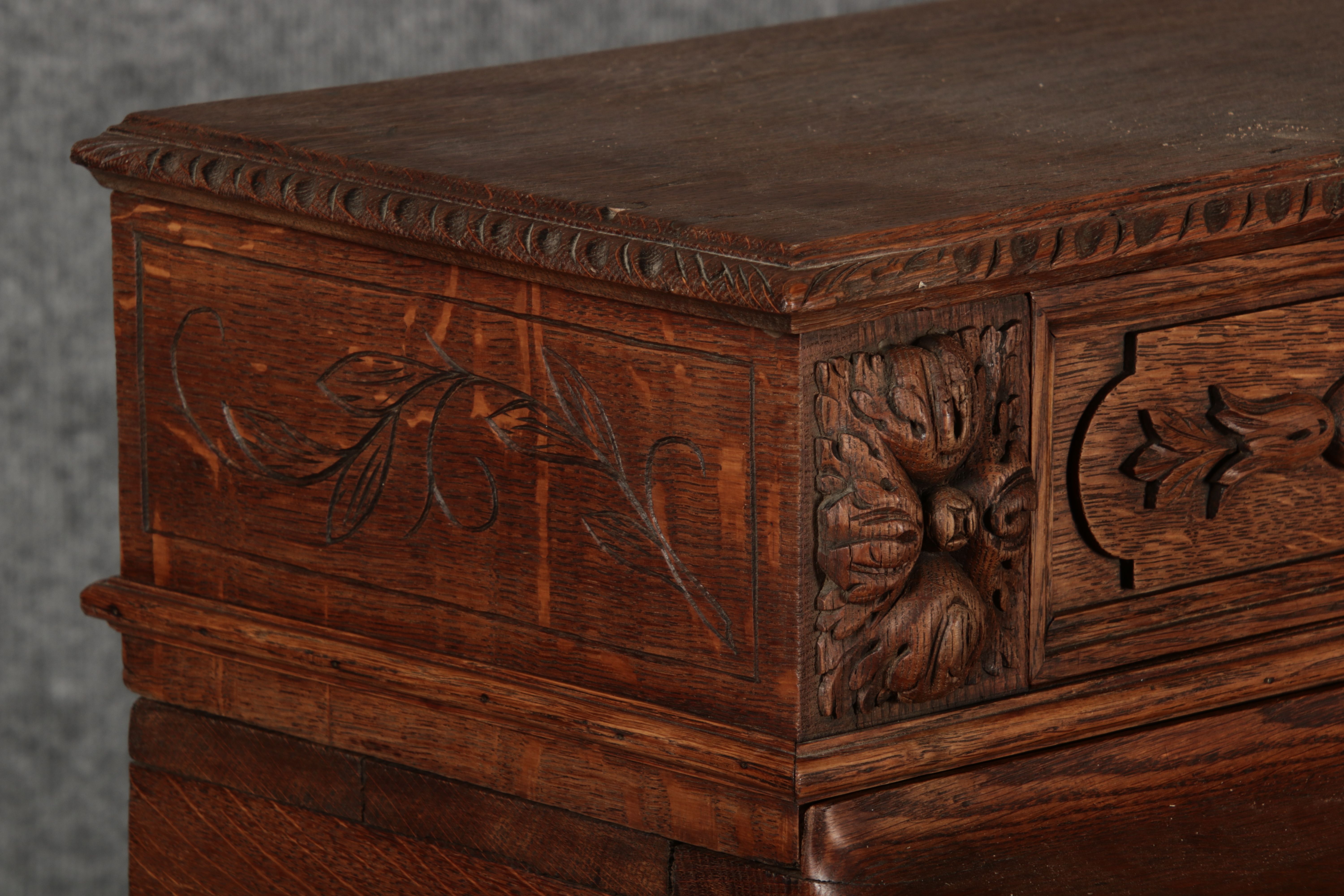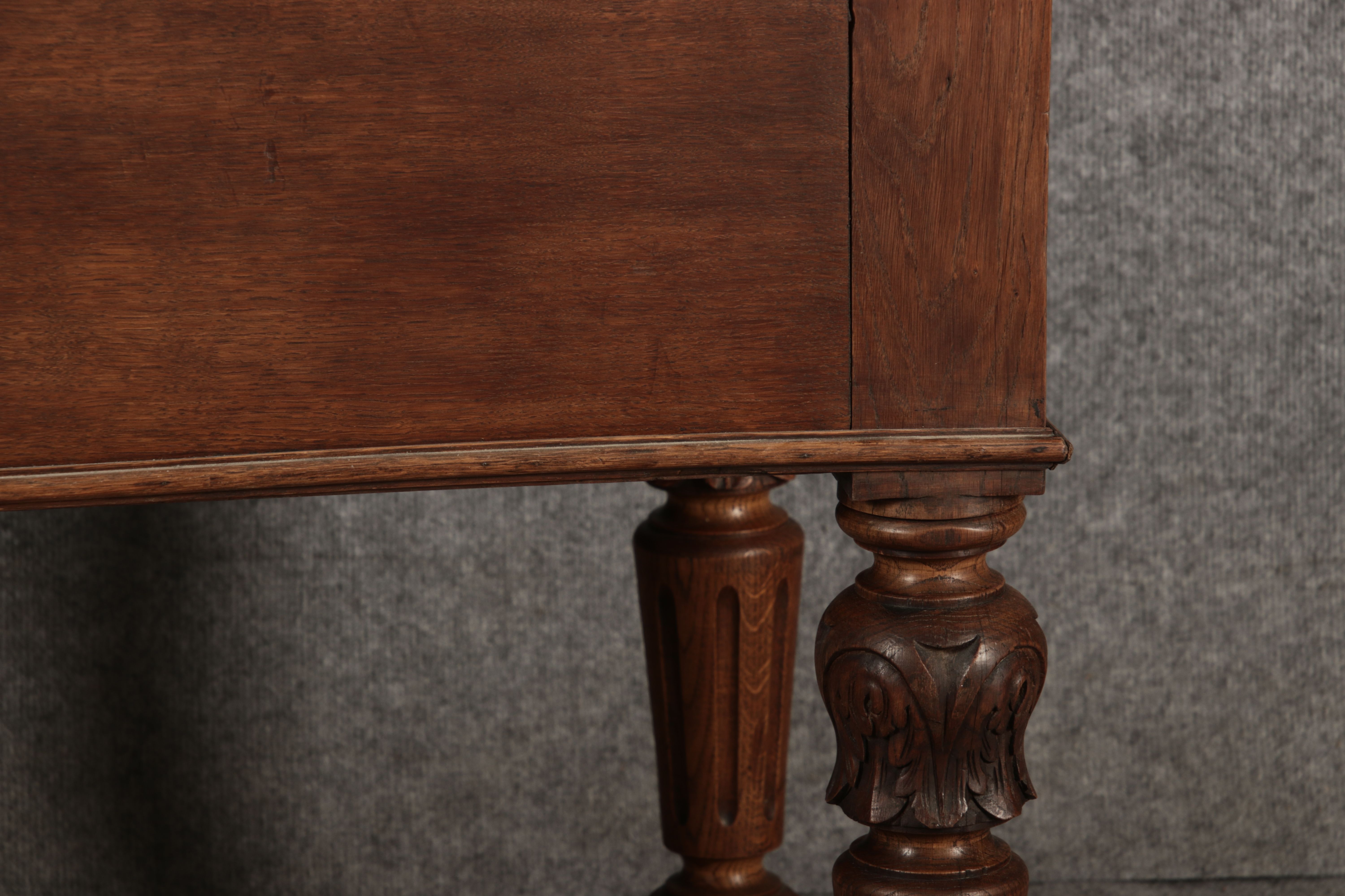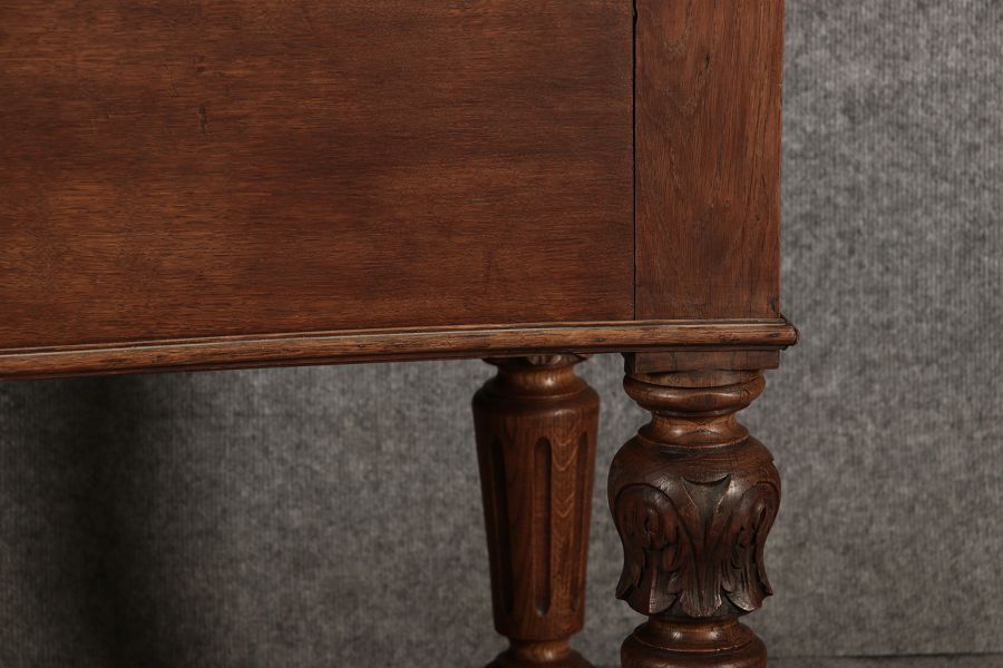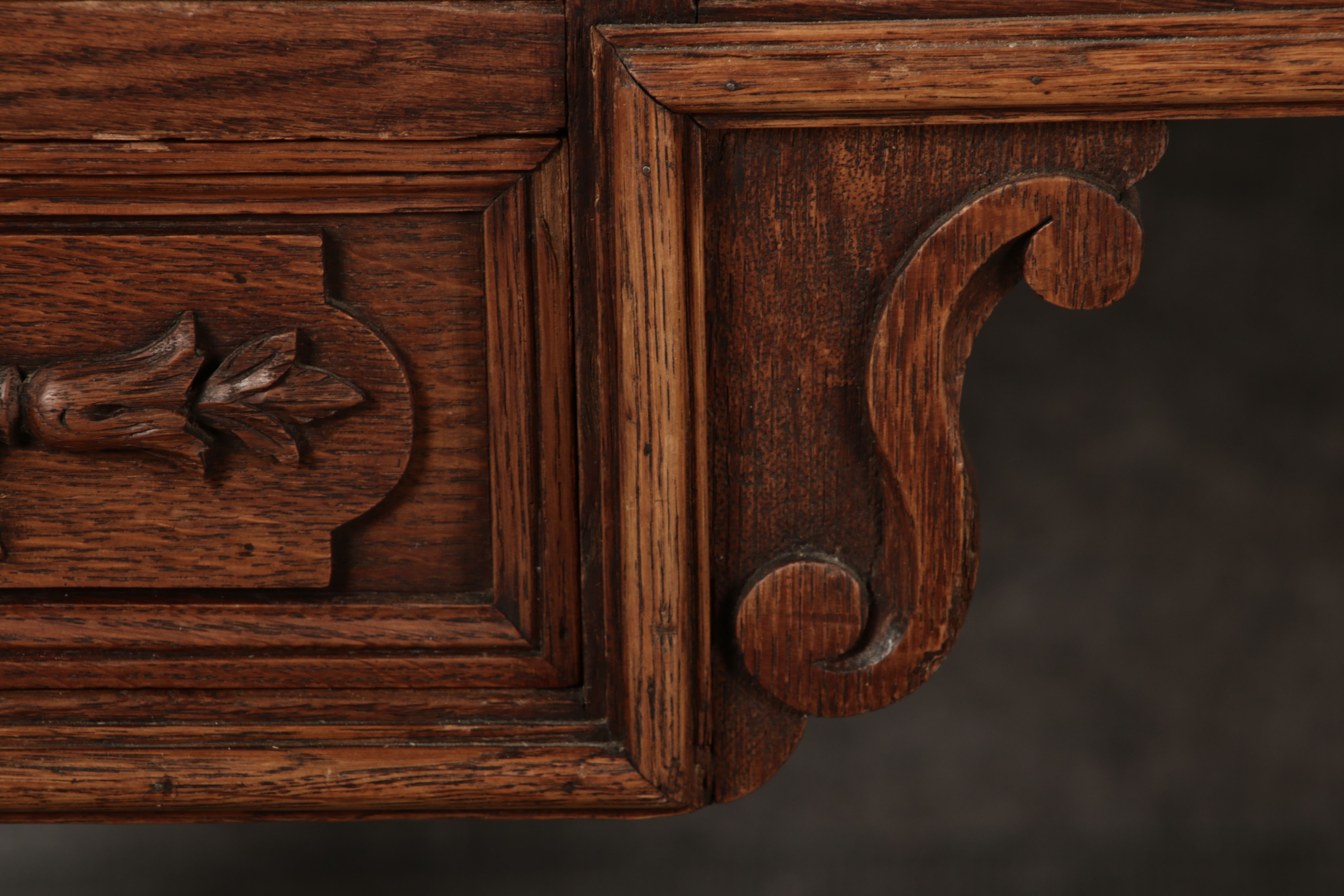 Reich verzierter antiker Sekretär – Historischer Schreibtisch mit Schnitzereien , Eiche, 19 Jh.Dieser reich verzierte antike Sekretär ist ein beeindruckendes Beispiel für meisterhafte Handwerkskunst und eine prachtvolle Darstellung von Möbeln aus der Vergangenheit. Der Schreibtisch detaillierte Holzschnitzereien mit einer funktionalen Arbeitsfläche, was ihn zu einem herausragenden Möbelstück macht, das sowohl in seiner ästhetischen Wirkung als auch in seiner praktischen Nutzung überzeugt. Material und VerarbeitungGefertigt aus hochwertigem, massivem Eichenholz, das für seine Robustheit und Langlebigkeit bekannt ist, besticht dieser Sekretär durch eine dunkle, gleichmäßige Holzfarbe mit einer natürlichen, warmen Patina. Besonders hervorzuheben sind die detaillierten und aufwendigen Schnitzereien, die den gesamten Sekretär zieren und ihm einen kunstvollen und majestätischen Charakter verleihen. Die floralen Motive und klassischen Verzierungen auf der Vorderseite und den Seiten sind Zeugnis einer außergewöhnlichen handwerklichen Fertigkeit. Design und AufbauDer Sekretär weist die typische Form eines Schreibmöbels vergangener Zeiten auf, ist jedoch durch seine detailreiche Verzierung besonders auffällig: