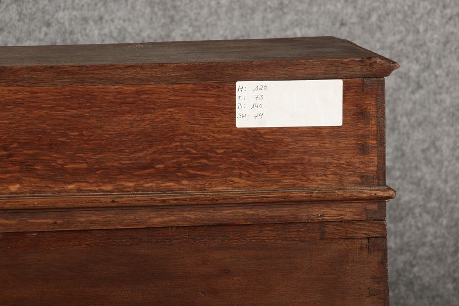 Beschreibung/description: Reich verzierter antiker Sekretär – Historischer Schreibtisch mit Schnitzereien , Eiche, 19 Jh.Dieser reich verzierte antike Sekretär ist ein beeindruckendes Beispiel für meisterhafte Handwerkskunst und eine prachtvolle Darstellung von Möbeln aus der Vergangenheit. Der Schreibtisch detaillierte Holzschnitzereien mit einer funktionalen Arbeitsfläche, was ihn zu einem herausragenden Möbelstück macht, das sowohl in seiner ästhetischen Wirkung als auch in seiner praktischen Nutzung überzeugt. Material und VerarbeitungGefertigt aus hochwertigem, massivem Eichenholz, das für seine Robustheit und Langlebigkeit bekannt ist, besticht dieser Sekretär durch eine dunkle, gleichmäßige Holzfarbe mit einer natürlichen, warmen Patina. Besonders hervorzuheben sind die detaillierten und aufwendigen Schnitzereien, die den gesamten Sekretär zieren und ihm einen kunstvollen und majestätischen Charakter verleihen. Die floralen Motive und klassischen Verzierungen auf der Vorderseite und den Seiten sind Zeugnis einer außergewöhnlichen handwerklichen Fertigkeit. Design und AufbauDer Sekretär weist die typische Form eines Schreibmöbels vergangener Zeiten auf, ist jedoch durch seine detailreiche Verzierung besonders auffällig: