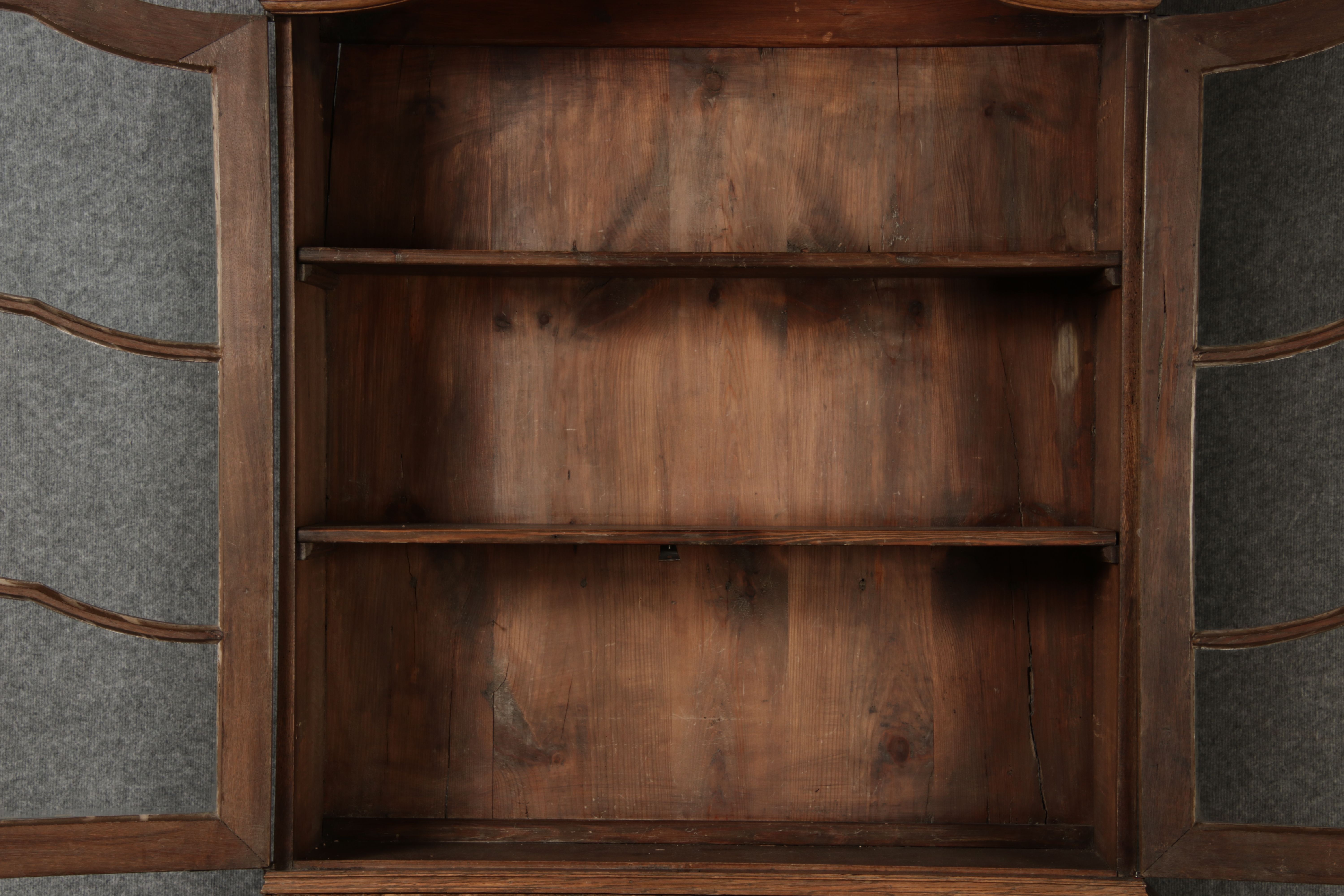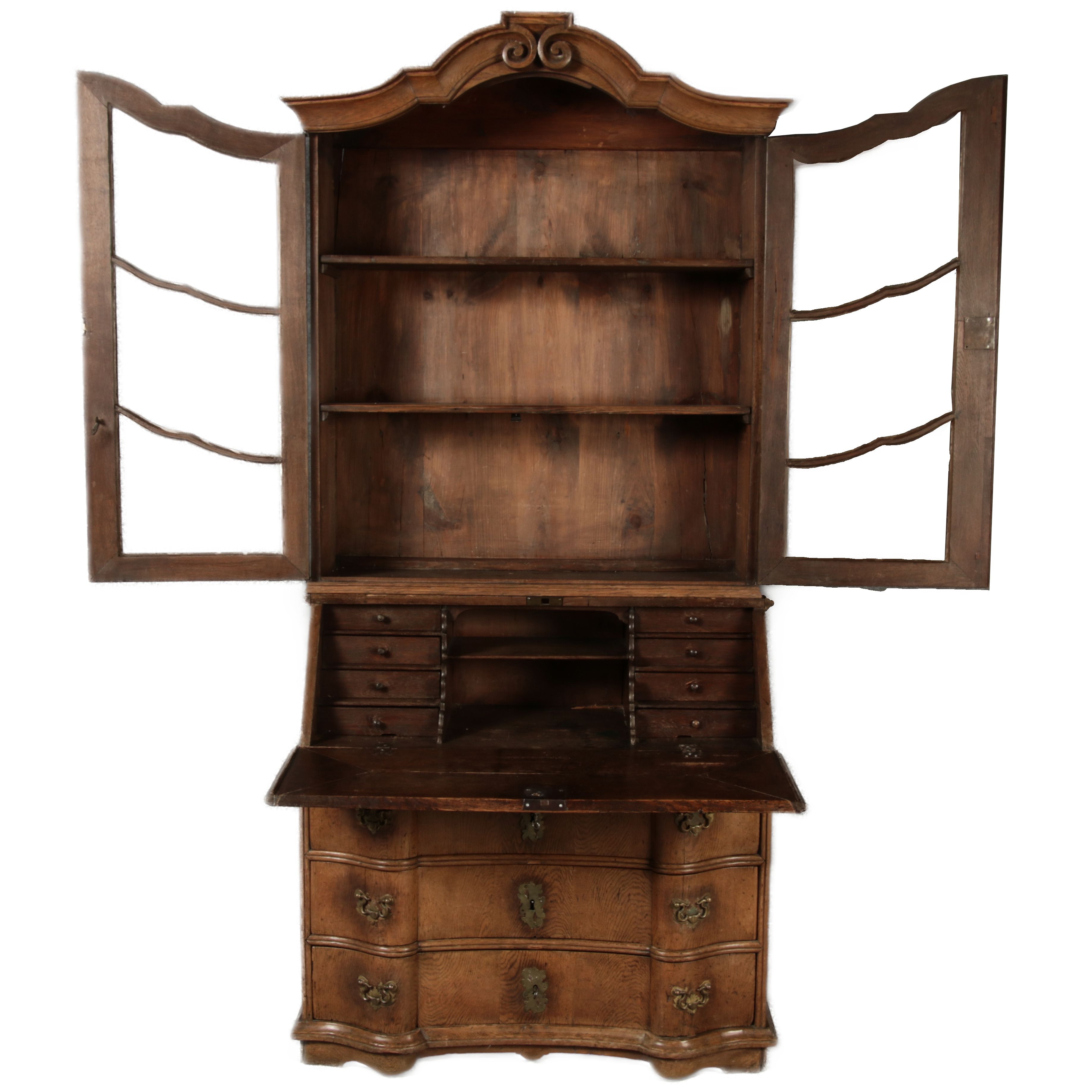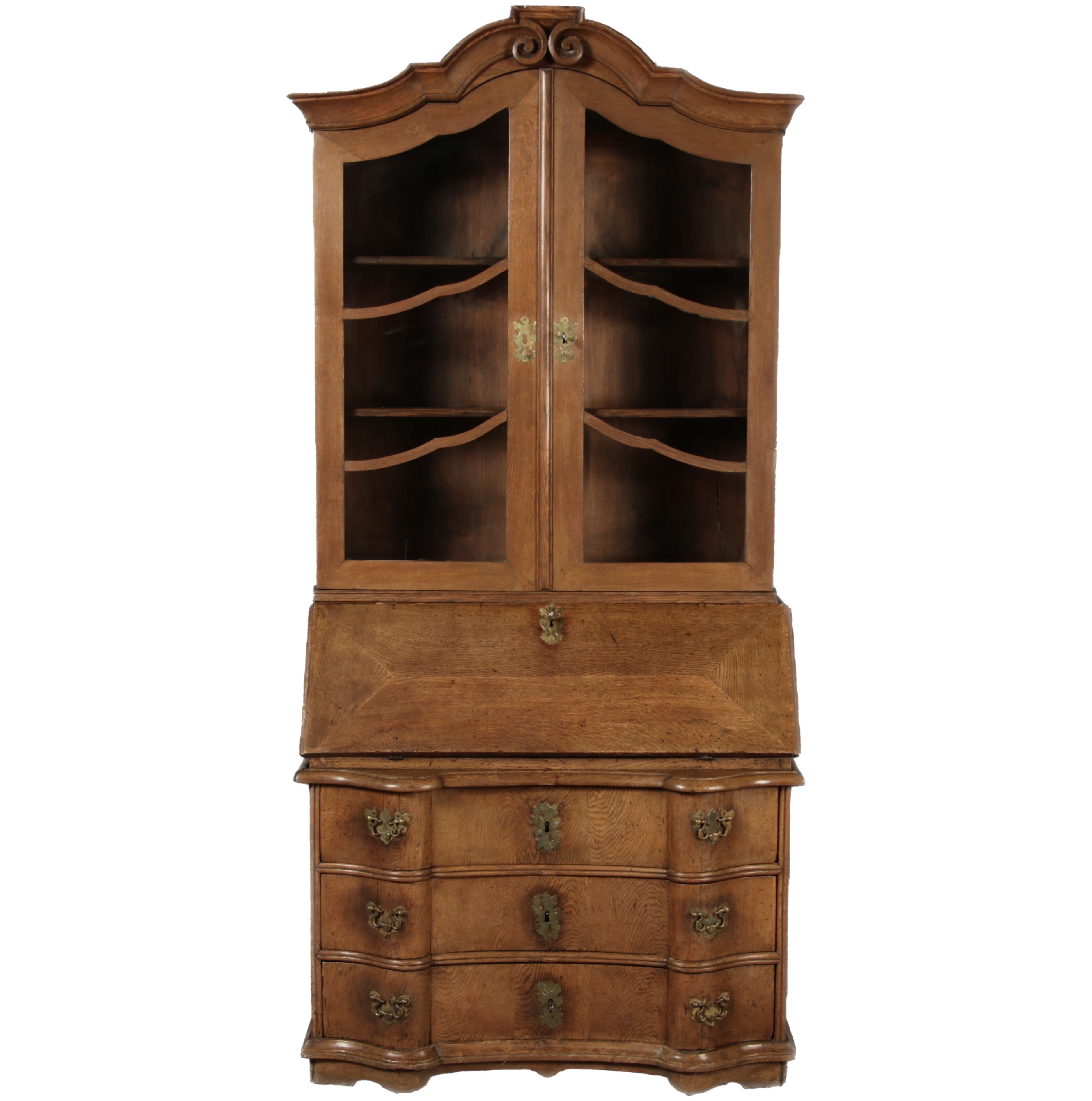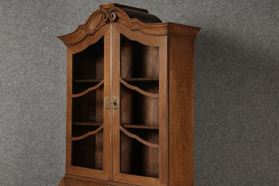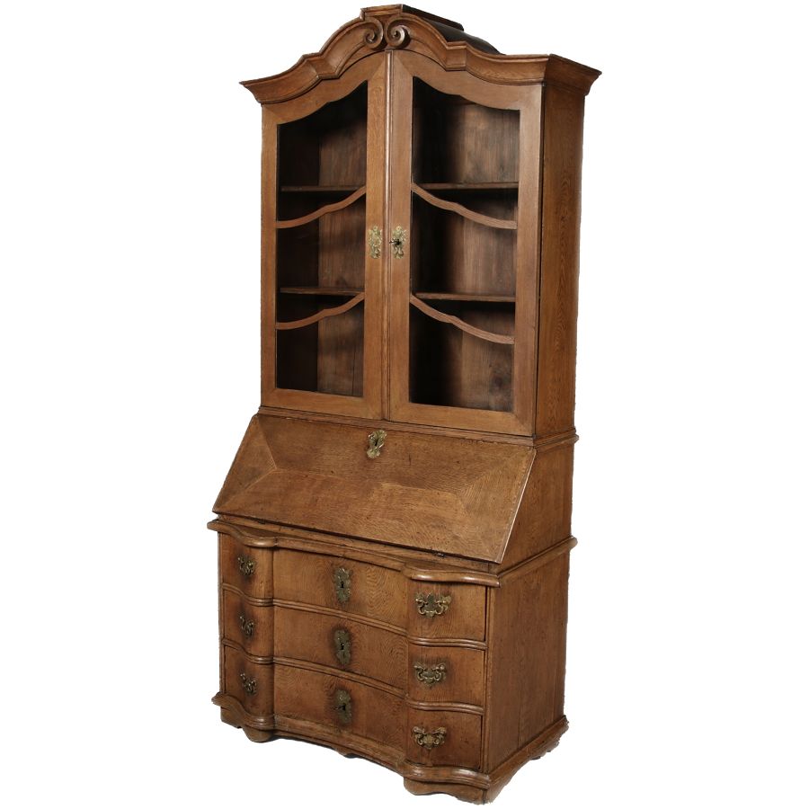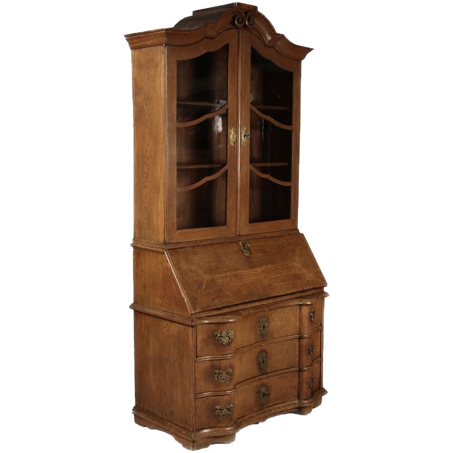 Antiker Spätbarock Sekretär Eichenholz 18 Jh. mit Vitrinen OberteilDieser Sekretär im Stil des Spätbarock besticht durch seine elegante antike Formgebung und die Verwendung von massivem Eichenholz. Das Stück vereint kunstvolle Schnitzereien und praktische Funktionalität, typisch für Möbel aus der Mitte des 18. Jahrhunderts. Seine geschwungenen Linien und die harmonische Gestaltung der Oberflächen machen ihn zu einem edlen Möbelstück, das in jeder Einrichtung einen besonderen Platz finden wird. Material und VerarbeitungGefertigt aus massivem und furnierten Eichenholz, überzeugt dieser Sekretär durch seine charakteristische, natürliche Holzmaserung. Das Eichenholz hat über die Jahre eine ansprechende Patina entwickelt, die seinen antiken Charme unterstreicht. Die geschwungenen Fronten und Seitenwände spiegeln den Einfluss des Barock breiter, mit weichen Linien und organischen Formen, die dem Möbelstück seine anmutige Präsenz verleihen. Design und AufbauDieser Sekretär kombiniert die Funktionalität eines Schranks mit einem praktischen Schreibbereich: