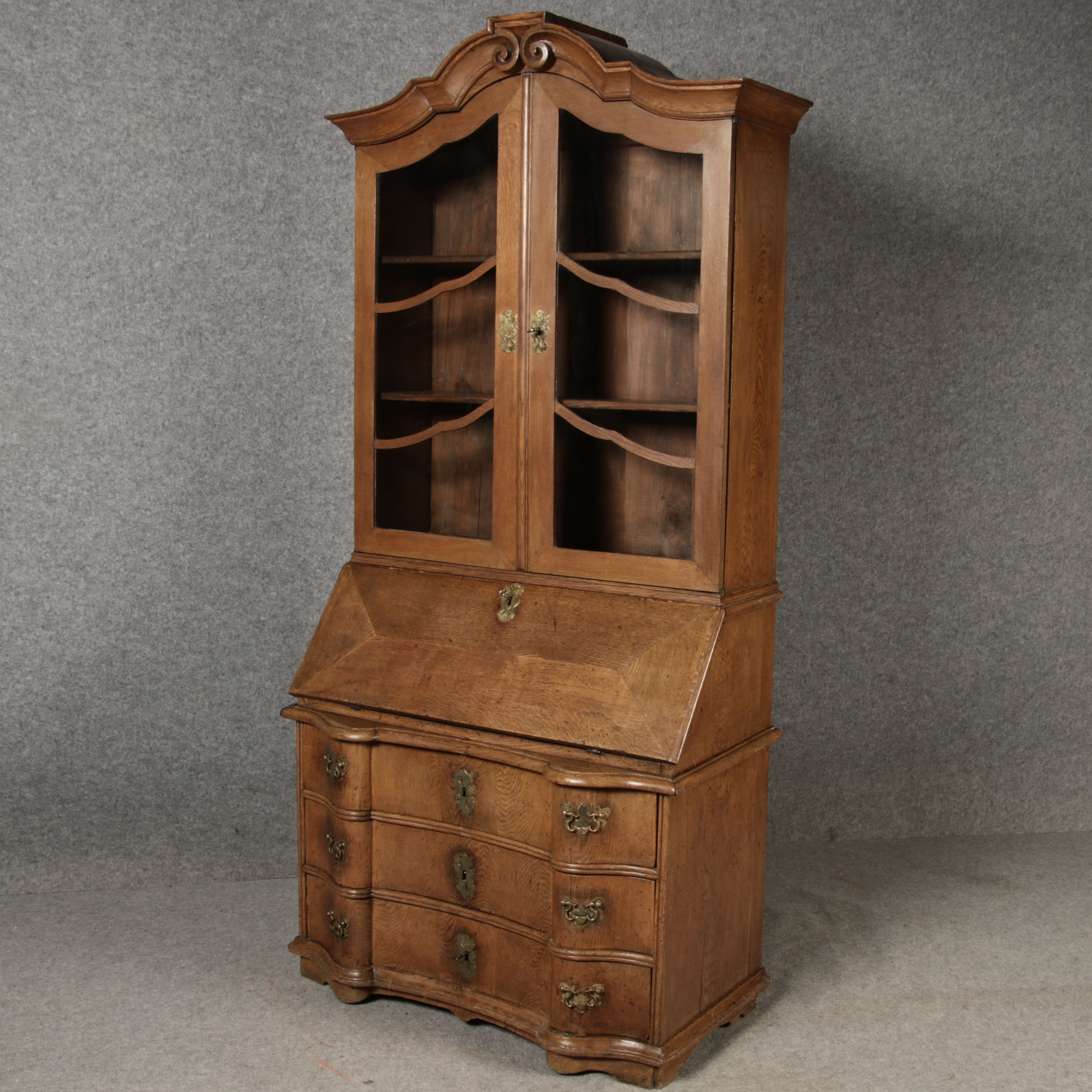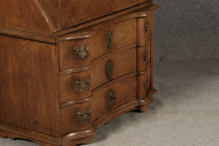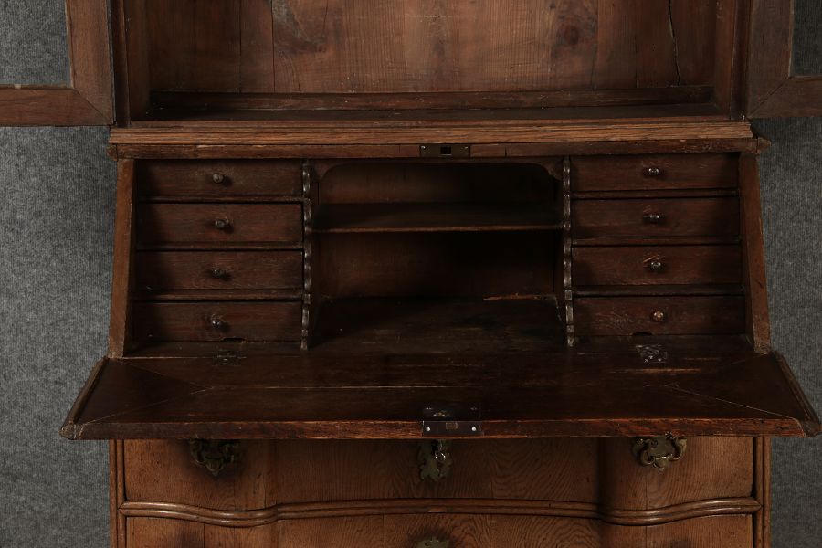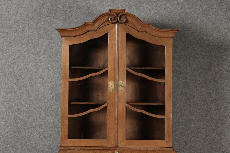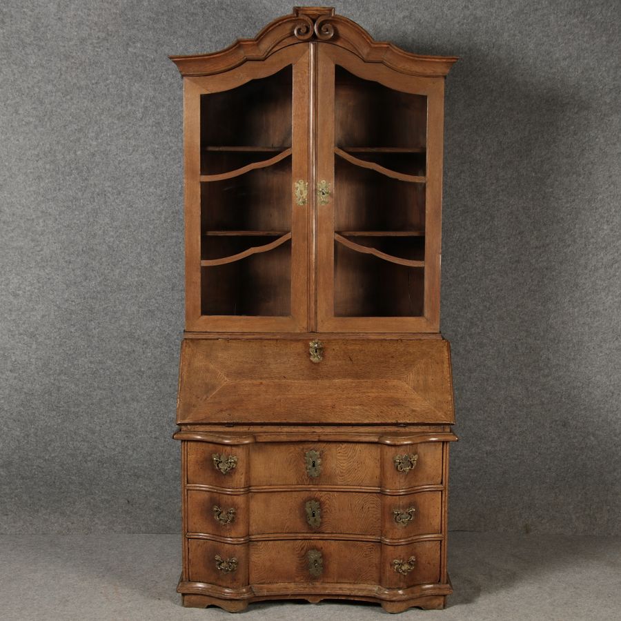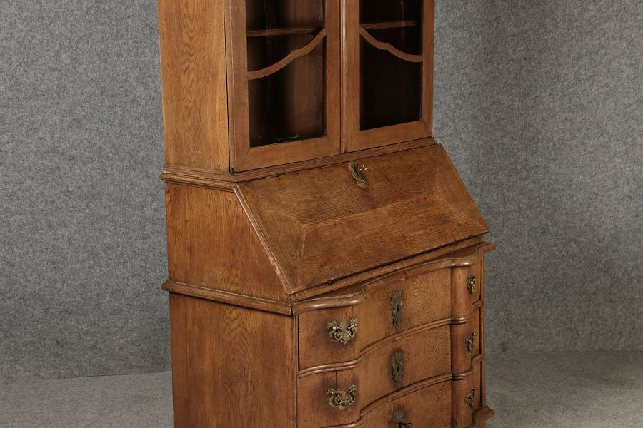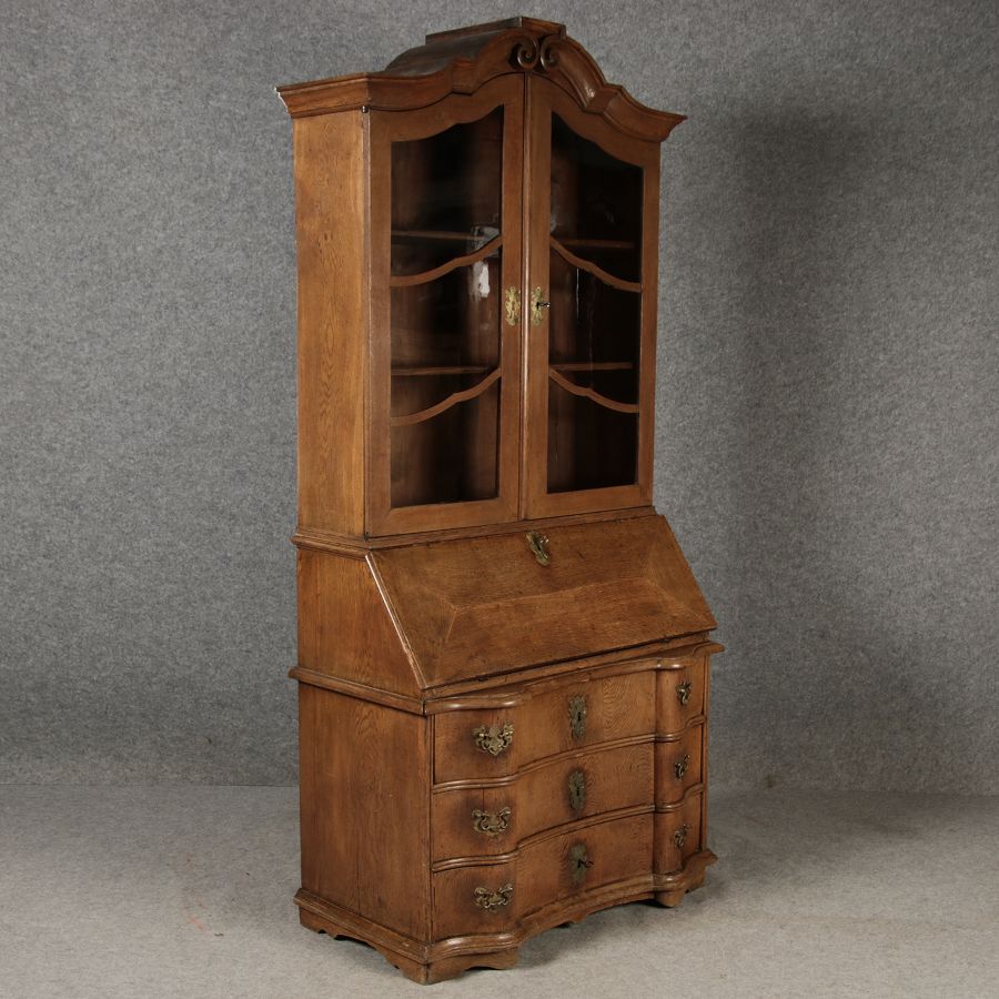 Beschreibung/description: Antiker Spätbarock Sekretär Eichenholz 18 Jh. mit Vitrinen OberteilDieser Sekretär im Stil des Spätbarock besticht durch seine elegante antike Formgebung und die Verwendung von massivem Eichenholz. Das Stück vereint kunstvolle Schnitzereien und praktische Funktionalität, typisch für Möbel aus der Mitte des 18. Jahrhunderts. Seine geschwungenen Linien und die harmonische Gestaltung der Oberflächen machen ihn zu einem edlen Möbelstück, das in jeder Einrichtung einen besonderen Platz finden wird. Material und VerarbeitungGefertigt aus massivem und furnierten Eichenholz, überzeugt dieser Sekretär durch seine charakteristische, natürliche Holzmaserung. Das Eichenholz hat über die Jahre eine ansprechende Patina entwickelt, die seinen antiken Charme unterstreicht. Die geschwungenen Fronten und Seitenwände spiegeln den Einfluss des Barock breiter, mit weichen Linien und organischen Formen, die dem Möbelstück seine anmutige Präsenz verleihen. Design und AufbauDieser Sekretär kombiniert die Funktionalität eines Schranks mit einem praktischen Schreibbereich: