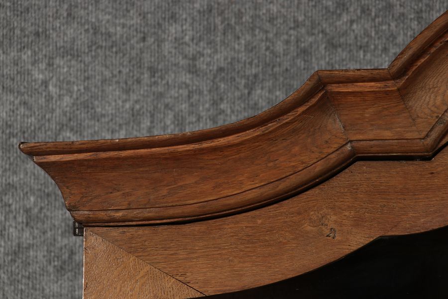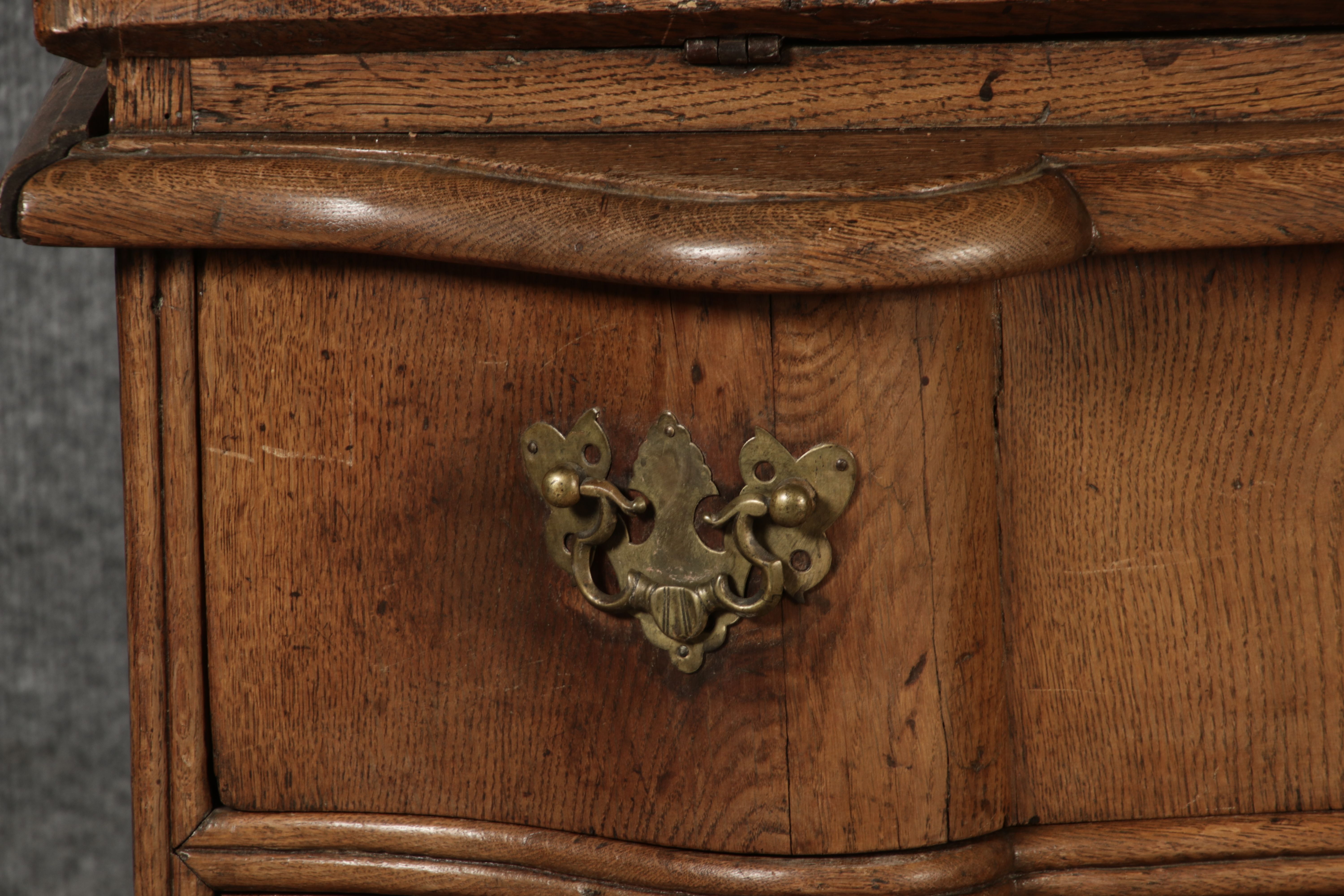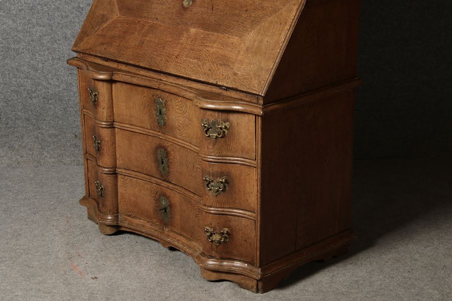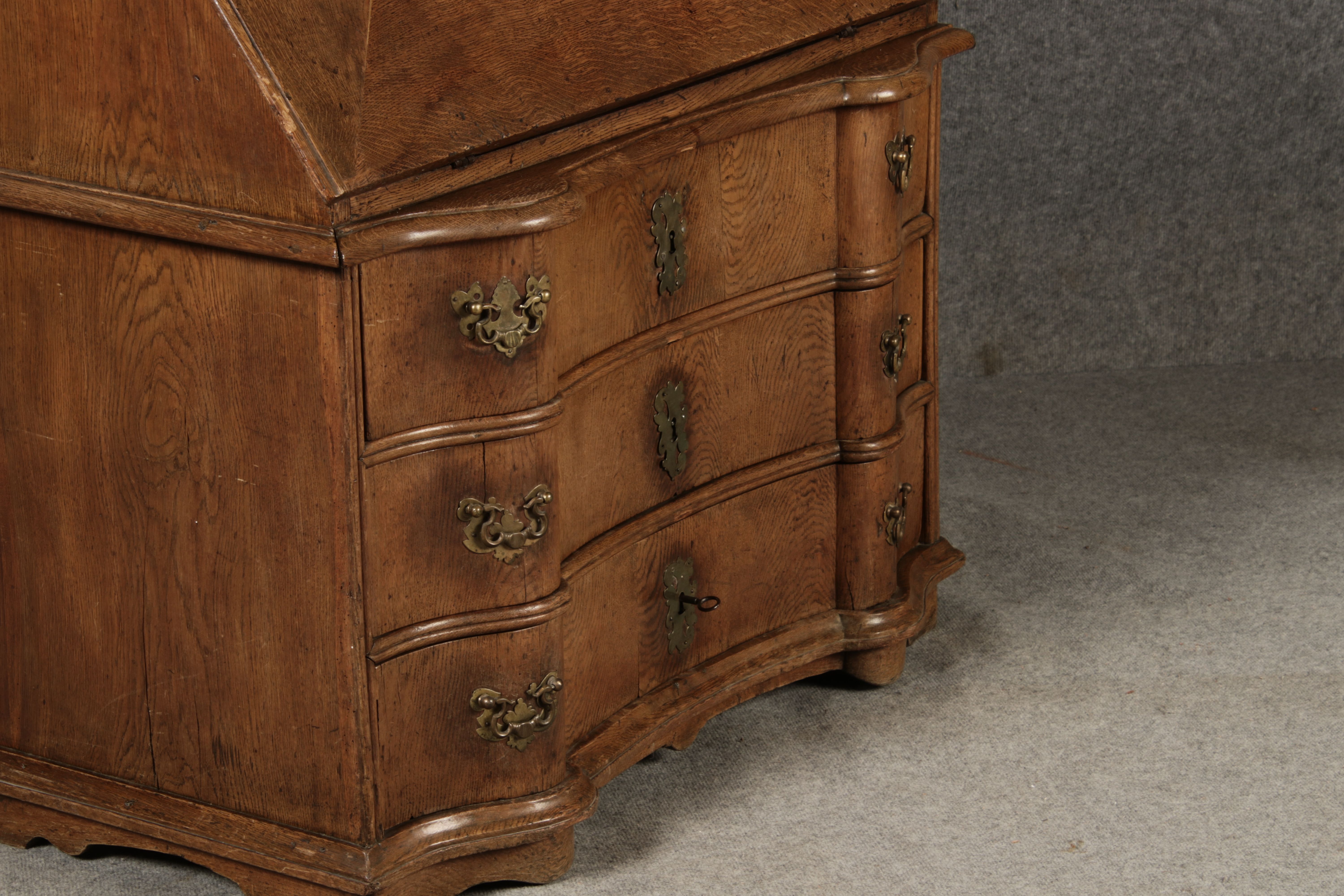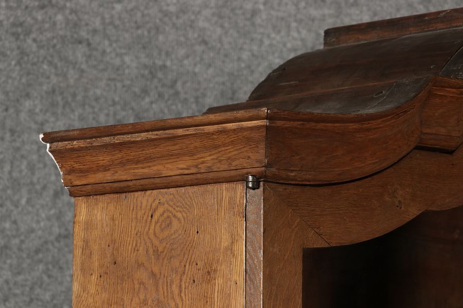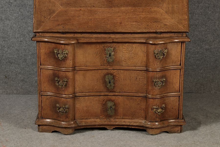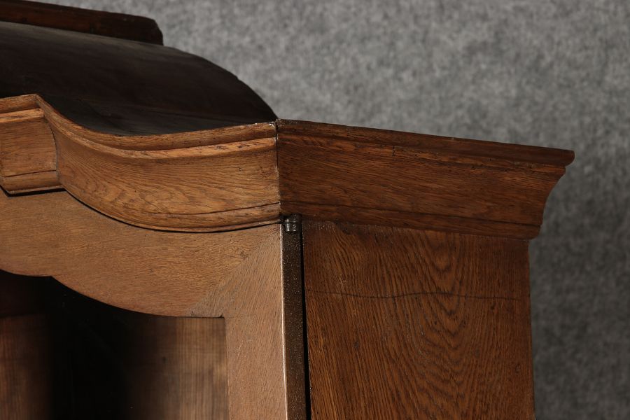 Beschreibung/description: Antiker Spätbarock Sekretär Eichenholz 18 Jh. mit Vitrinen OberteilDieser Sekretär im Stil des Spätbarock besticht durch seine elegante antike Formgebung und die Verwendung von massivem Eichenholz. Das Stück vereint kunstvolle Schnitzereien und praktische Funktionalität, typisch für Möbel aus der Mitte des 18. Jahrhunderts. Seine geschwungenen Linien und die harmonische Gestaltung der Oberflächen machen ihn zu einem edlen Möbelstück, das in jeder Einrichtung einen besonderen Platz finden wird. Material und VerarbeitungGefertigt aus massivem und furnierten Eichenholz, überzeugt dieser Sekretär durch seine charakteristische, natürliche Holzmaserung. Das Eichenholz hat über die Jahre eine ansprechende Patina entwickelt, die seinen antiken Charme unterstreicht. Die geschwungenen Fronten und Seitenwände spiegeln den Einfluss des Barock breiter, mit weichen Linien und organischen Formen, die dem Möbelstück seine anmutige Präsenz verleihen. Design und AufbauDieser Sekretär kombiniert die Funktionalität eines Schranks mit einem praktischen Schreibbereich: