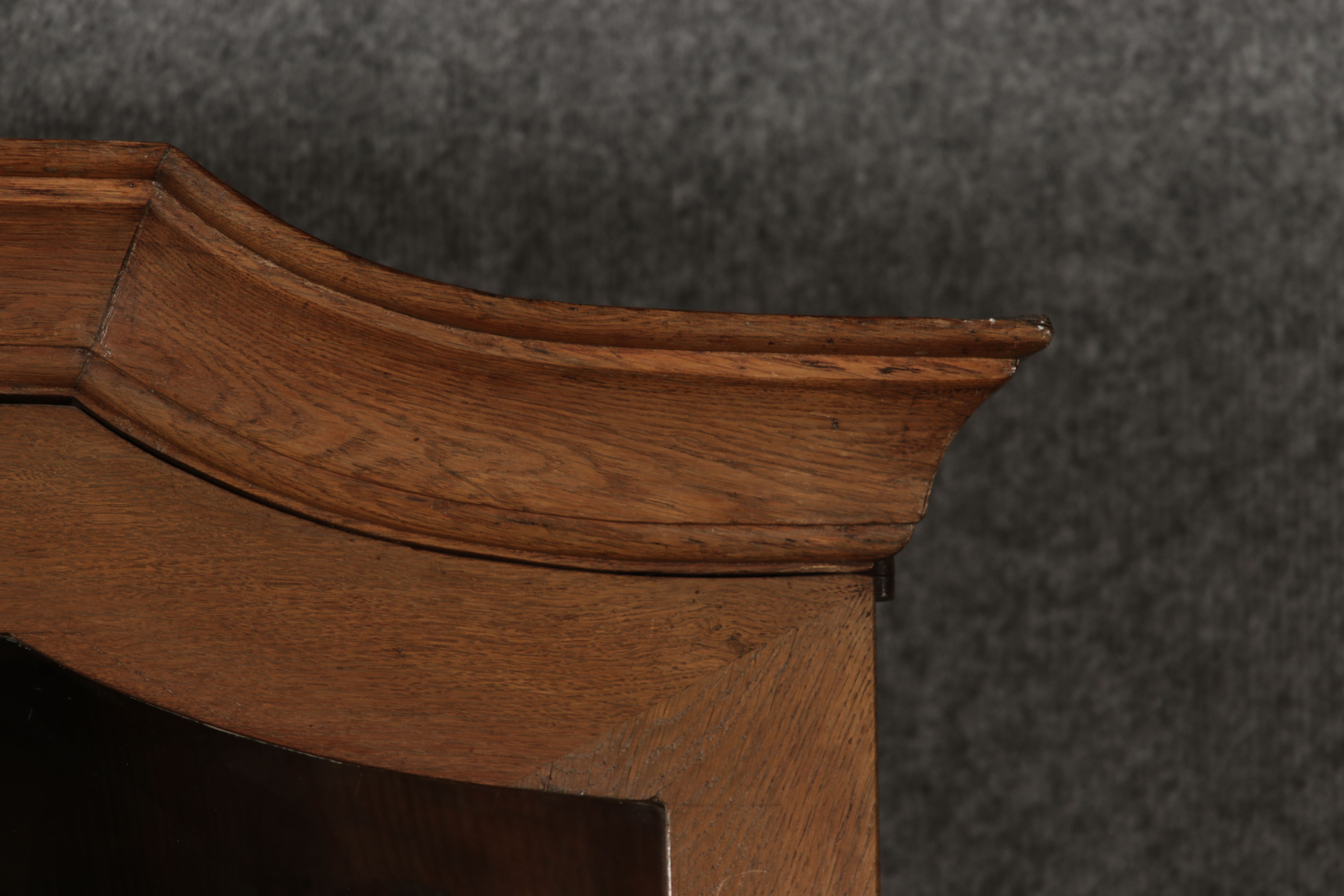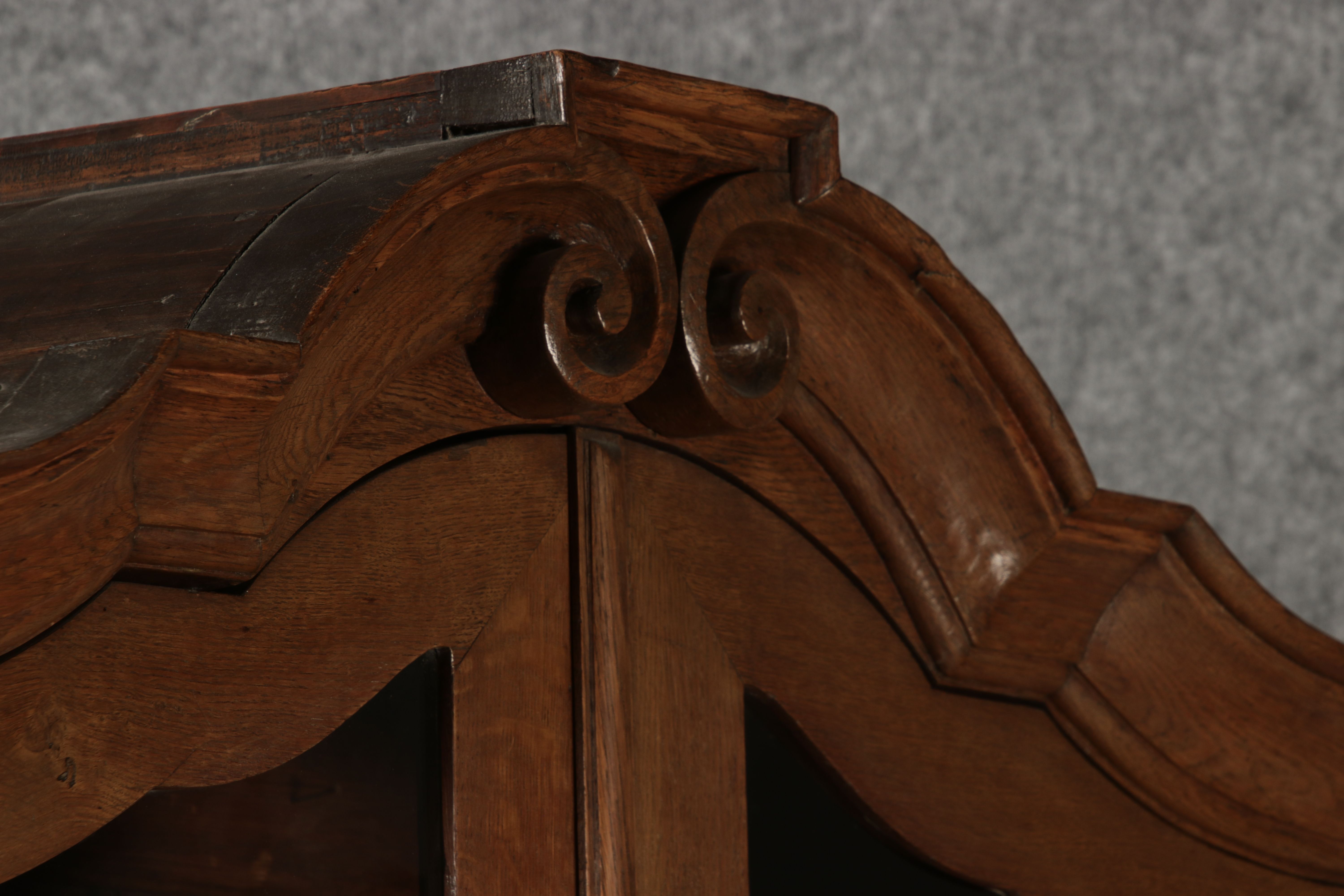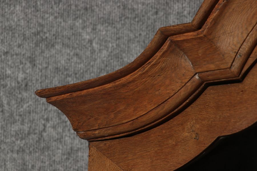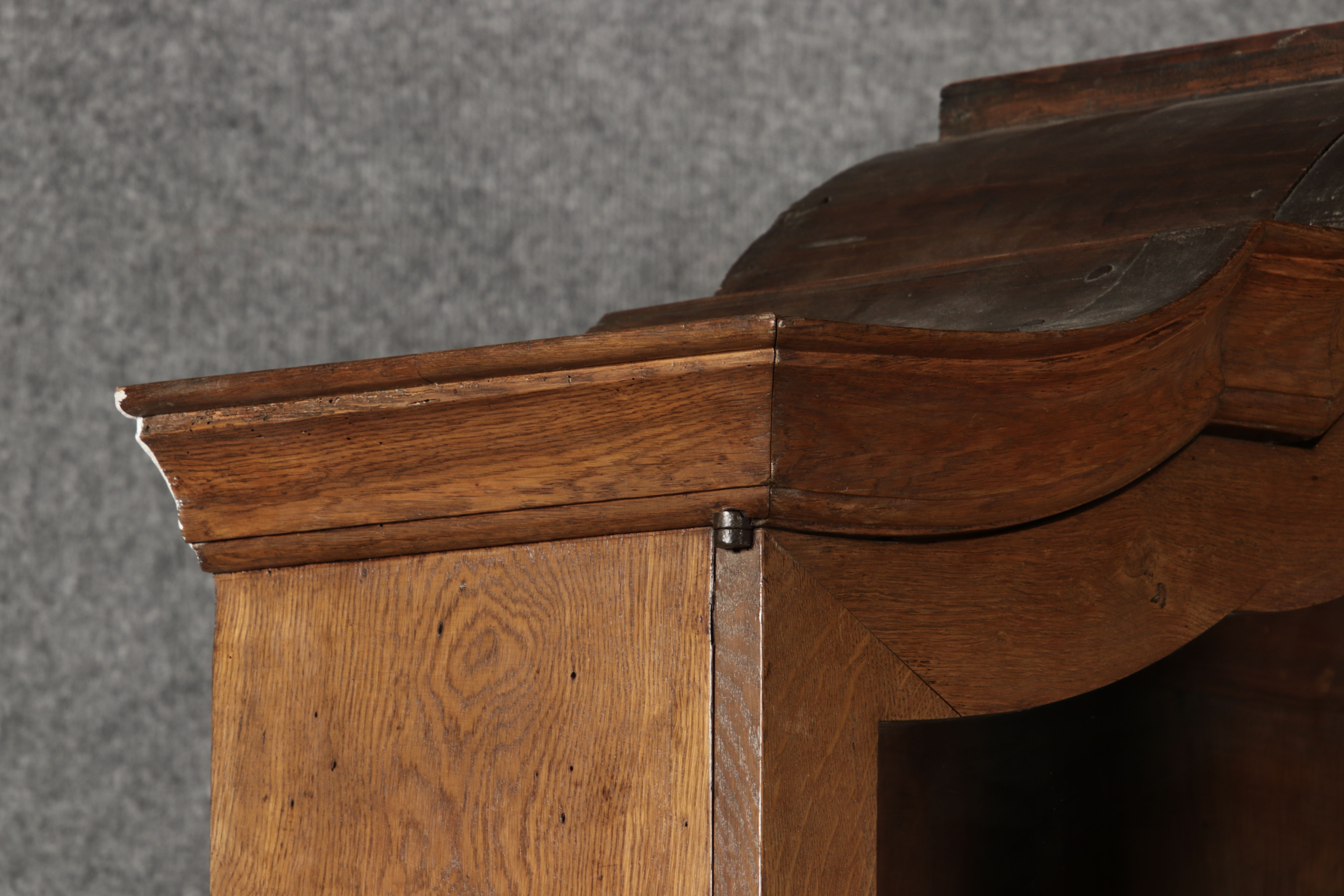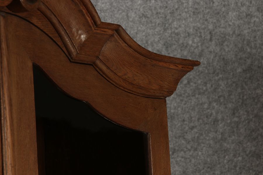 Beschreibung/description: Antiker Spätbarock Sekretär Eichenholz 18 Jh. mit Vitrinen OberteilDieser Sekretär im Stil des Spätbarock besticht durch seine elegante antike Formgebung und die Verwendung von massivem Eichenholz. Das Stück vereint kunstvolle Schnitzereien und praktische Funktionalität, typisch für Möbel aus der Mitte des 18. Jahrhunderts. Seine geschwungenen Linien und die harmonische Gestaltung der Oberflächen machen ihn zu einem edlen Möbelstück, das in jeder Einrichtung einen besonderen Platz finden wird. Material und VerarbeitungGefertigt aus massivem und furnierten Eichenholz, überzeugt dieser Sekretär durch seine charakteristische, natürliche Holzmaserung. Das Eichenholz hat über die Jahre eine ansprechende Patina entwickelt, die seinen antiken Charme unterstreicht. Die geschwungenen Fronten und Seitenwände spiegeln den Einfluss des Barock breiter, mit weichen Linien und organischen Formen, die dem Möbelstück seine anmutige Präsenz verleihen. Design und AufbauDieser Sekretär kombiniert die Funktionalität eines Schranks mit einem praktischen Schreibbereich: