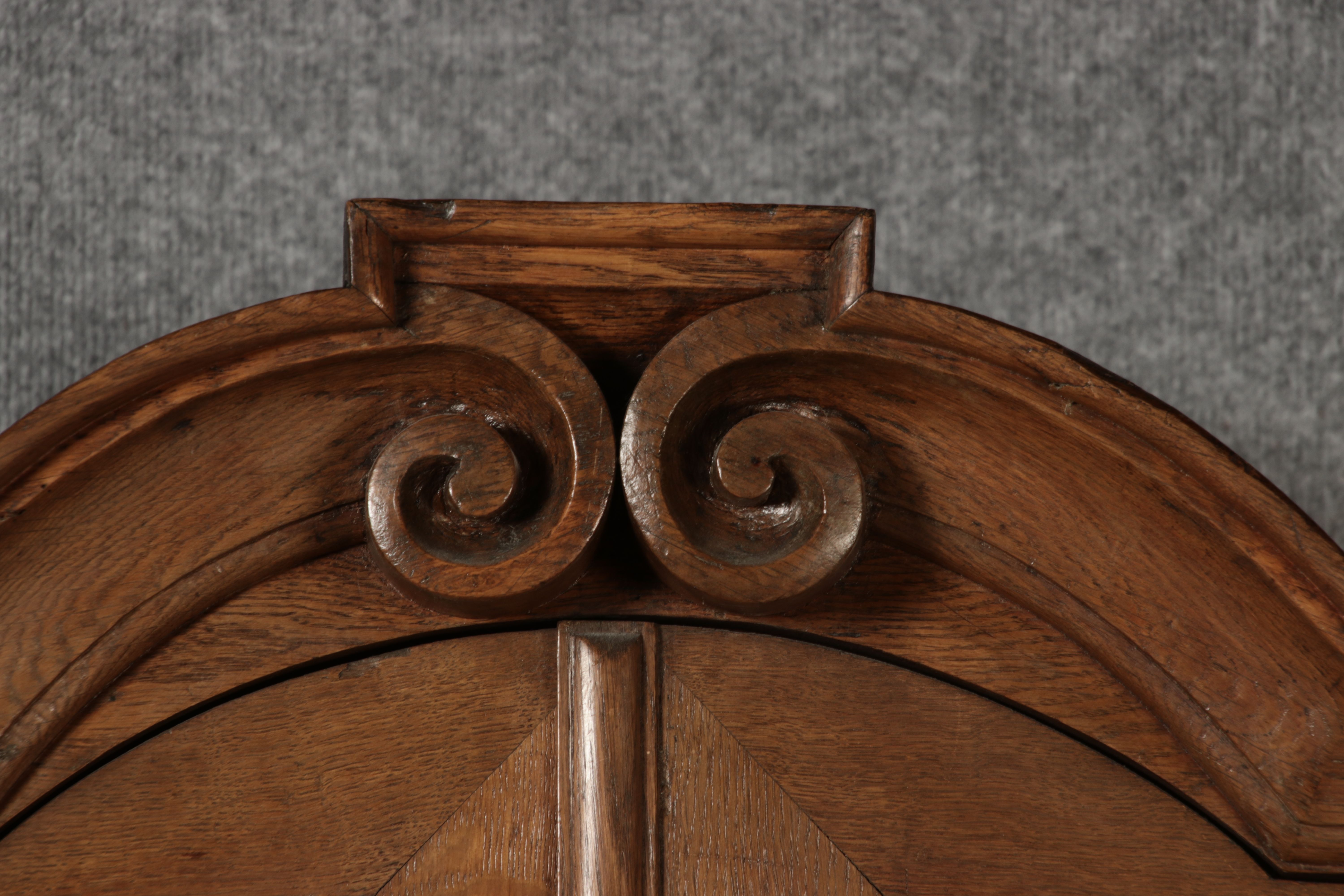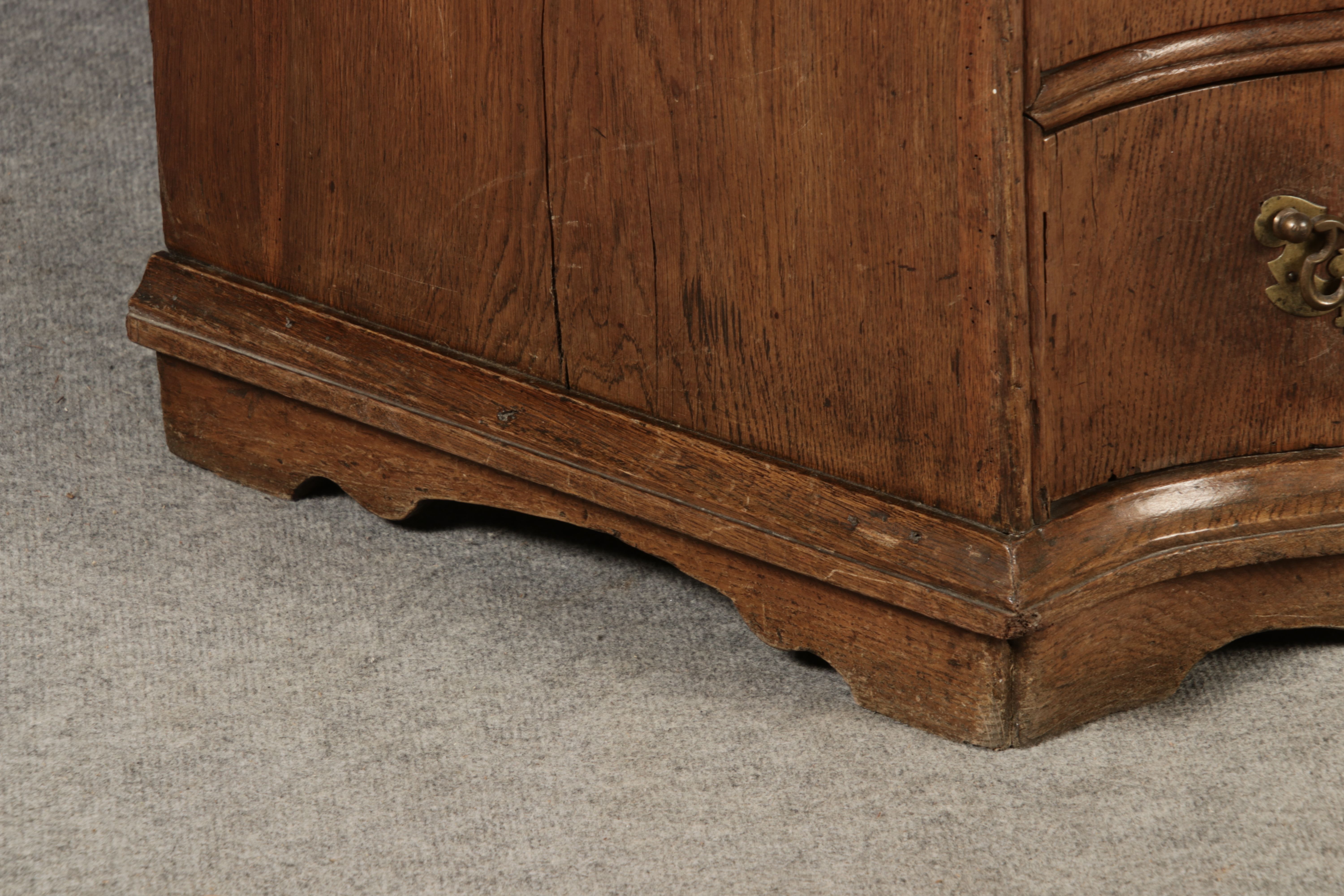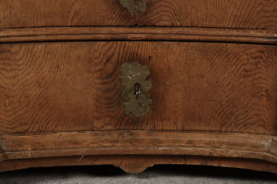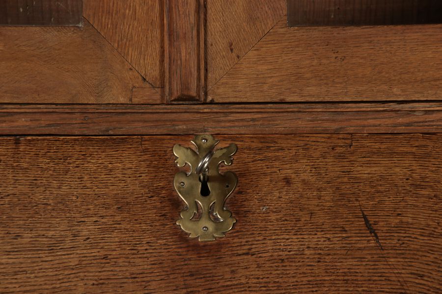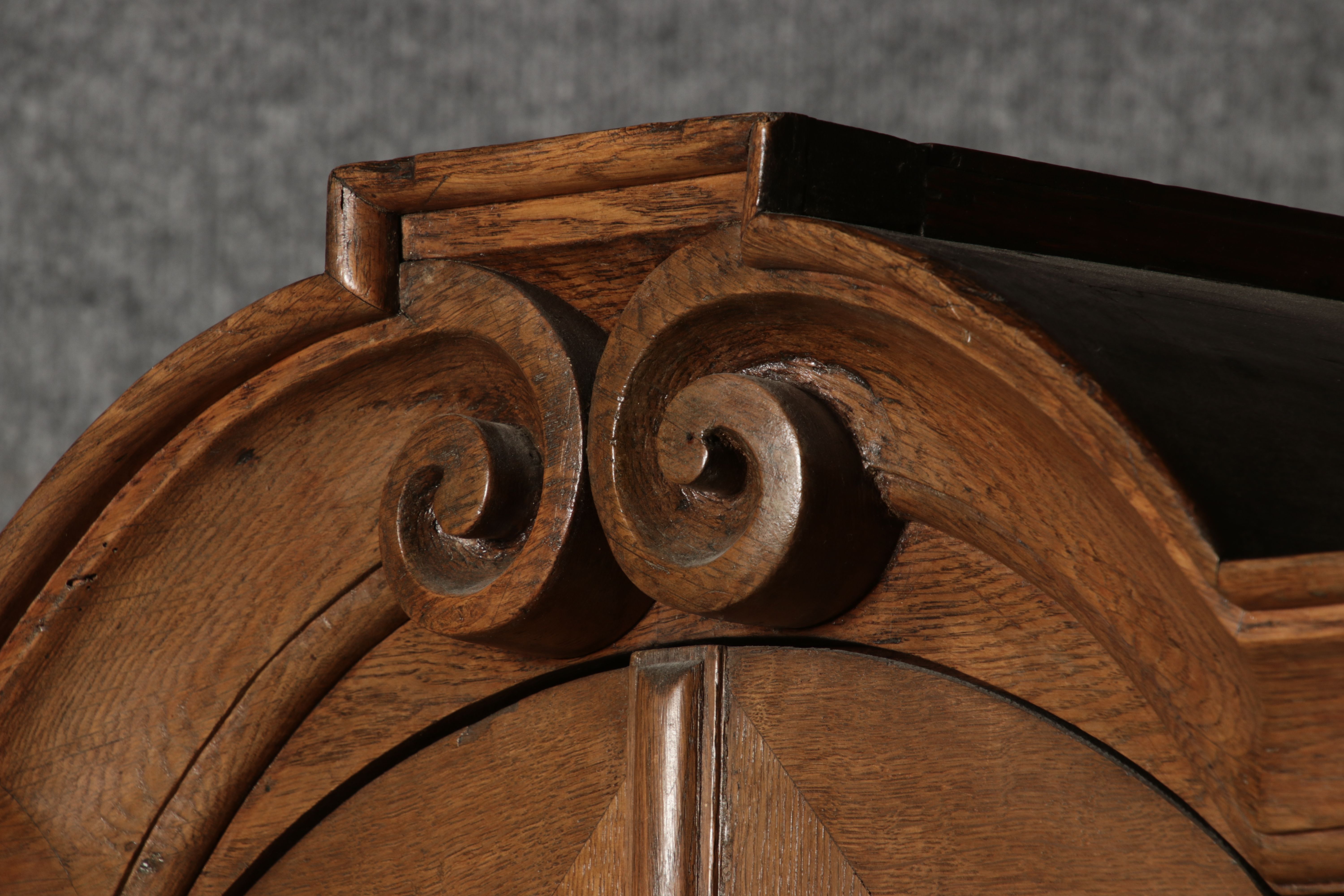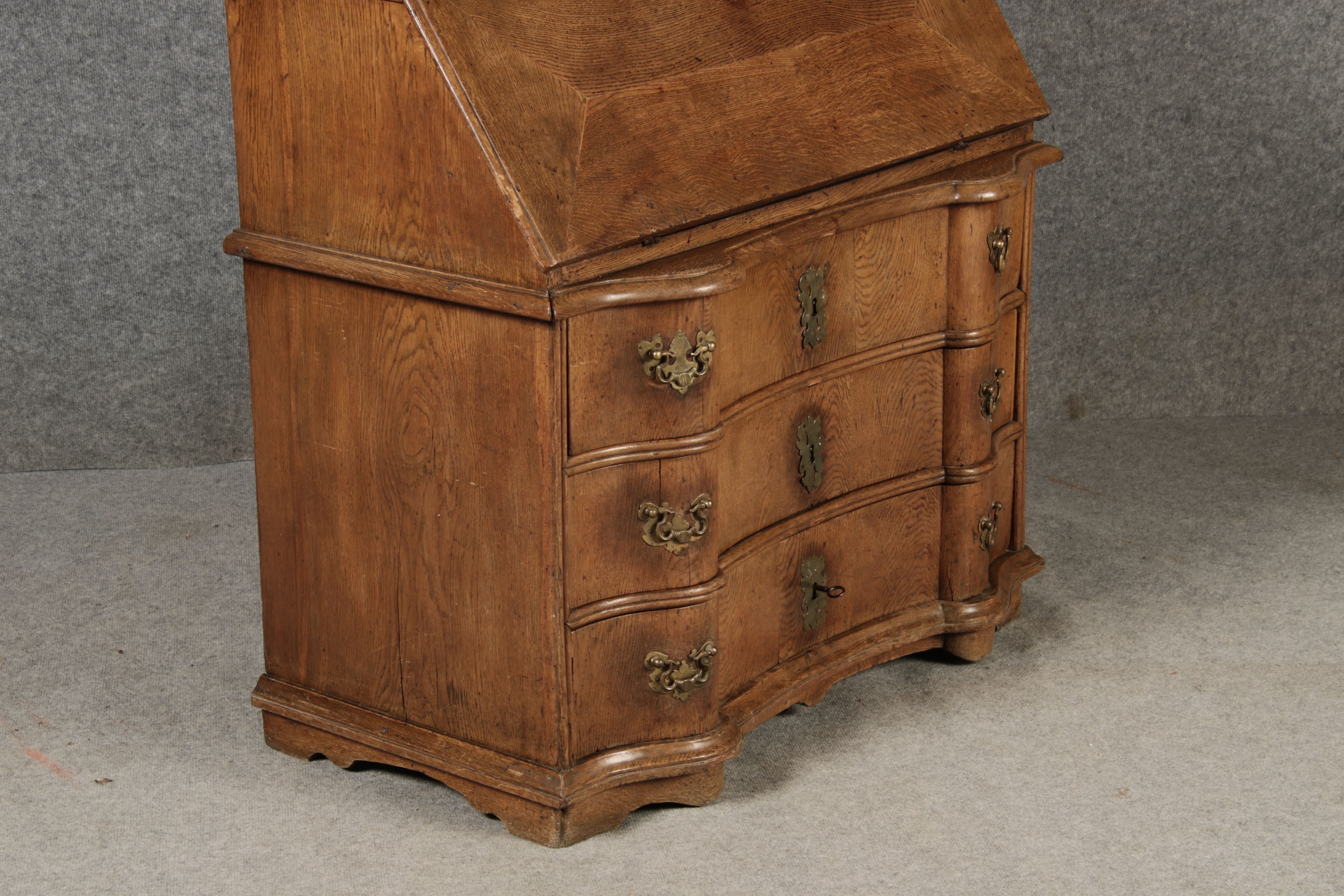 Beschreibung/description: Antiker Spätbarock Sekretär Eichenholz 18 Jh. mit Vitrinen OberteilDieser Sekretär im Stil des Spätbarock besticht durch seine elegante antike Formgebung und die Verwendung von massivem Eichenholz. Das Stück vereint kunstvolle Schnitzereien und praktische Funktionalität, typisch für Möbel aus der Mitte des 18. Jahrhunderts. Seine geschwungenen Linien und die harmonische Gestaltung der Oberflächen machen ihn zu einem edlen Möbelstück, das in jeder Einrichtung einen besonderen Platz finden wird. Material und VerarbeitungGefertigt aus massivem und furnierten Eichenholz, überzeugt dieser Sekretär durch seine charakteristische, natürliche Holzmaserung. Das Eichenholz hat über die Jahre eine ansprechende Patina entwickelt, die seinen antiken Charme unterstreicht. Die geschwungenen Fronten und Seitenwände spiegeln den Einfluss des Barock breiter, mit weichen Linien und organischen Formen, die dem Möbelstück seine anmutige Präsenz verleihen. Design und AufbauDieser Sekretär kombiniert die Funktionalität eines Schranks mit einem praktischen Schreibbereich: