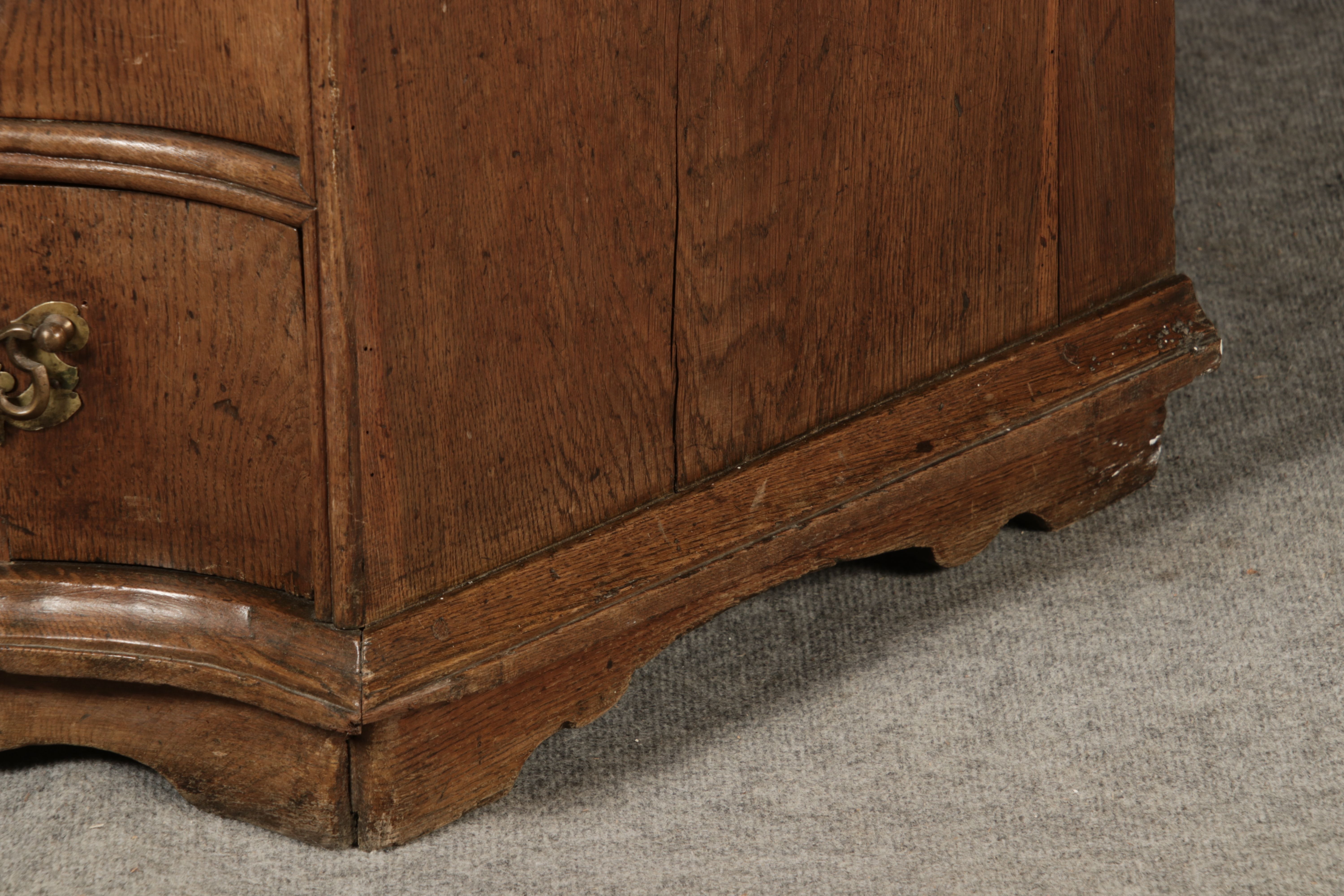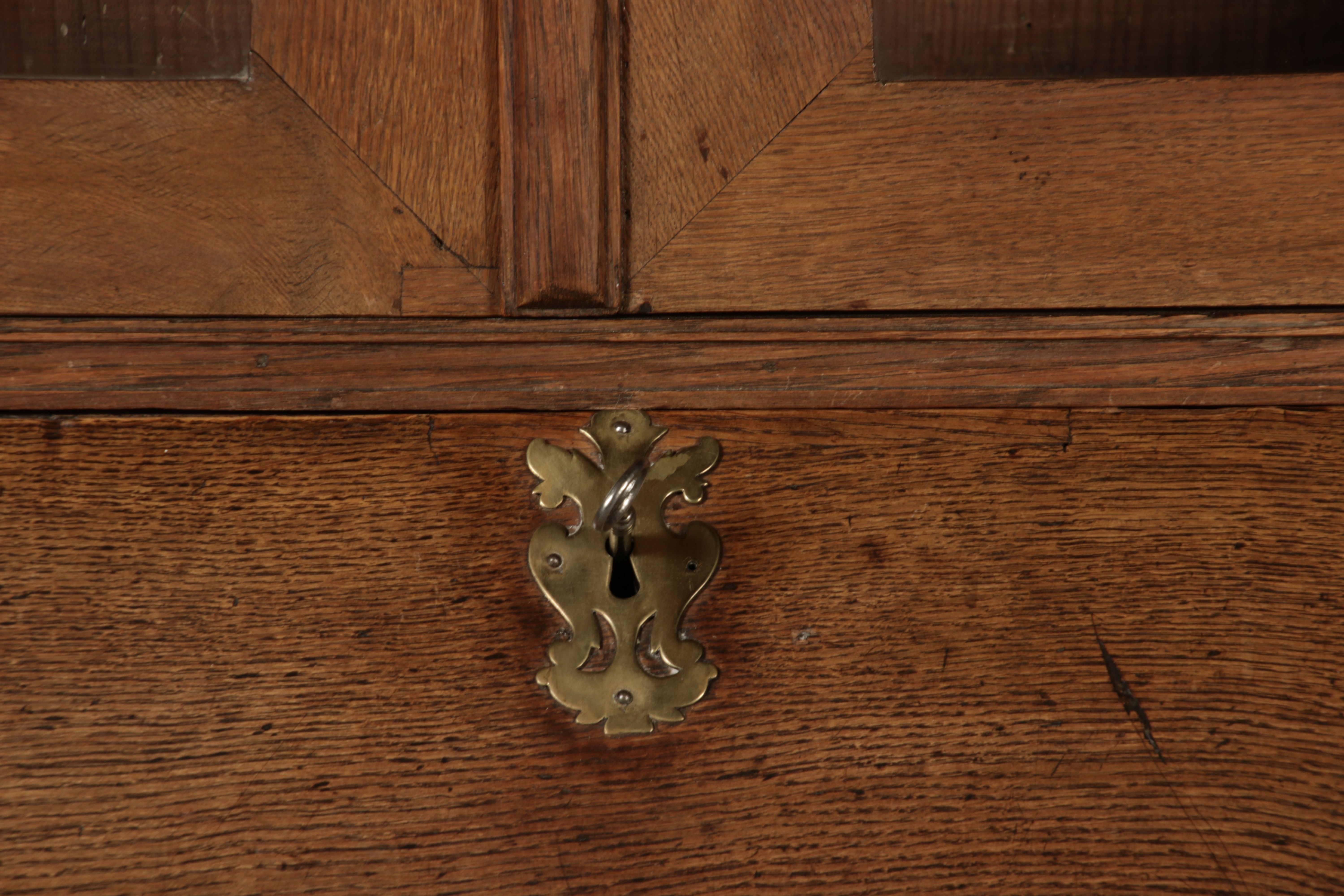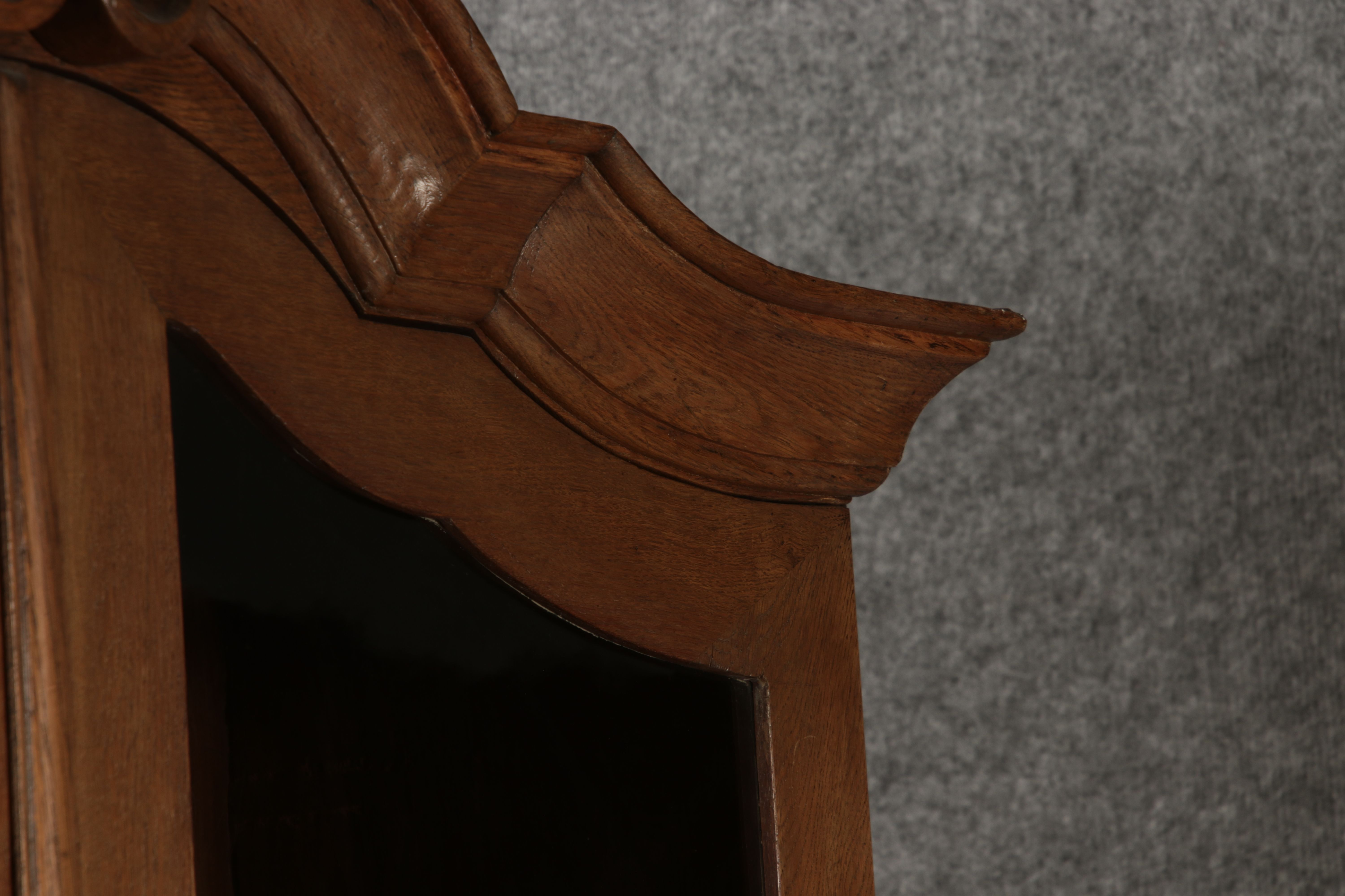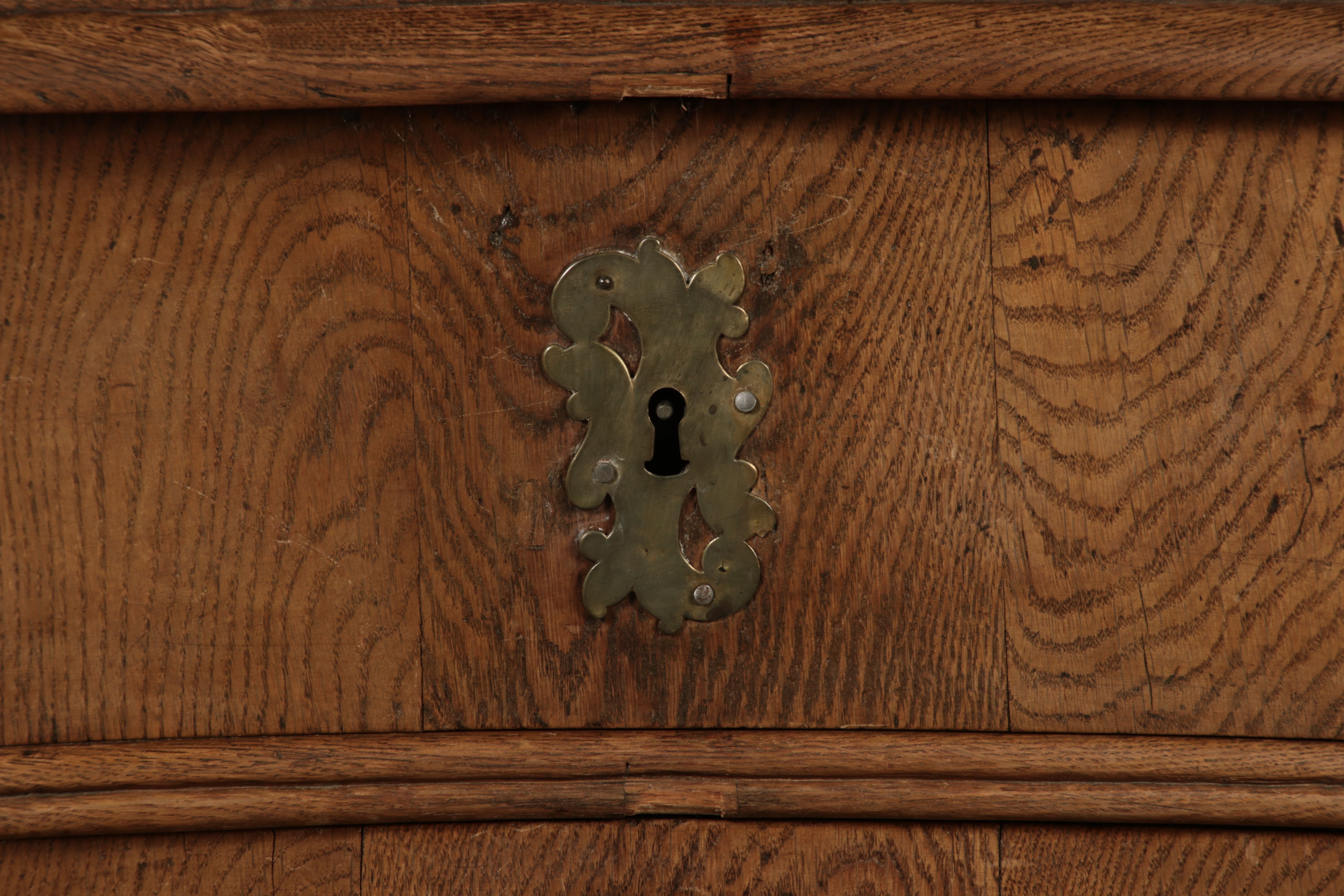 Beschreibung/description: Antiker Spätbarock Sekretär Eichenholz 18 Jh. mit Vitrinen OberteilDieser Sekretär im Stil des Spätbarock besticht durch seine elegante antike Formgebung und die Verwendung von massivem Eichenholz. Das Stück vereint kunstvolle Schnitzereien und praktische Funktionalität, typisch für Möbel aus der Mitte des 18. Jahrhunderts. Seine geschwungenen Linien und die harmonische Gestaltung der Oberflächen machen ihn zu einem edlen Möbelstück, das in jeder Einrichtung einen besonderen Platz finden wird. Material und VerarbeitungGefertigt aus massivem und furnierten Eichenholz, überzeugt dieser Sekretär durch seine charakteristische, natürliche Holzmaserung. Das Eichenholz hat über die Jahre eine ansprechende Patina entwickelt, die seinen antiken Charme unterstreicht. Die geschwungenen Fronten und Seitenwände spiegeln den Einfluss des Barock breiter, mit weichen Linien und organischen Formen, die dem Möbelstück seine anmutige Präsenz verleihen. Design und AufbauDieser Sekretär kombiniert die Funktionalität eines Schranks mit einem praktischen Schreibbereich: