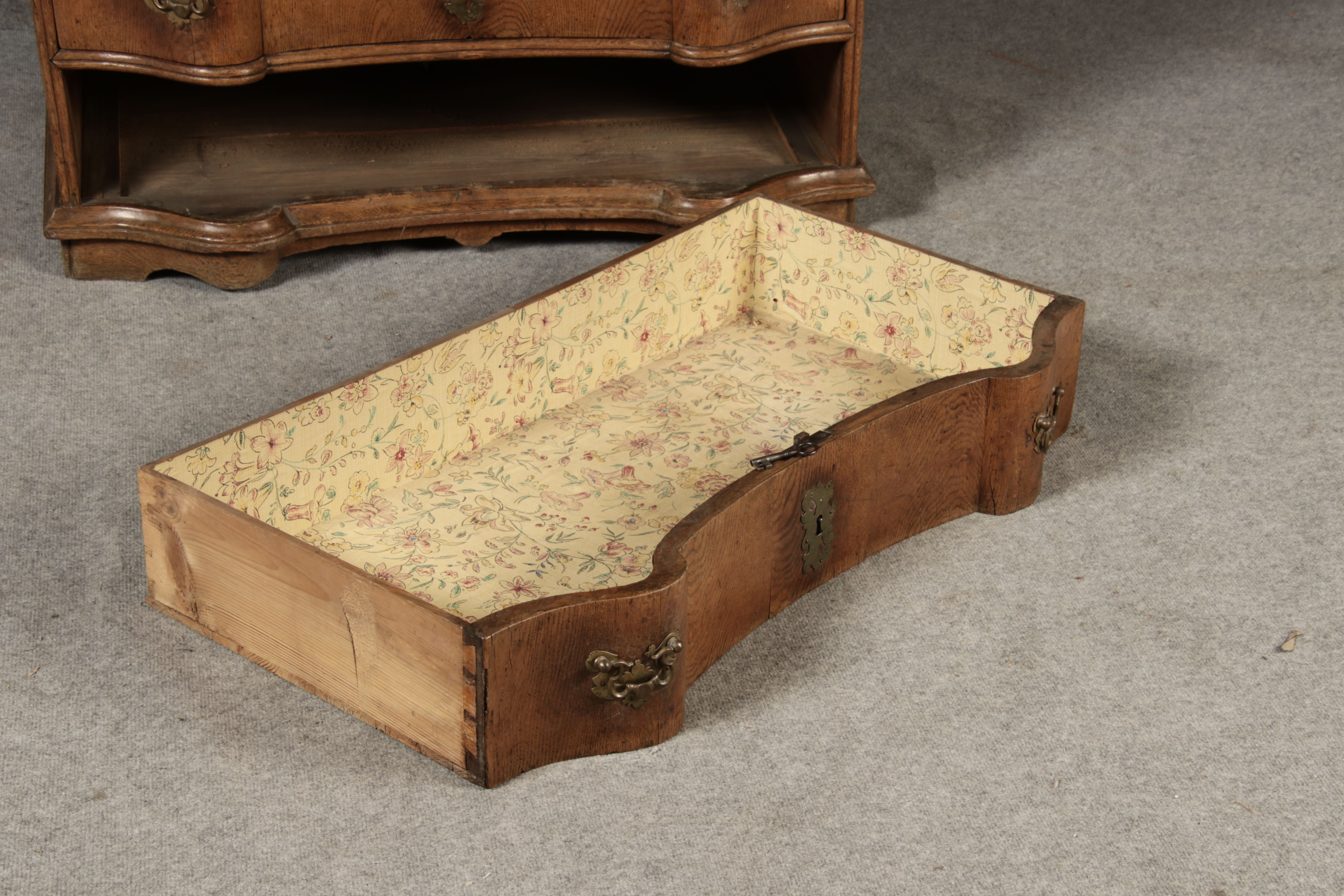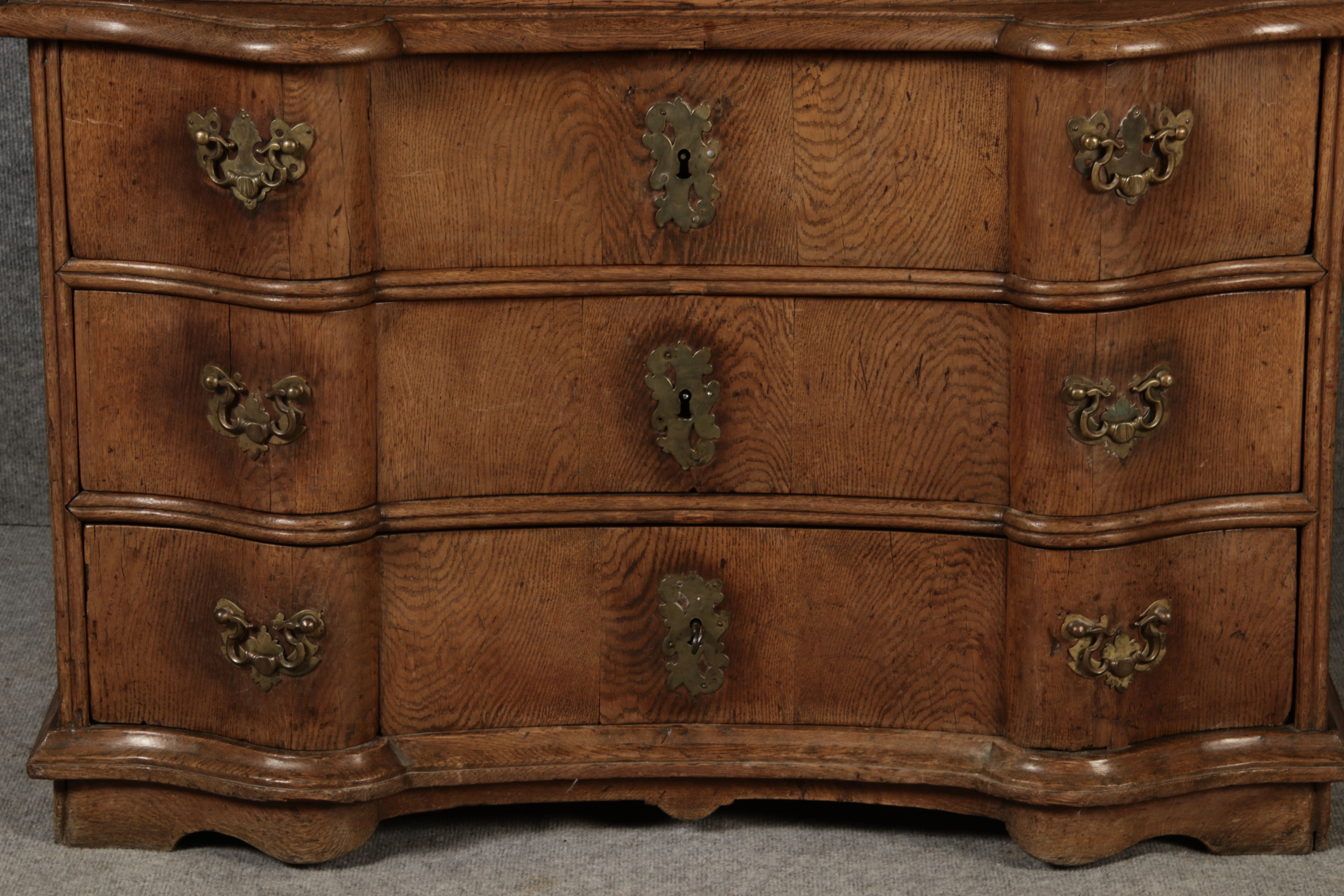 MessingbeschlägeDie Messingbeschläge an Türen und Schubladen sind kunstvoll gearbeitet und im typischen Stil des Spätbarocks gestaltet. Sie ergänzen das edle Design des Sekretärs und tragen zur luxuriösen Anmutung bei. Die Beschläge sind in gutem Zustand und zeigen nur minimale Gebrauchsspuren, was die historische Authentizität des Möbelstücks unterstreicht. ZustandDer Sekretär befindet sich in einem guten alt Restaurierten Zustand, insbesondere in Anbetracht seines Alters. Die Holzkonstruktion ist stabil und weist keine größeren Beschädigungen auf. Die Scharniere und Schubladenmechanismen funktionieren einwandfrei. Es gibt nur minimale altersbedingte Gebrauchsspuren, die dem Stück seinen authentischen Charakter verleihen. Stil und EpocheDieses Möbelstück stammt aus der Spätbarock-Zeit und zeigt deutlich die für diese Epoche typischen Stilmerkmale. Die geschwungenen Linien, die opulente Form der Schubladenfronten sowie die kunstvoll gearbeiteten Verzierungen machen diesen Sekretär zu einem beeindruckenden Beispiel der Barock-Möbel. FazitDieser antike Sekretär ist nicht nur ein stilvolles Möbelstück, sondern auch ein funktionaler Arbeitsplatz mit historischer Bedeutung. Seine geschwungenen Formen, die präzisen Schnitzereien und die kunstvollen Messingbeschläge machen ihn zu einem wahren Schmuckstück, das in jedem Raum einen besonderen Platz einnehmen wird. Ideal für Sammler antiker Möbel oder Liebhaber klassischer Inneneinrichtung ArtikelNummer /number: sek125