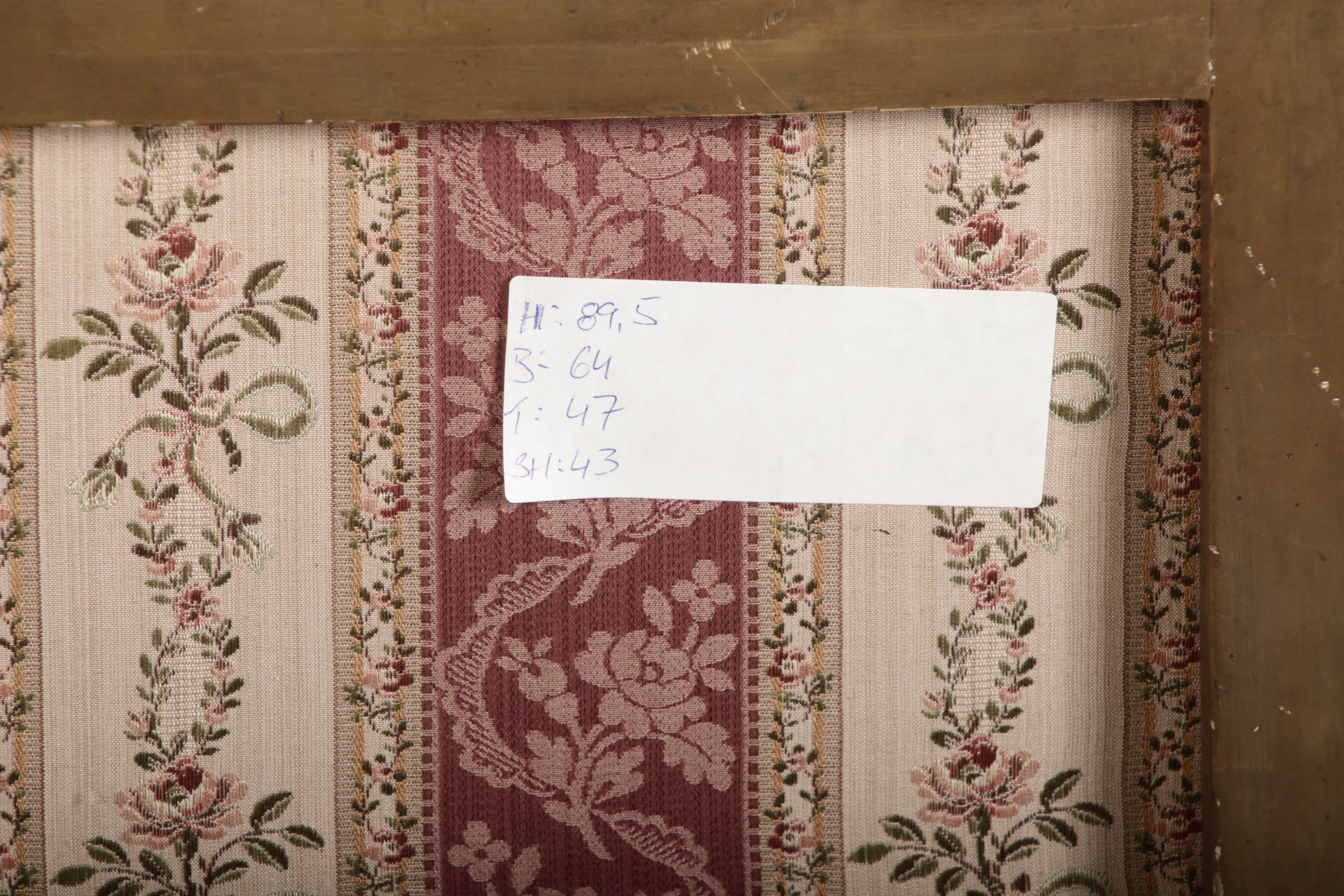 Alter mit Gebrauchsspuren. Die Polsterung hat einen weichen Federkern und der Polsterstoff hat einen guten Zustand. Das Gestell ist fest und weist leichte Gebrauchsspuren aus in Form von Farbfehlstellen