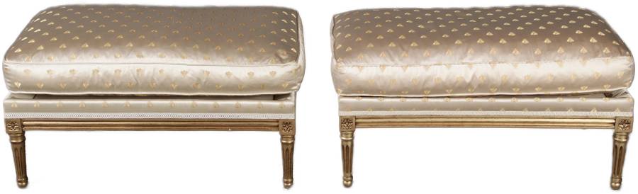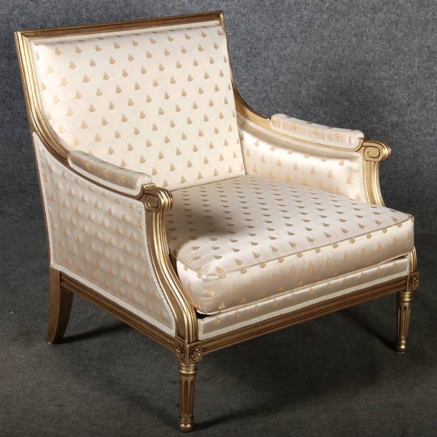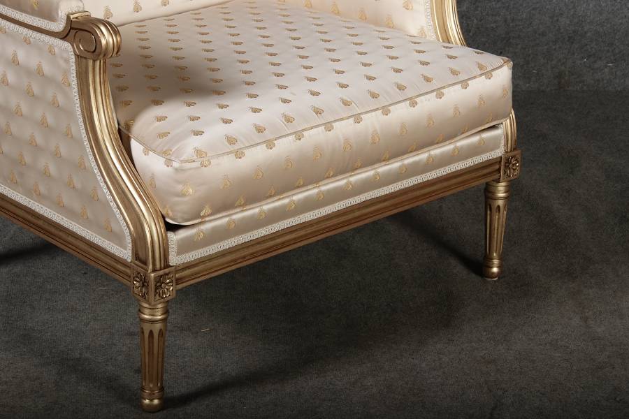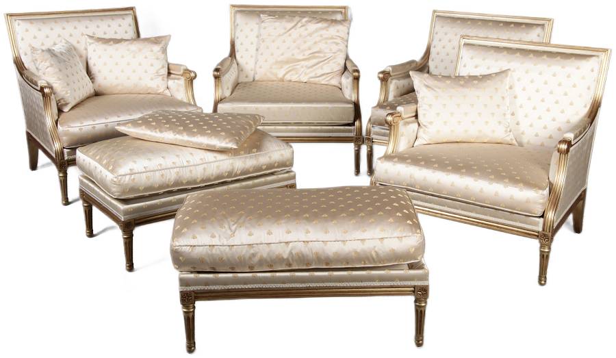 Beschreibung/description: Exklusive Sitzgruppe im Louis-XVI-Stil – Pierre Counot Blandin, Frankreich Diese außergewöhnliche, gepolsterte Sitzgruppe besteht aus vier vergoldeten Bergères sowie zwei passenden Bänken und wurde von der renommierten französischen Manufaktur Pierre Counot Blandin gefertigt. Die Möbel sind im eleganten Louis-XVI-Stil gehalten und überzeugen durch ihre klassische Linienführung, hochwertige Materialien und exzellente handwerkliche Verarbeitung. Die Sitzgruppe befindet sich insgesamt in sehr gutem Zustand. Lediglich minimale, Flecken sind vorhanden, siehe Bilder. Die Bezüge sind abziehbar und waschbar, was sowohl Pflegeleichtigkeit als auch Alltagstauglichkeit gewährleistet. Die Polsterung der Kissen von den Sitzbänken sowie die Kissen – vermutlich mit Daunenfedern gefüllt – sorgt für außergewöhnlichen Sitzkomfort. Aufgrund der Ausführung ist davon auszugehen, dass es sich um eine Sonderanfertigung handelt, da diese Sitzgruppe in dieser Form nicht im aktuellen Katalog von Counot Blandin gelistet ist. Vergleichbare Modelle sind jedoch im Herstellerkatalog zu finden. Bereits auf den ersten Blick wird deutlich, dass es sich um handgefertigte Möbel von höchster Qualität handelt. Die Sitzgruppe stammt von