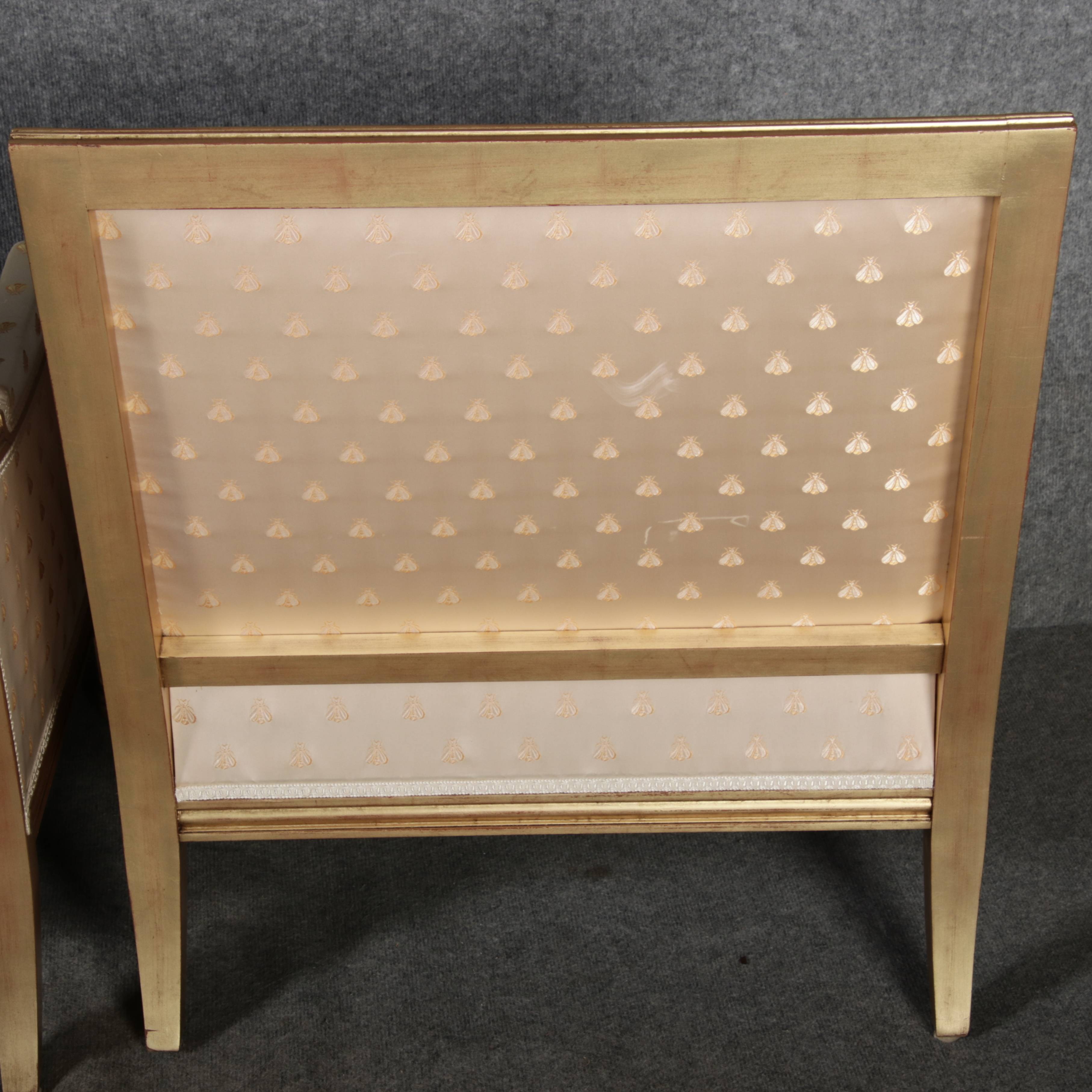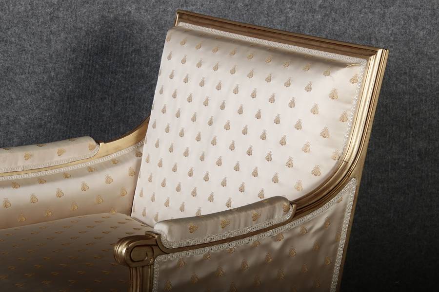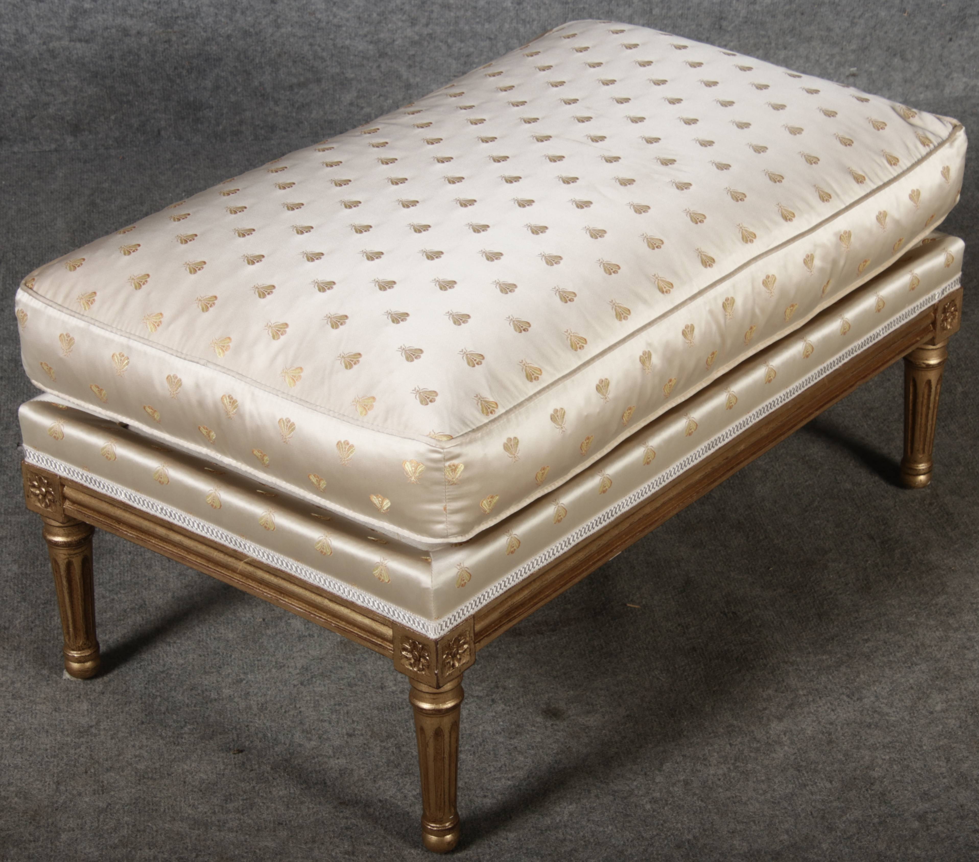 Exklusive Sitzgruppe im Louis-XVI-Stil – Pierre Counot Blandin, Frankreich Diese außergewöhnliche, gepolsterte Sitzgruppe besteht aus vier vergoldeten Bergères sowie zwei passenden Bänken und wurde von der renommierten französischen Manufaktur Pierre Counot Blandin gefertigt. Die Möbel sind im eleganten Louis-XVI-Stil gehalten und überzeugen durch ihre klassische Linienführung, hochwertige Materialien und exzellente handwerkliche Verarbeitung. Die Sitzgruppe befindet sich insgesamt in sehr gutem Zustand. Lediglich minimale, Flecken sind vorhanden, siehe Bilder. Die Bezüge sind abziehbar und waschbar, was sowohl Pflegeleichtigkeit als auch Alltagstauglichkeit gewährleistet. Die Polsterung der Kissen von den Sitzbänken sowie die Kissen – vermutlich mit Daunenfedern gefüllt – sorgt für außergewöhnlichen Sitzkomfort. Aufgrund der Ausführung ist davon auszugehen, dass es sich um eine Sonderanfertigung handelt, da diese Sitzgruppe in dieser Form nicht im aktuellen Katalog von Counot Blandin gelistet ist. Vergleichbare Modelle sind jedoch im Herstellerkatalog zu finden. Bereits auf den ersten Blick wird deutlich, dass es sich um handgefertigte Möbel von höchster Qualität handelt. Die Sitzgruppe stammt von