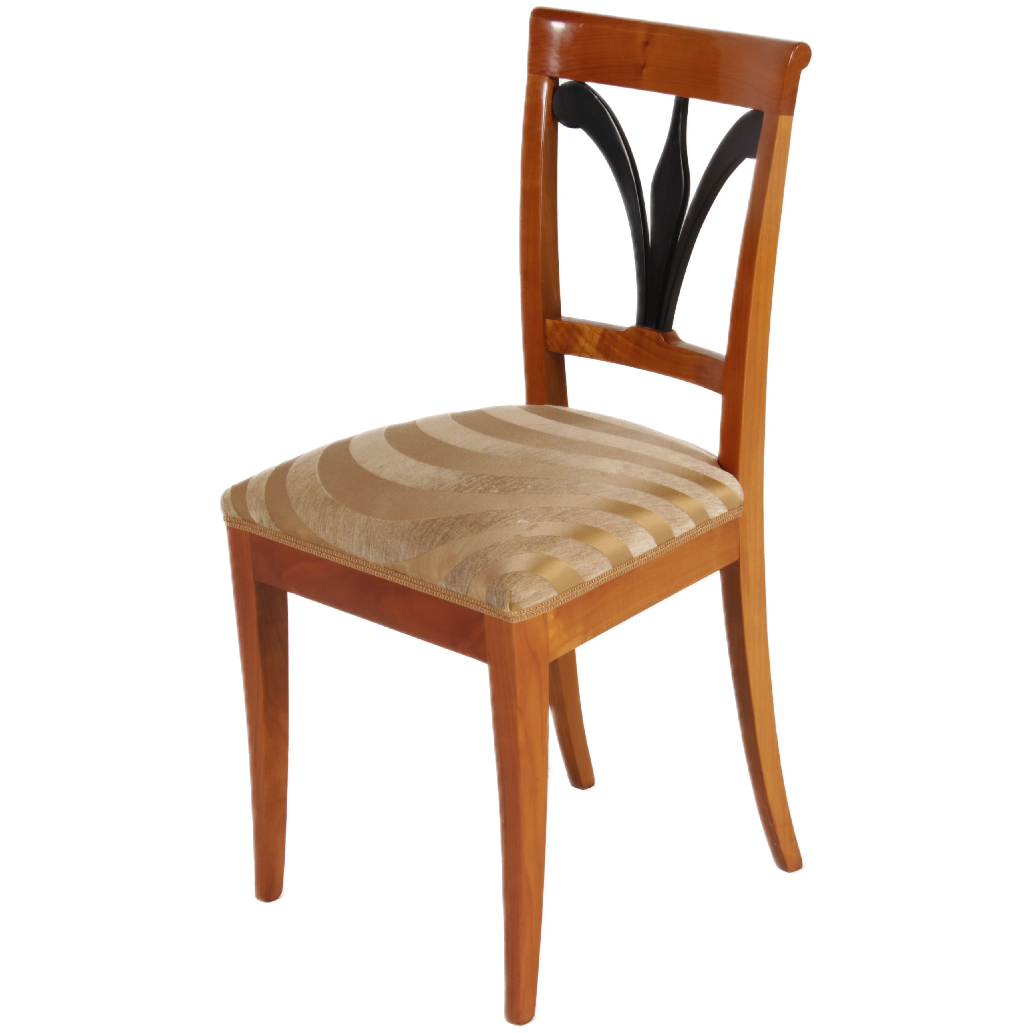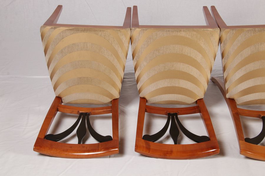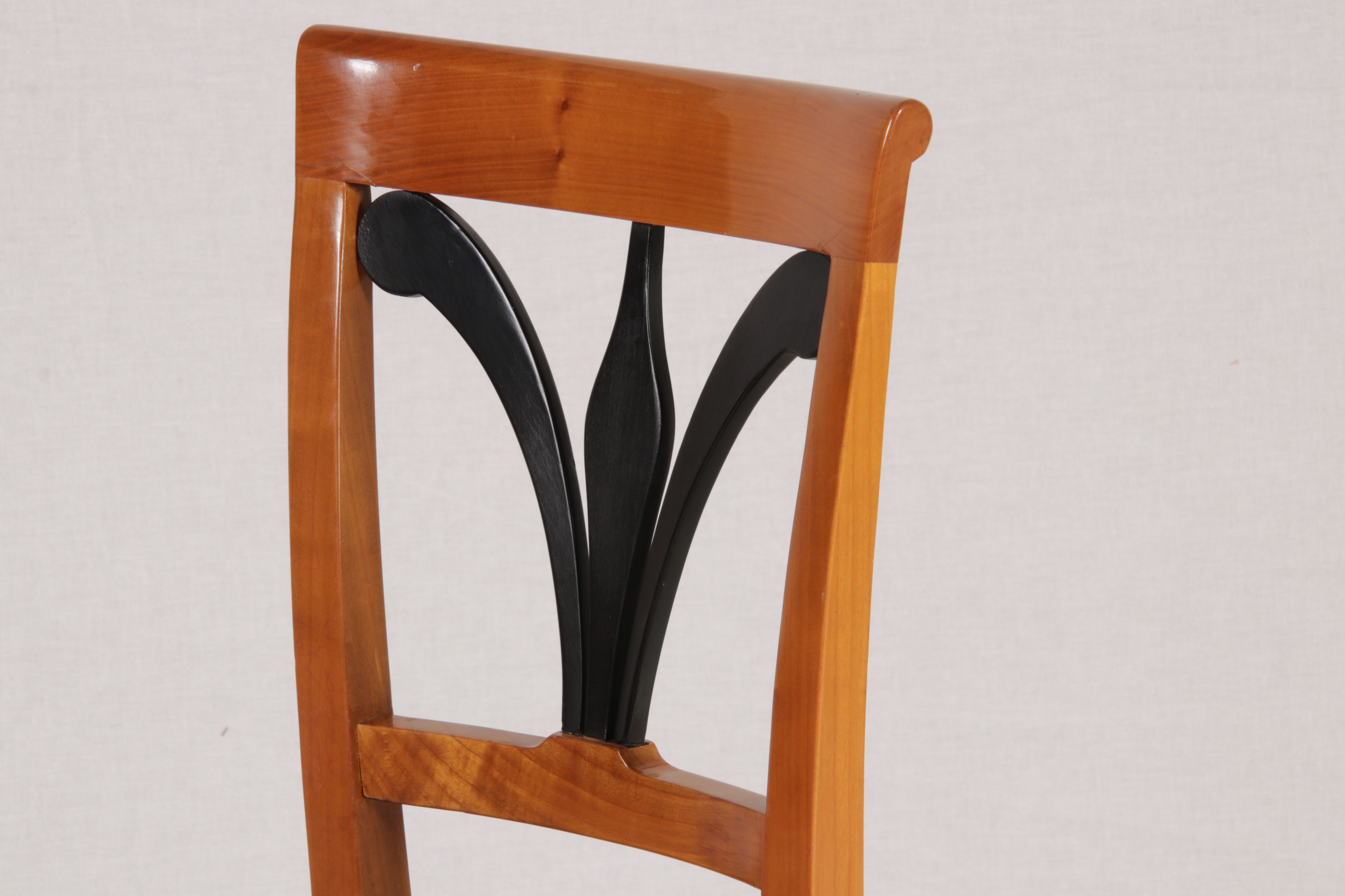 8 Antike Biedermeierstiel Stühle um 1920 Kirschbaum. Der Klassiker unter den Biedermeierstühlen. Die Stühle sind um 1920, aber ursprünglich ist der Stiel der Stühle 100 Jahre früher um 1820. |