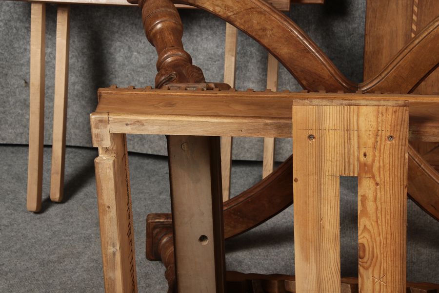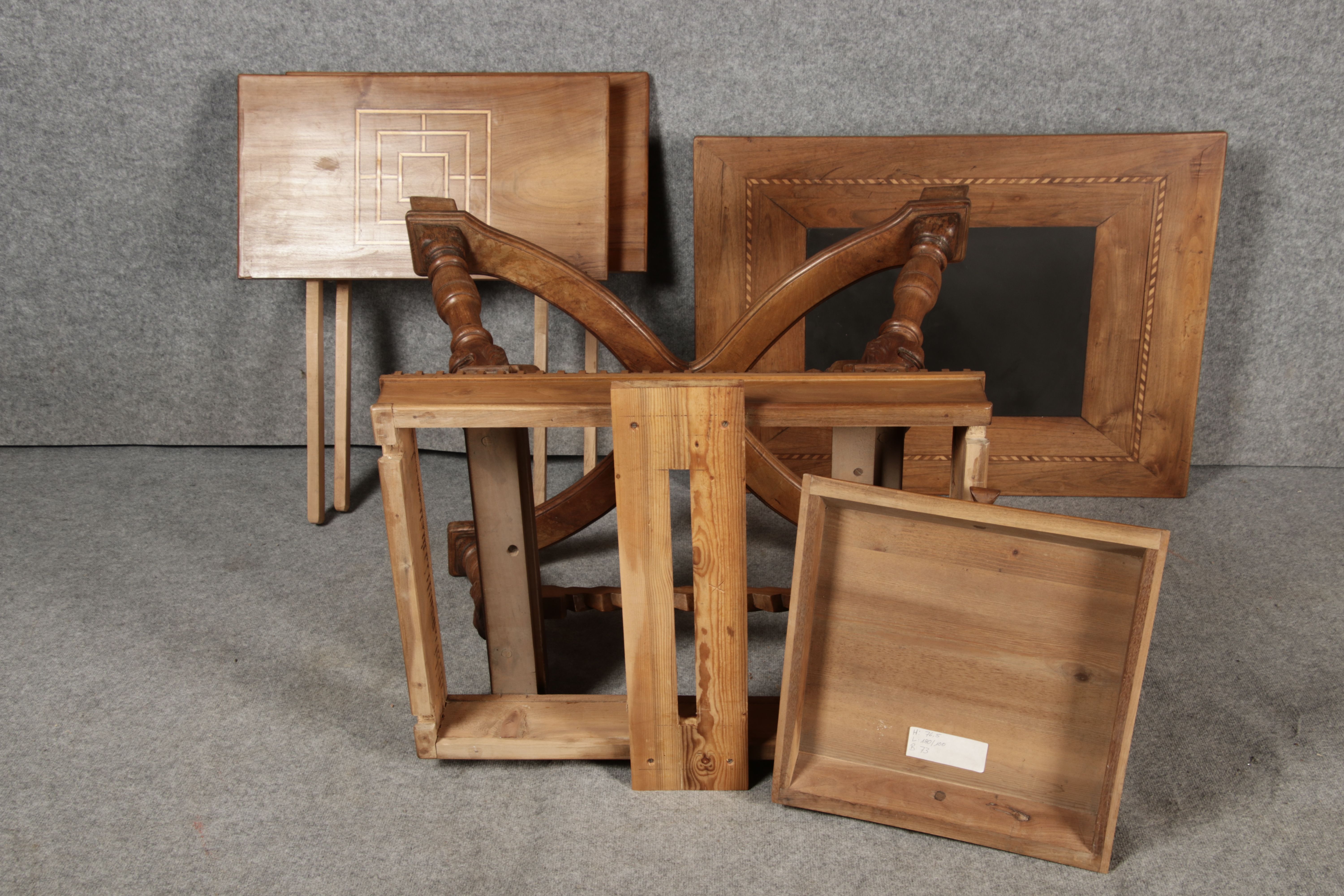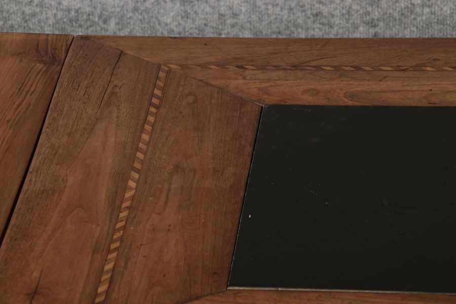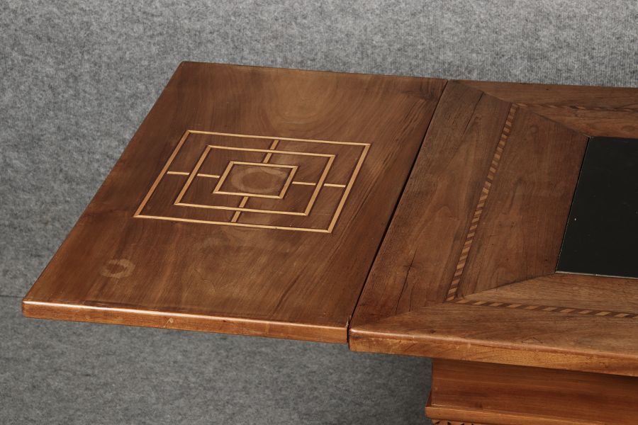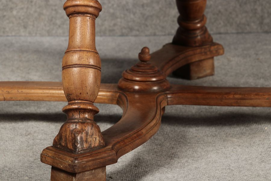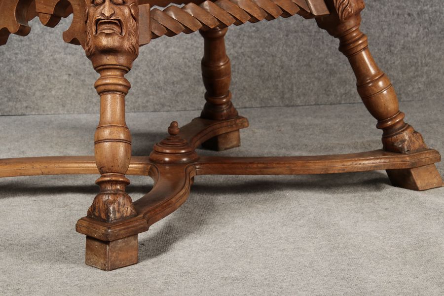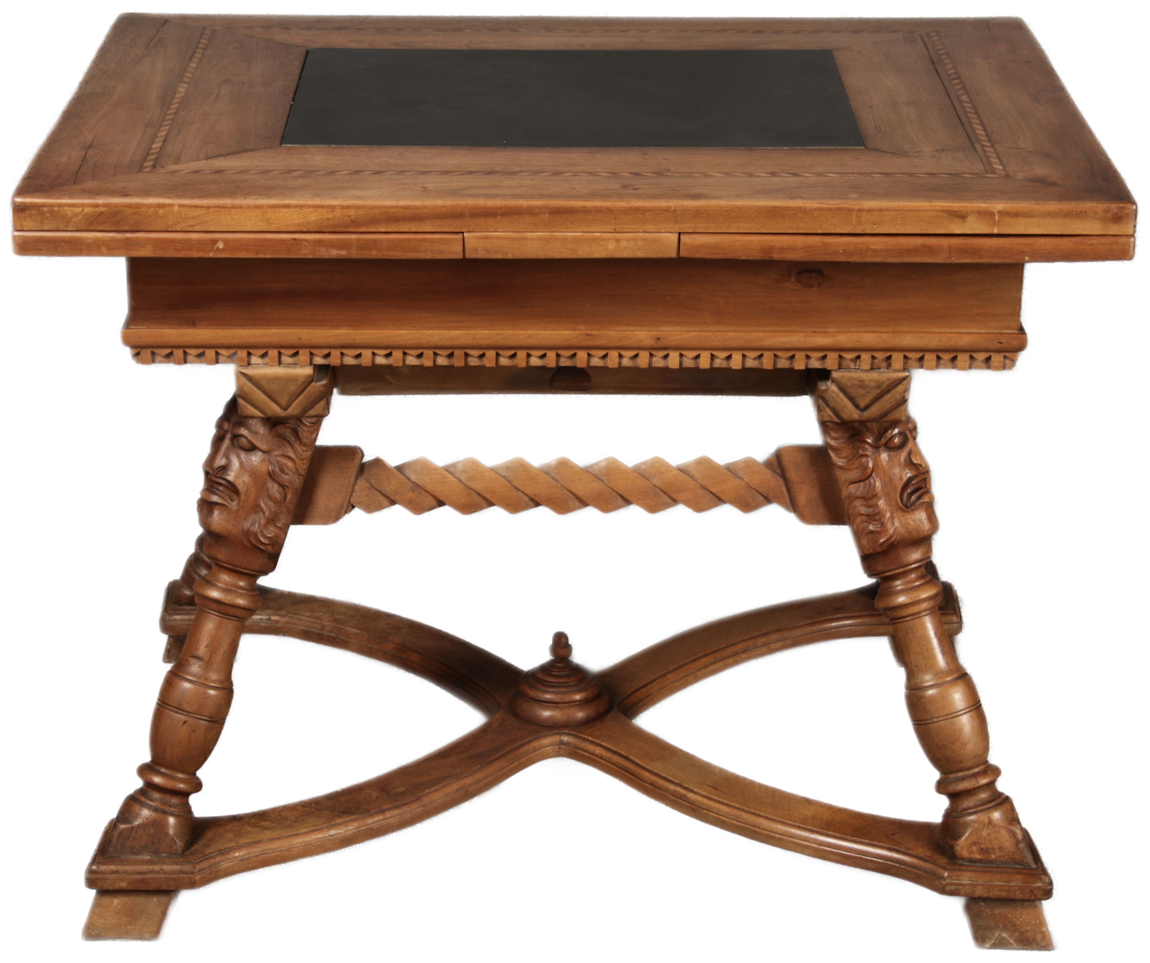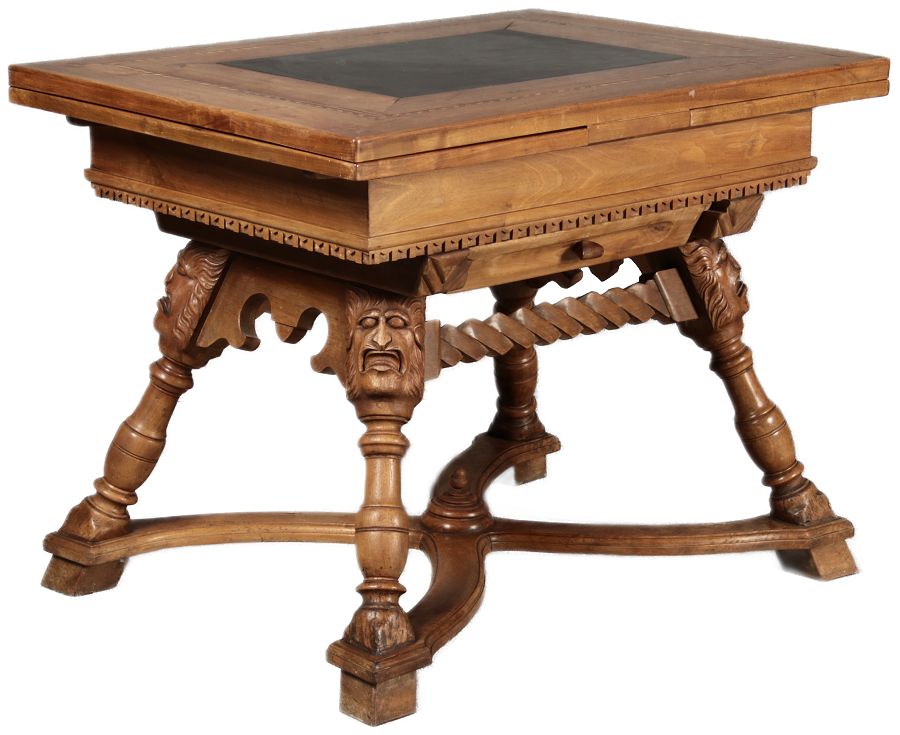 Beschreibung/description: Barocktisch, Nussbaum, Schieferplatte, Schweiz Dieser faszinierende Barocktisch aus der Schweiz besticht durch seine außergewöhnliche Verarbeitung und beeindruckende Details. Gefertigt aus massivem Nussbaumholz, kombiniert der Tisch die opulente Eleganz des Barocks mit praktischen Funktionen. Die zentrale Tischplatte ist mit einer eingelassenen Schieferplatte versehen, die dem Tisch einen besonderen funktionalen Wert verleiht. Die beiden seitlich Platte haben Einlegearbeit einmal als Schachbrettes und ein einmal als Mühlespiel. Die kunstvoll gedrechselten Tischbeine und das gekreuzte Untergestell spiegeln den opulenten Stil des Barocks wider. Besonders auffällig sind die handgeschnitzten Köpfe an den Beinen, die typisch für diese Epoche sind und dem Tisch eine imposante Ausstrahlung verleihen. Der verzierte Mittelsteg, der die Tischbeine verbindet, sorgt nicht nur für zusätzliche Stabilität, sondern unterstreicht auch die hohe Handwerkskunst, die in diesem Stück steckt Ein außergewöhnliches Möbelstück, das barocken
