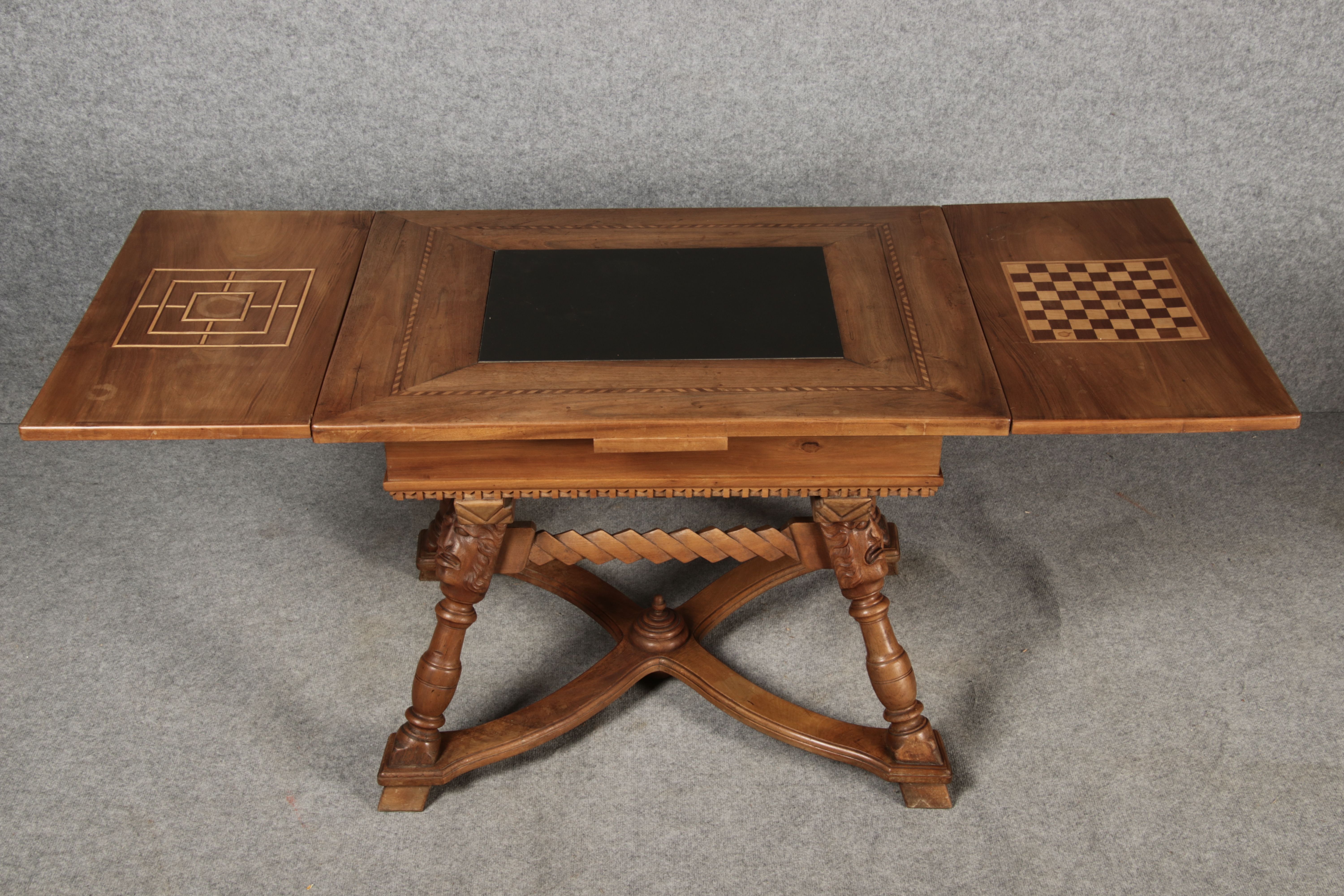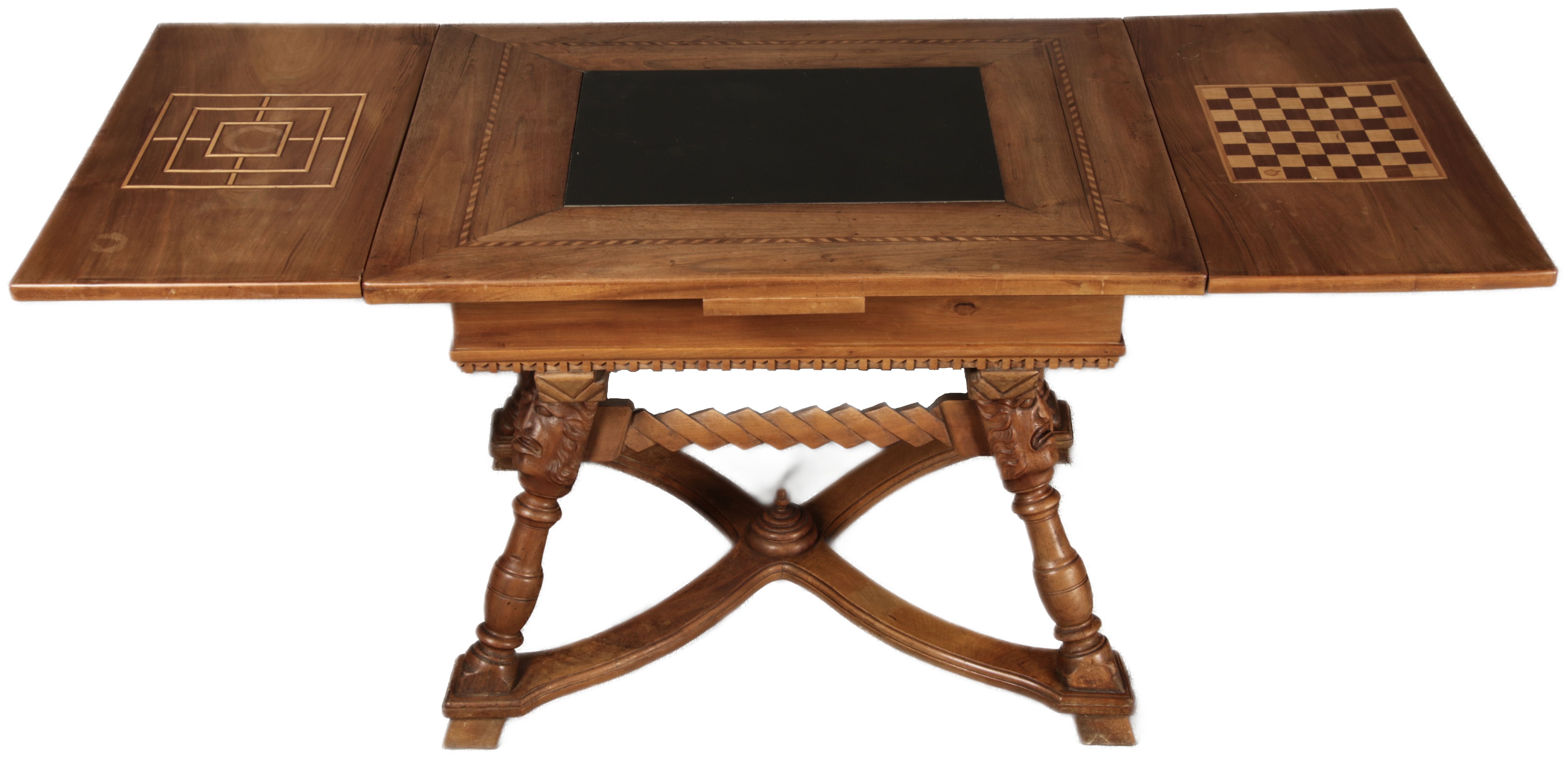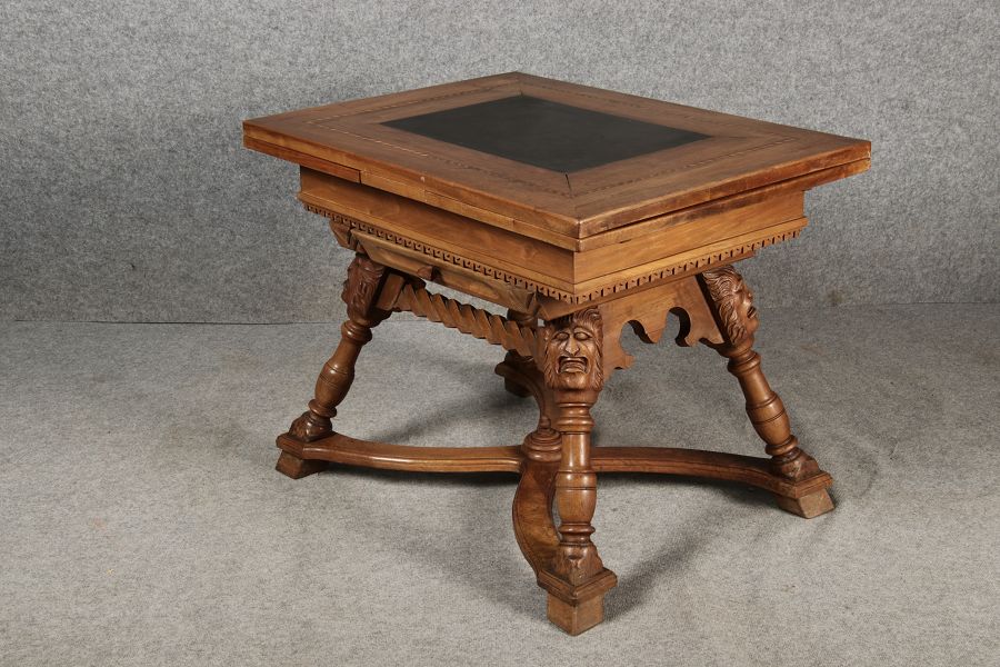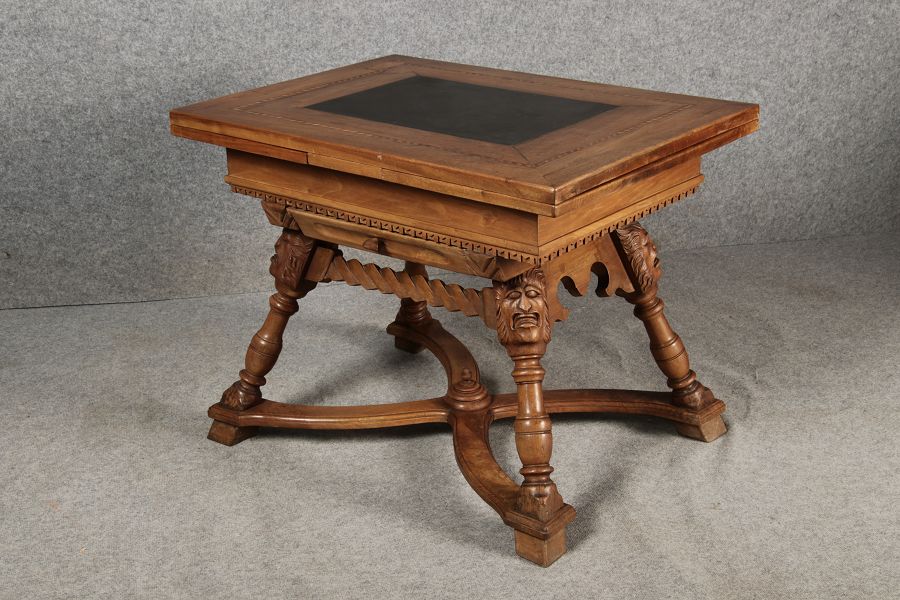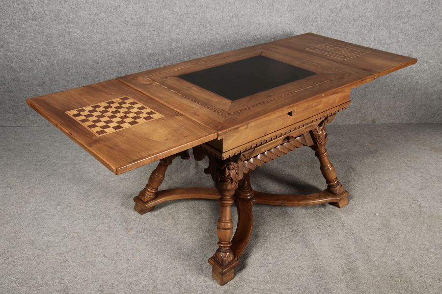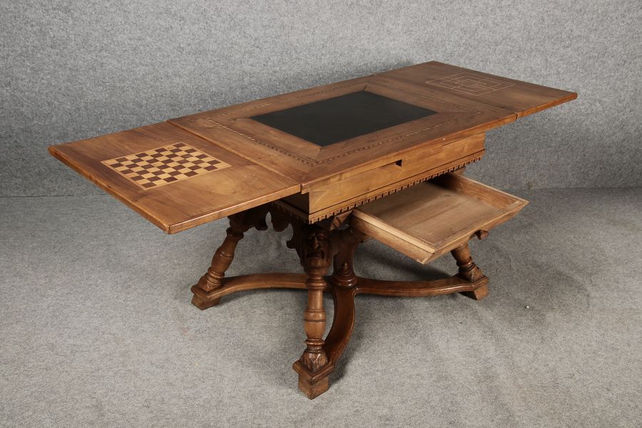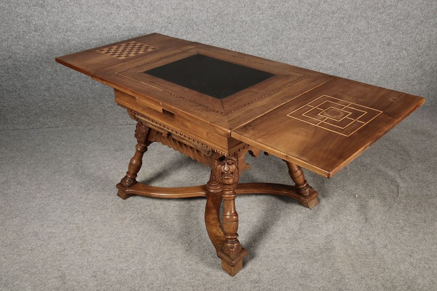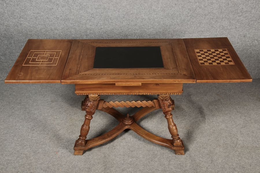 Dieser faszinierende Barocktisch aus der Schweiz besticht durch seine außergewöhnliche Verarbeitung und beeindruckende Details. Gefertigt aus massivem Nussbaumholz, kombiniert der Tisch die opulente Eleganz des Barocks mit praktischen Funktionen. Die zentrale Tischplatte ist mit einer eingelassenen Schieferplatte versehen, die dem Tisch einen besonderen funktionalen Wert verleiht. Die beiden seitlich Platte haben Einlegearbeit einmal als Schachbrettes und ein einmal als Mühlespiel. Die kunstvoll gedrechselten Tischbeine und das gekreuzte Untergestell spiegeln den opulenten Stil des Barocks wider. Besonders auffällig sind die handgeschnitzten Köpfe an den Beinen, die typisch für diese Epoche sind und dem Tisch eine imposante Ausstrahlung verleihen. Der verzierte Mittelsteg, der die Tischbeine verbindet, sorgt nicht nur für zusätzliche Stabilität, sondern unterstreicht auch die hohe Handwerkskunst, die in diesem Stück steckt Ein außergewöhnliches Möbelstück, das barocken