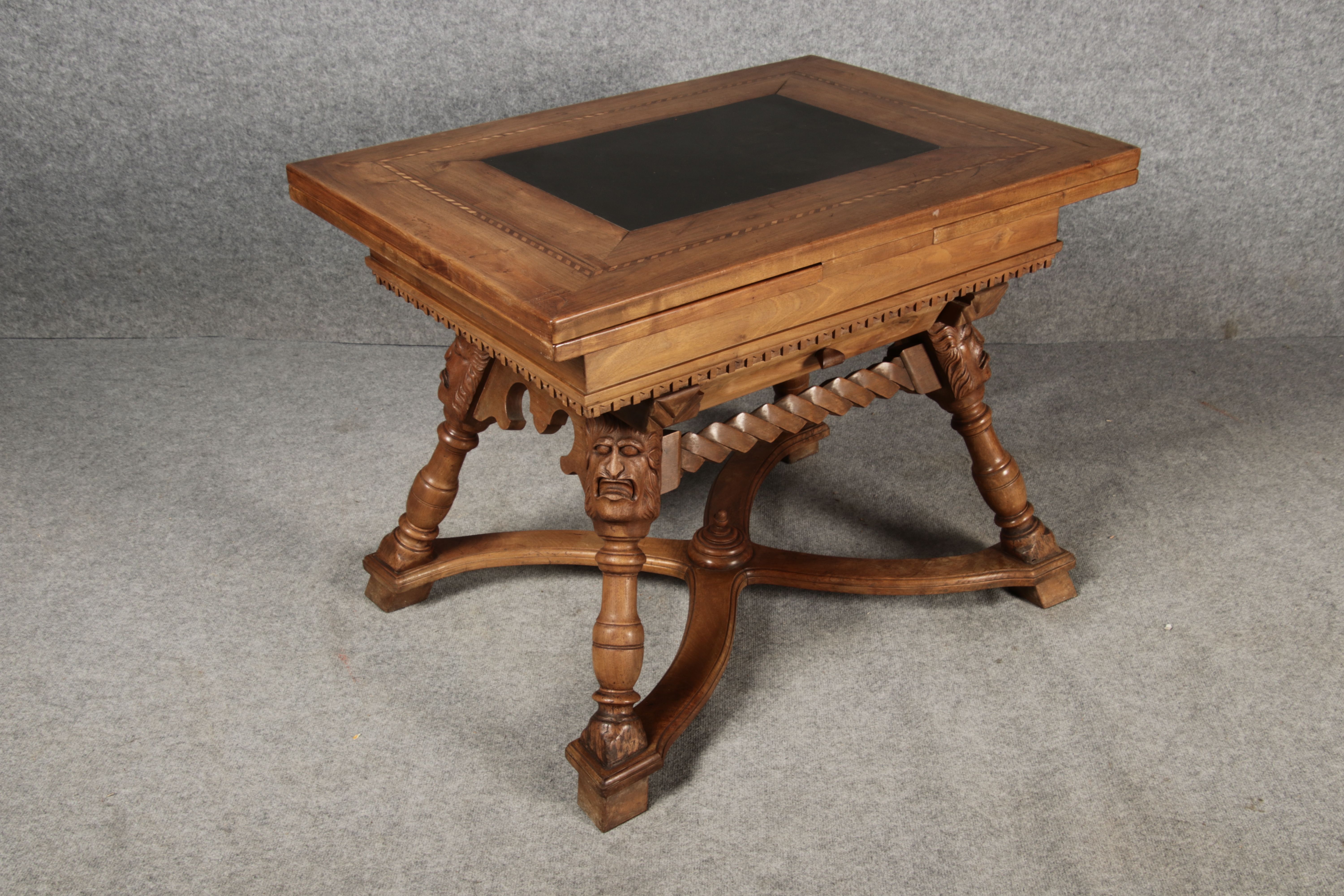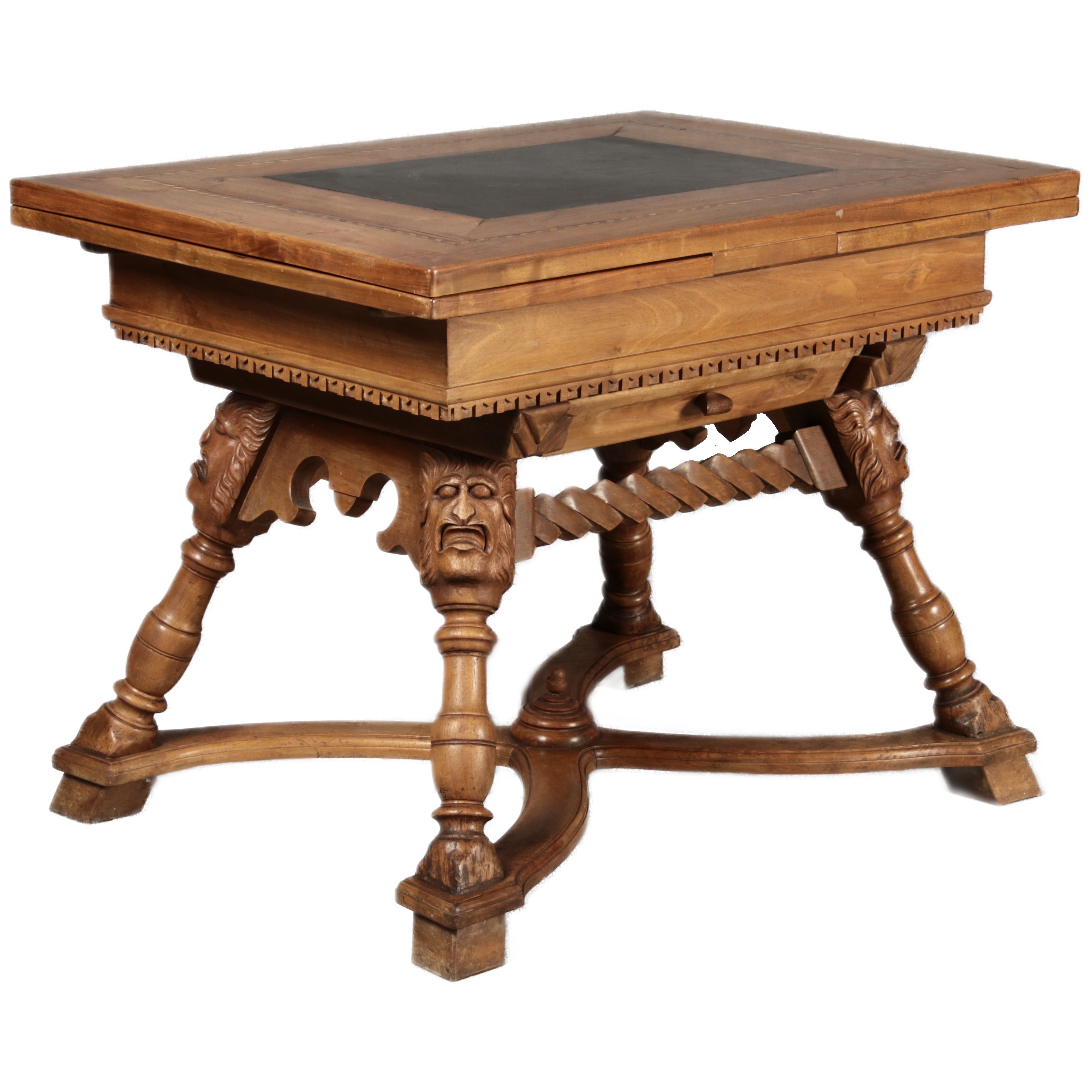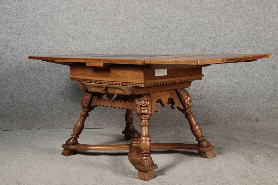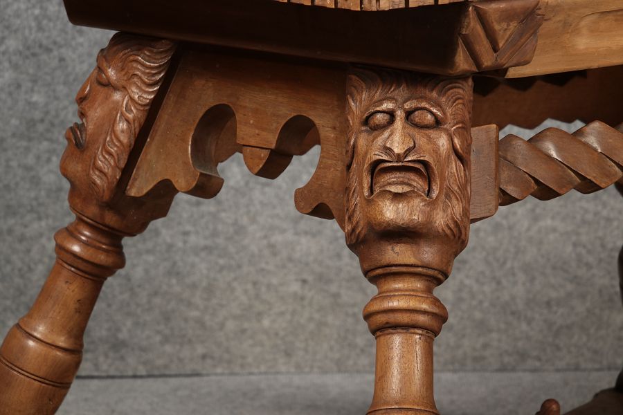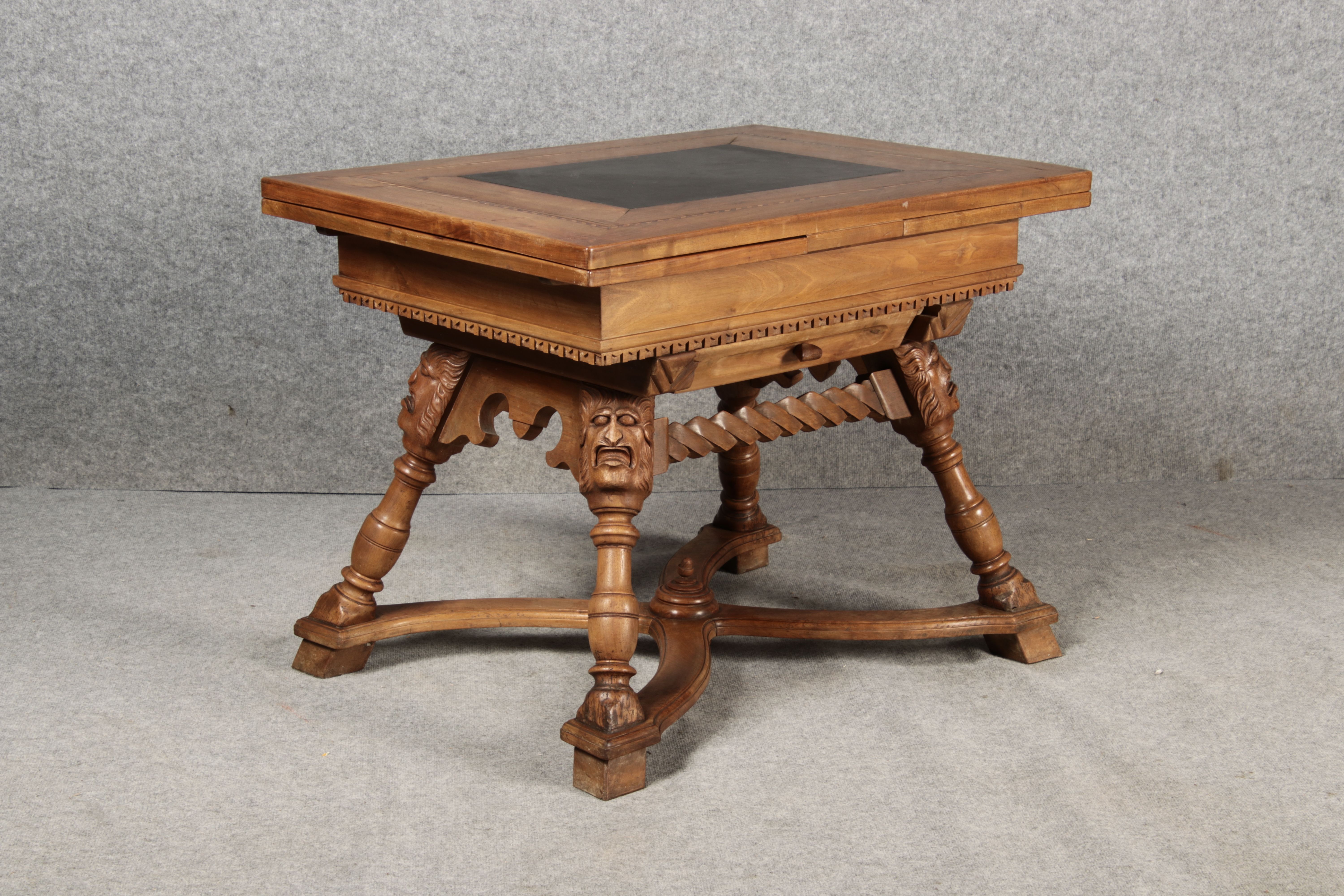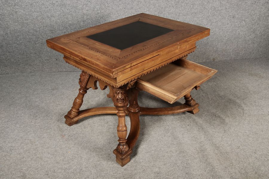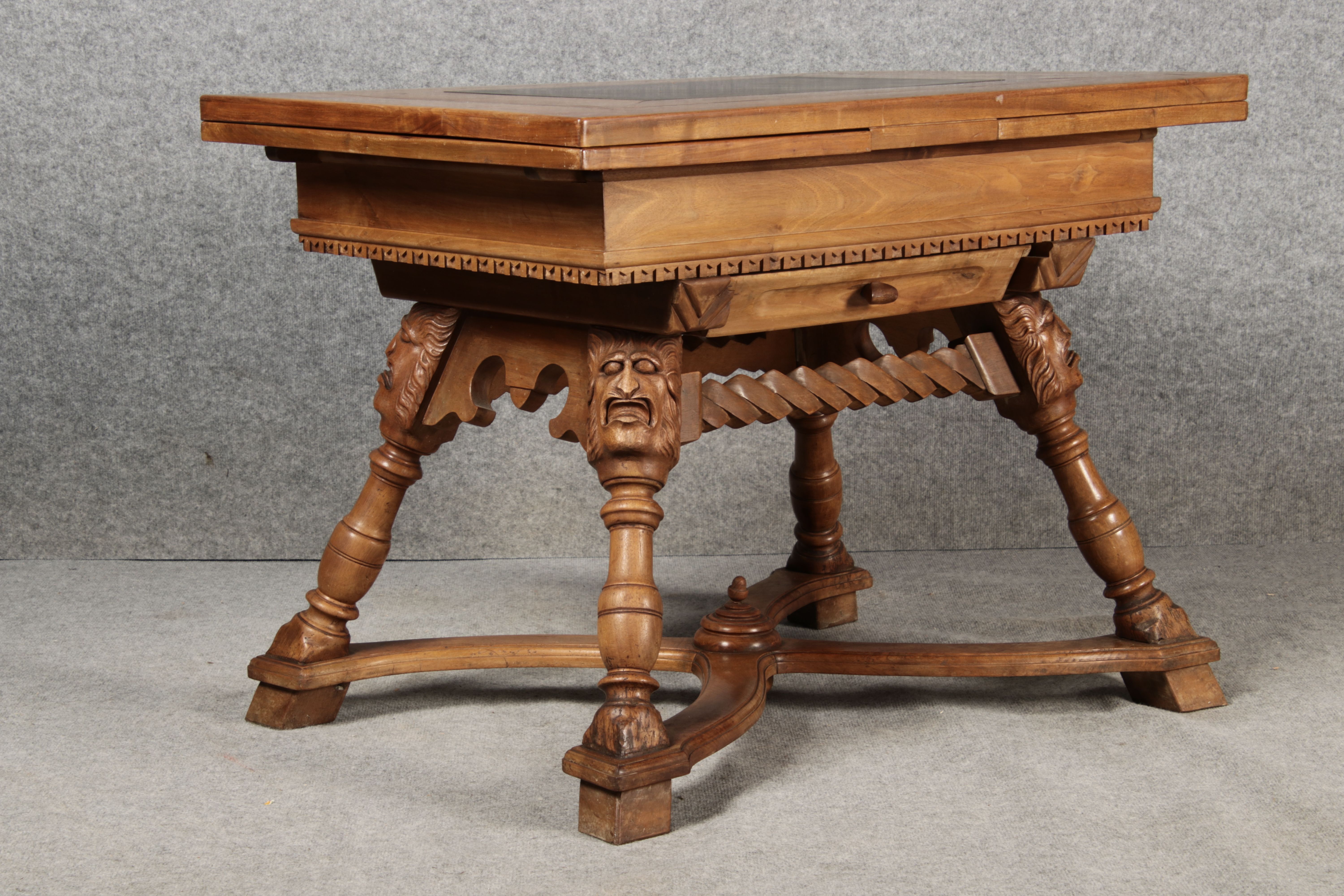 Dieser faszinierende Barocktisch aus der Schweiz besticht durch seine außergewöhnliche Verarbeitung und beeindruckende Details. Gefertigt aus massivem Nussbaumholz, kombiniert der Tisch die opulente Eleganz des Barocks mit praktischen Funktionen. Die zentrale Tischplatte ist mit einer eingelassenen Schieferplatte versehen, die dem Tisch einen besonderen funktionalen Wert verleiht. Die beiden seitlich Platte haben Einlegearbeit einmal als Schachbrettes und ein einmal als Mühlespiel. Die kunstvoll gedrechselten Tischbeine und das gekreuzte Untergestell spiegeln den opulenten Stil des Barocks wider. Besonders auffällig sind die handgeschnitzten Köpfe an den Beinen, die typisch für diese Epoche sind und dem Tisch eine imposante Ausstrahlung verleihen. Der verzierte Mittelsteg, der die Tischbeine verbindet, sorgt nicht nur für zusätzliche Stabilität, sondern unterstreicht auch die hohe Handwerkskunst, die in diesem Stück steckt Ein außergewöhnliches Möbelstück, das barocken