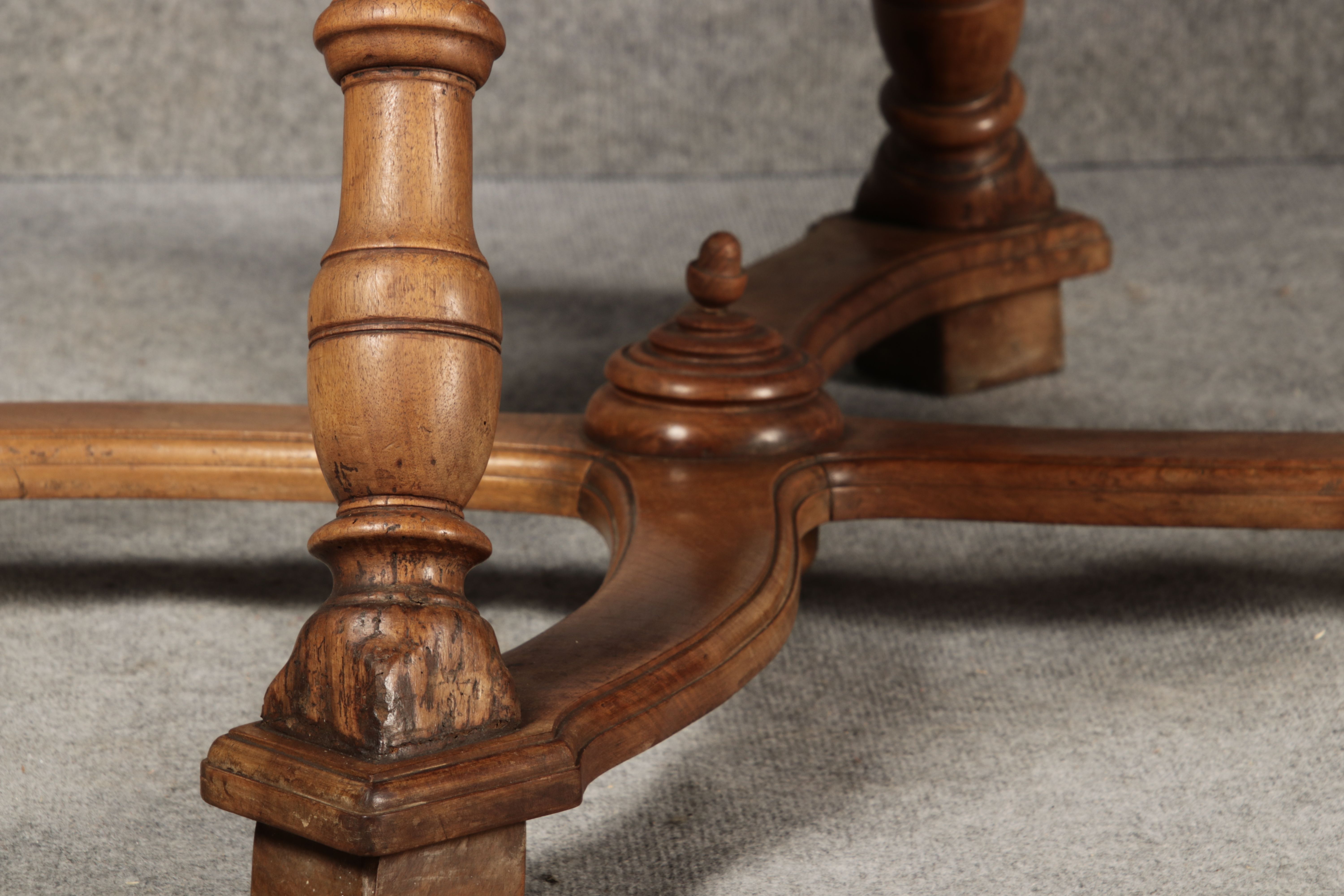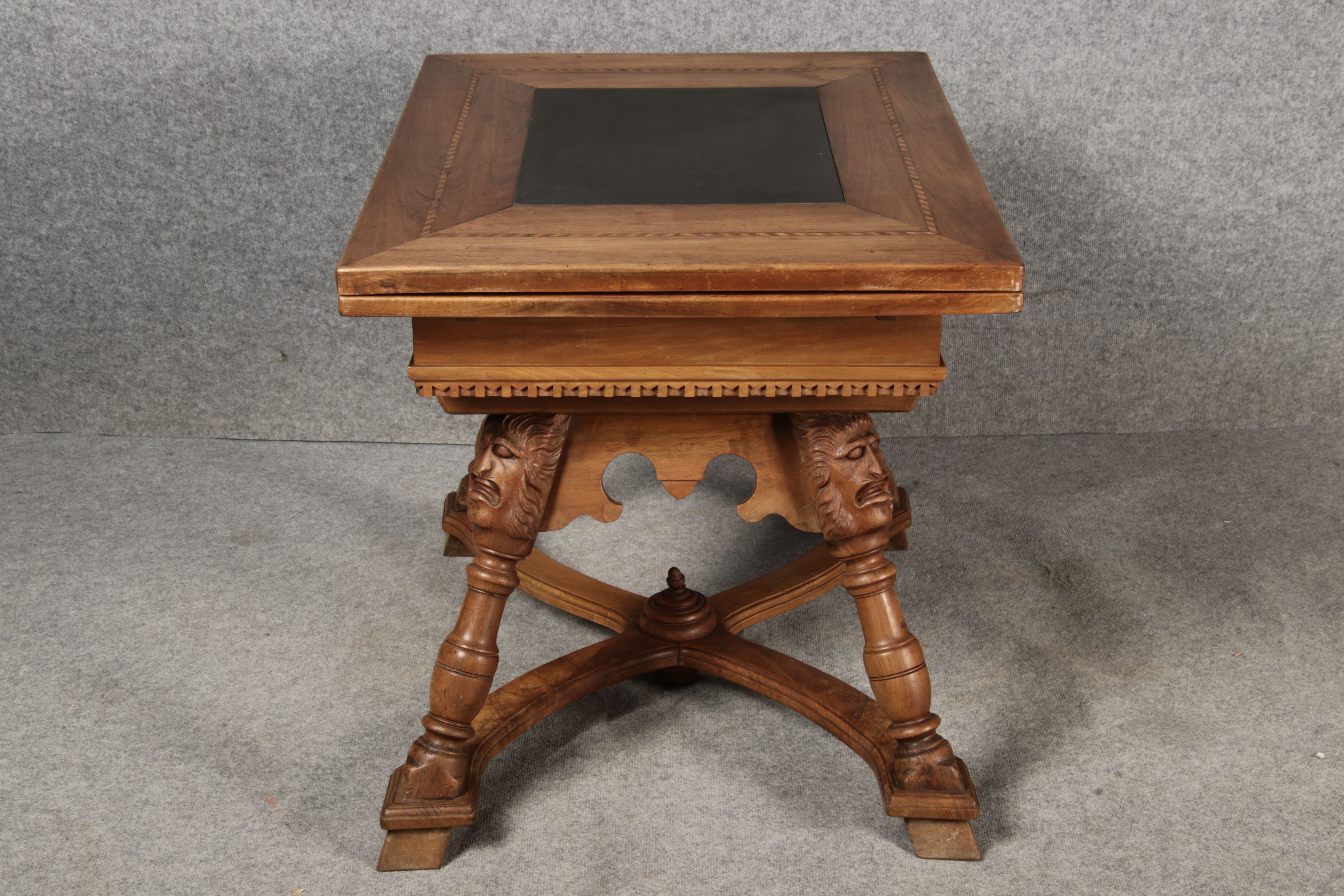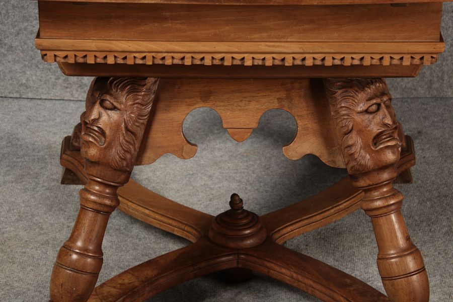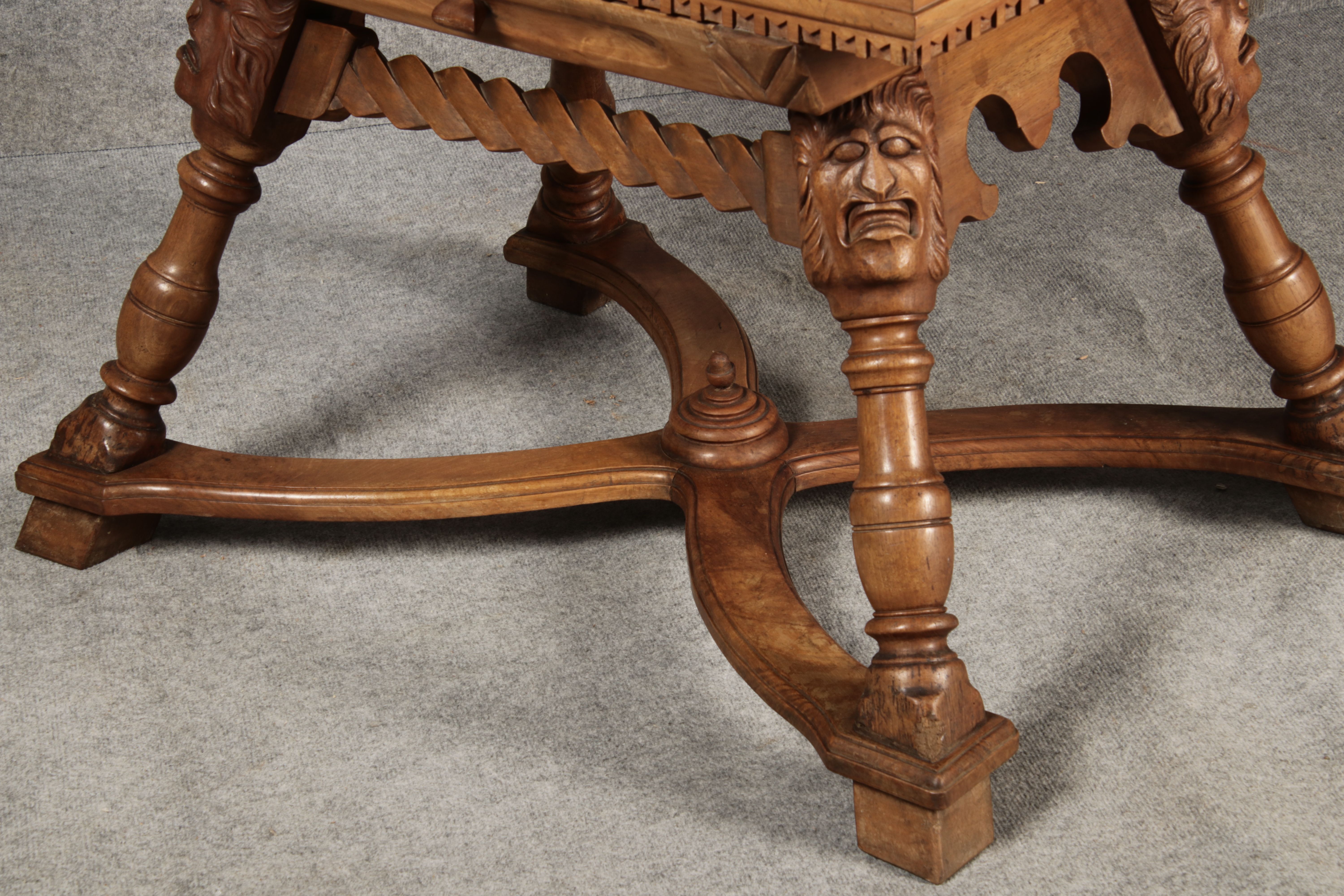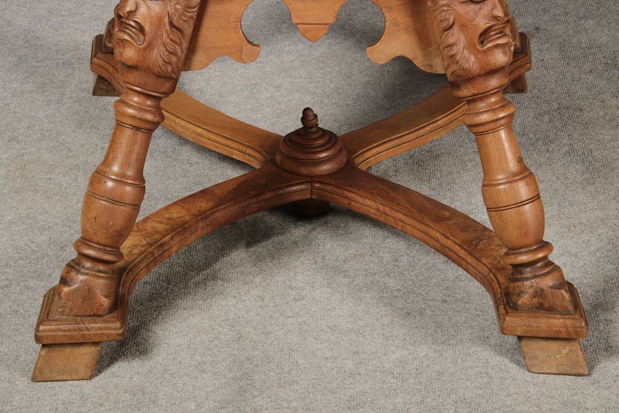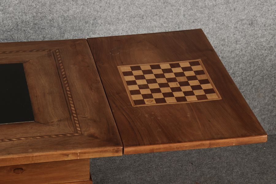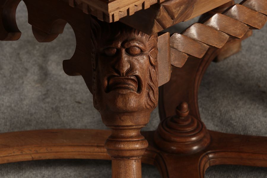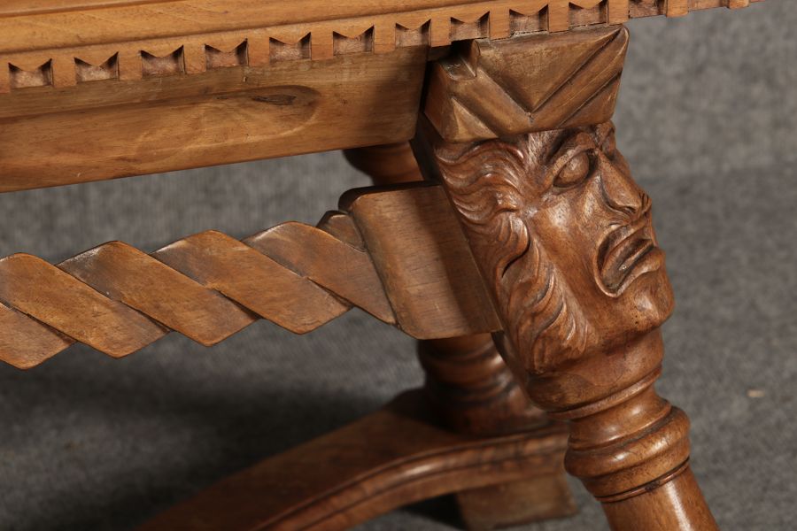 Dieser faszinierende Barocktisch aus der Schweiz besticht durch seine außergewöhnliche Verarbeitung und beeindruckende Details. Gefertigt aus massivem Nussbaumholz, kombiniert der Tisch die opulente Eleganz des Barocks mit praktischen Funktionen. Die zentrale Tischplatte ist mit einer eingelassenen Schieferplatte versehen, die dem Tisch einen besonderen funktionalen Wert verleiht. Die beiden seitlich Platte haben Einlegearbeit einmal als Schachbrettes und ein einmal als Mühlespiel. Die kunstvoll gedrechselten Tischbeine und das gekreuzte Untergestell spiegeln den opulenten Stil des Barocks wider. Besonders auffällig sind die handgeschnitzten Köpfe an den Beinen, die typisch für diese Epoche sind und dem Tisch eine imposante Ausstrahlung verleihen. Der verzierte Mittelsteg, der die Tischbeine verbindet, sorgt nicht nur für zusätzliche Stabilität, sondern unterstreicht auch die hohe Handwerkskunst, die in diesem Stück steckt Ein außergewöhnliches Möbelstück, das barocken