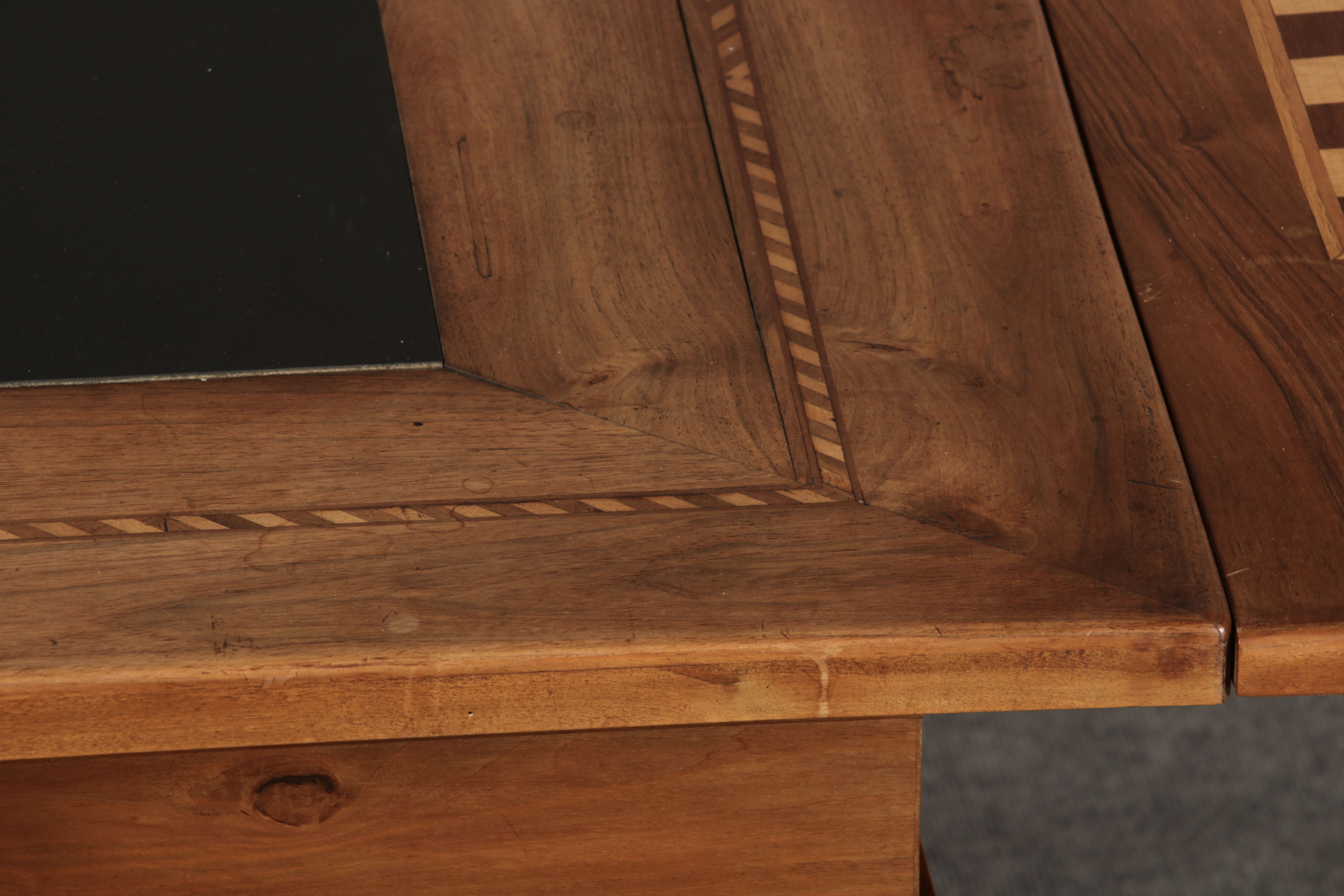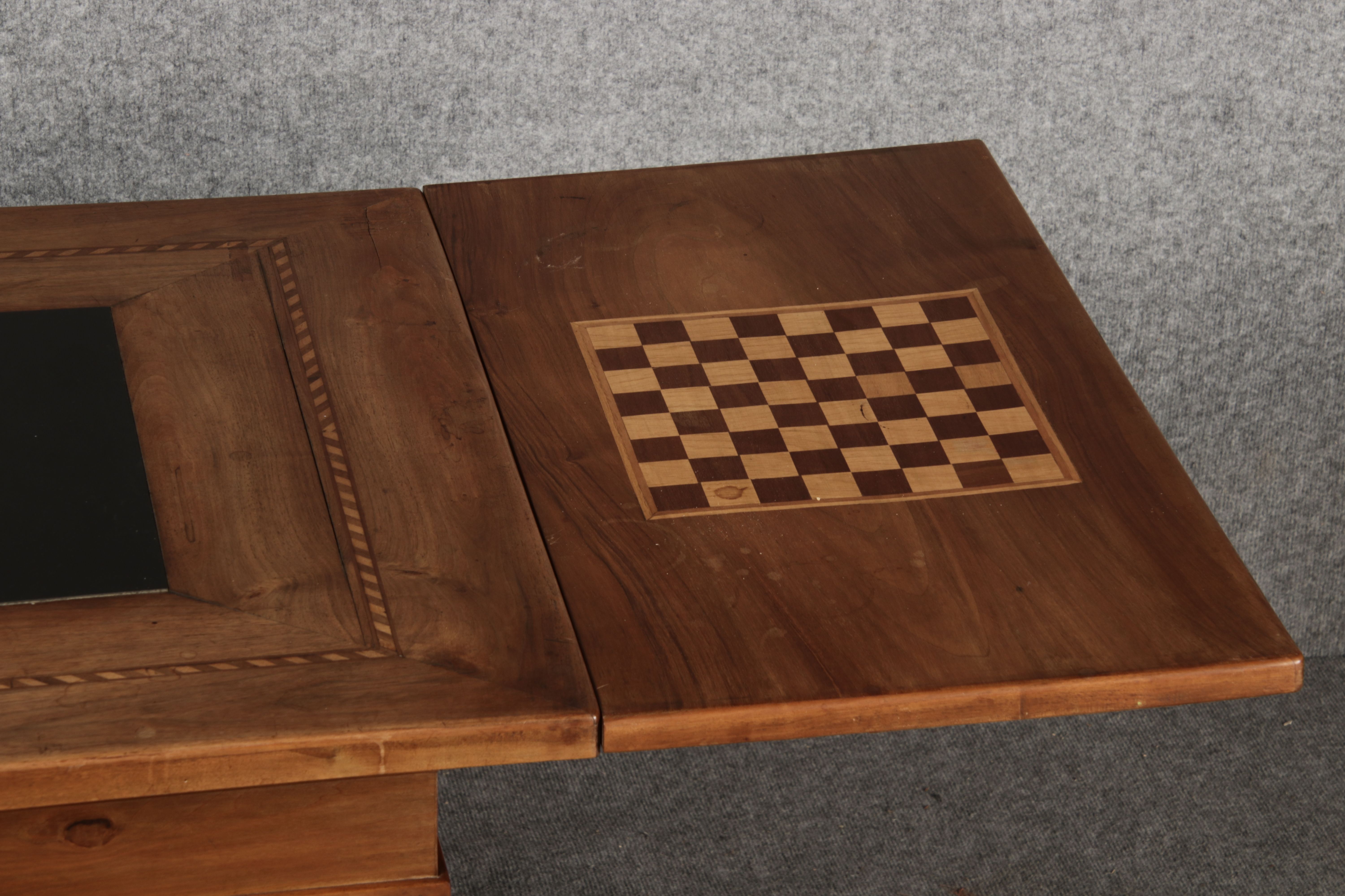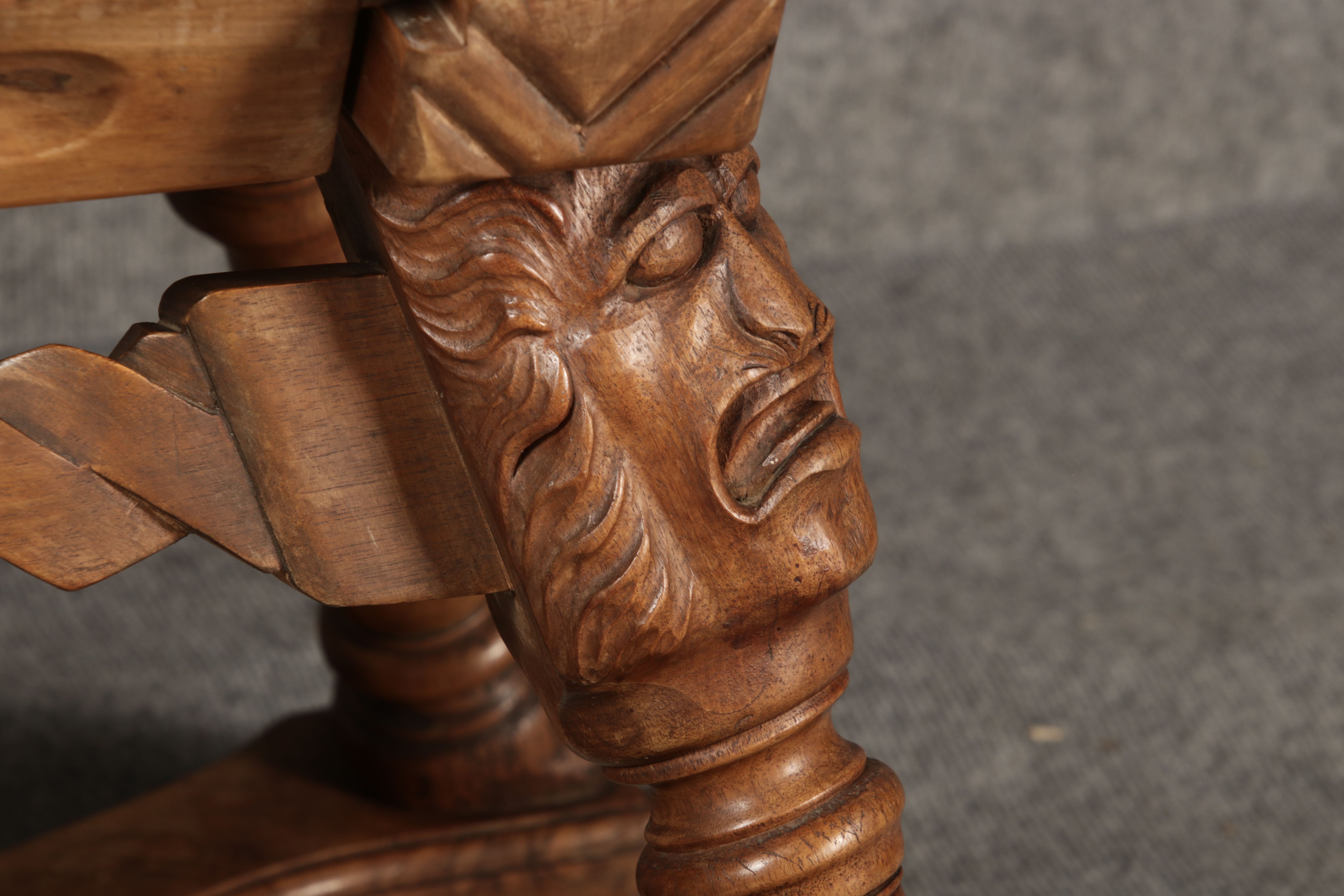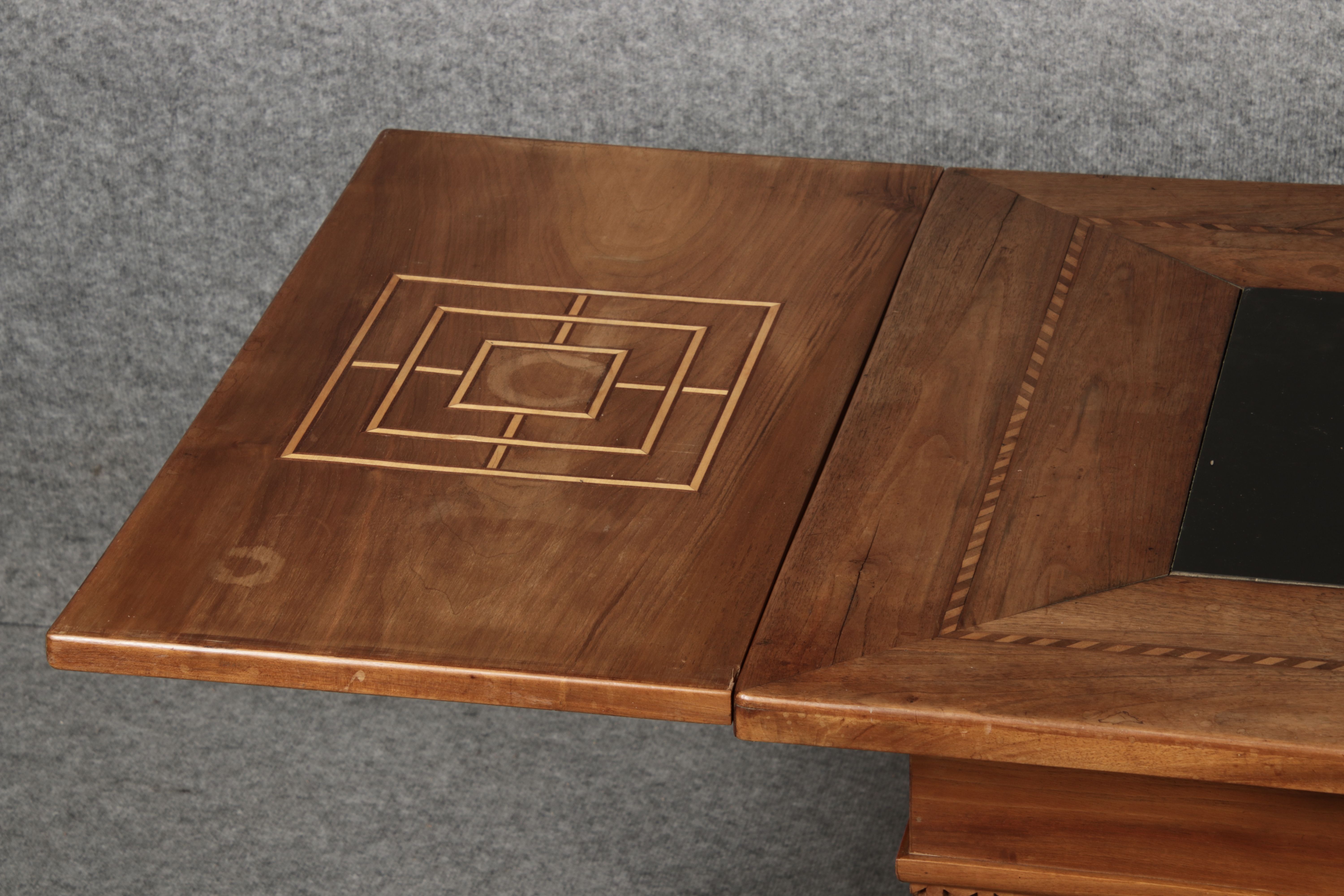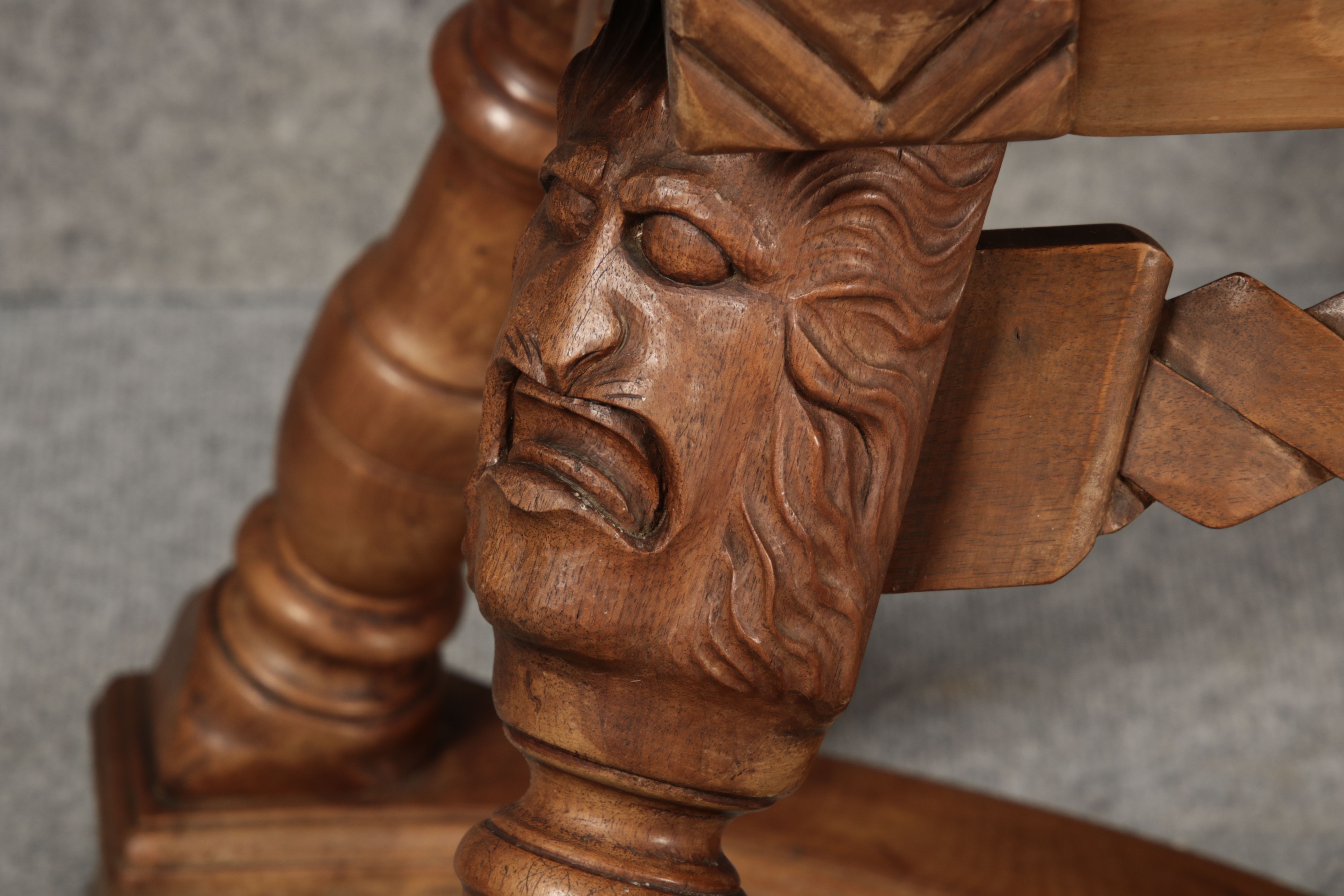 Dieser faszinierende Barocktisch aus der Schweiz besticht durch seine außergewöhnliche Verarbeitung und beeindruckende Details. Gefertigt aus massivem Nussbaumholz, kombiniert der Tisch die opulente Eleganz des Barocks mit praktischen Funktionen. Die zentrale Tischplatte ist mit einer eingelassenen Schieferplatte versehen, die dem Tisch einen besonderen funktionalen Wert verleiht. Die beiden seitlich Platte haben Einlegearbeit einmal als Schachbrettes und ein einmal als Mühlespiel. Die kunstvoll gedrechselten Tischbeine und das gekreuzte Untergestell spiegeln den opulenten Stil des Barocks wider. Besonders auffällig sind die handgeschnitzten Köpfe an den Beinen, die typisch für diese Epoche sind und dem Tisch eine imposante Ausstrahlung verleihen. Der verzierte Mittelsteg, der die Tischbeine verbindet, sorgt nicht nur für zusätzliche Stabilität, sondern unterstreicht auch die hohe Handwerkskunst, die in diesem Stück steckt Ein außergewöhnliches Möbelstück, das barocken