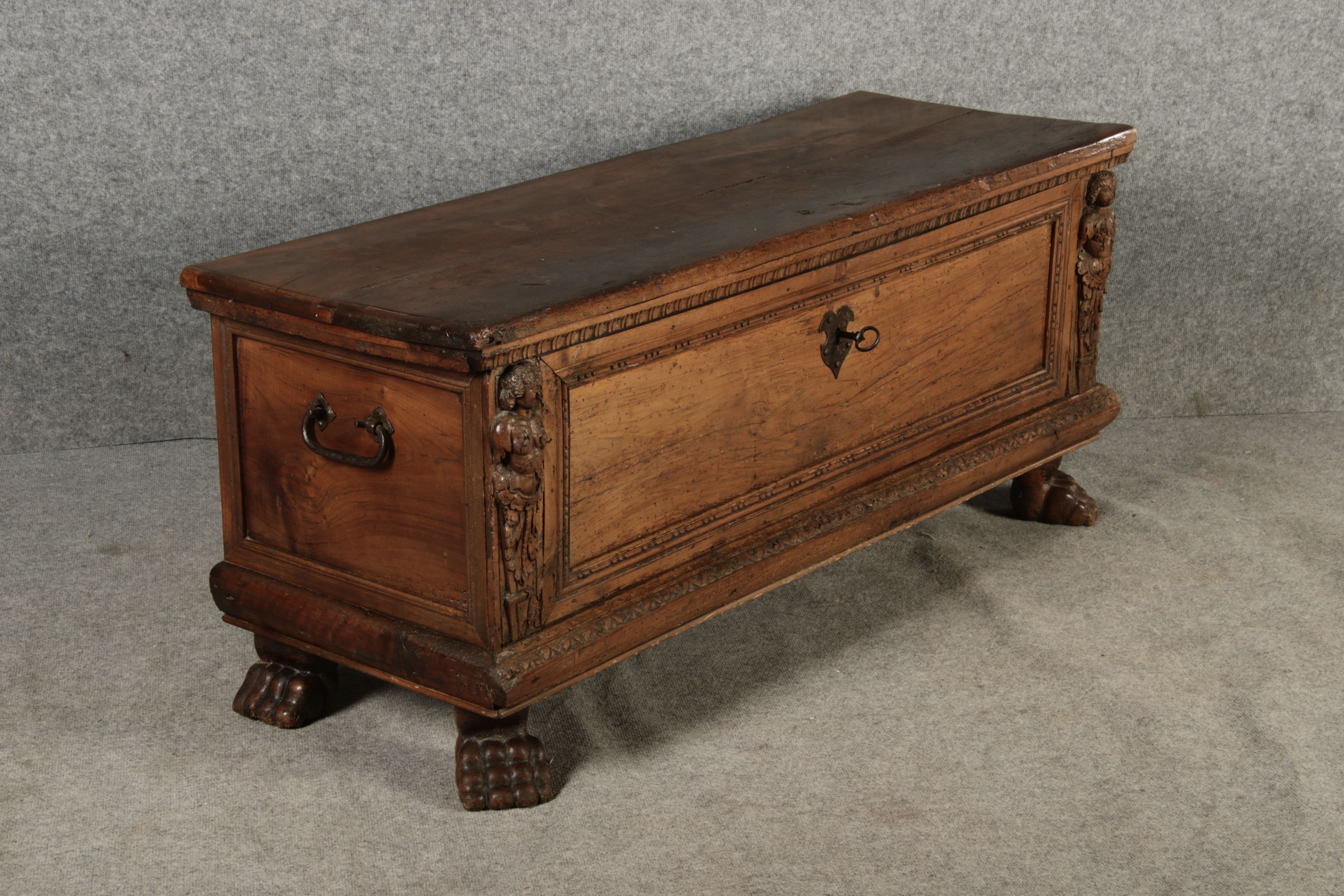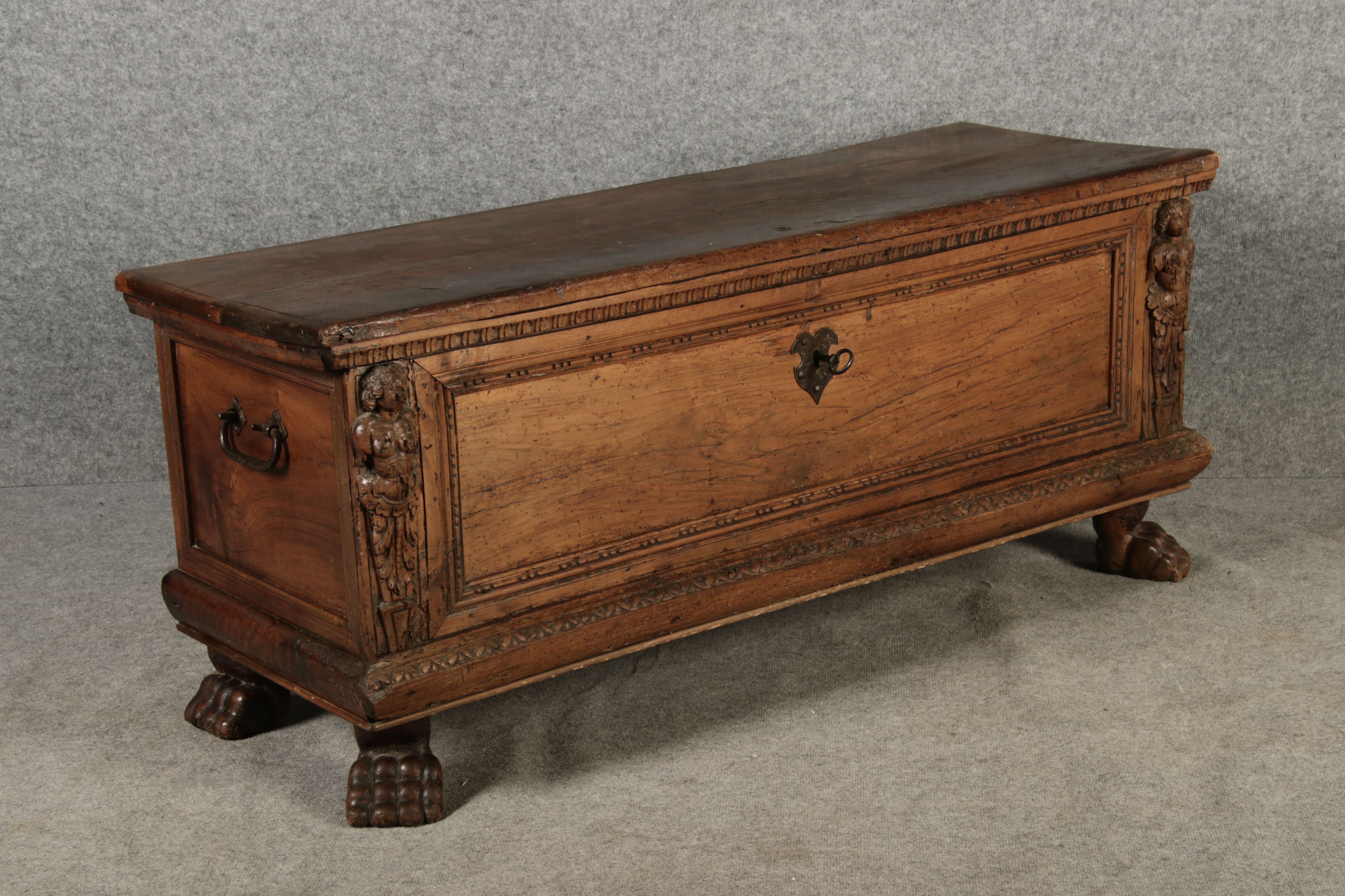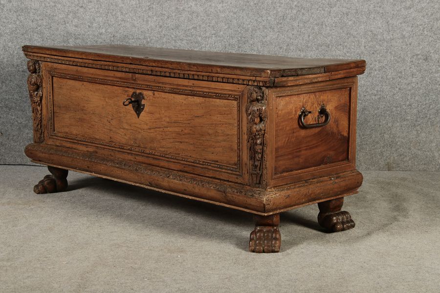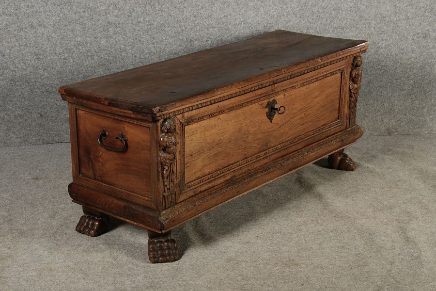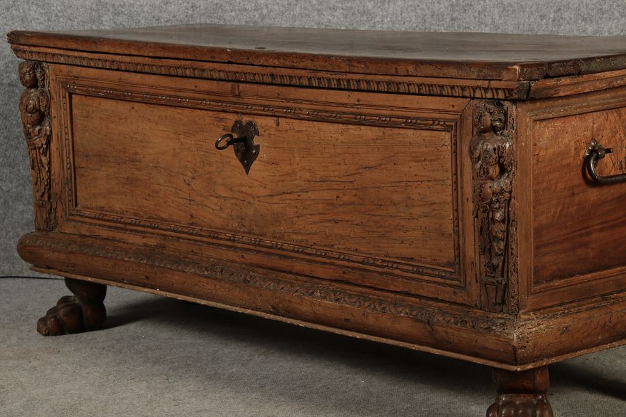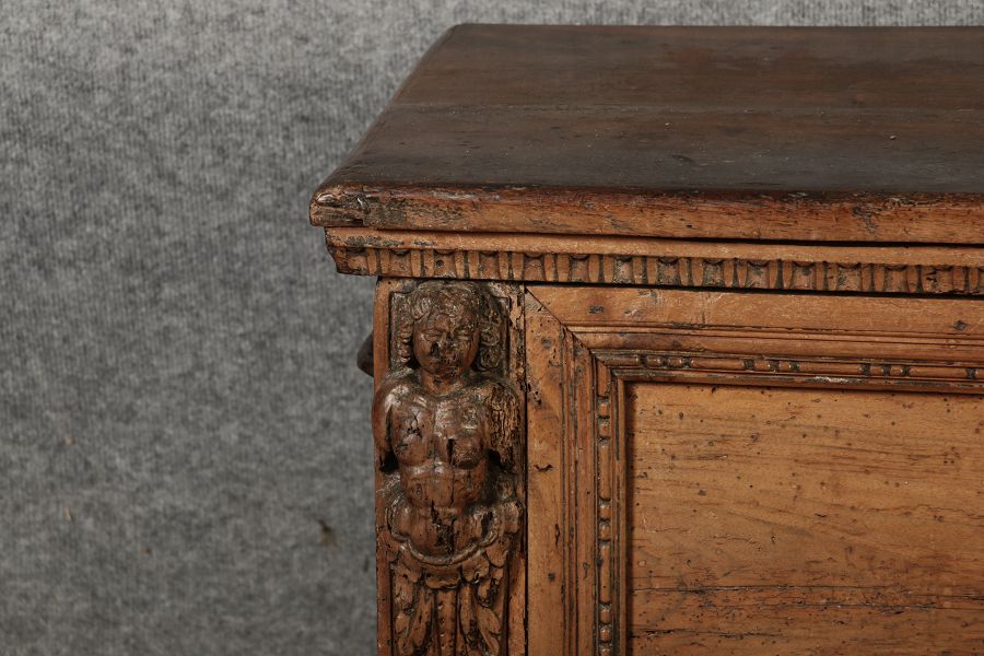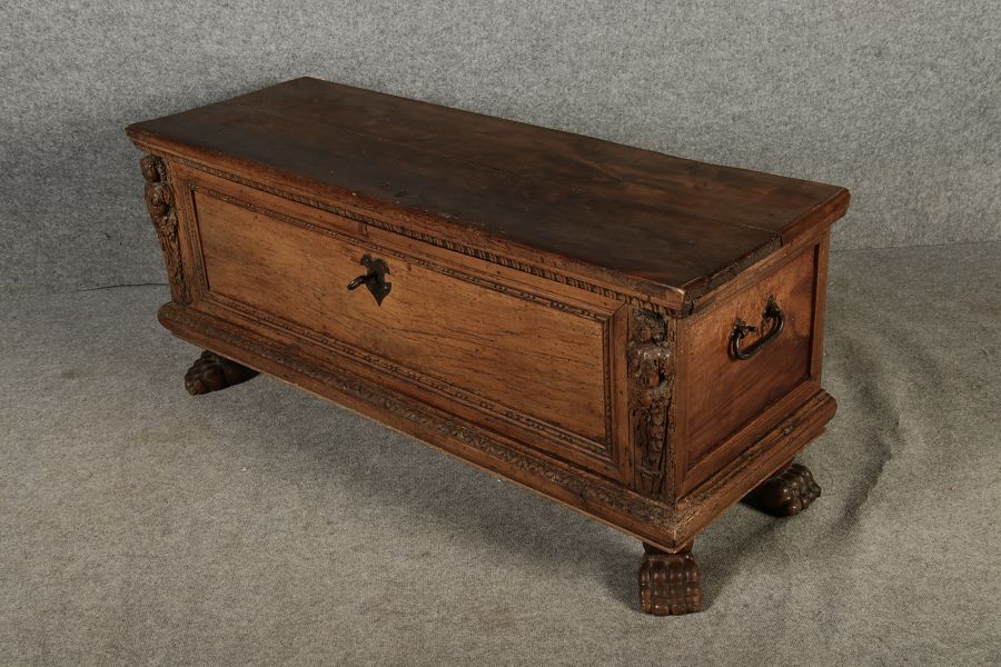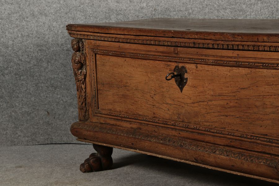 17 Jh. In Nussholz gearbeitet. Längsrechteckiger Kasten mit gerade schließendem Deckel und seitlichem, geschmiedetem Tragehenkel in Eisen. Die Front zeigt ein durchgehendes Rechteckfeld, flankiert von figürlich geschnitzten Hermenpilastern, das Kassettenfeld breit gerahmt. Unteres Profil in Godronnierung leicht vortretend, über kurzen Stollenfüßen in Form von Löwen Tatzen. Im Inneren original Eisenschloss. Mit schöner Alterspatina. Ansonsten in sehr guter Erhaltung.