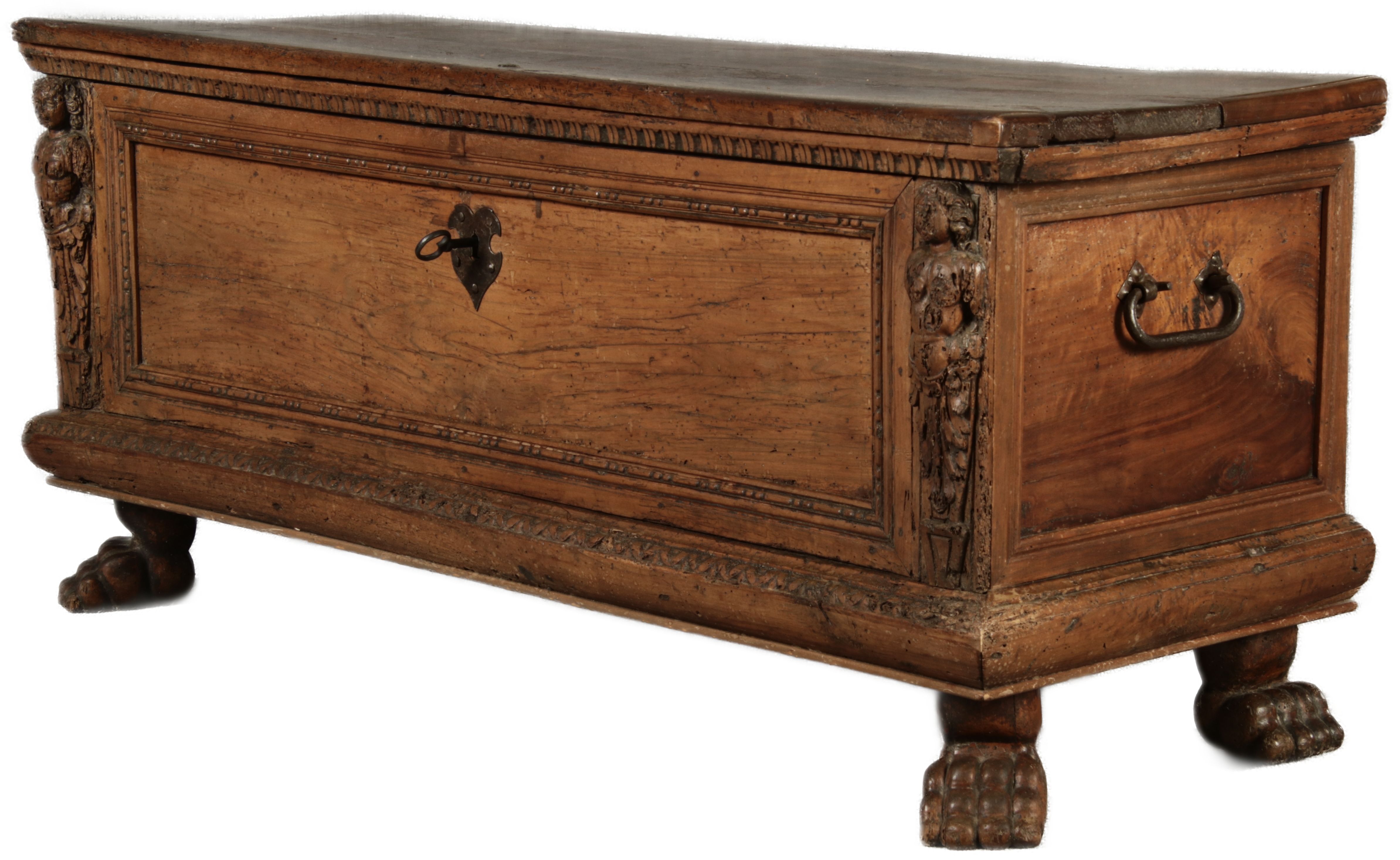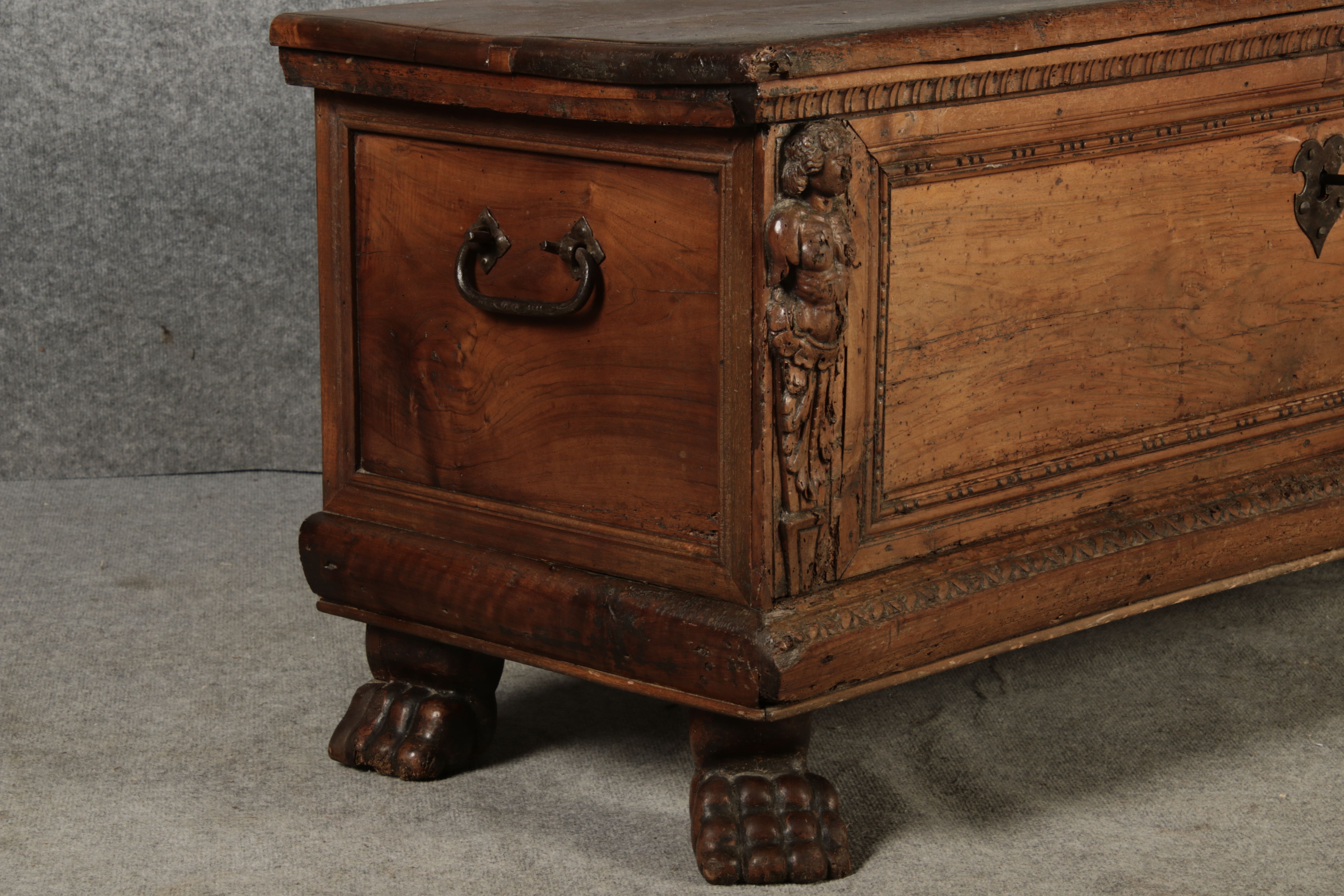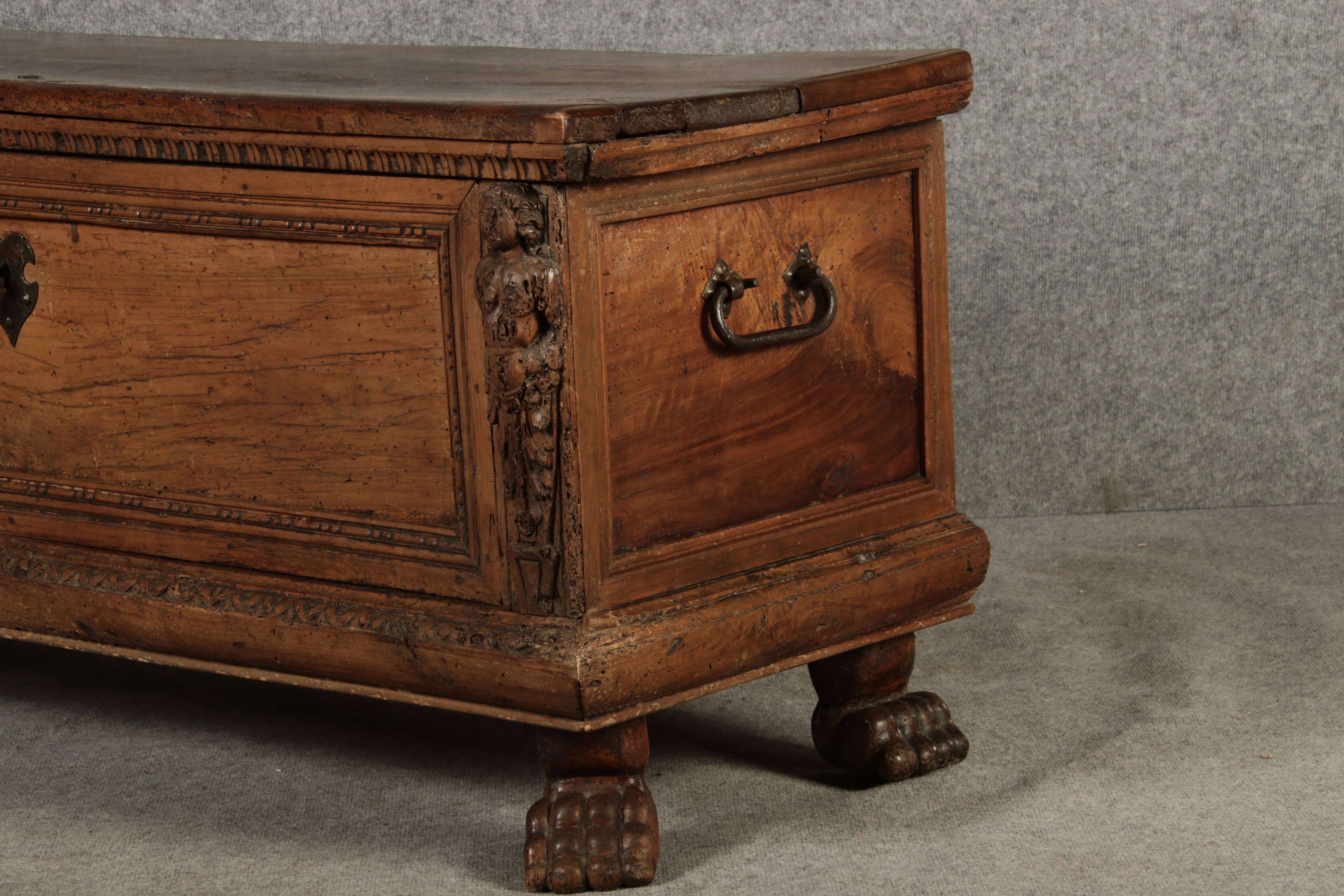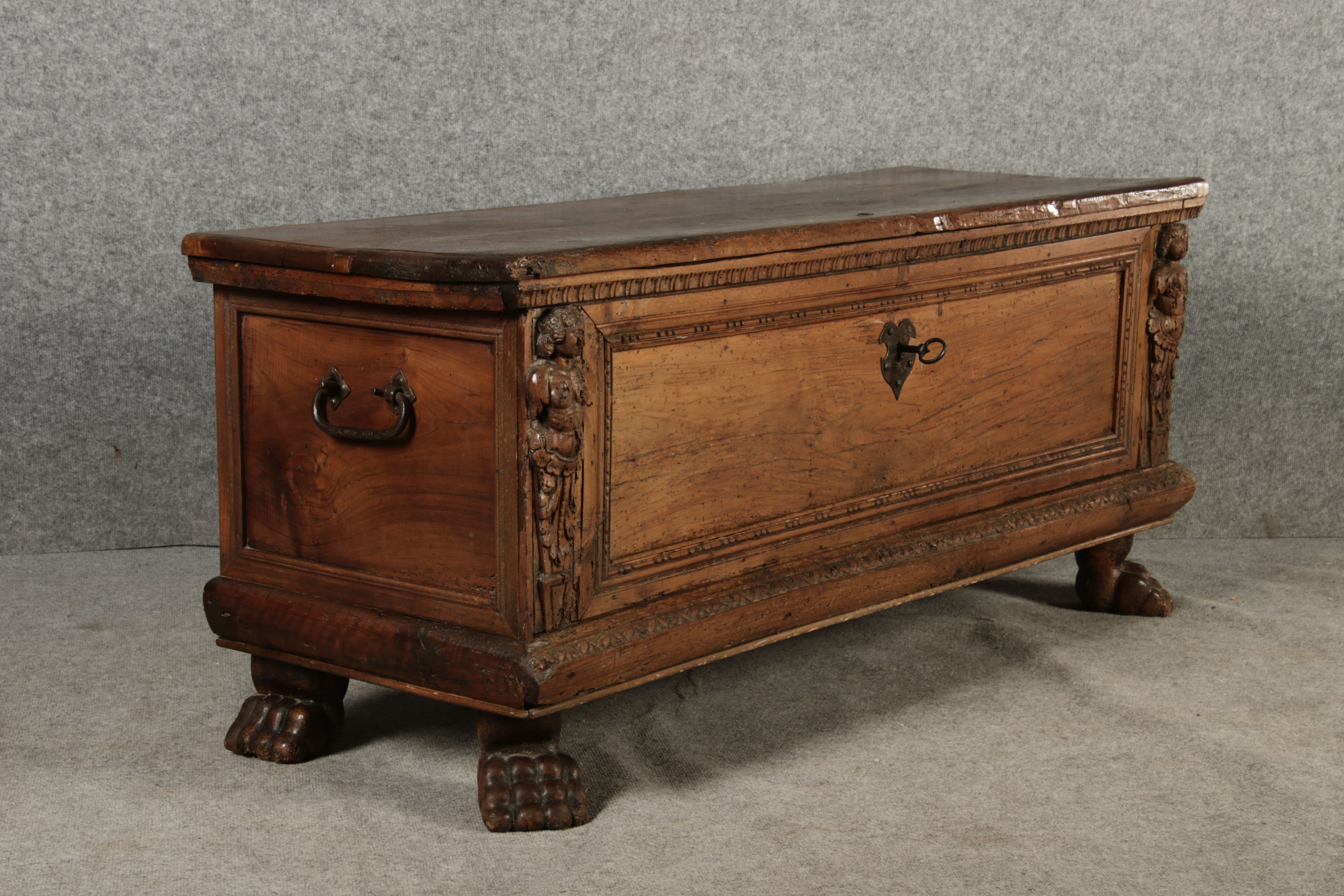 17 Jh. In Nussholz gearbeitet. Längsrechteckiger Kasten mit gerade schließendem Deckel und seitlichem, geschmiedetem Tragehenkel in Eisen. Die Front zeigt ein durchgehendes Rechteckfeld, flankiert von figürlich geschnitzten Hermenpilastern, das Kassettenfeld breit gerahmt. Unteres Profil in Godronnierung leicht vortretend, über kurzen Stollenfüßen in Form von Löwen Tatzen. Im Inneren original Eisenschloss. Mit schöner Alterspatina. Ansonsten in sehr guter Erhaltung.