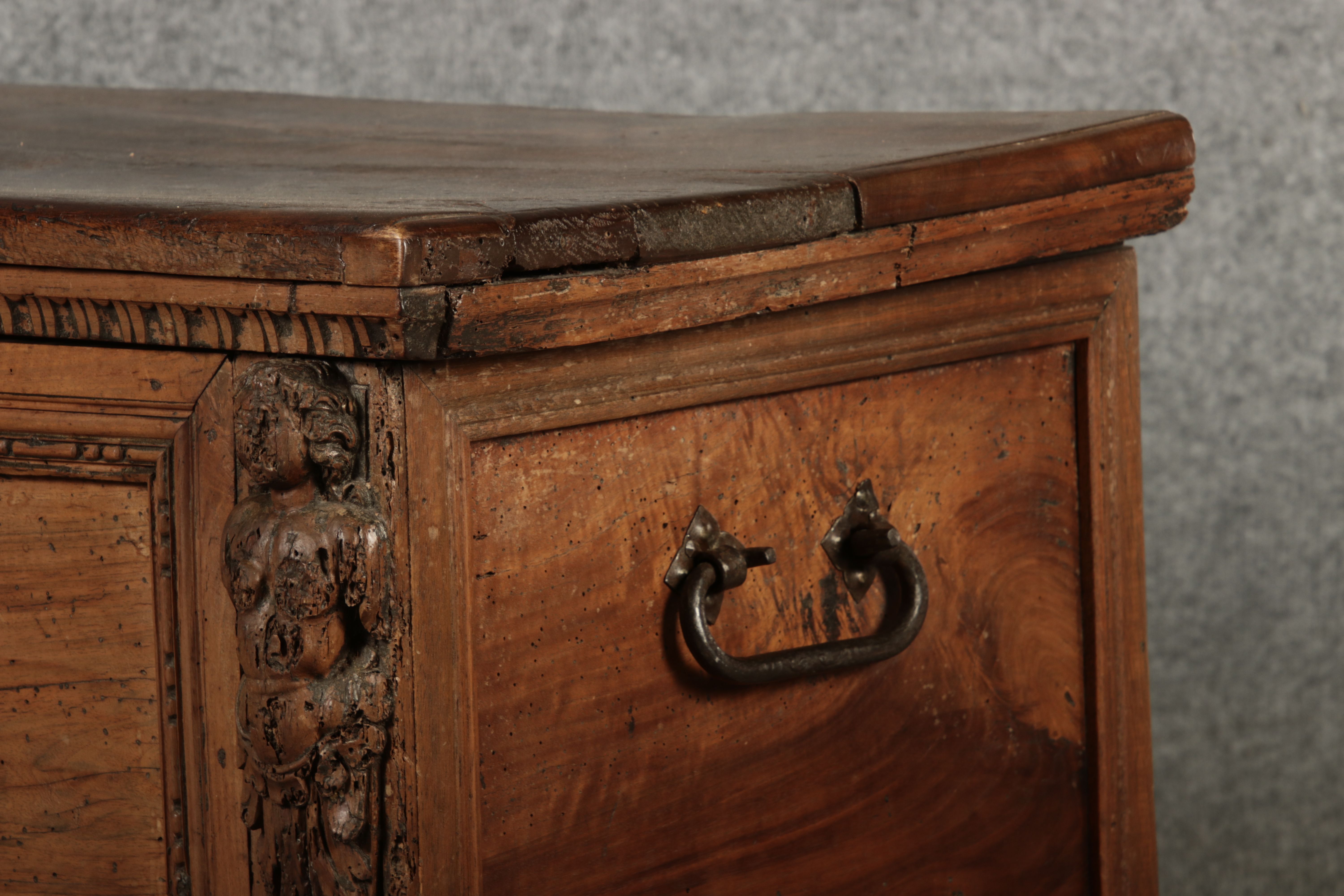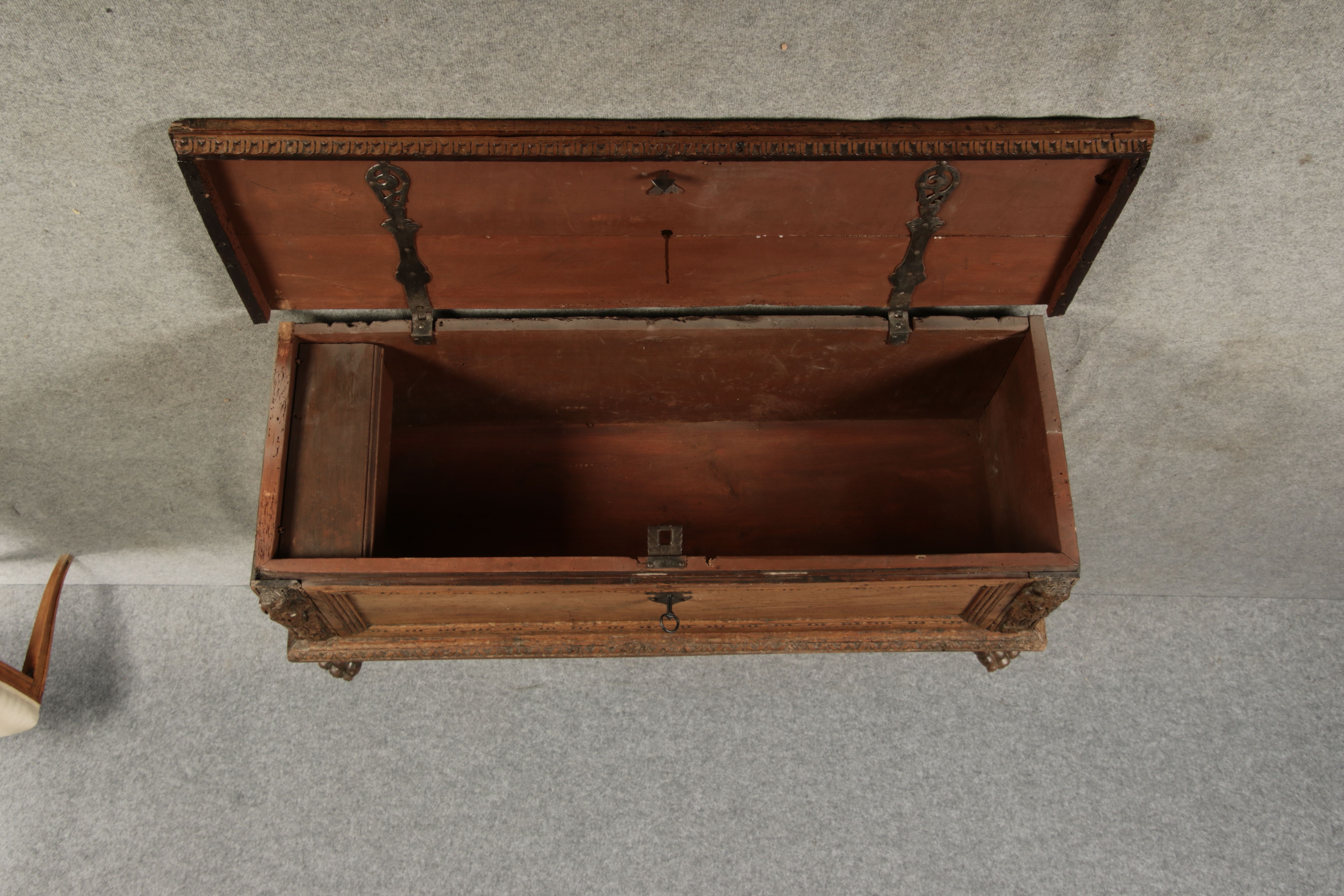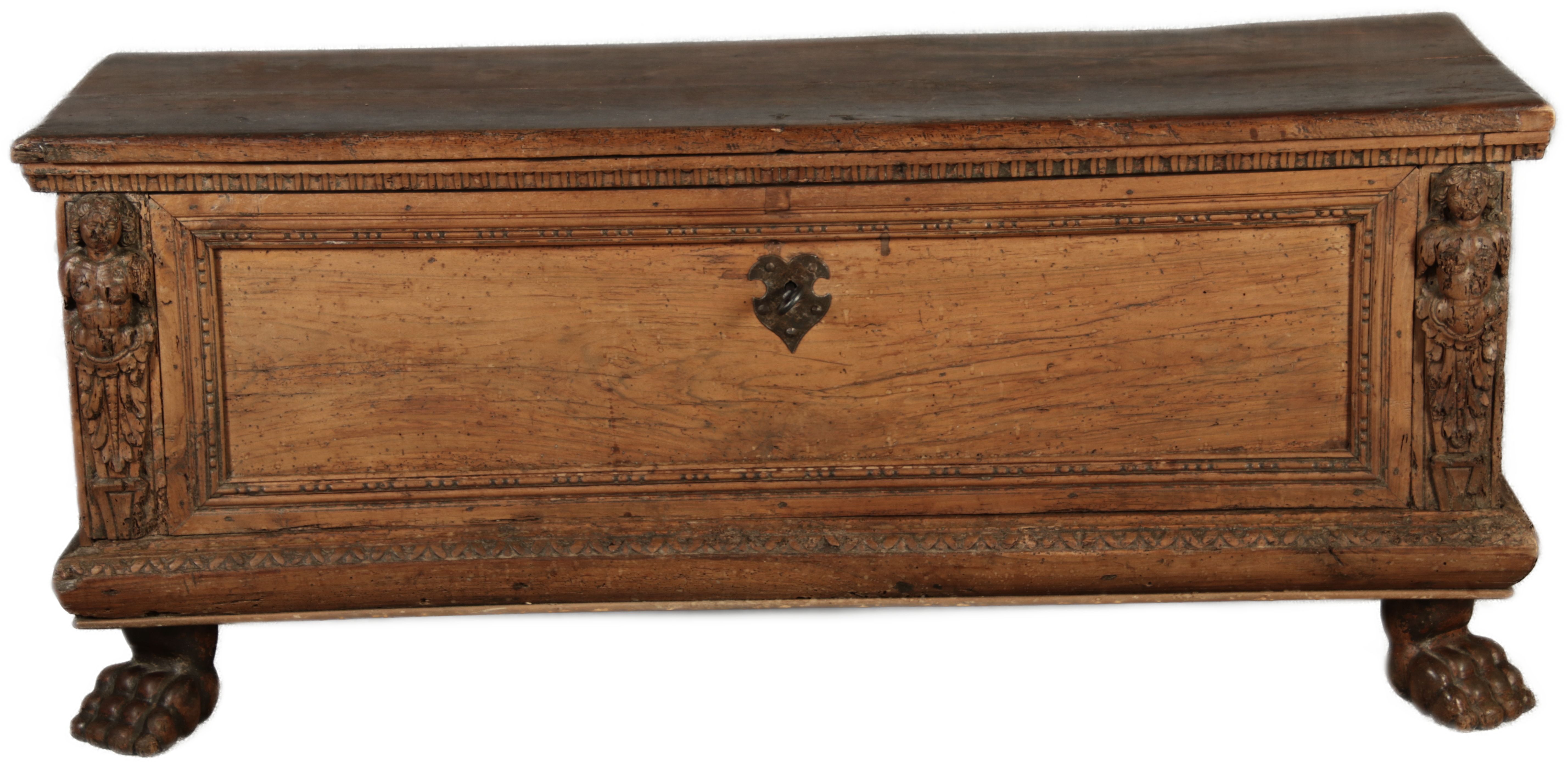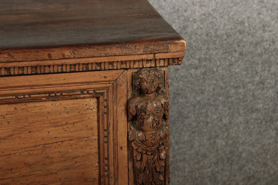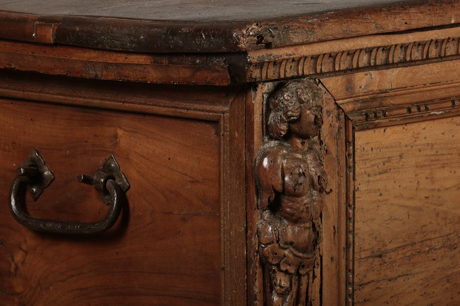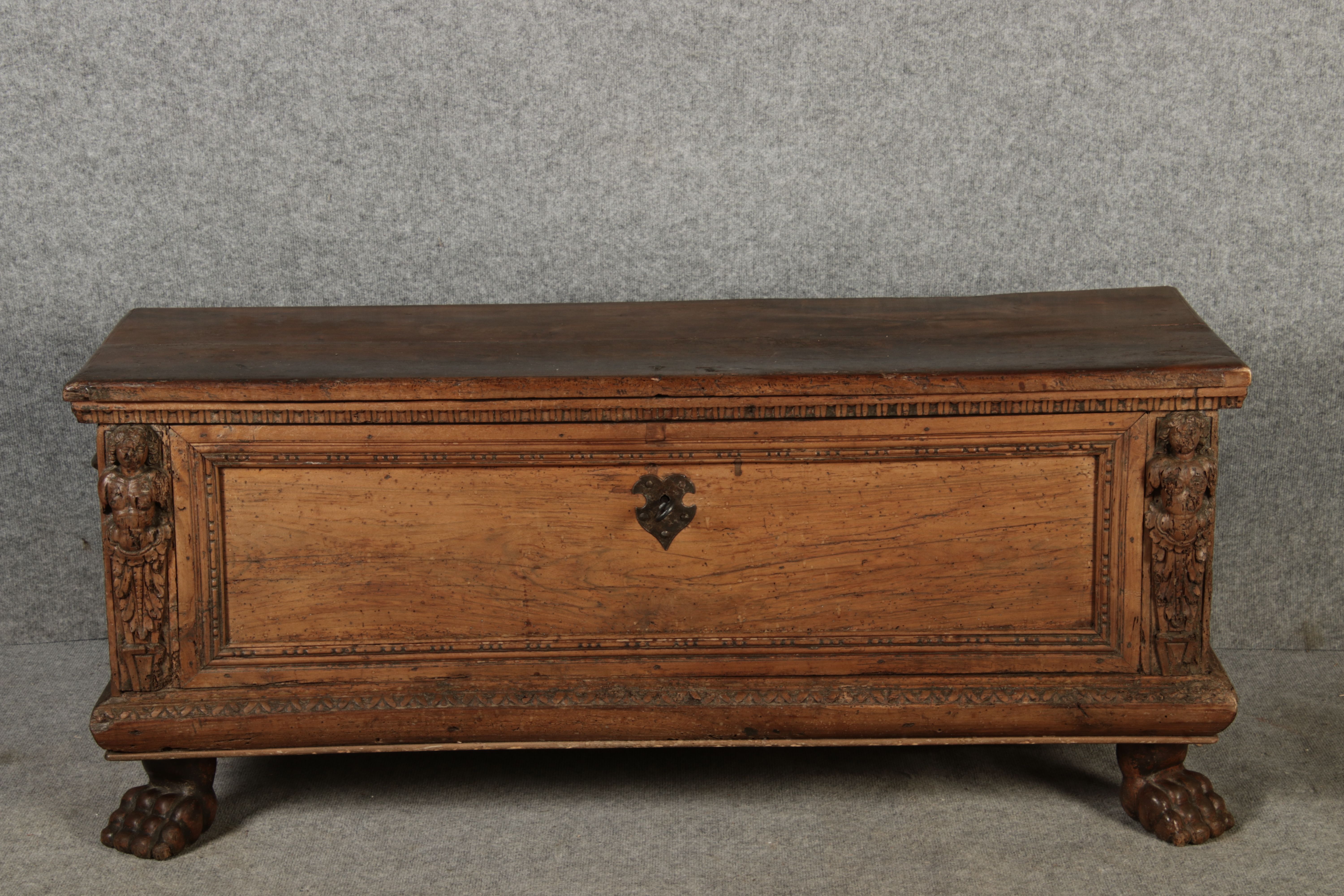 17 Jh. In Nussholz gearbeitet. Längsrechteckiger Kasten mit gerade schließendem Deckel und seitlichem, geschmiedetem Tragehenkel in Eisen. Die Front zeigt ein durchgehendes Rechteckfeld, flankiert von figürlich geschnitzten Hermenpilastern, das Kassettenfeld breit gerahmt. Unteres Profil in Godronnierung leicht vortretend, über kurzen Stollenfüßen in Form von Löwen Tatzen. Im Inneren original Eisenschloss. Mit schöner Alterspatina. Ansonsten in sehr guter Erhaltung.