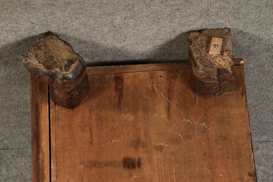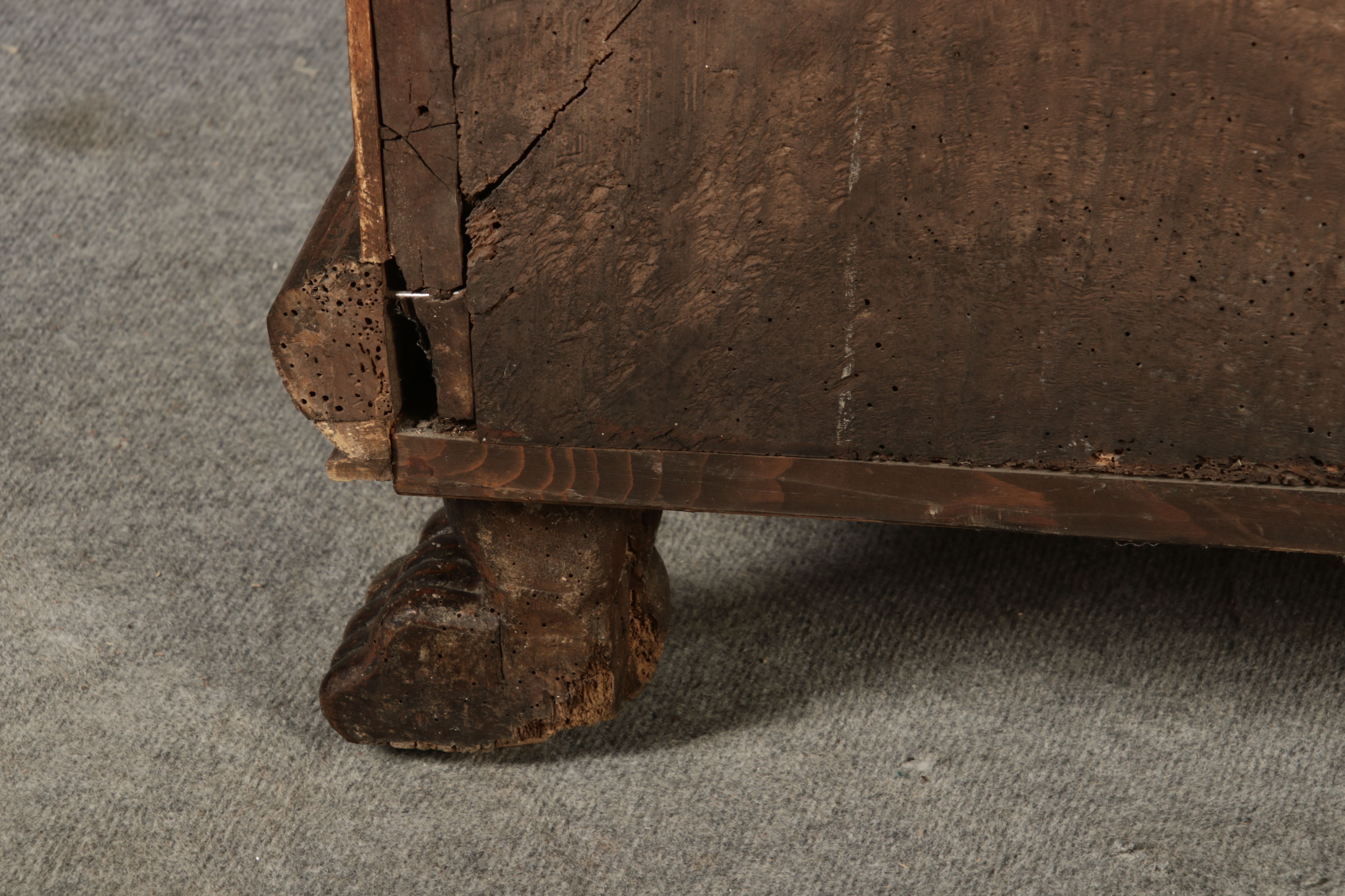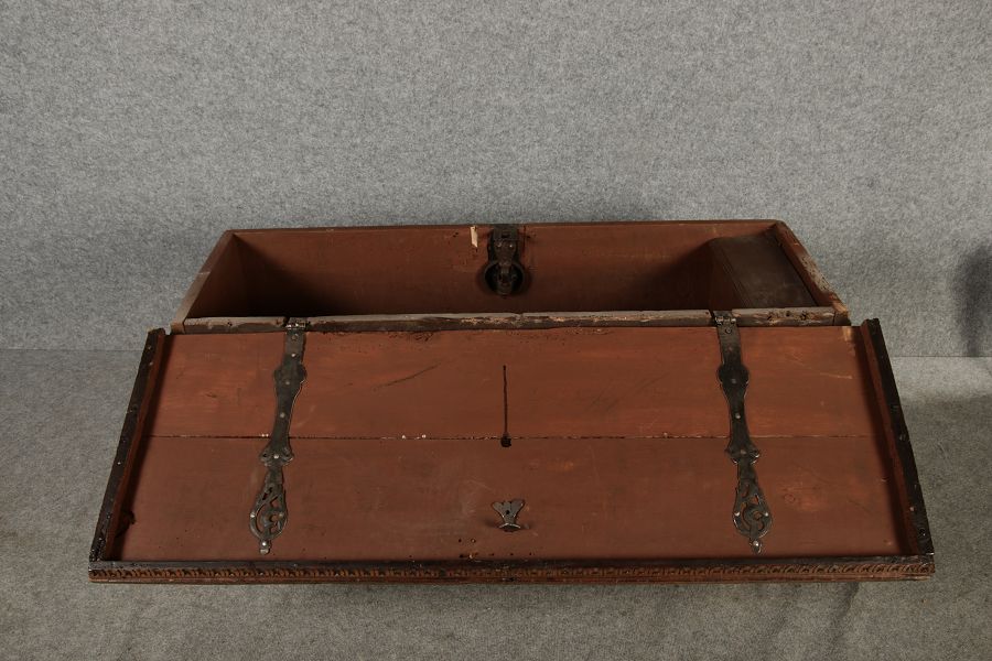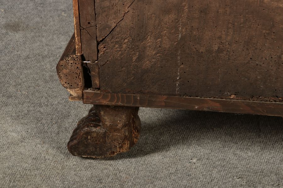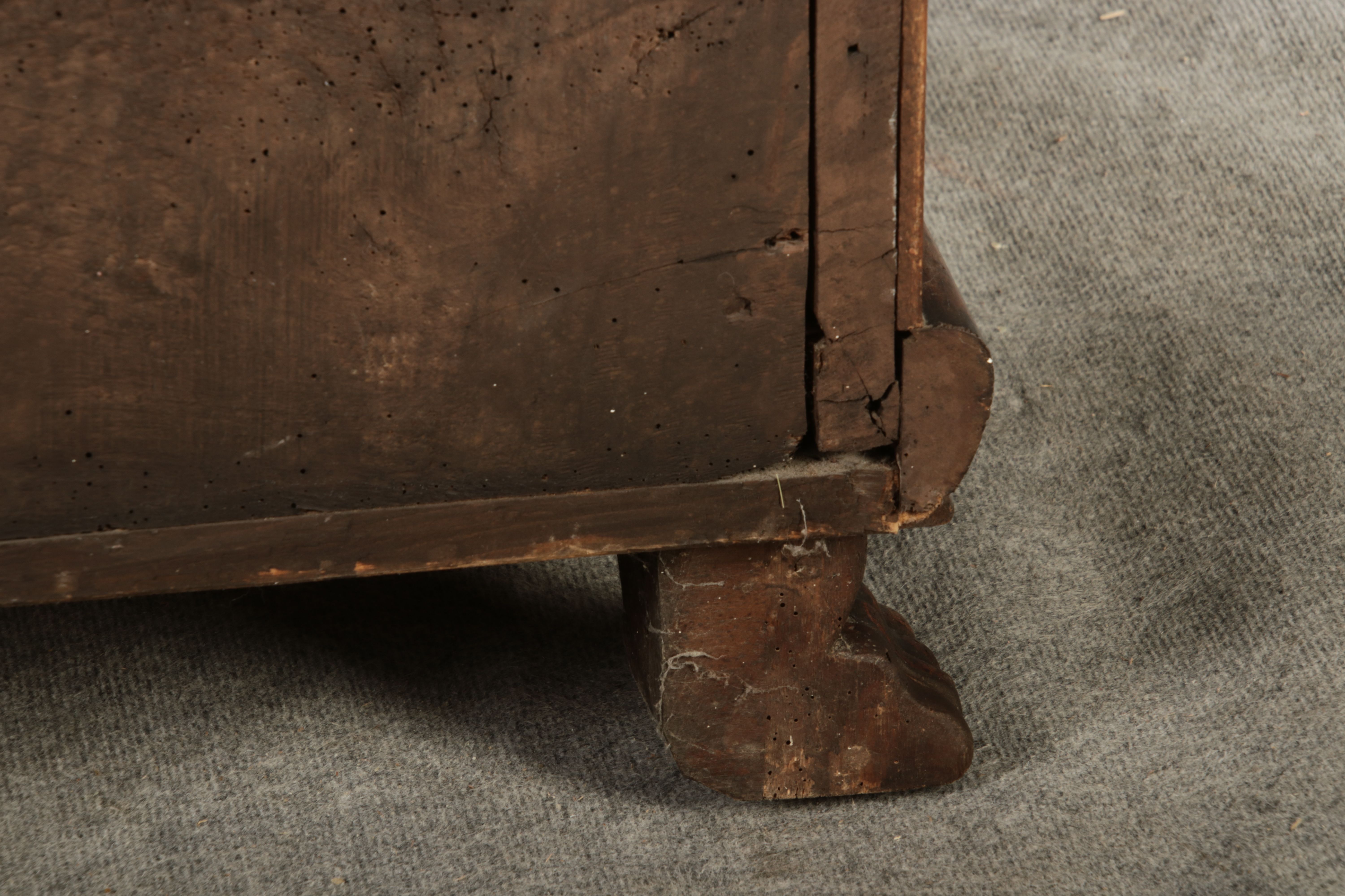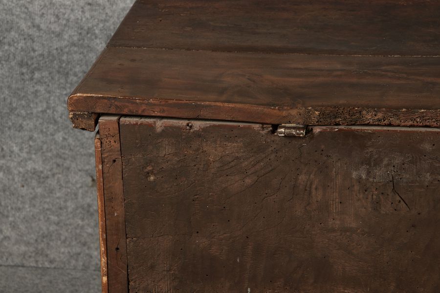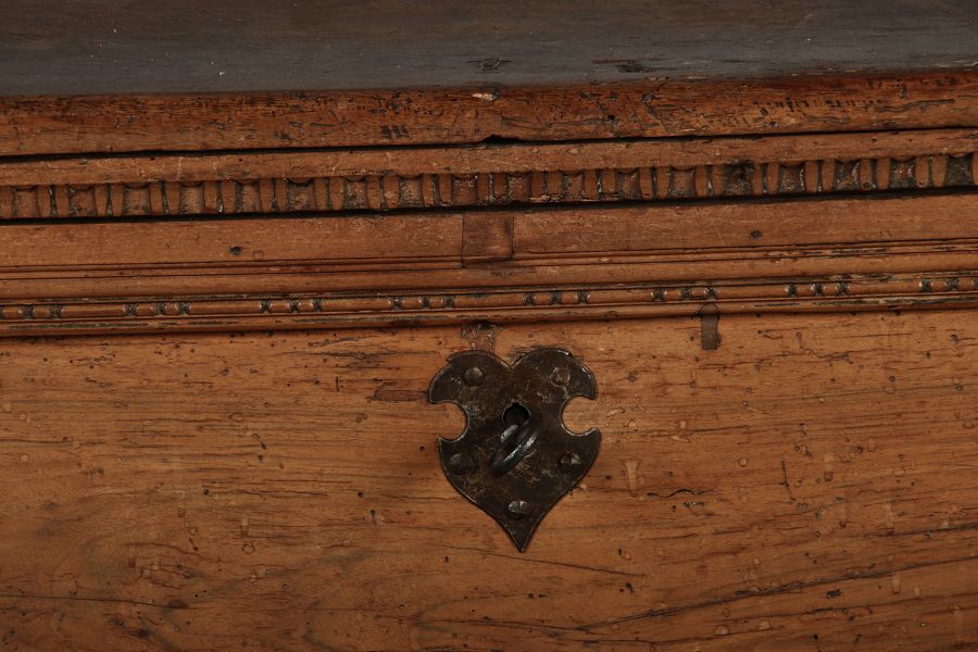17 Jh. In Nussholz gearbeitet. Längsrechteckiger Kasten mit gerade schließendem Deckel und seitlichem, geschmiedetem Tragehenkel in Eisen. Die Front zeigt ein durchgehendes Rechteckfeld, flankiert von figürlich geschnitzten Hermenpilastern, das Kassettenfeld breit gerahmt. Unteres Profil in Godronnierung leicht vortretend, über kurzen Stollenfüßen in Form von Löwen Tatzen. Im Inneren original Eisenschloss. Mit schöner Alterspatina. Ansonsten in sehr guter Erhaltung.