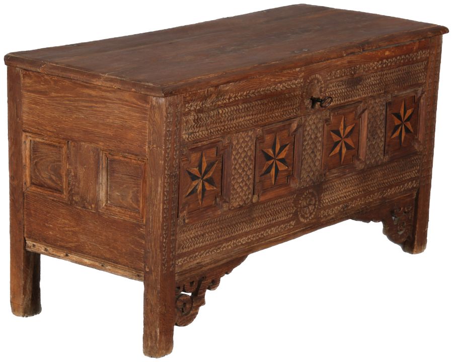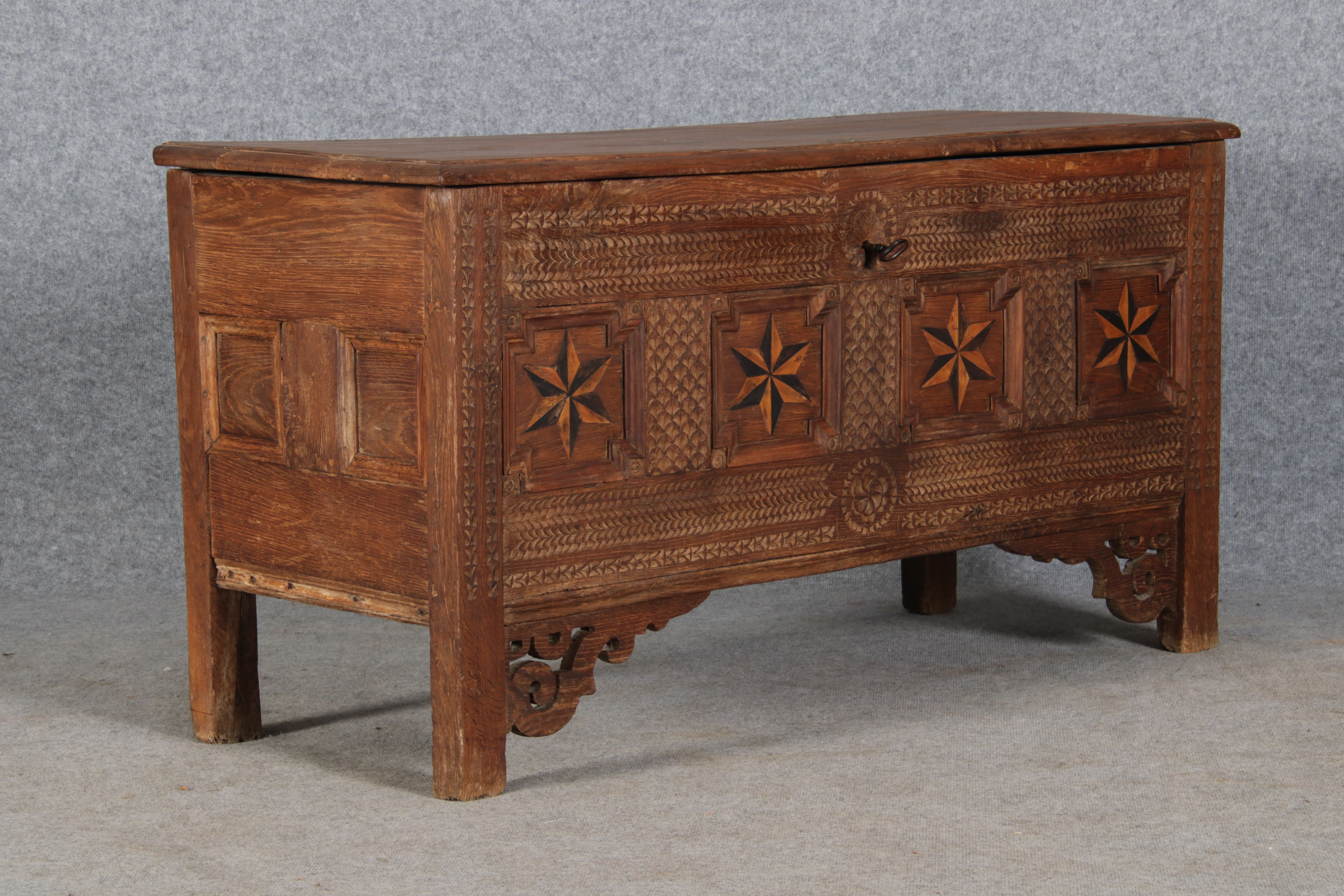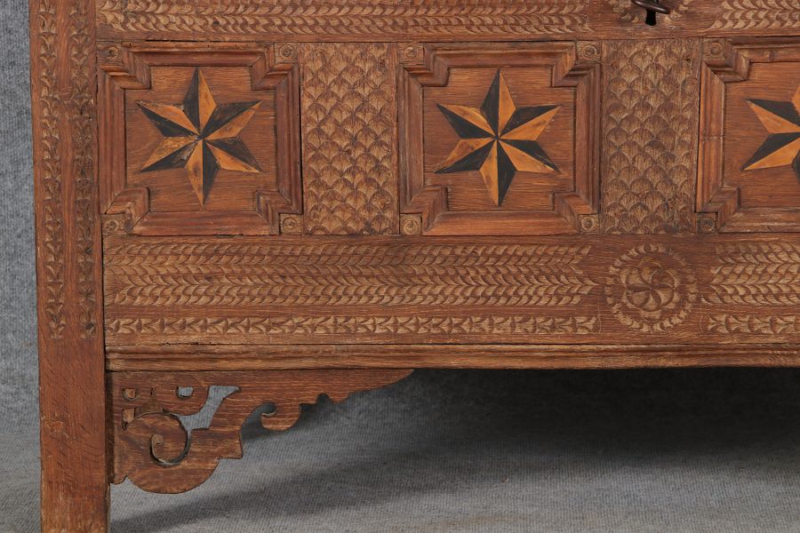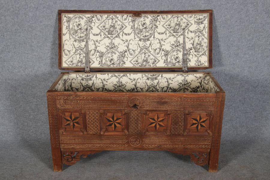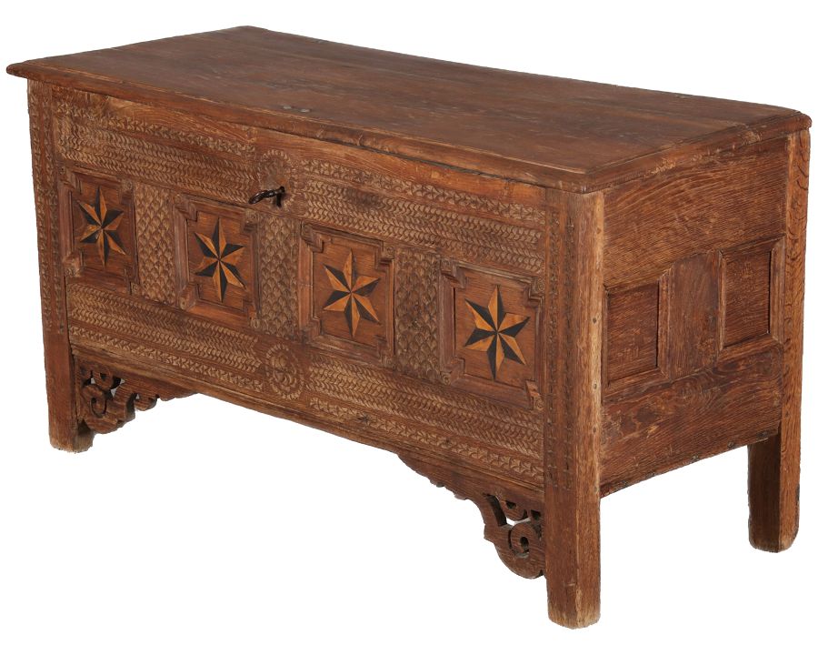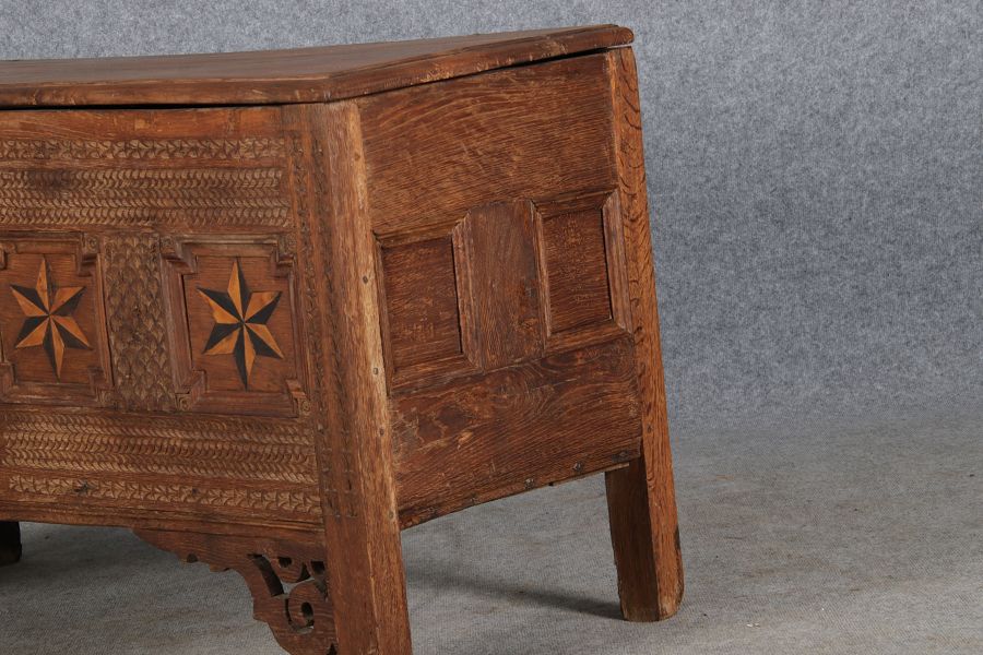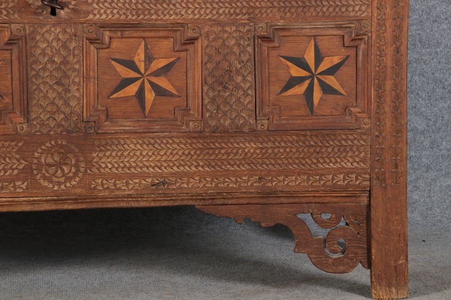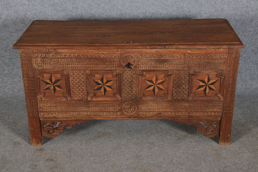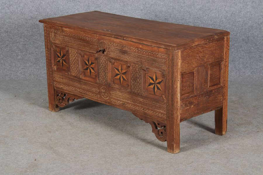 | Barocktruhe mit Kerbschnitzereien und Einlegearbeiten um 1700 | ||||||||||||||||||||||||||||||||||||||||||||||||||||||||||||||||||