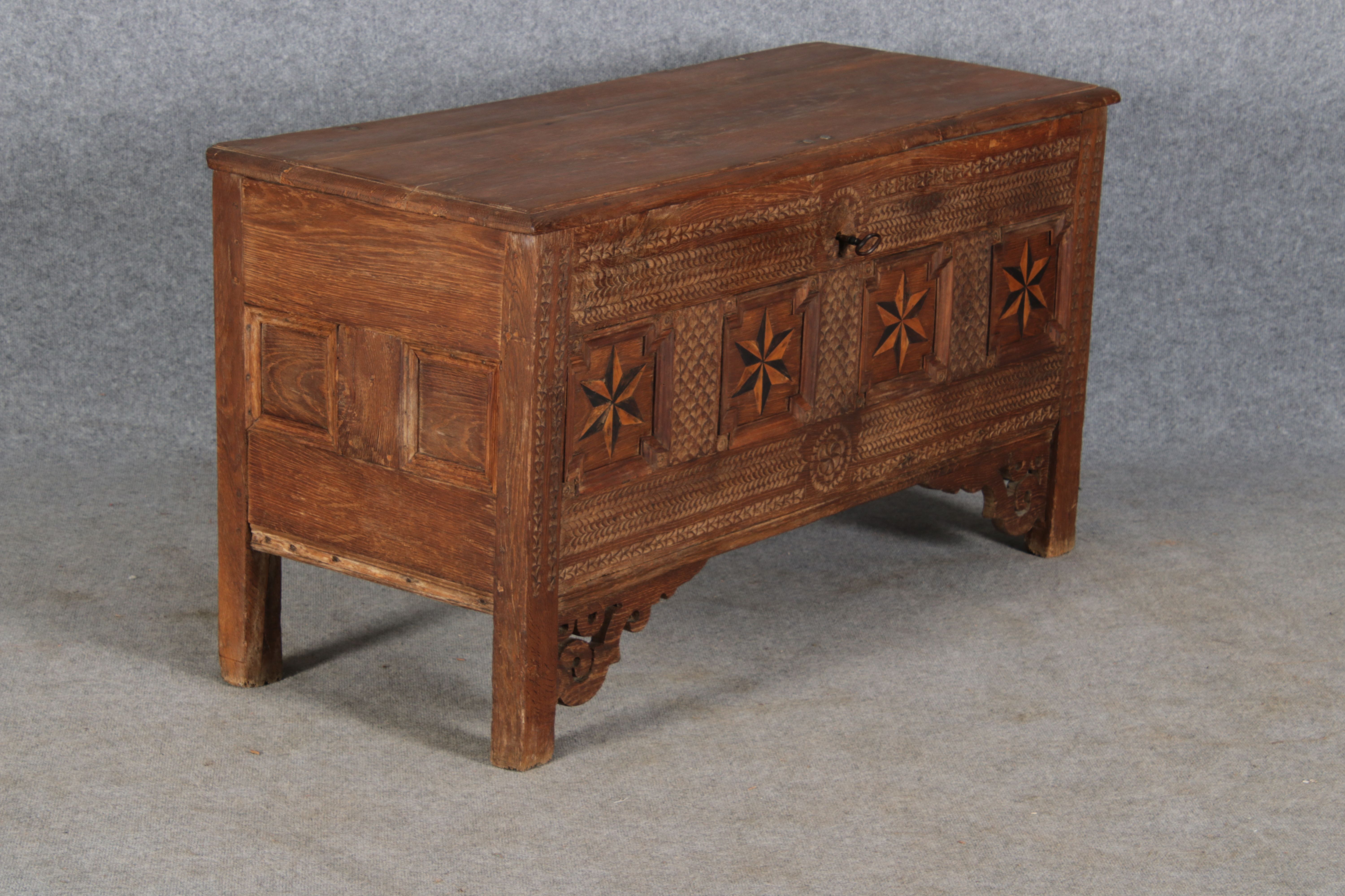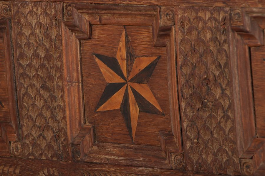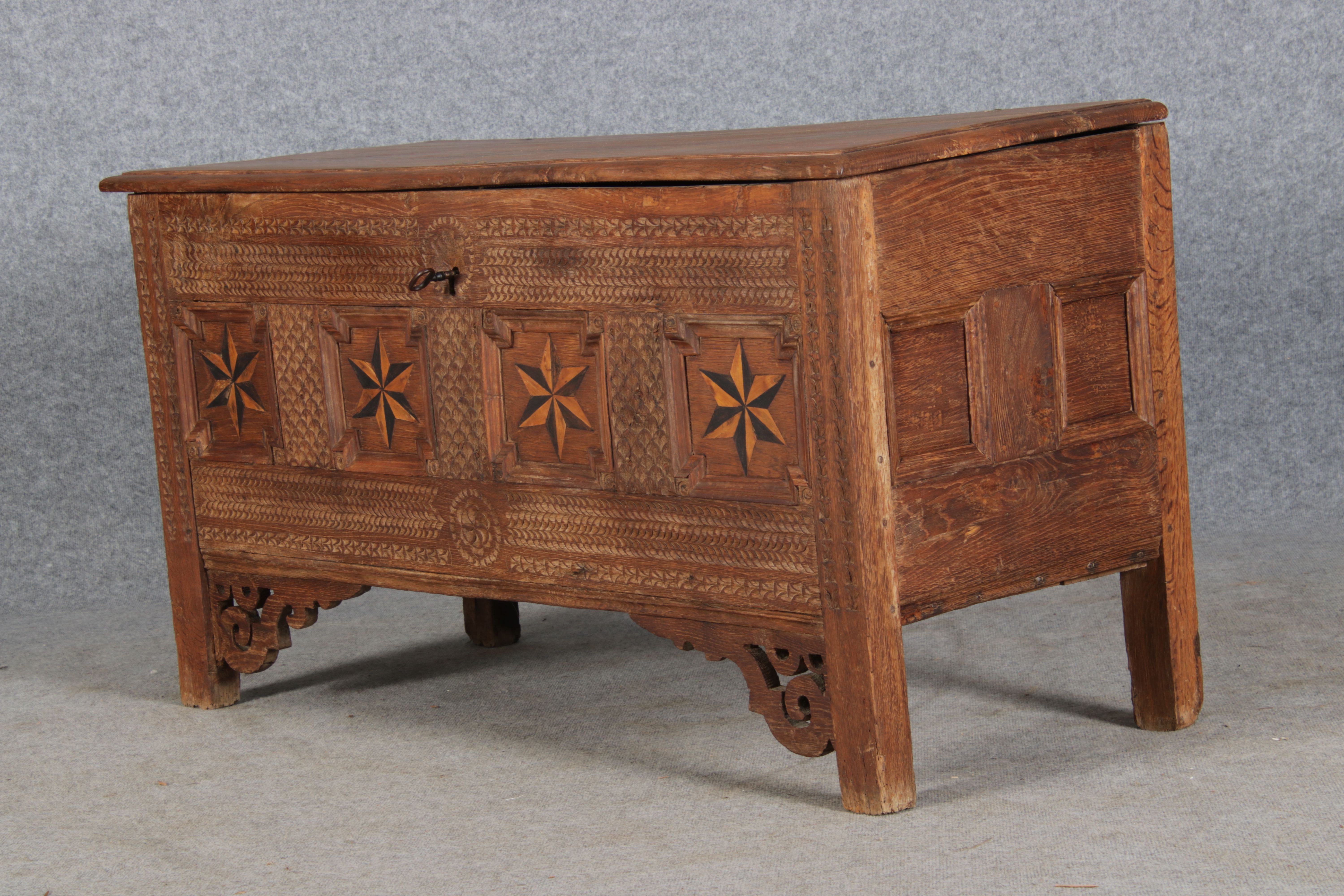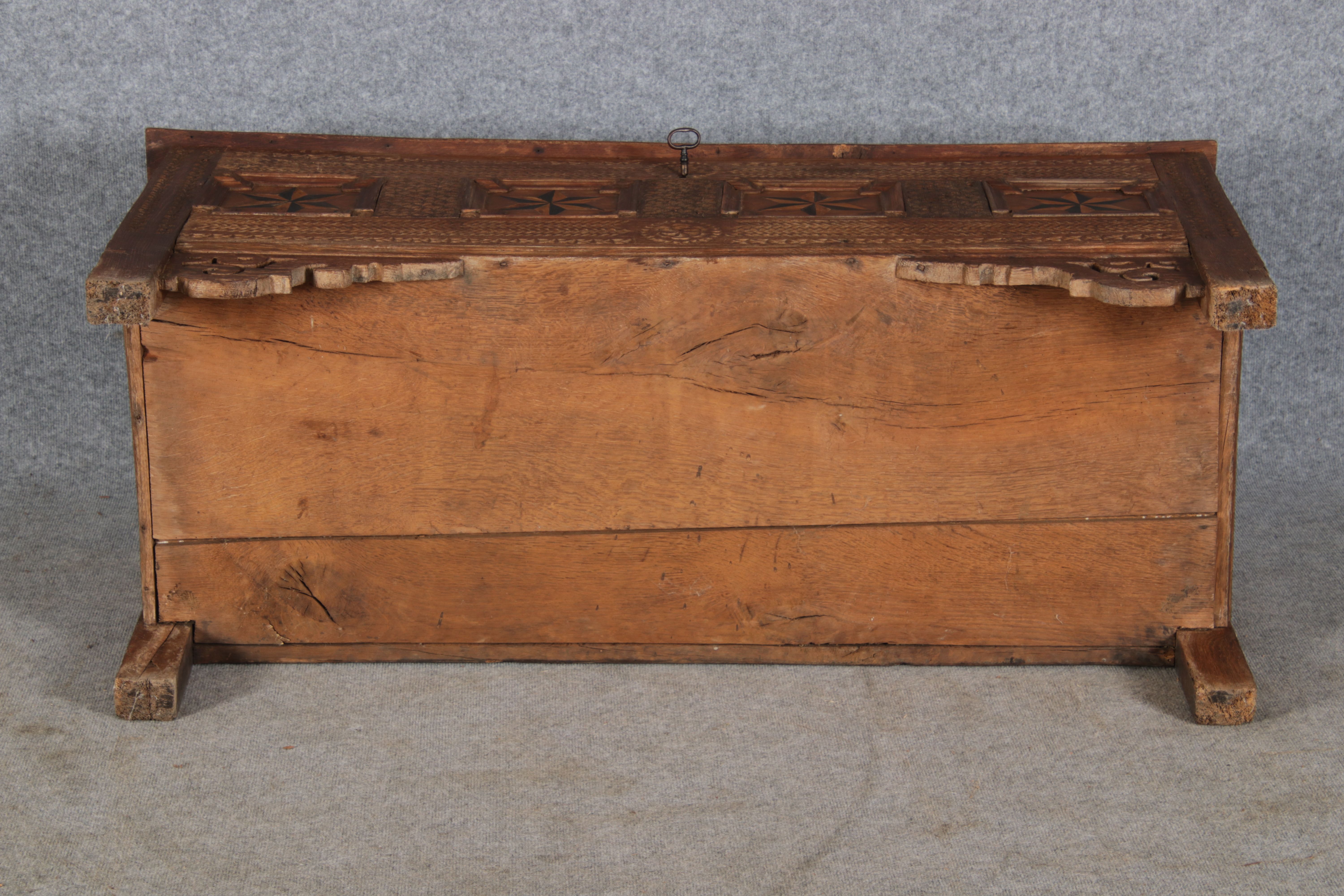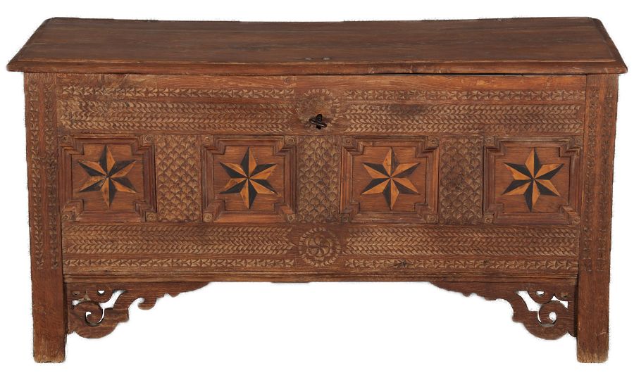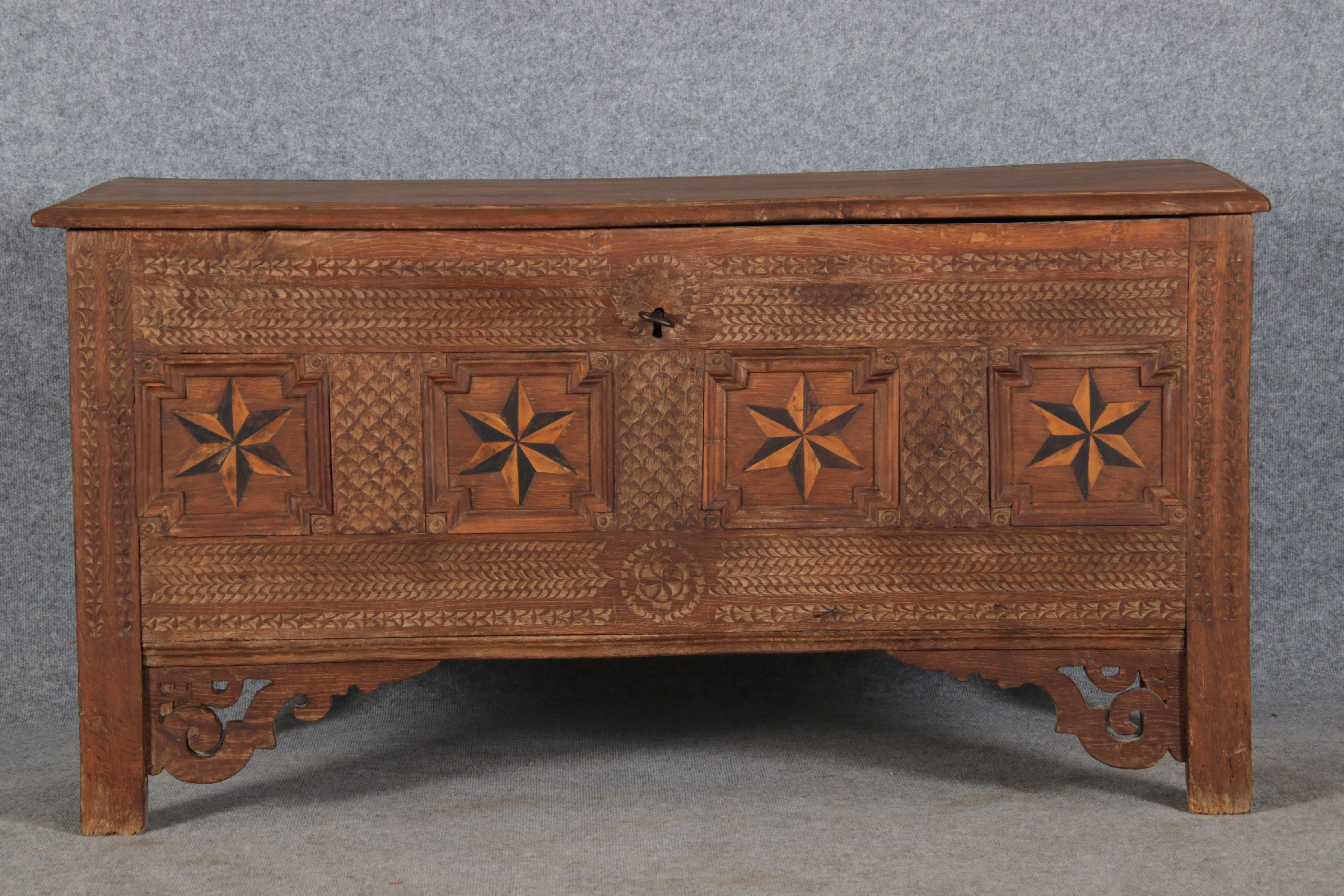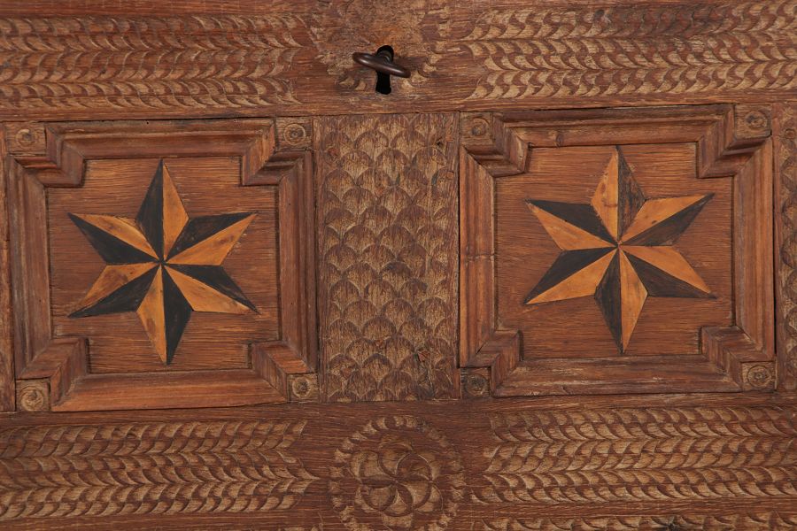| Barocktruhe mit Kerbschnitzereien und Einlegearbeiten um 1700 | ||||||||||||||||||||||||||||||||||||||||||||||||||||||||||||||||||