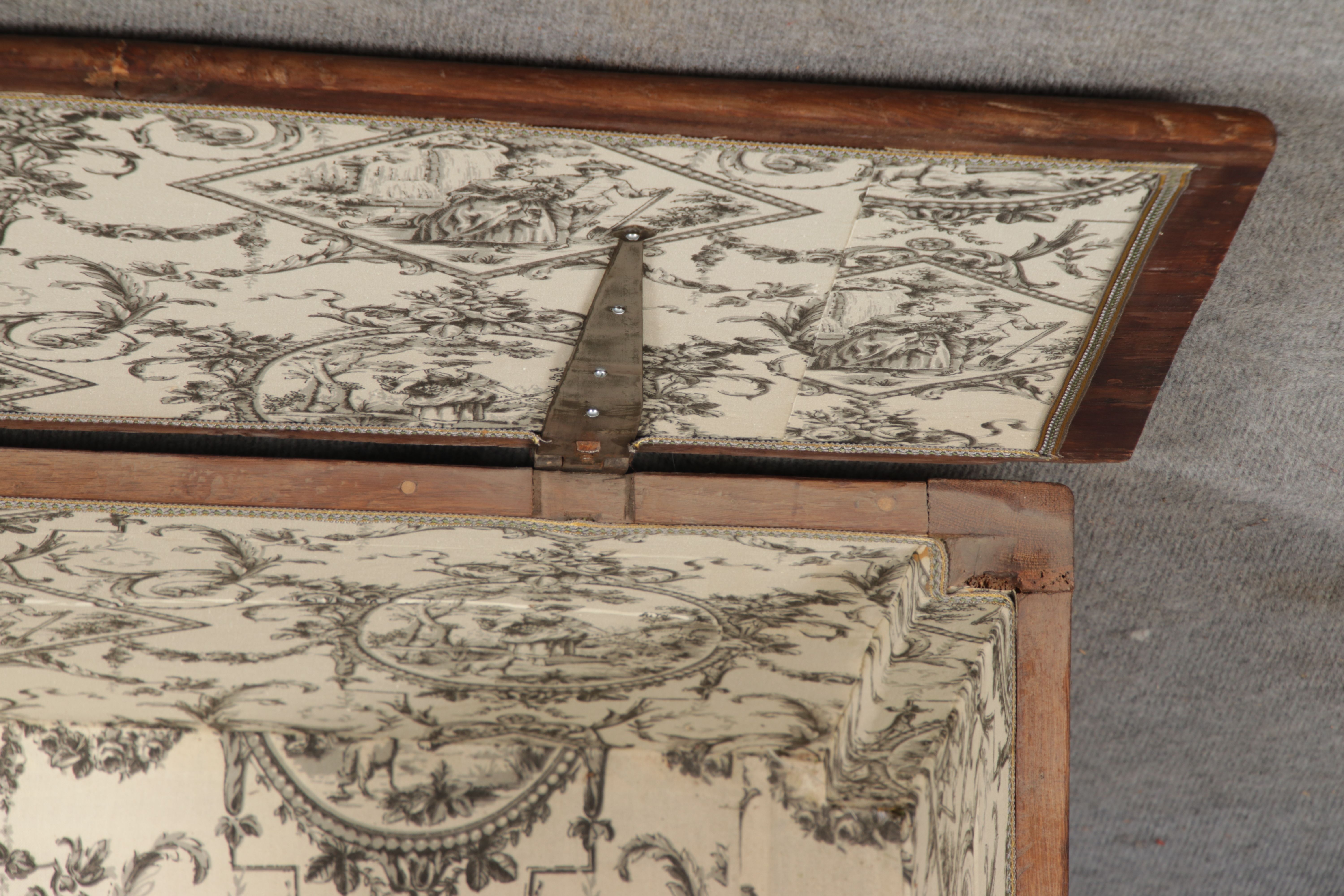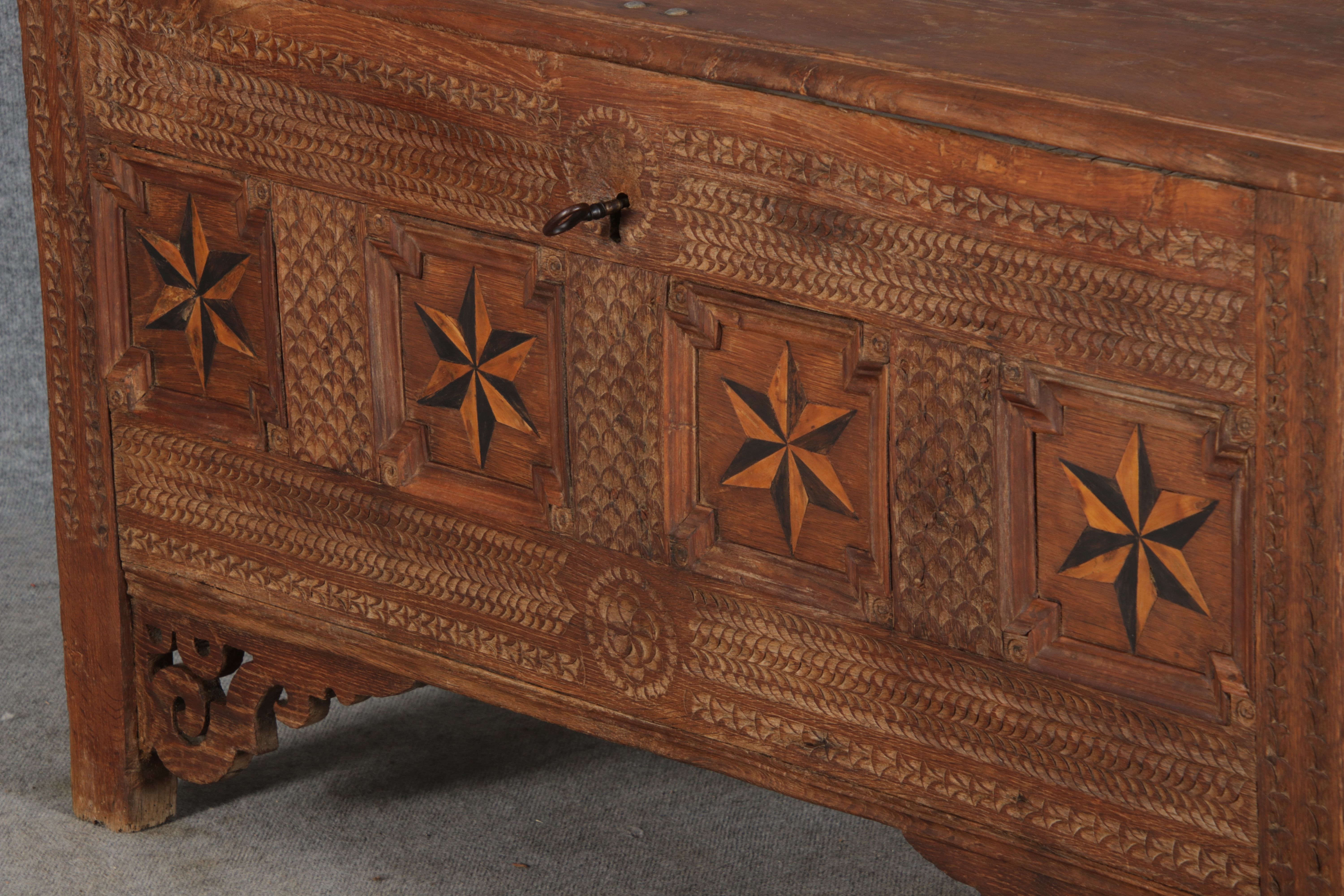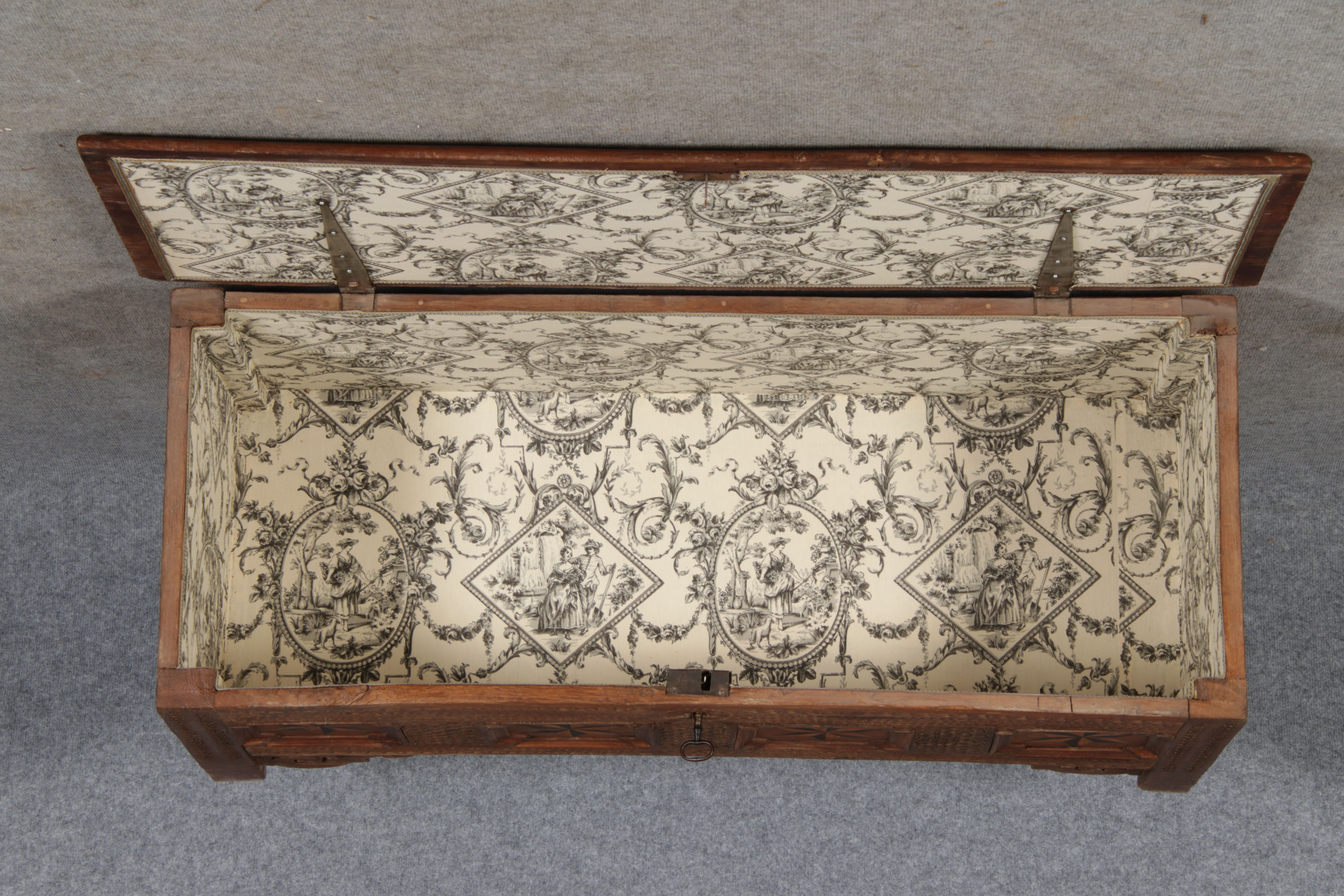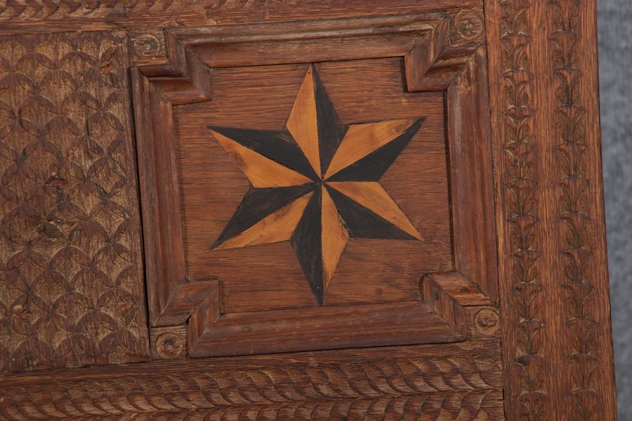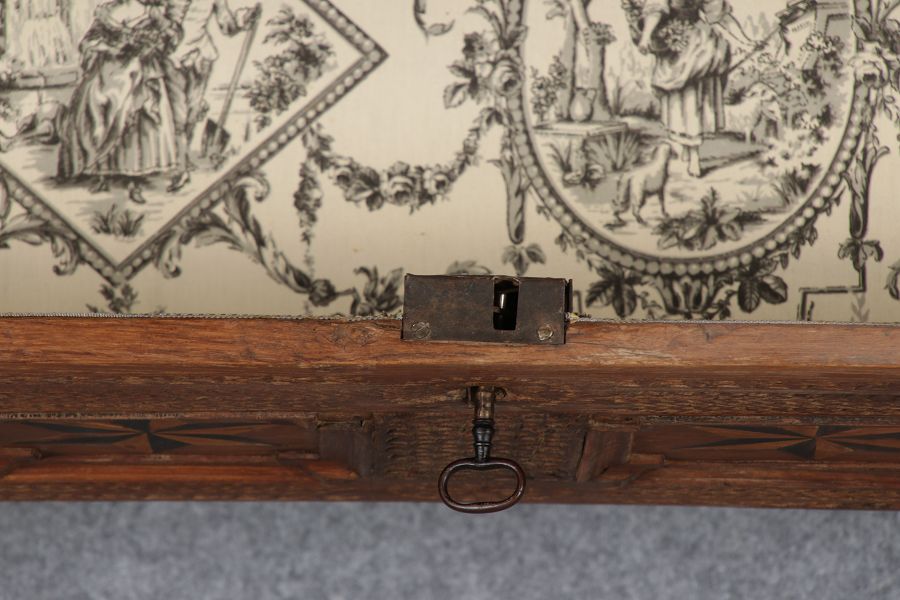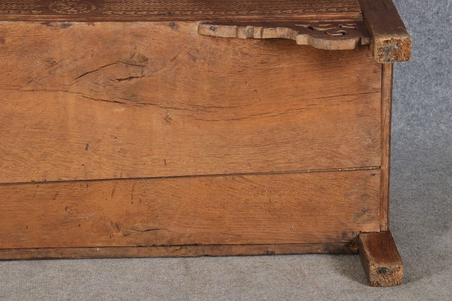| Barocktruhe mit Kerbschnitzereien und Einlegearbeiten um 1700 | ||||||||||||||||||||||||||||||||||||||||||||||||||||||||||||||||||