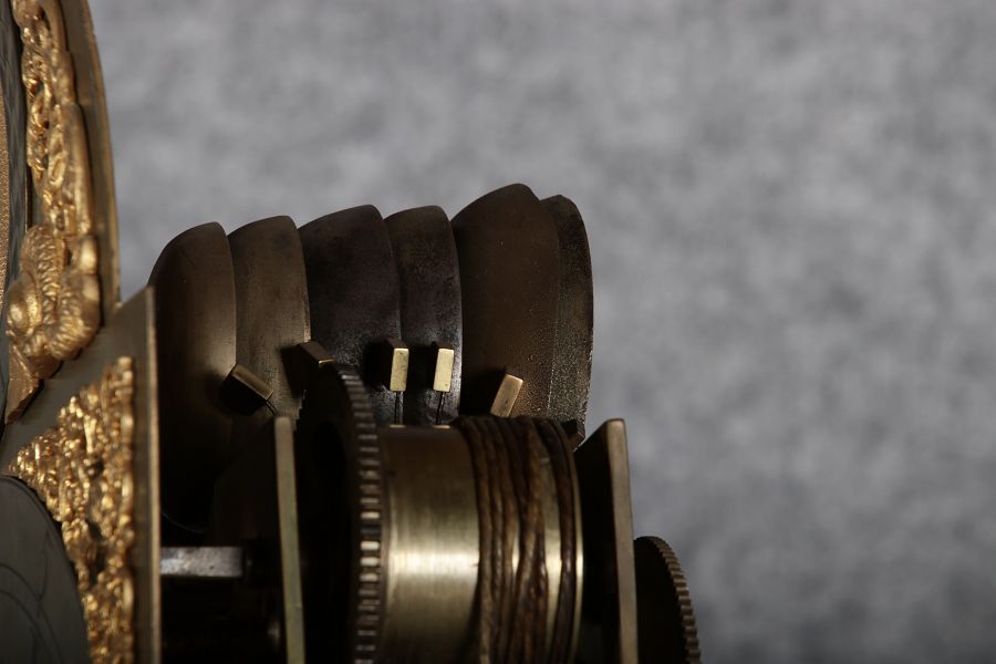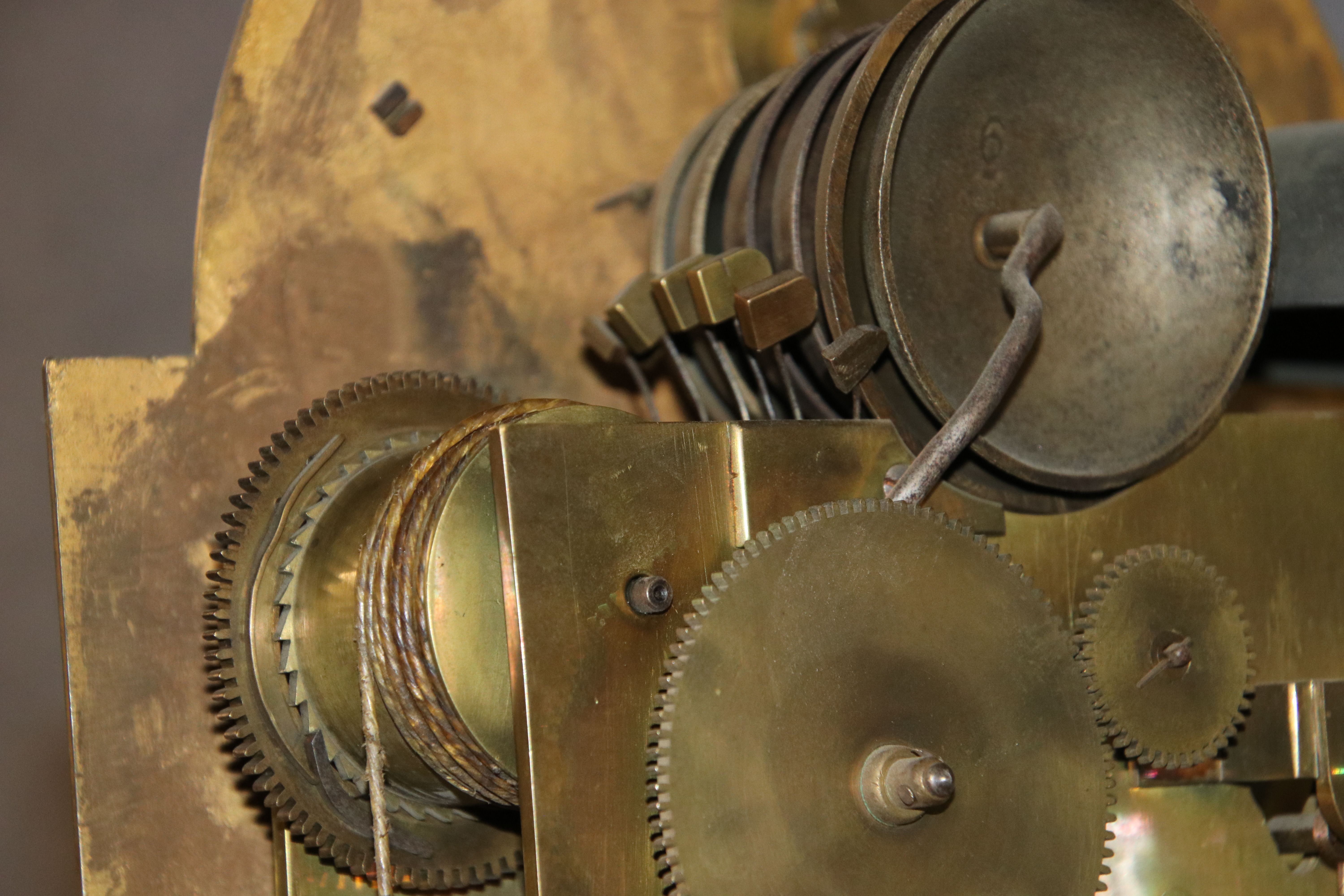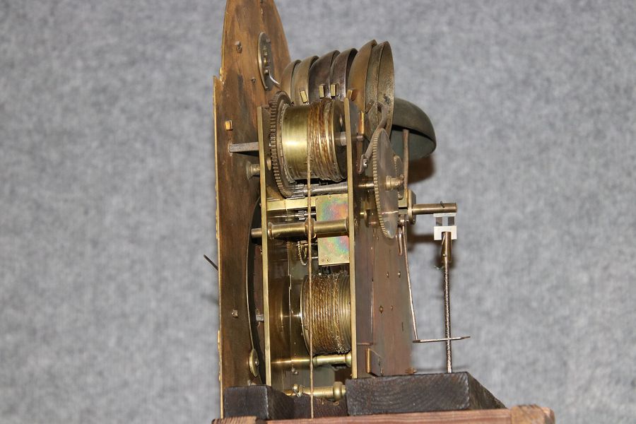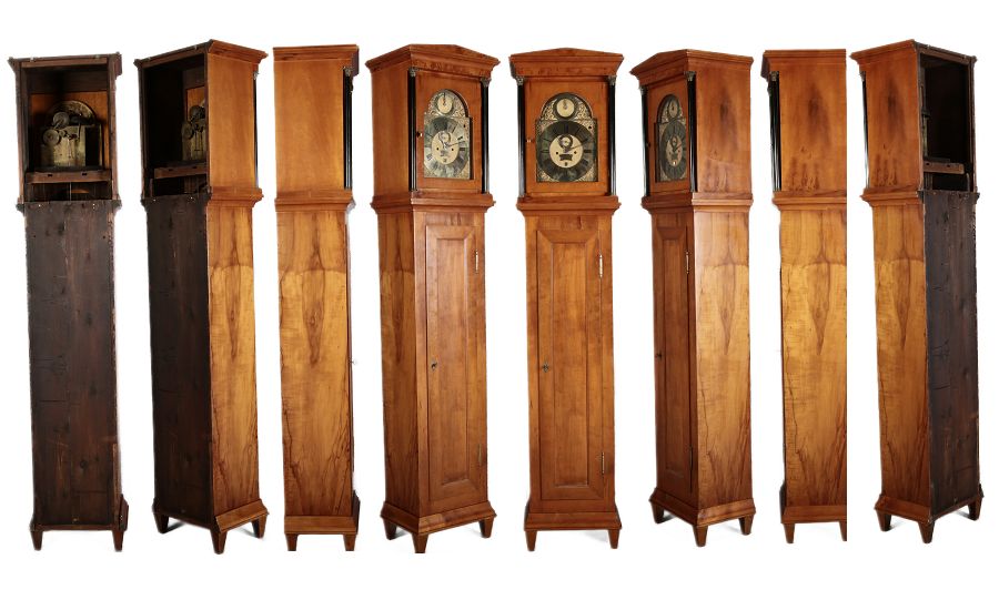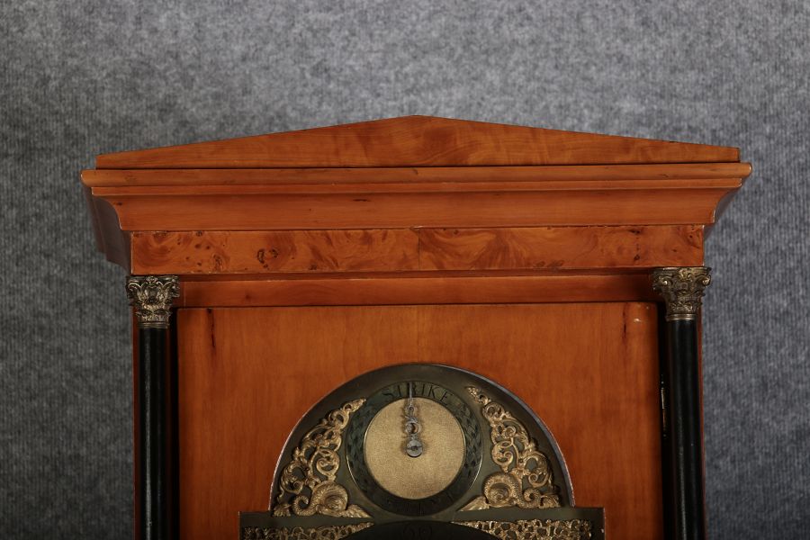 | Für XXL Bild hier klicken43 Antike Standuhr Glockenspiel Kirschbaum Anfang 19 Jh. Diese eindrucksvolle Standuhr mit Glockenspiel aus dem 19 Jh. ist ein hochwertiges antikes Möbelstück, das nicht nur als Zeitmesser, sondern auch als dekoratives Element dient. Sie besteht aus einem eleganten Holzgehäuse mit warmem, natürlichem Finish, das ihre klassische Optik unterstreicht. Der schlichte, geradlinige Korpus und das hohe Gehäuse verleihen der Uhr eine imposante Prämie. Zusätzlich zur optischen und klanglichen Schönheit bietet diese Standuhr einen faszinierenden Einblick in die traditionelle Uhrmacherkunst. Der mechanische Antrieb, sichtbar im Detail der Zahnräder und des Seilzugs, ist ein Meisterwerk der Präzision, das eine gleichmäßige und zuverlässige Zeitanzeige gewährleistet. Das Uhrwerk muss regelmäßig per Hand aufgezogen werden, was den Besitzer an die Sorgfalt und Hingabe erinnert, die mit einem solchen historischen Uhr verbunden ist. Das Uhrwerk zeigt die präzise Handwerkskunst und technische Raffinesse einer mechanischen Uhr, die über ein integriertes Glockenspiel, einen Sekundenzeiger und eine Datumsanzeige verfügt. Es handelt sich um ein massives Uhrwerk aus Messing, das für seine Langlebigkeit und Zuverlässigkeit bekannt ist. Die Kombination aus diesen Funktionen macht dieses Uhrwerk zu einem komplexen und wertvollen Stück, das weit über eine einfache Zeitmessung hinausgeht. |