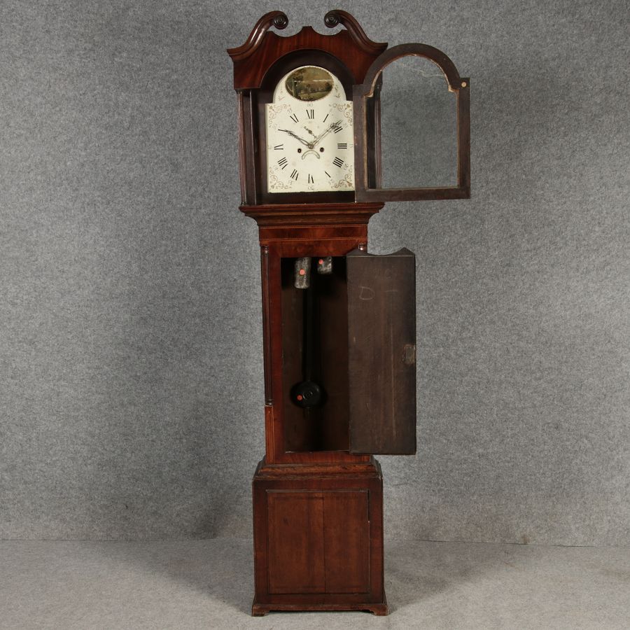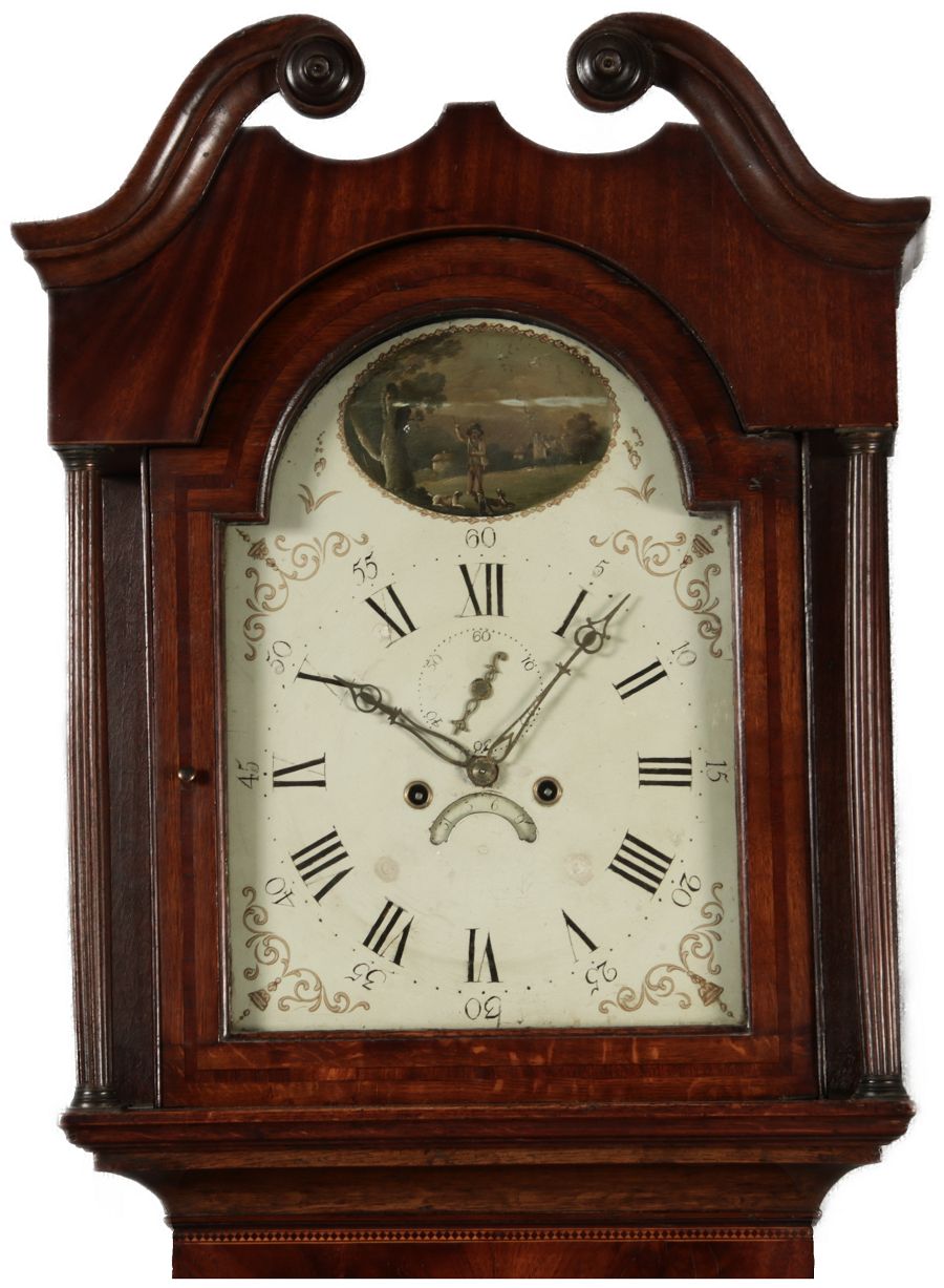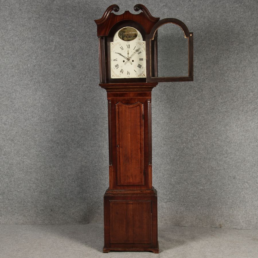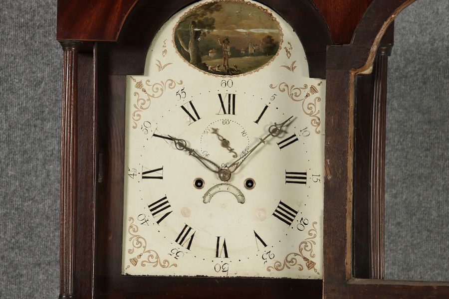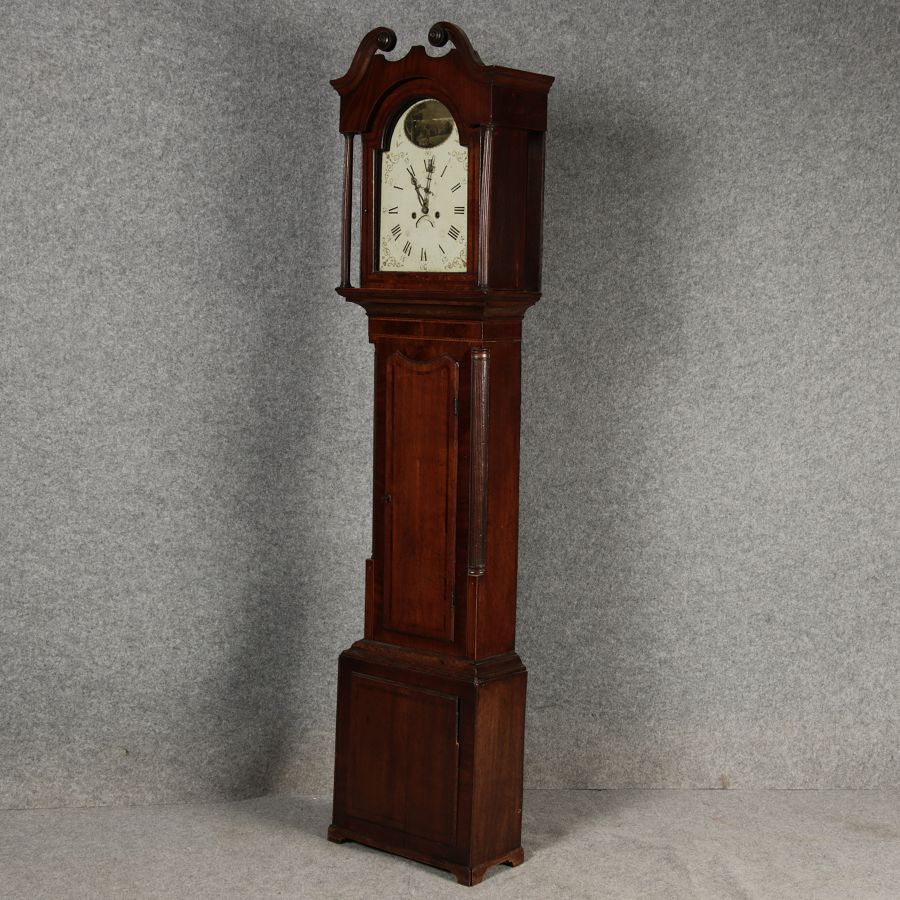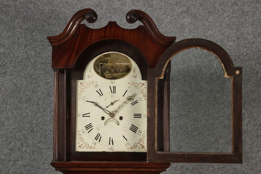 Antike Englische Standuhr im klassischen Design aus dem 19 Jh. Diese elegante antike Standuhr besticht durch ihre handwerkliche Verarbeitung und die Verwendung von Edler Hölzer, die dem Stück eine warme Ausstrahlung verleihen. Die Uhr verfügt über ein Gehäuse aus massivem Holz, das einen tiefen, warmen Ton hat und mit einer geschmackvollen Patina versehen ist, die im Laufe der Jahre entwickelt wurde. Die geschwungene Krone im klassischen Stil sowie die detailreiche Gestaltung des Ziffernblatts tragen zum Erscheinungsbild bei. Das Ziffernblatt selbst ist mit römischen Ziffern versehen und zeigt feine Verzierungen im Barockstil. Über dem Ziffernblatt befindet sich eine dekorative Malerei, die eine ländliche Szene darstellt, und dem Design einen zusätzlichen Hauch von Eleganz und Kunstfertigkeit verleiht. Die Uhr besitzt ein mechanisches Uhrwerk, das über ein Pendel angetrieben wird.